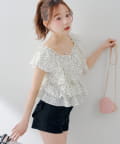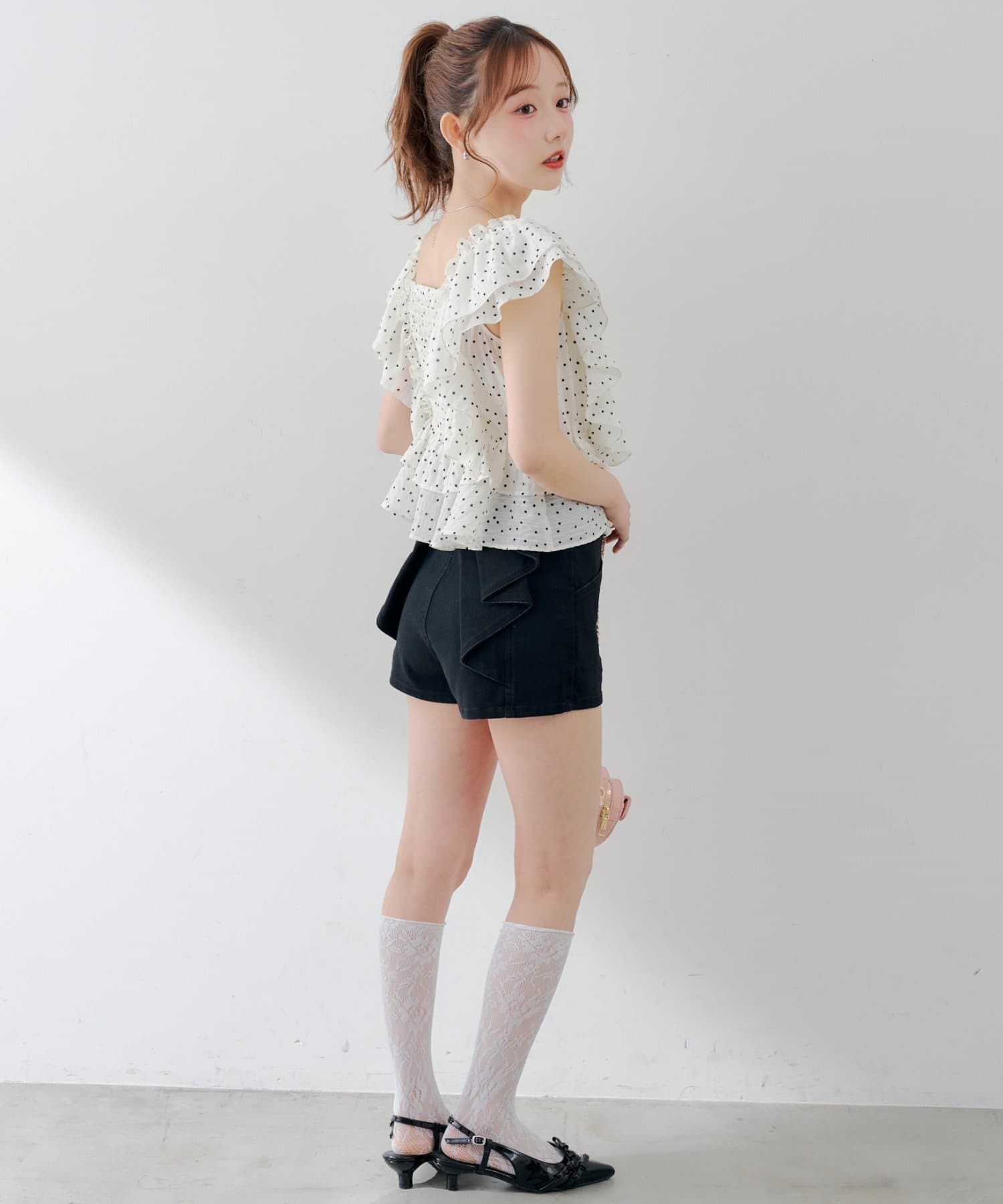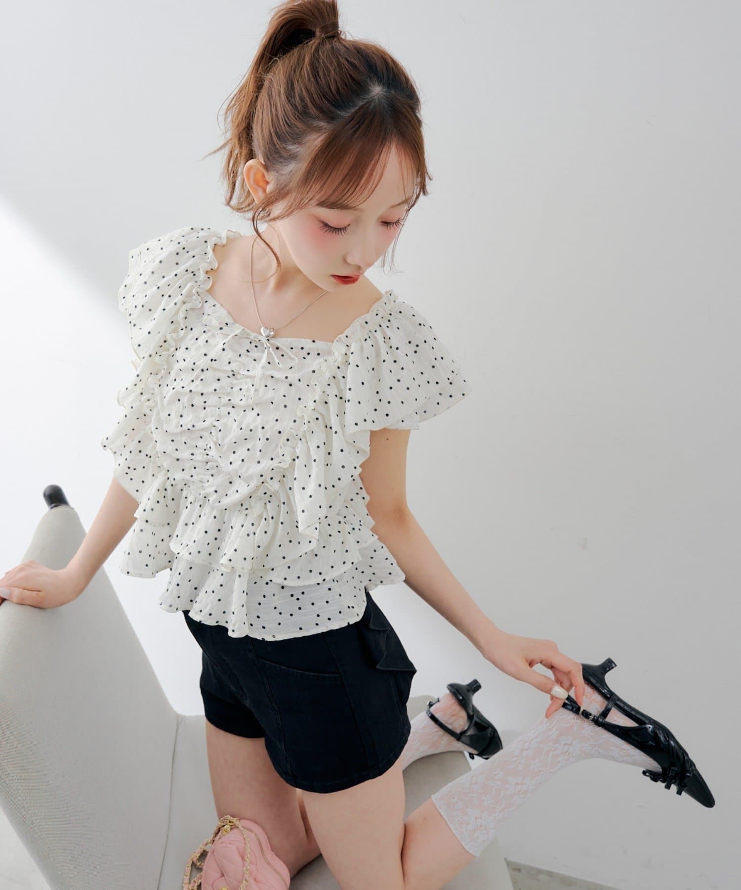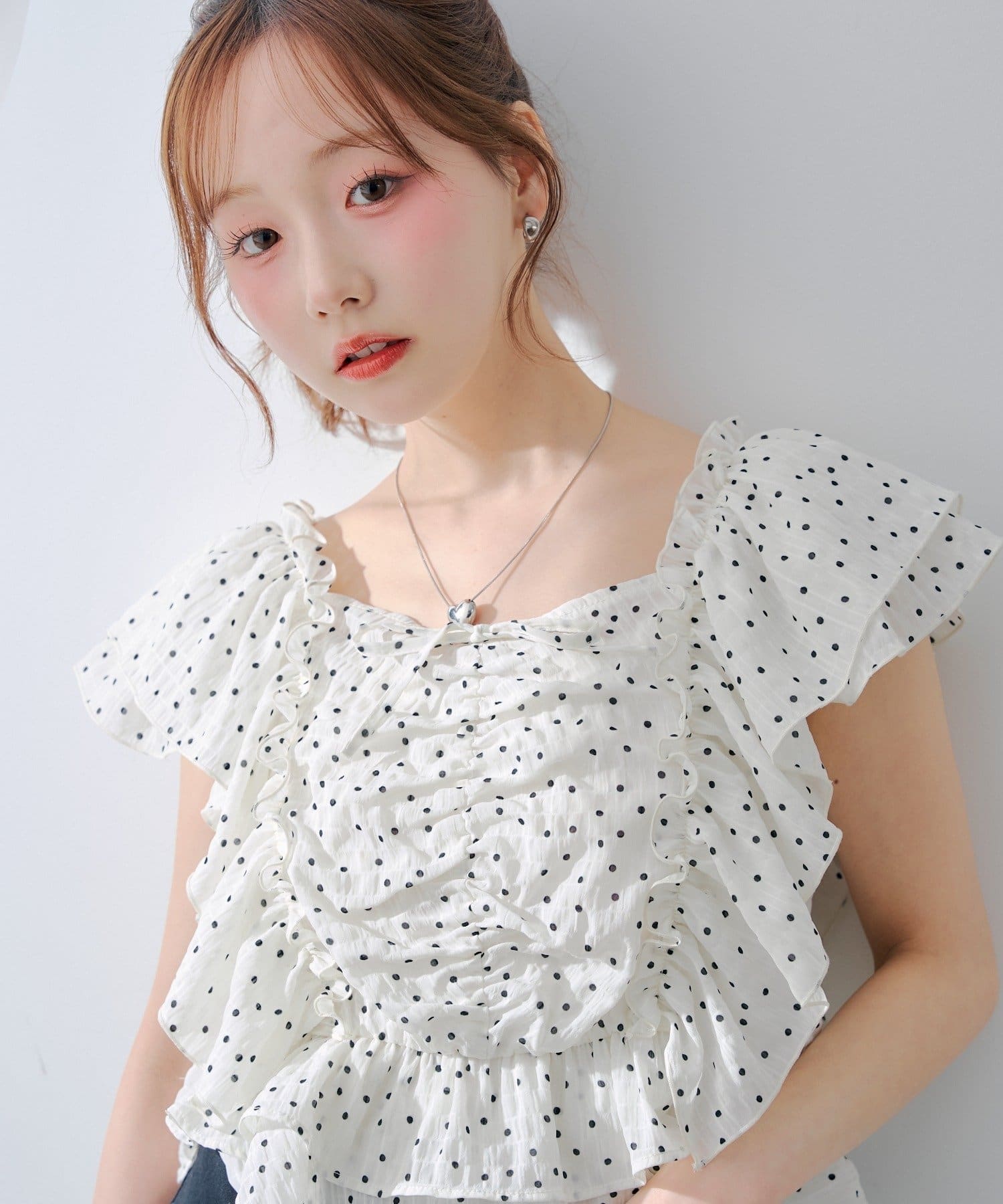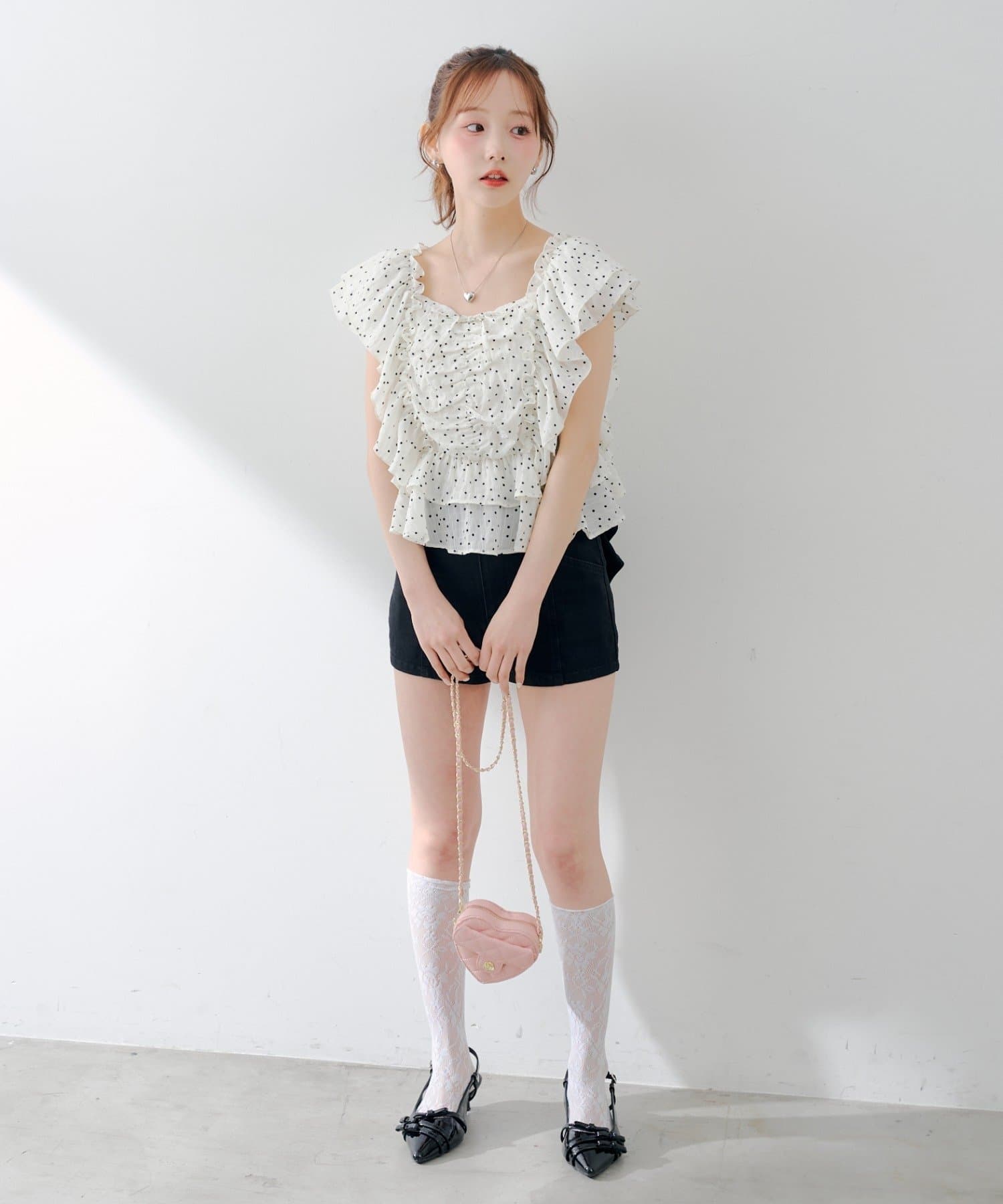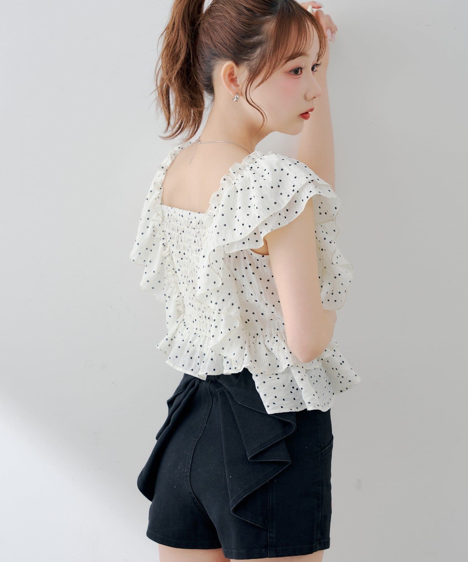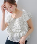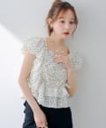 ・ガーリーな印象のドットと花柄も繊細なフリルとエアリーな素材感で、ぐっと大人可愛い印象に。