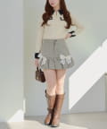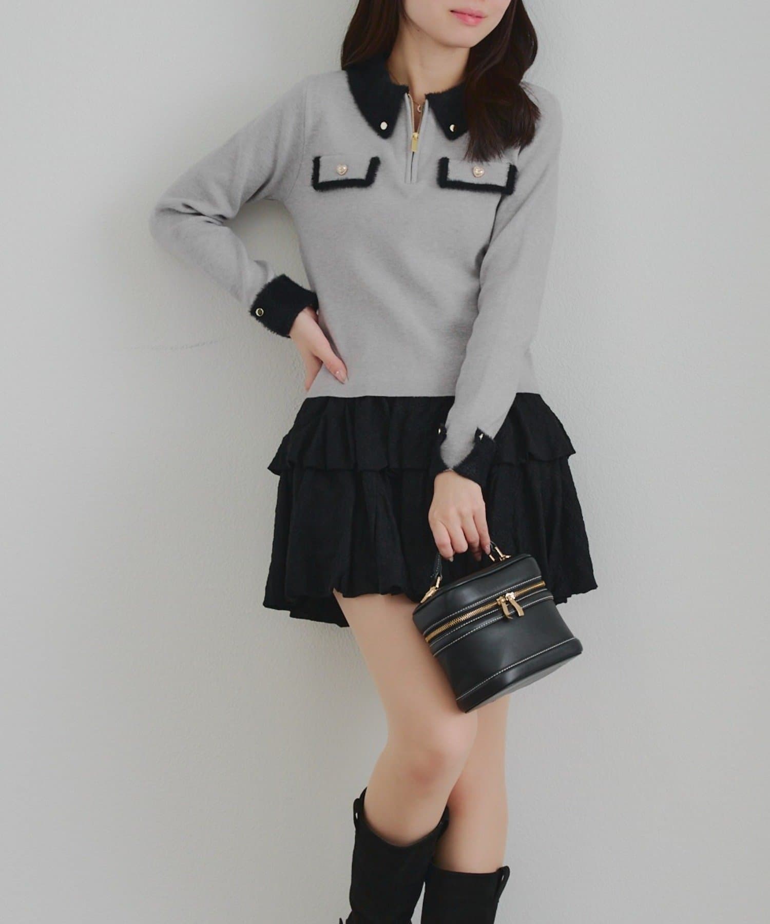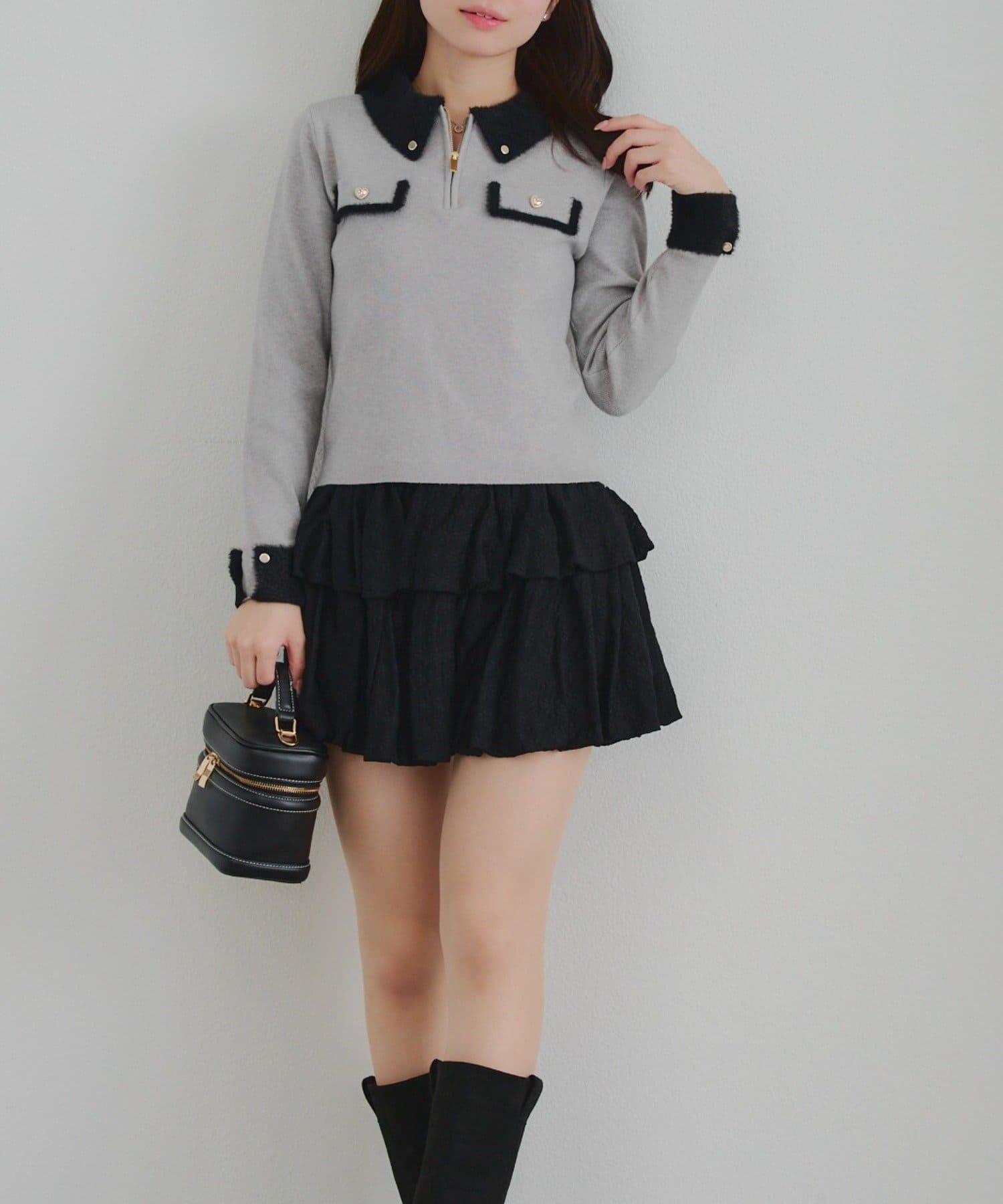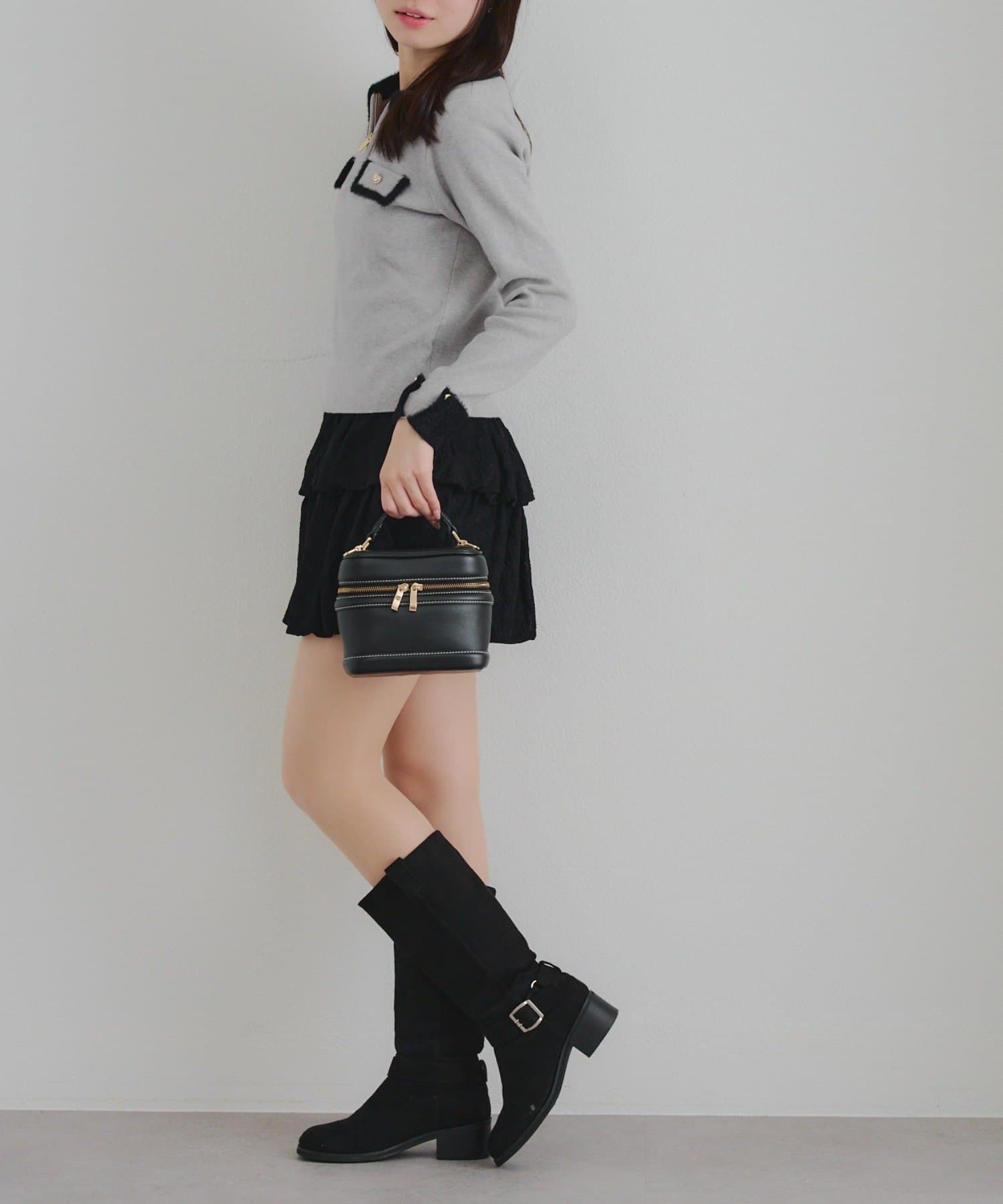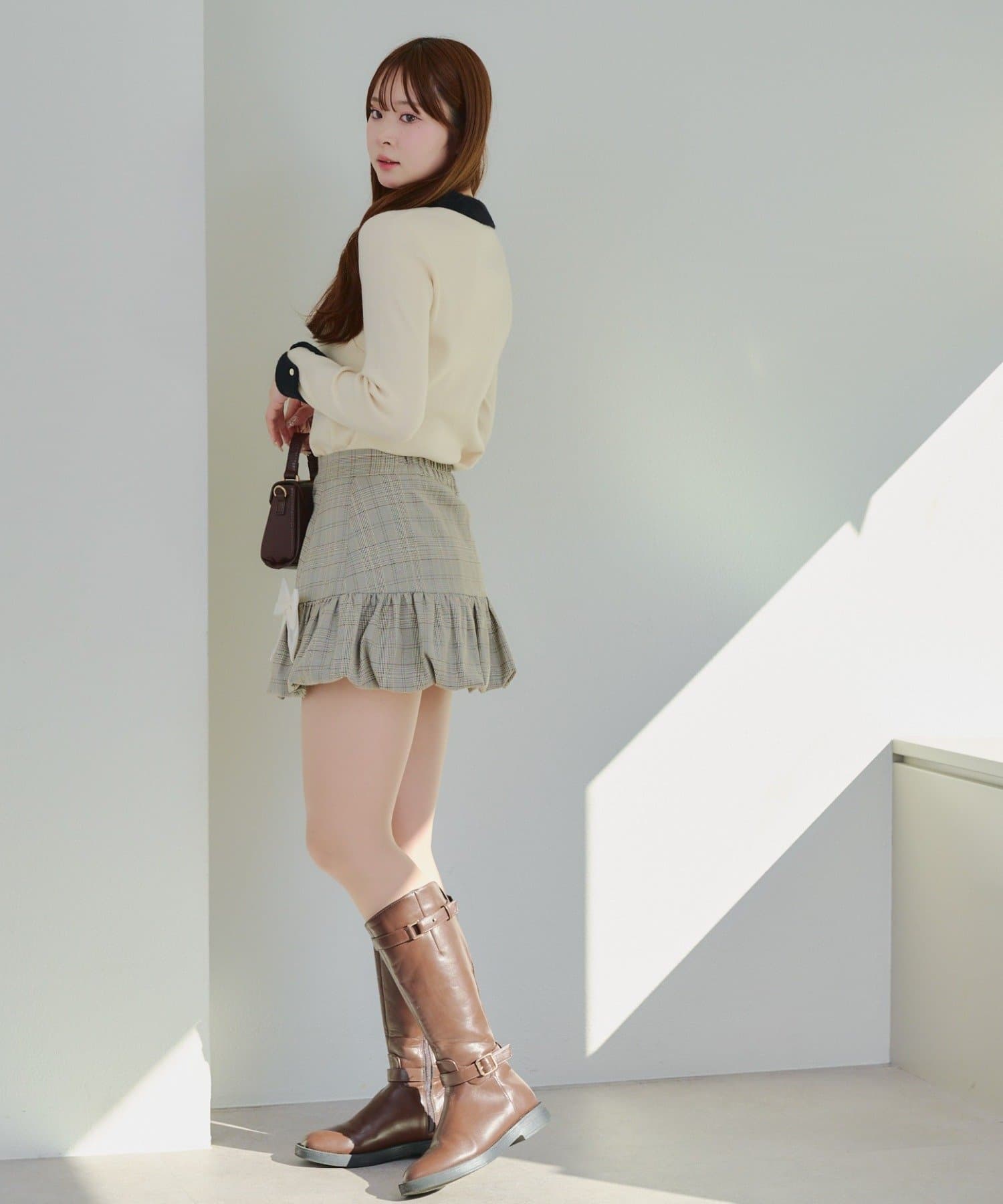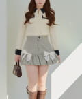 ・タイトなミニスカートにロングブーツ合わせでガーリーにまとめるのがオススメ
