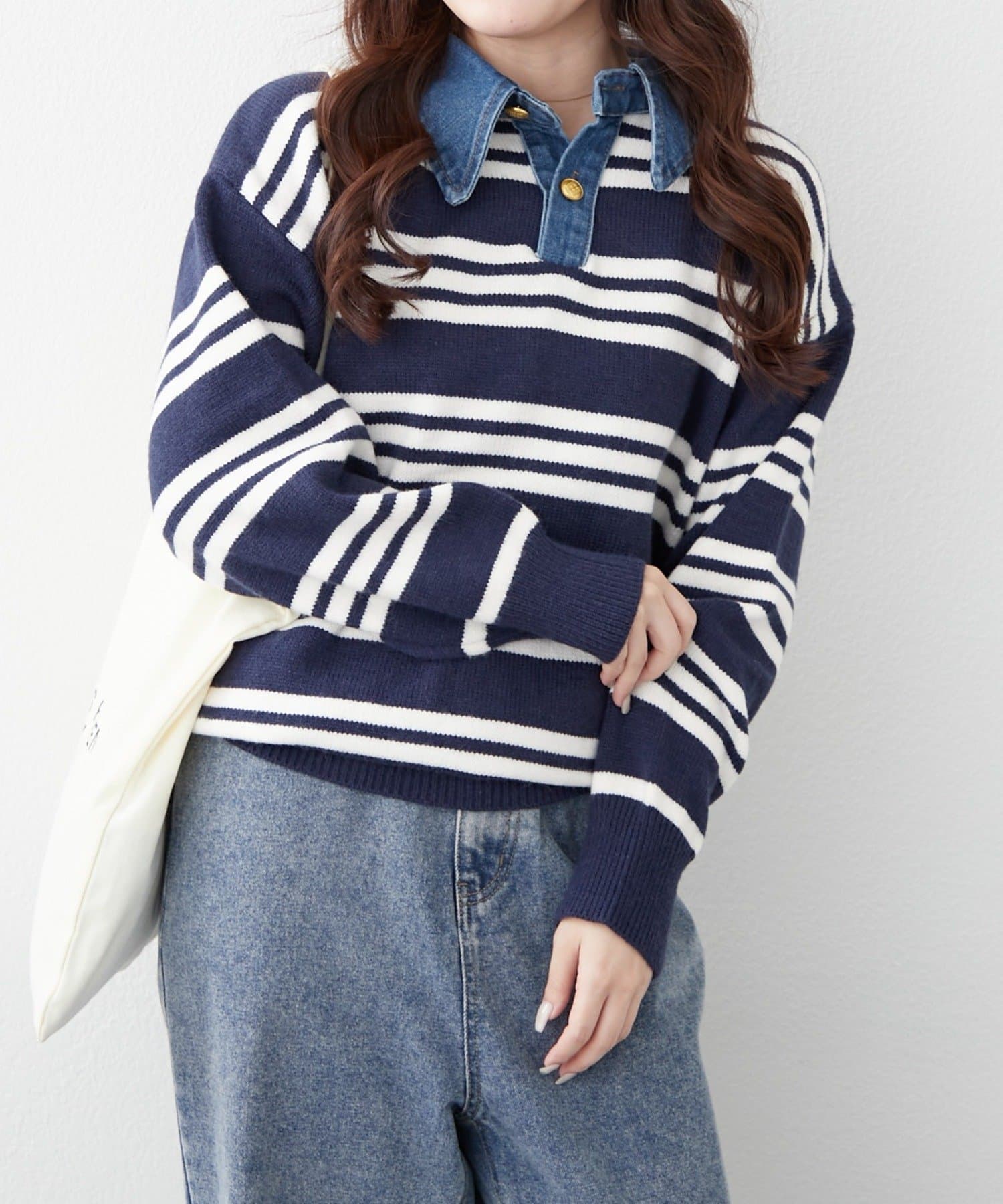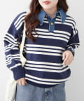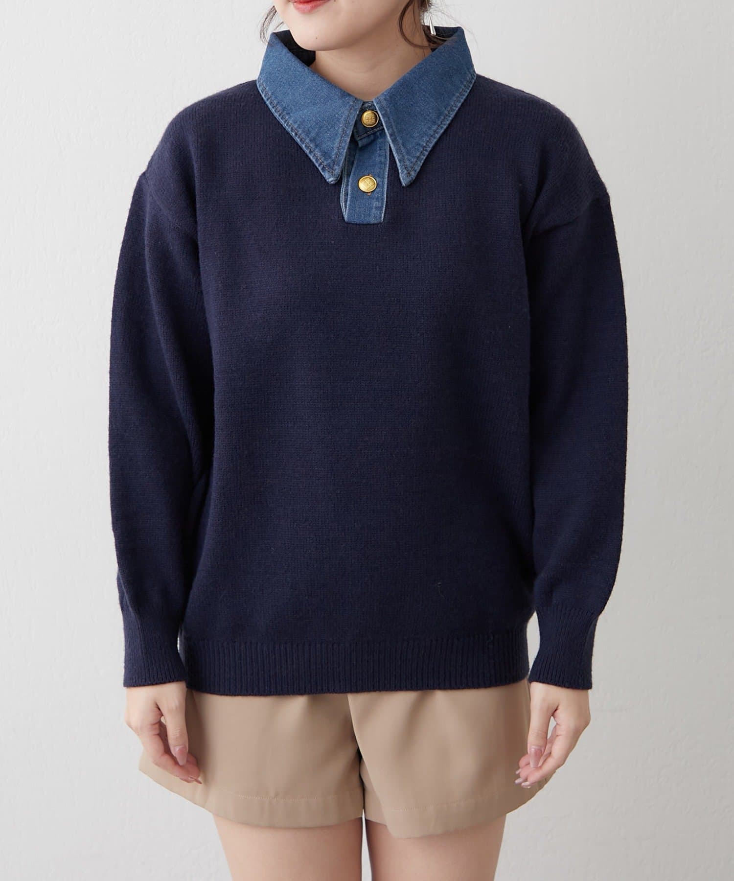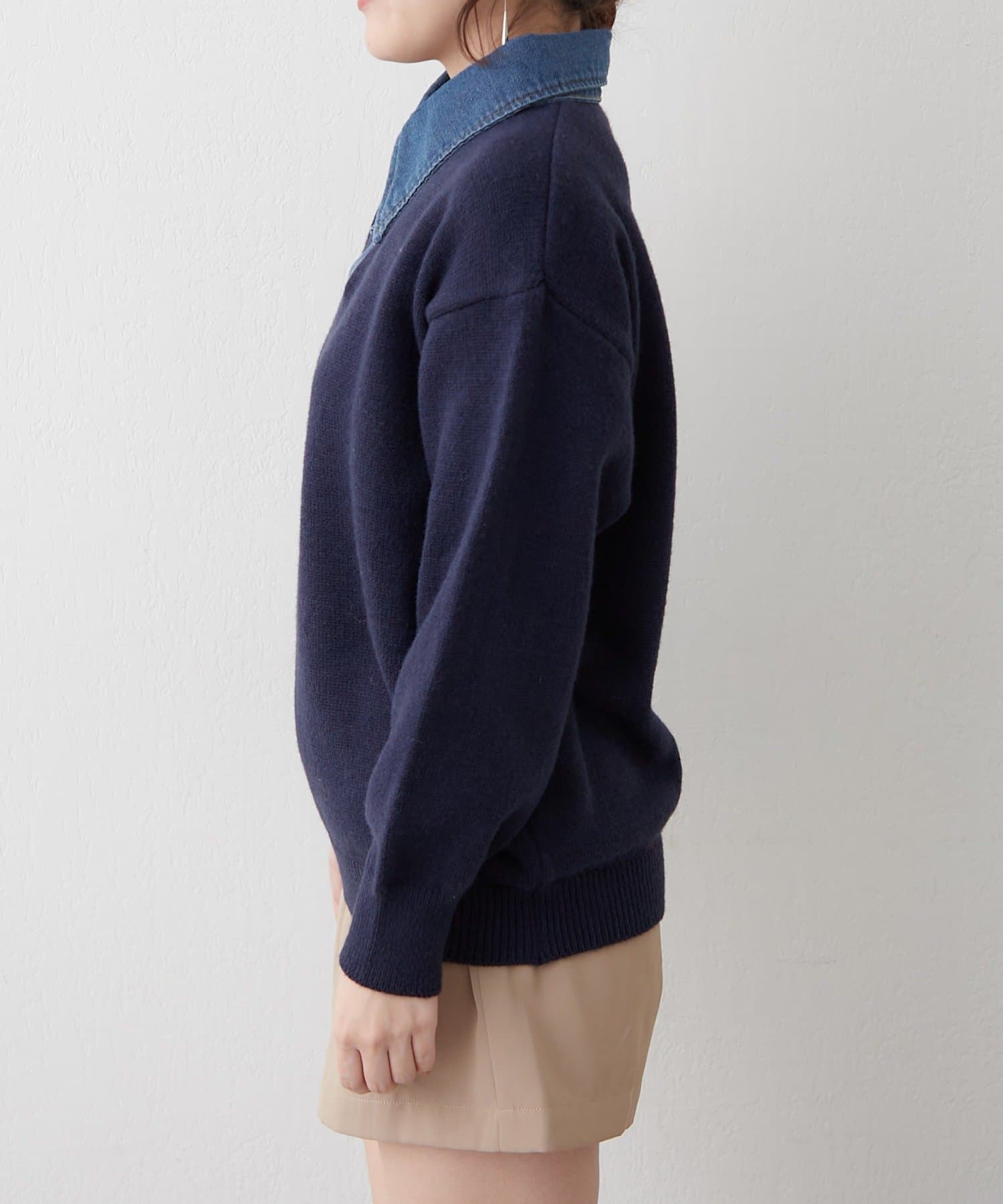 ・デニム襟でカジュアルな印象をプラスしたニットプルオーバー