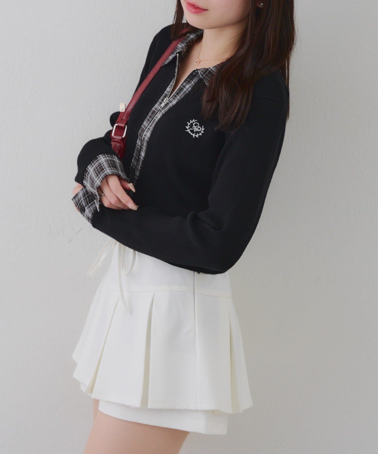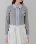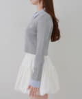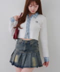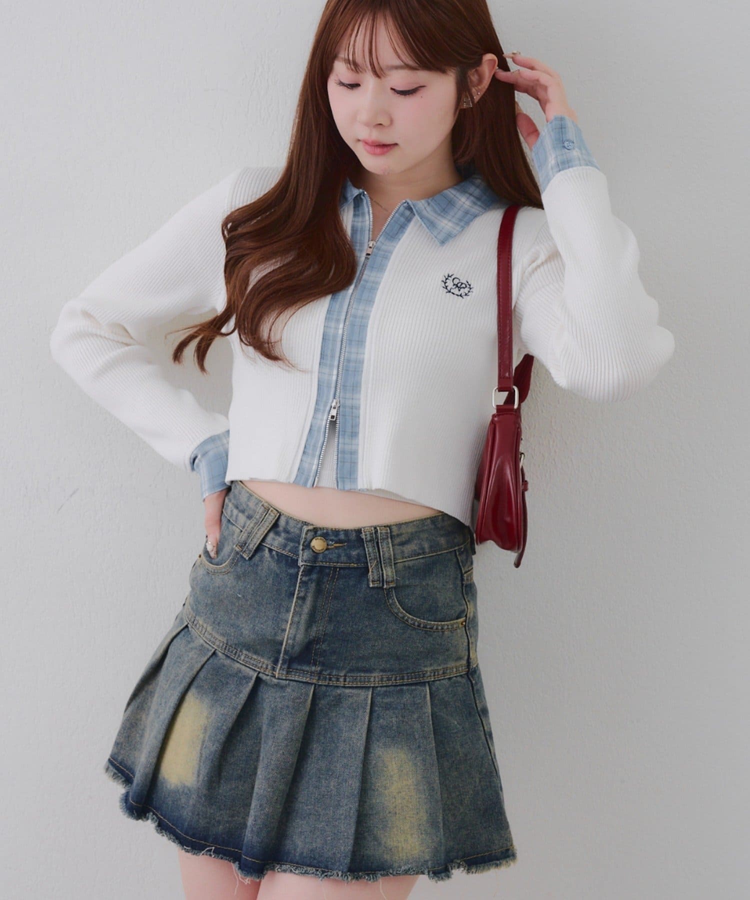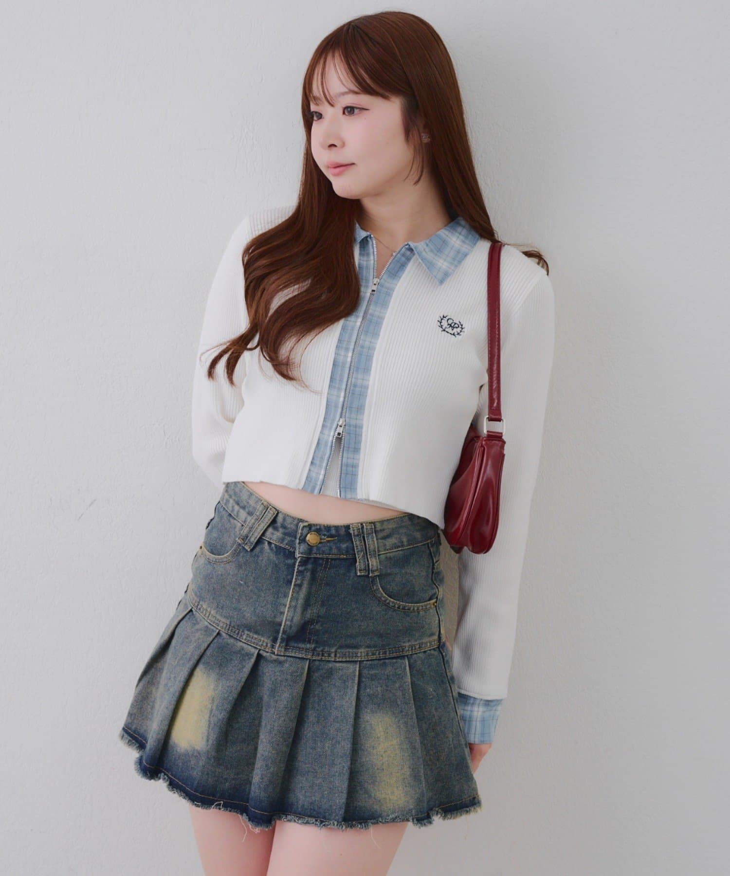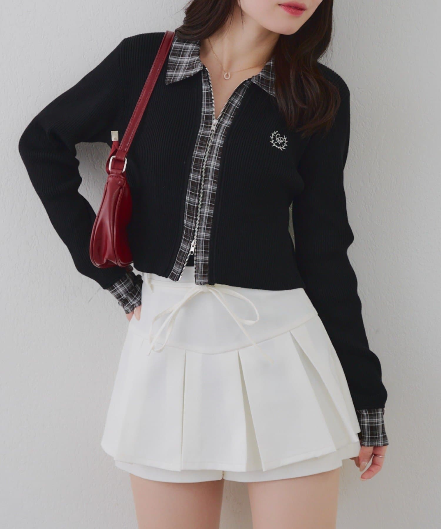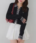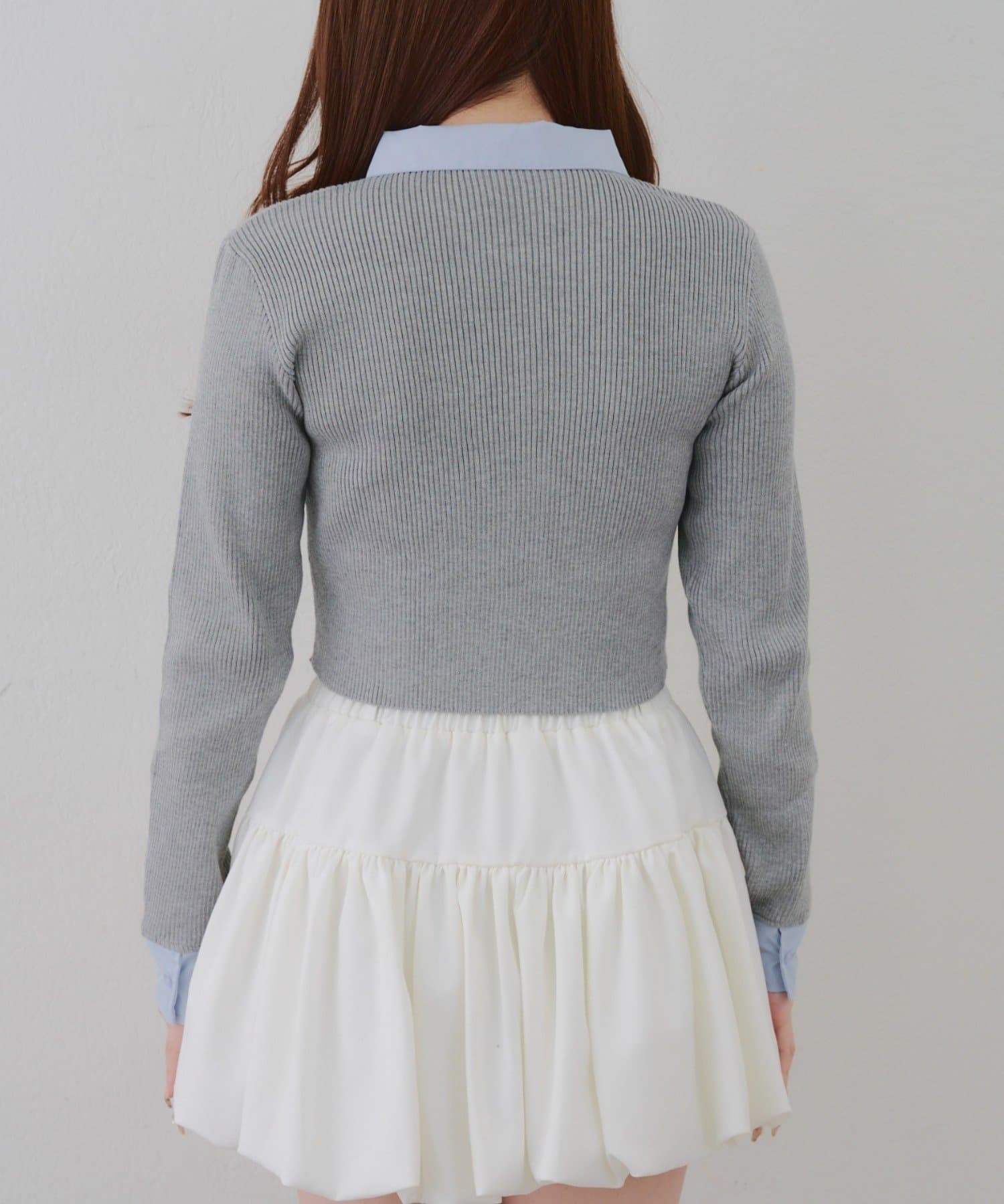 ・シャツ生地ドッキングでアクセントを加えたショート丈トップス