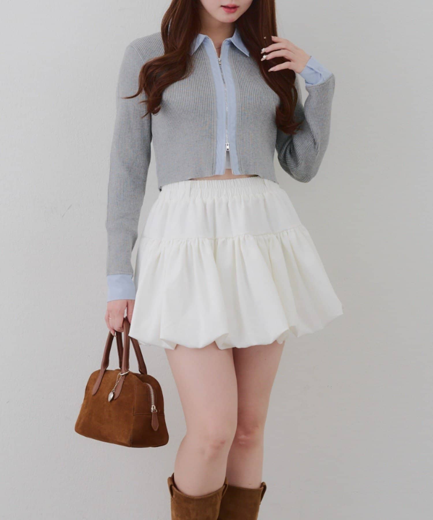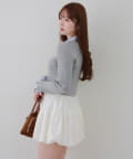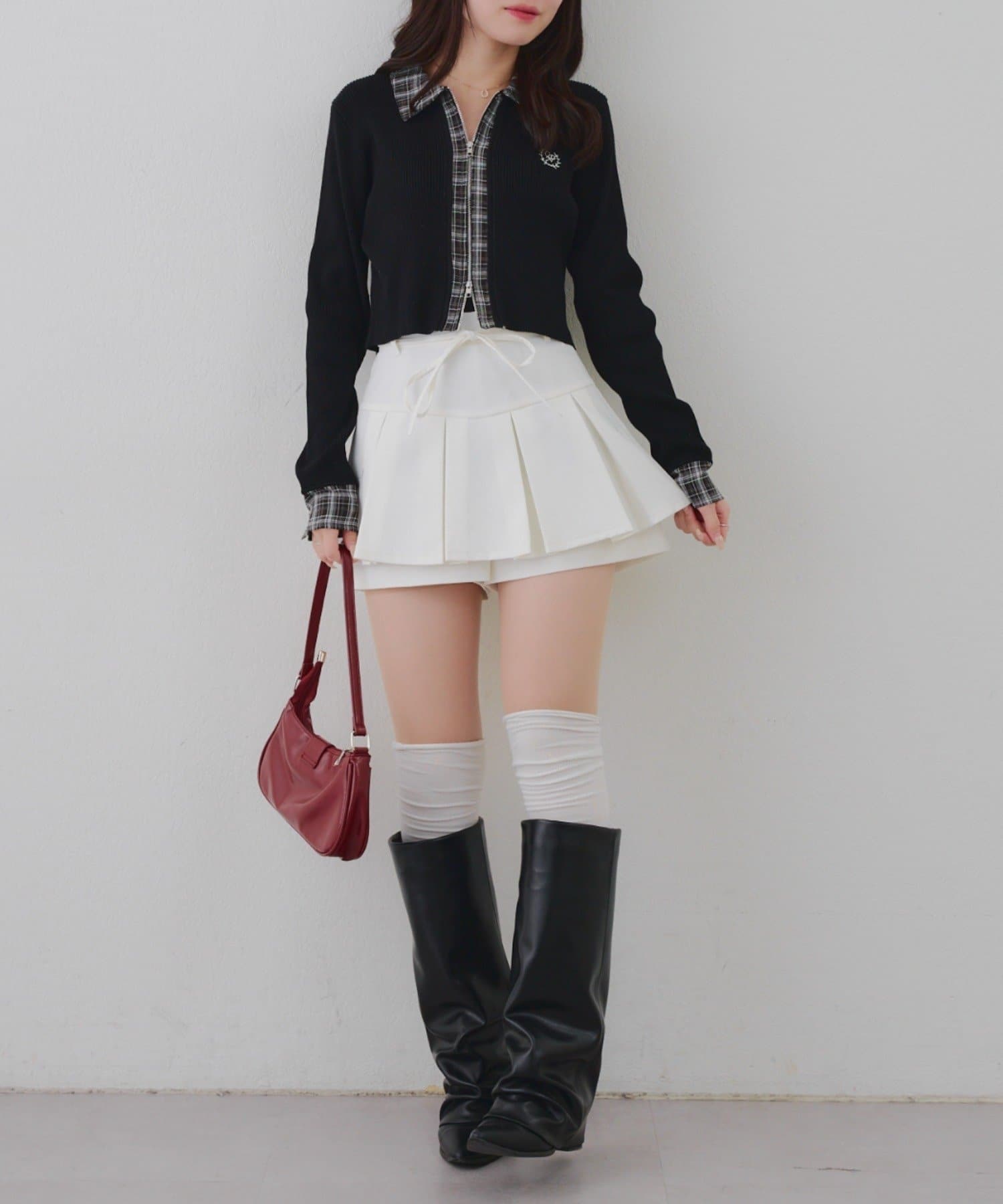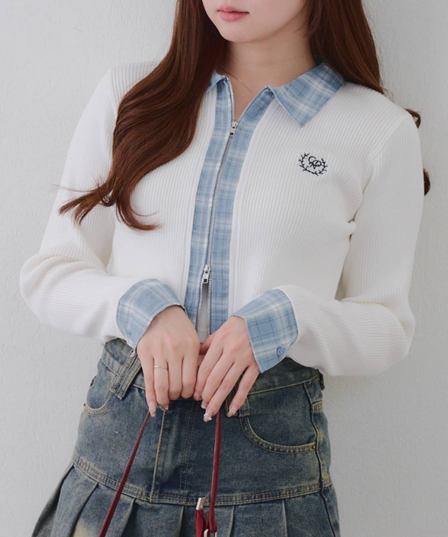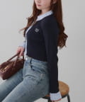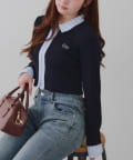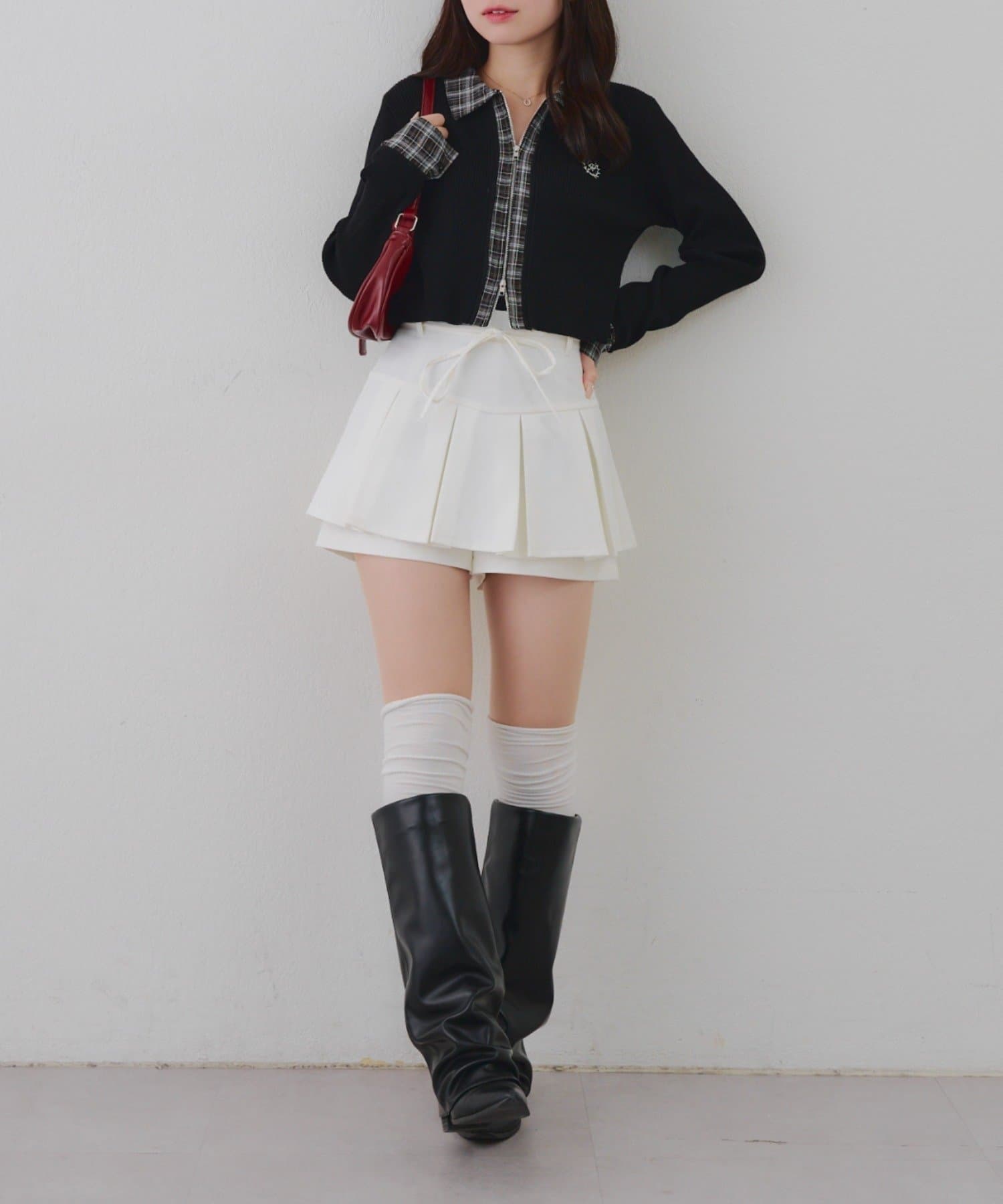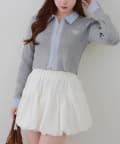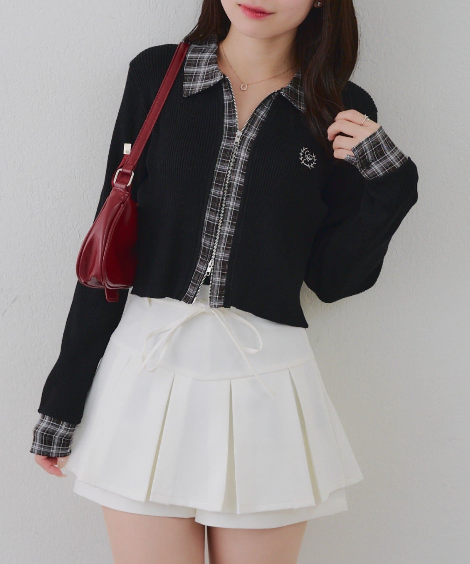 ・シャツ生地ドッキングでアクセントを加えたショート丈トップス