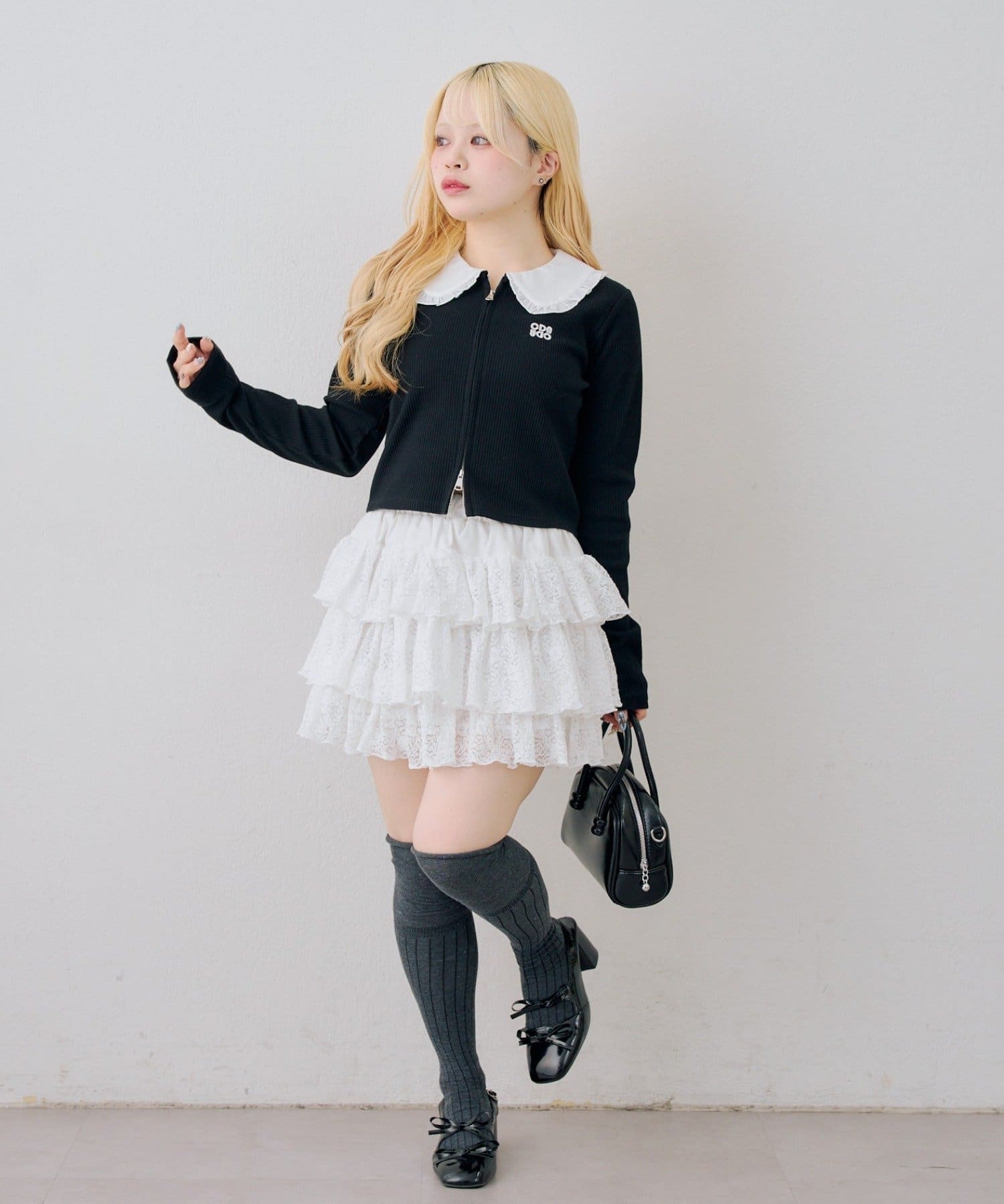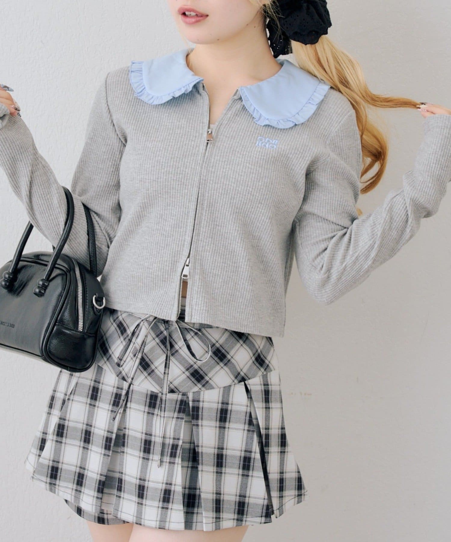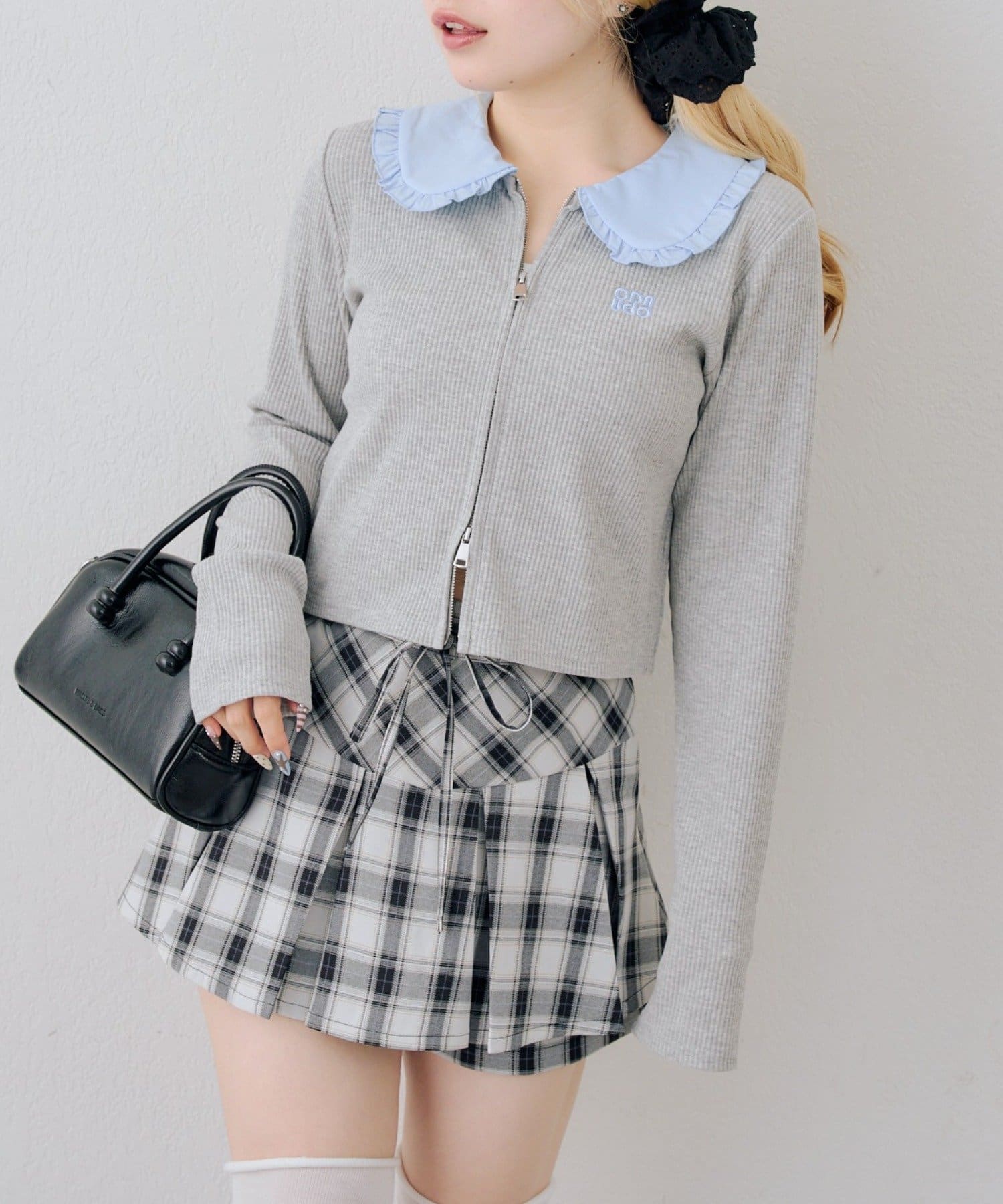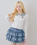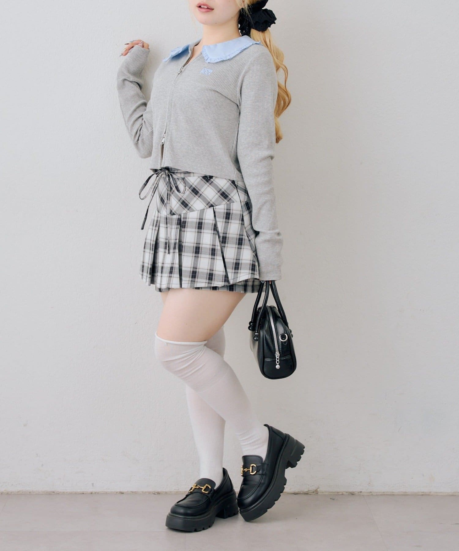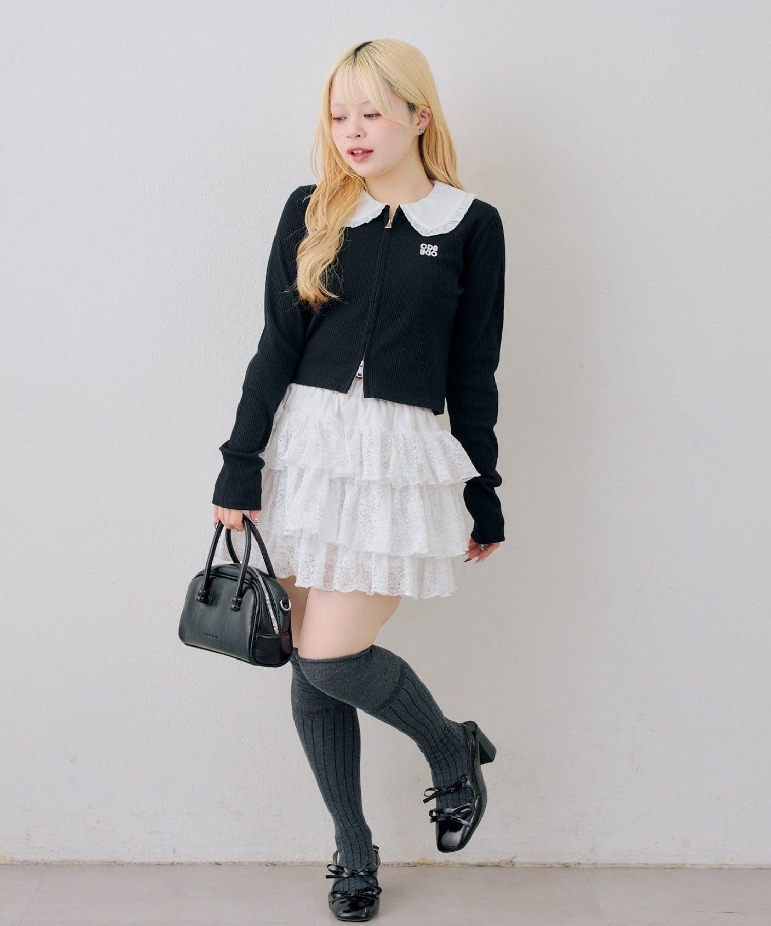 ・ミニスカートと合わせてガーリーに。足元はブーツでバランスを取ると◎