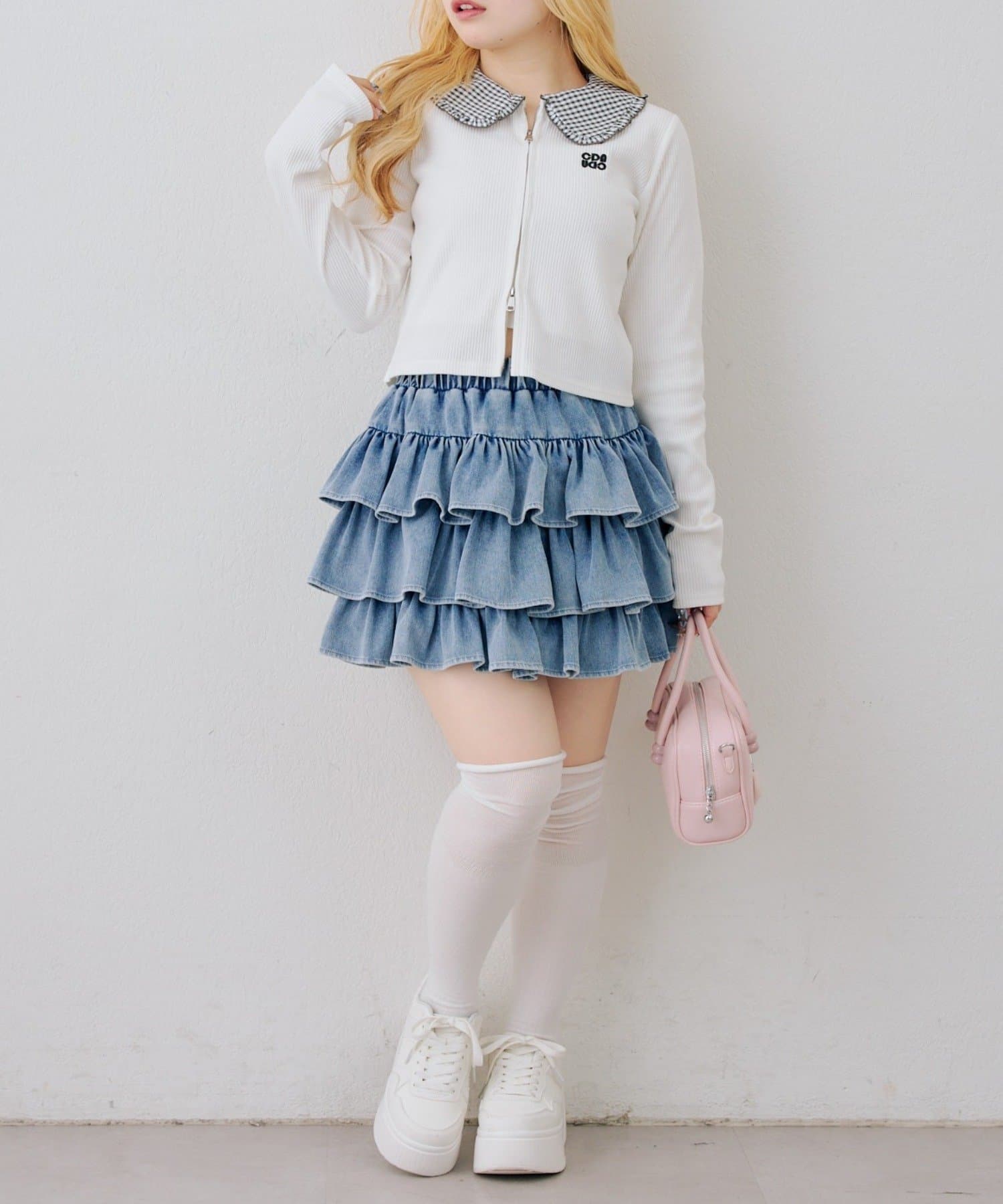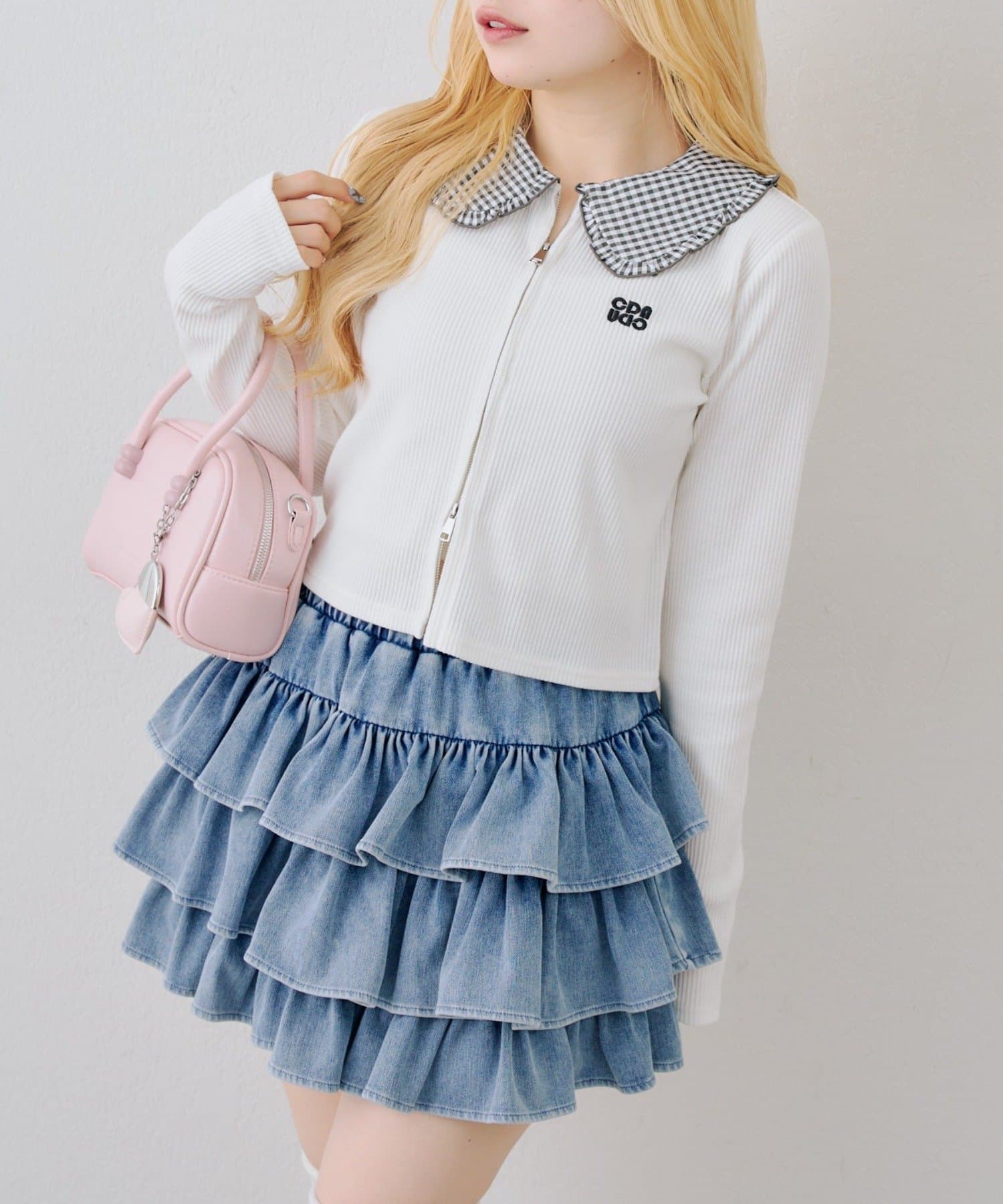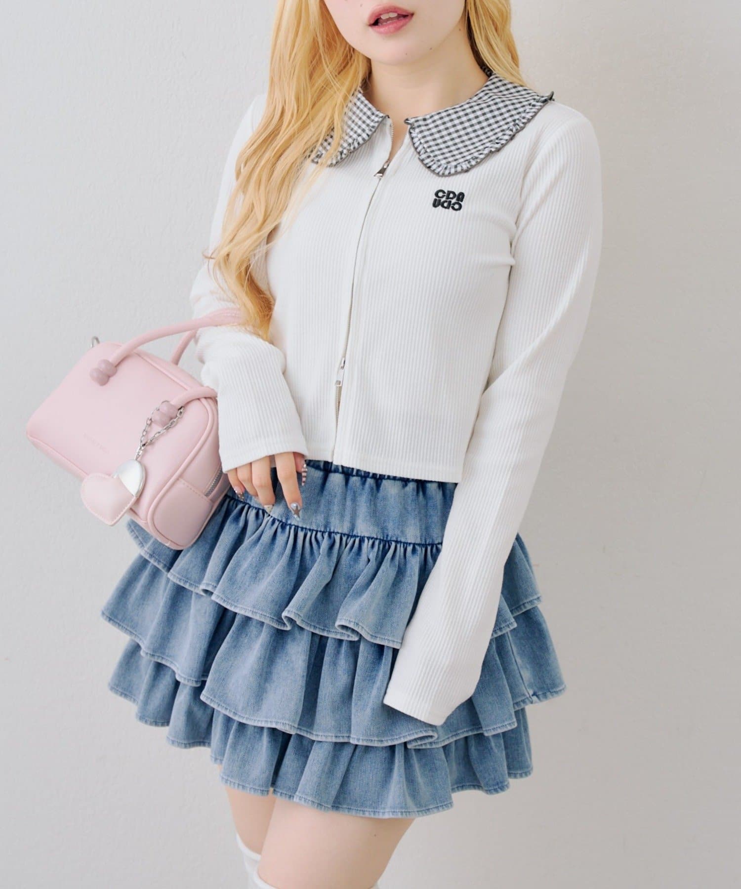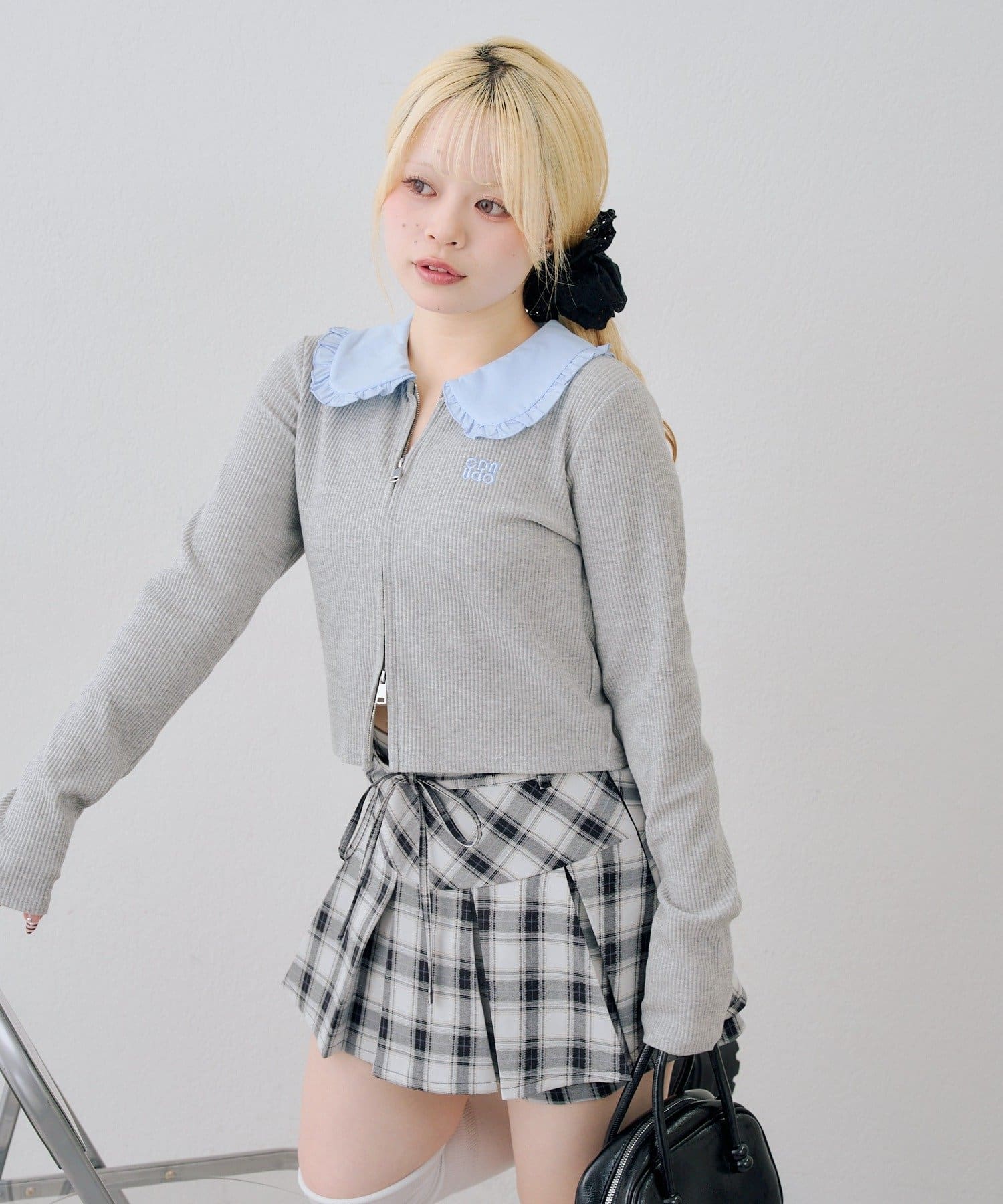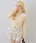 ・ミニスカートと合わせてガーリーに。足元はブーツでバランスを取ると◎