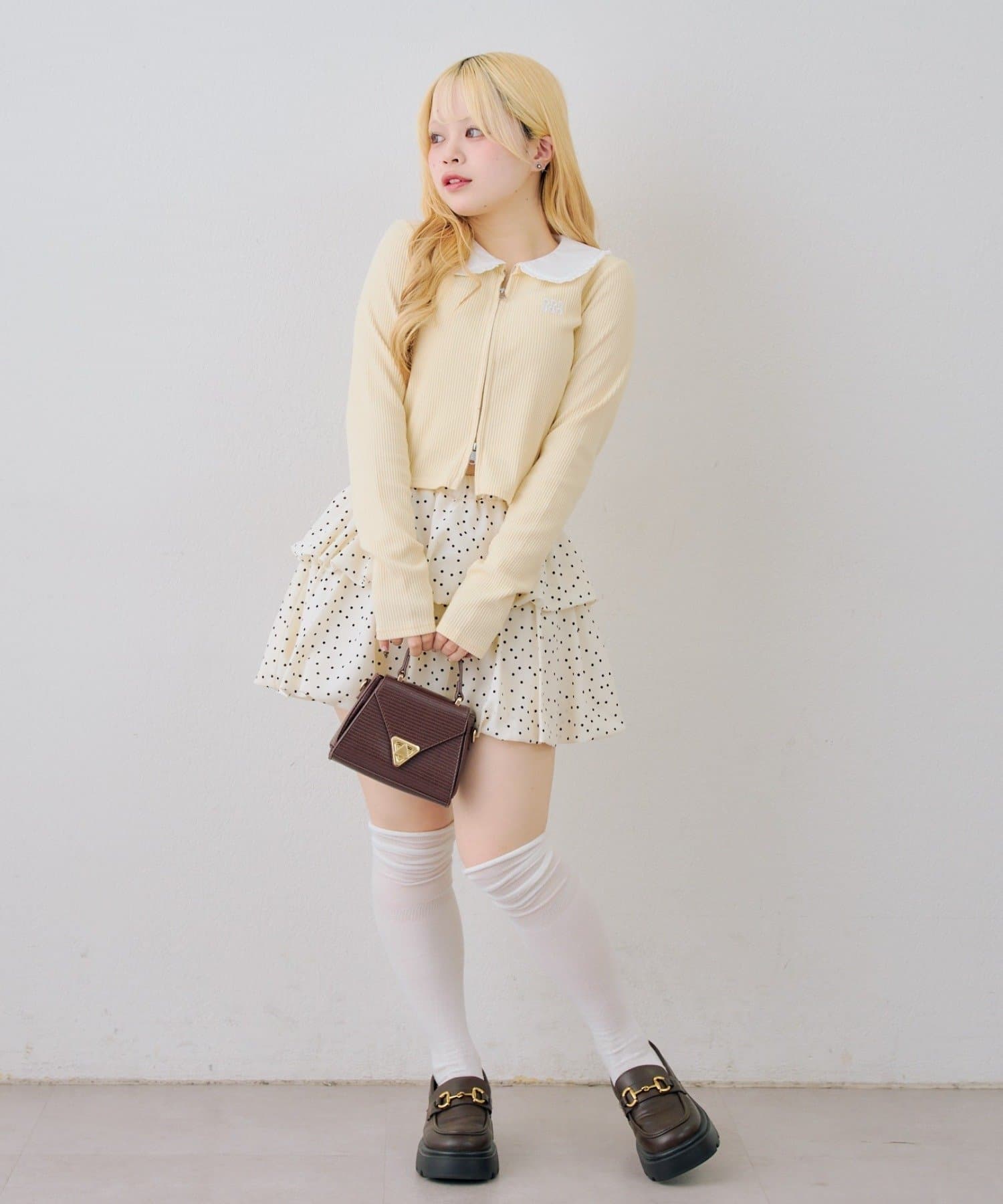 ・ミニスカートと合わせてガーリーに。足元はブーツでバランスを取ると◎