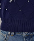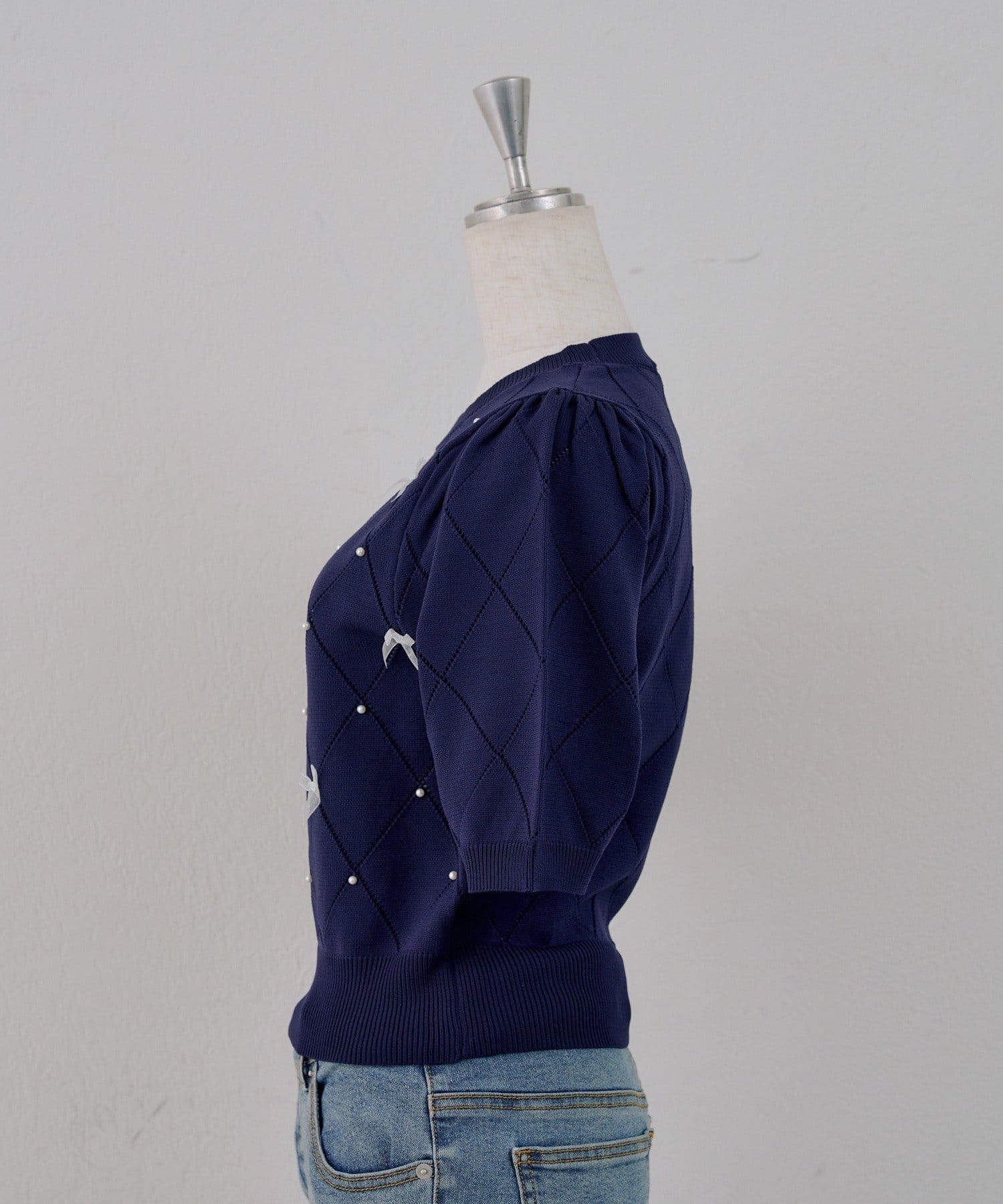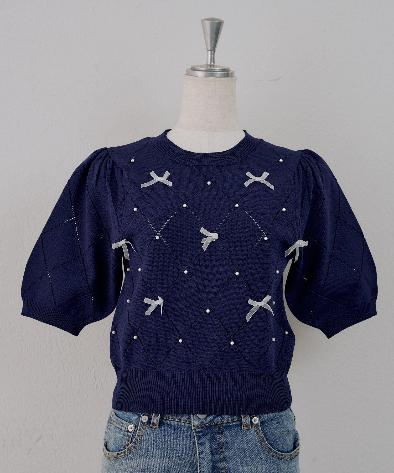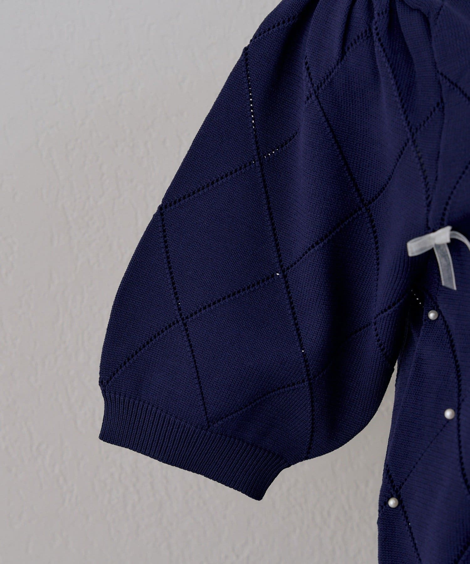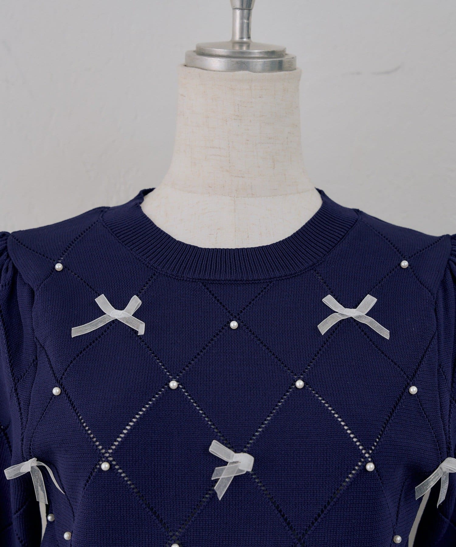 ・オーガンジーリボンとパールが上品なアクセントになったニットトップス