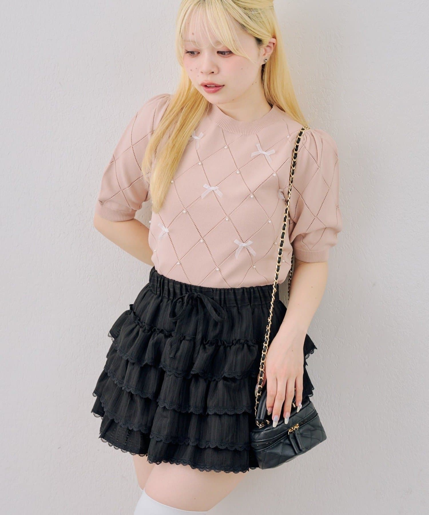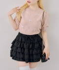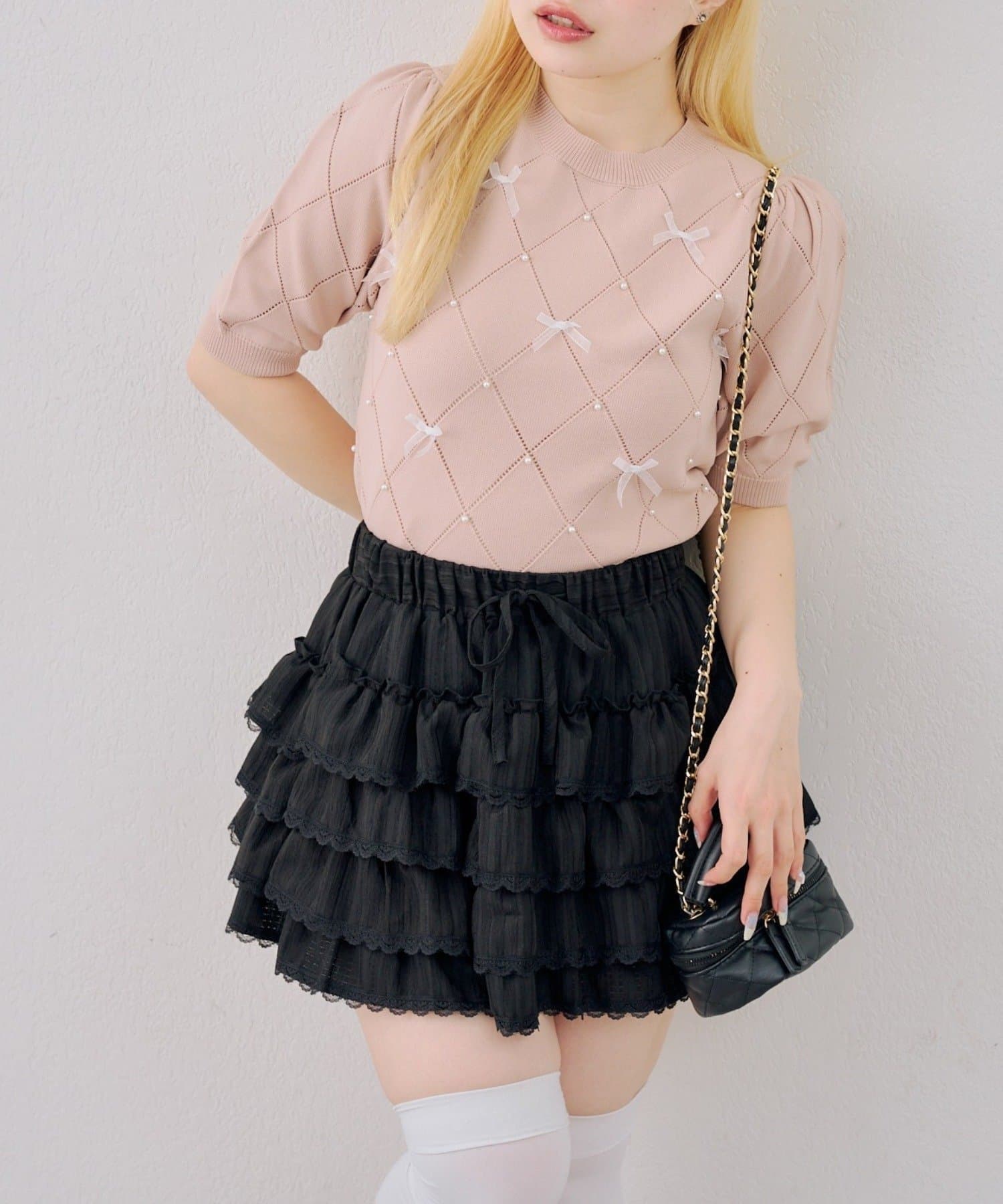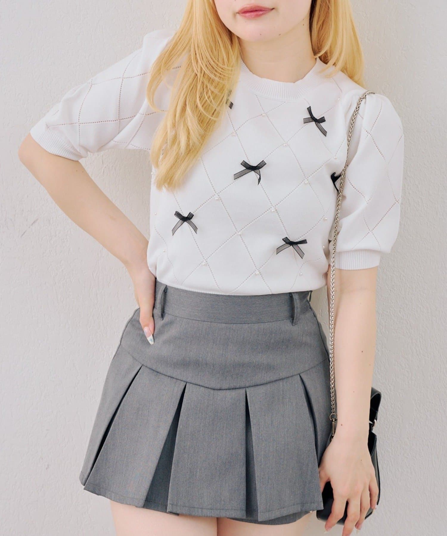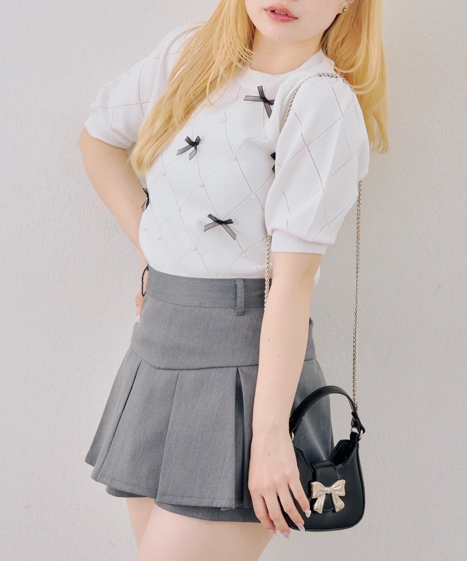 ・オーガンジーリボンとパールが上品なアクセントになったニットトップス