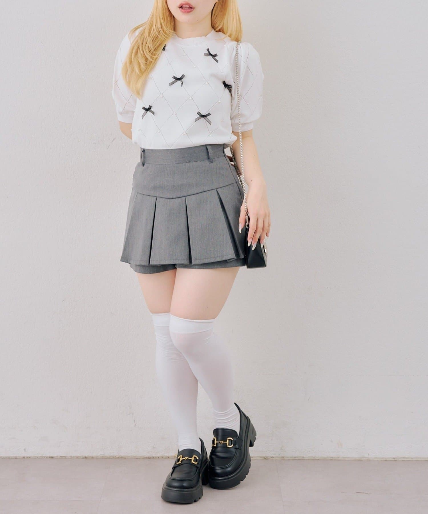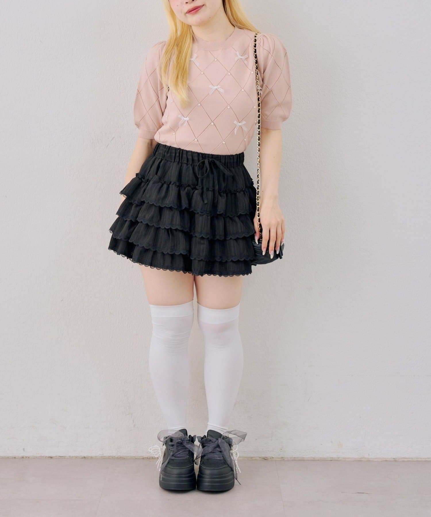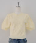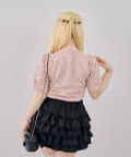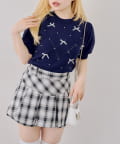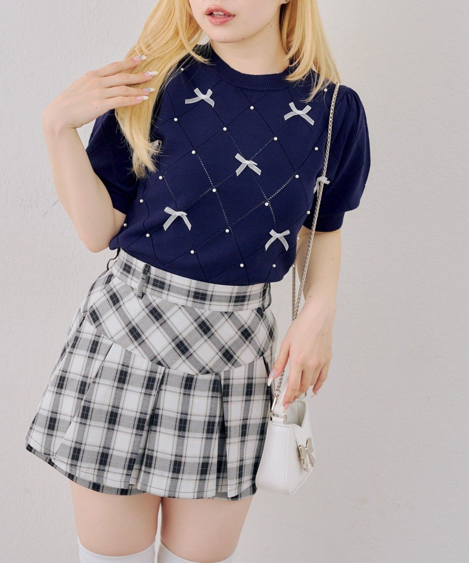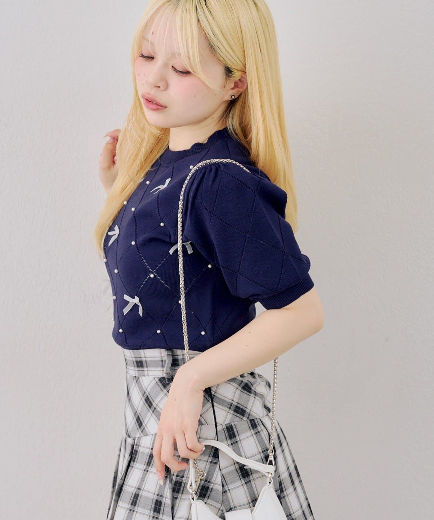 ・オーガンジーリボンとパールが上品なアクセントになったニットトップス