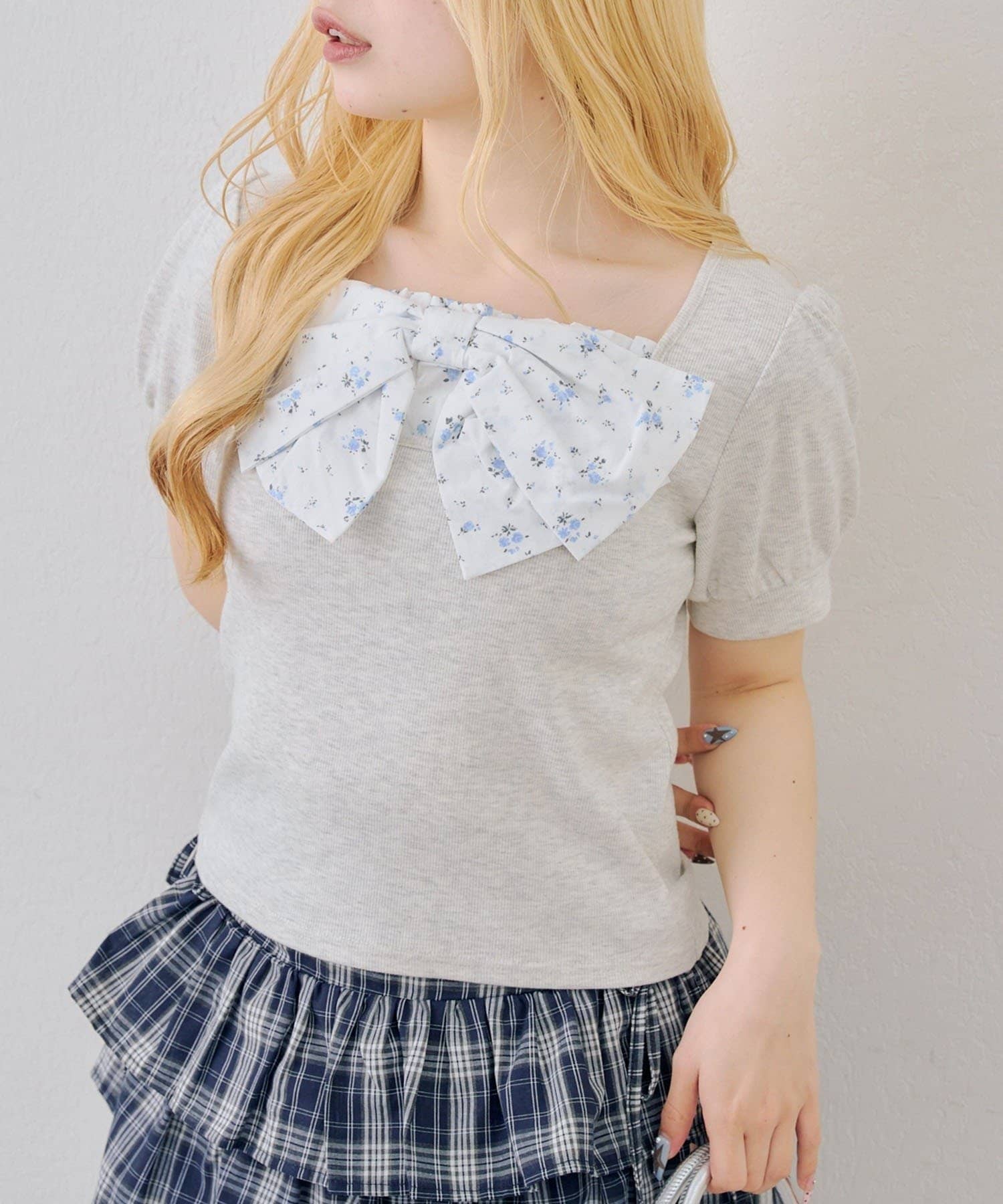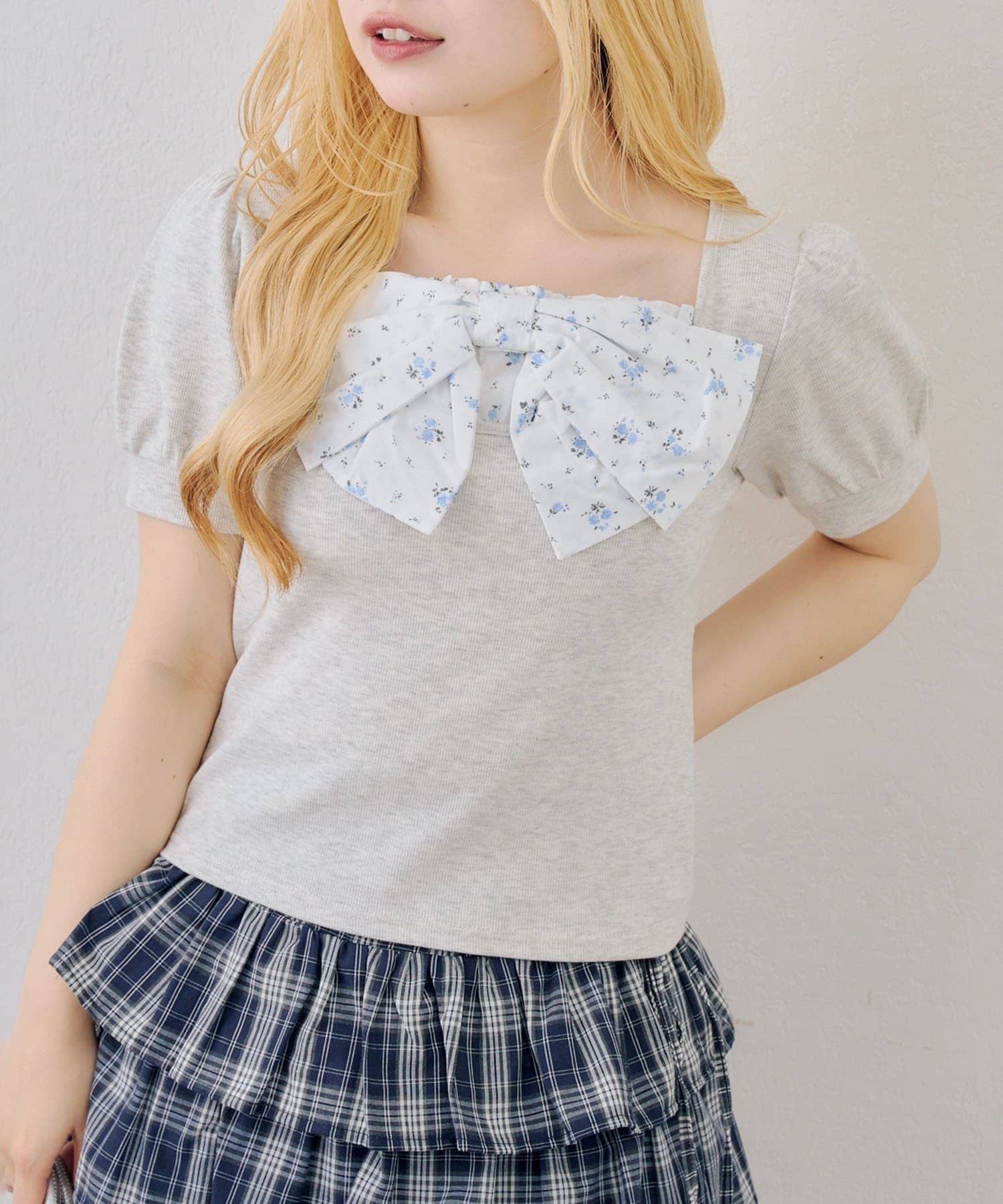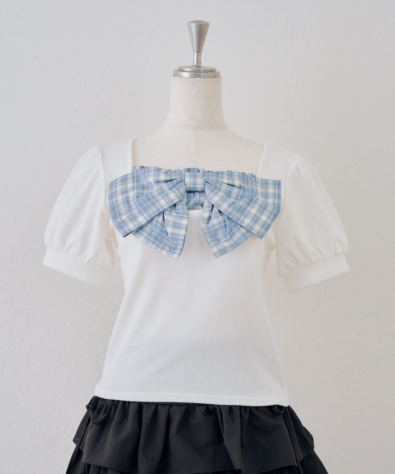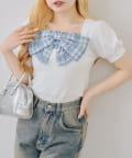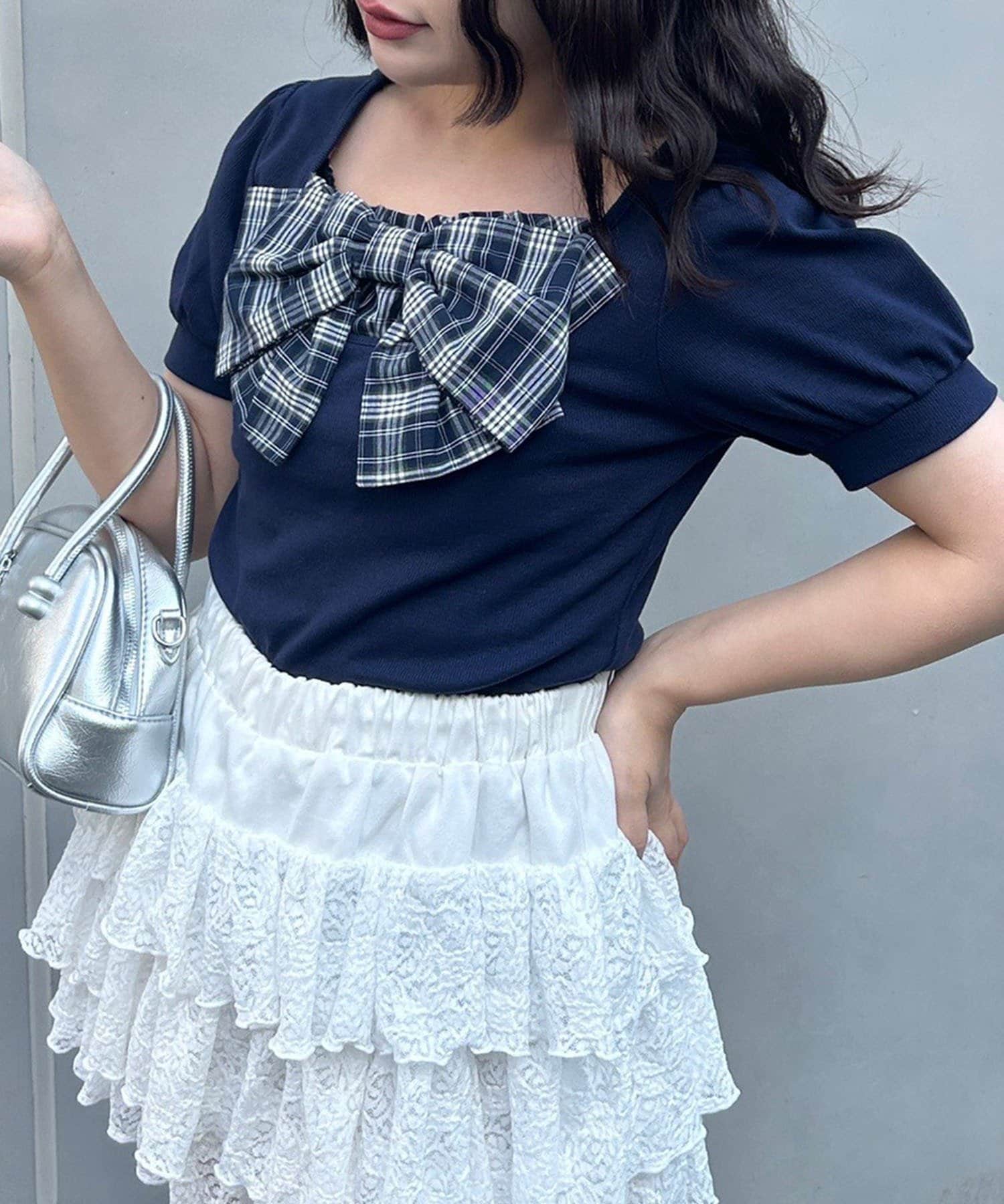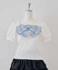 ・目を引く大きなチェックリボンがポイントのトップス
