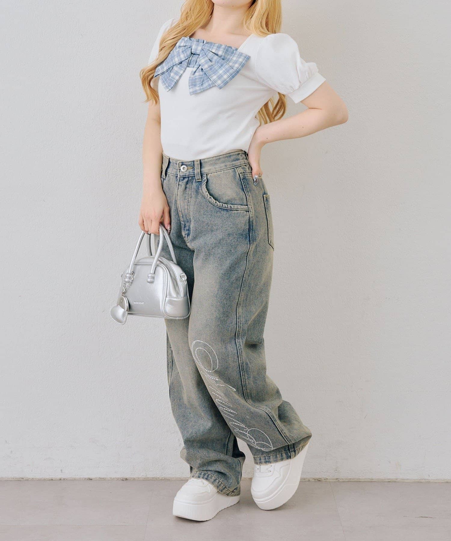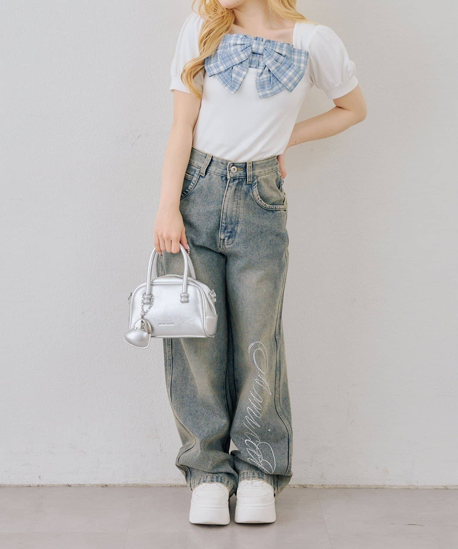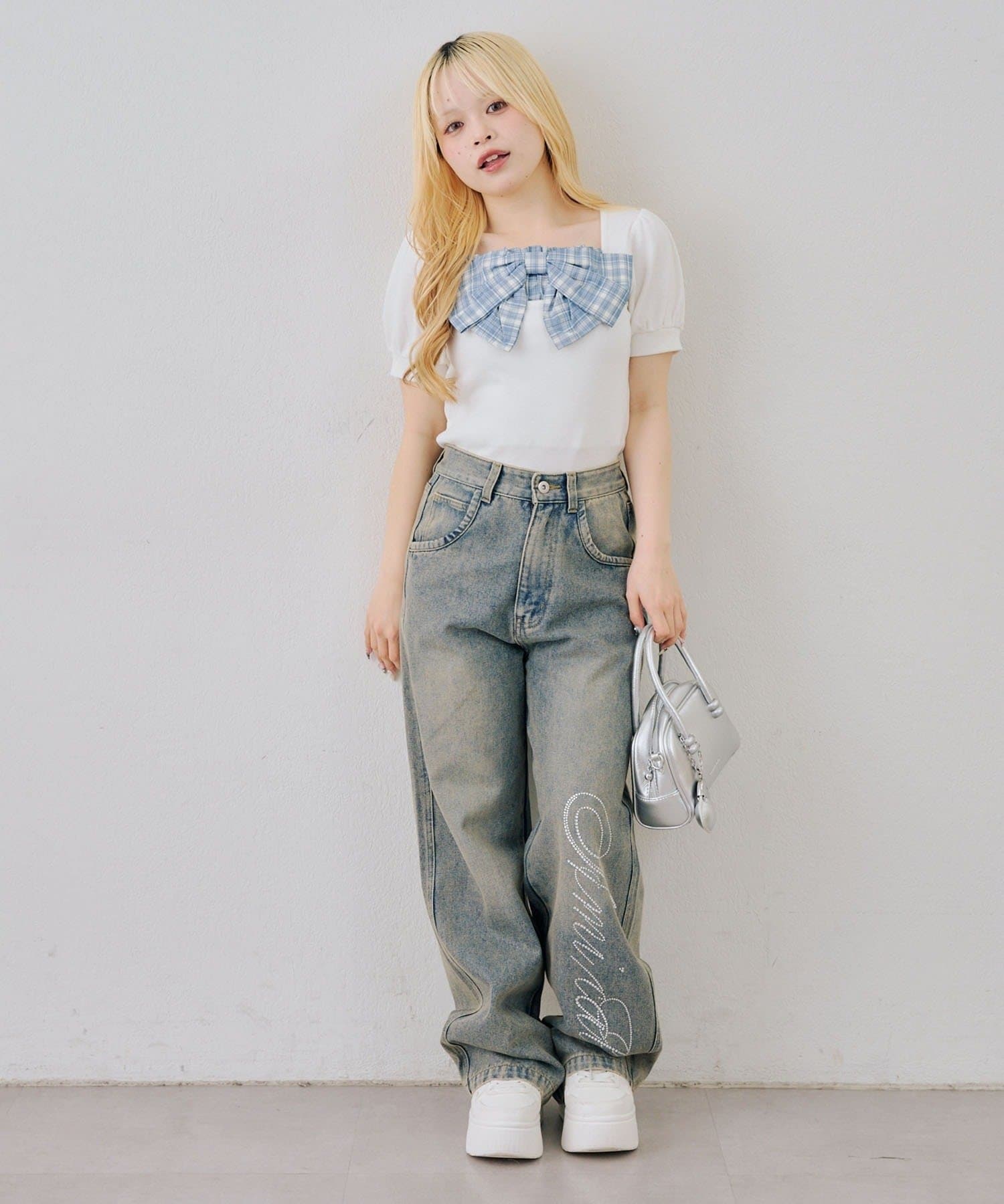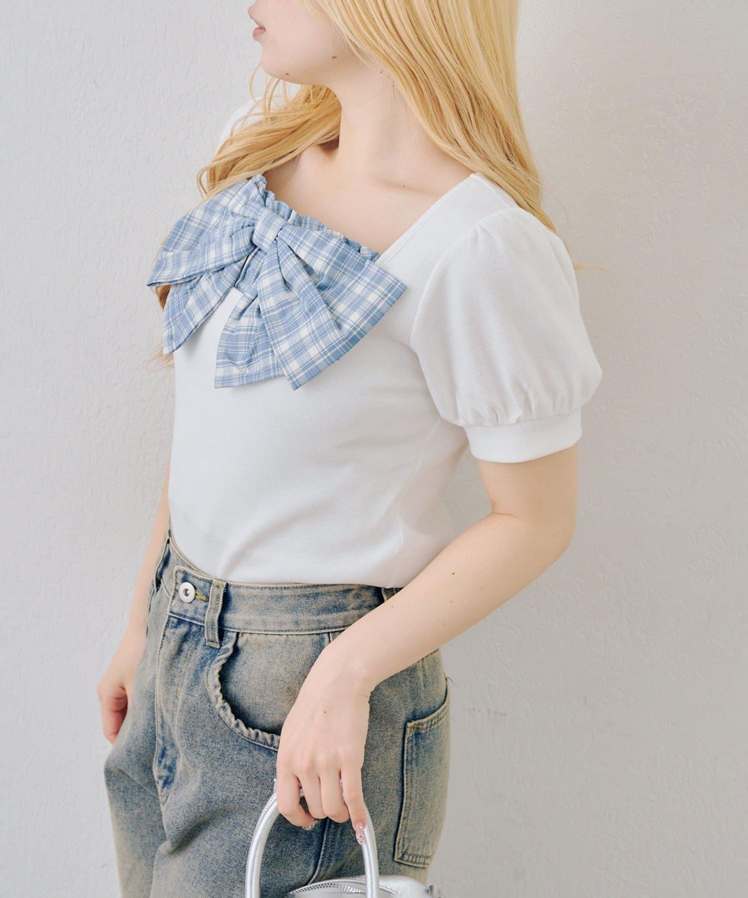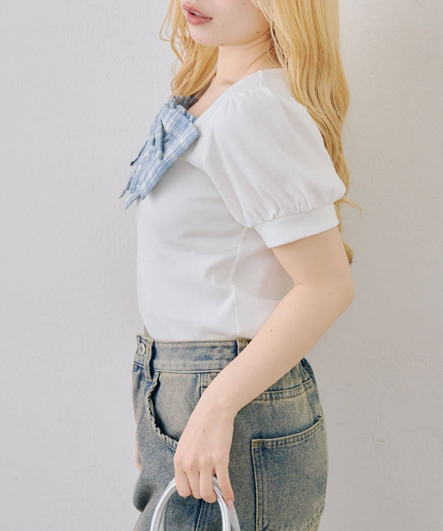 ・目を引く大きなチェックリボンがポイントのトップス