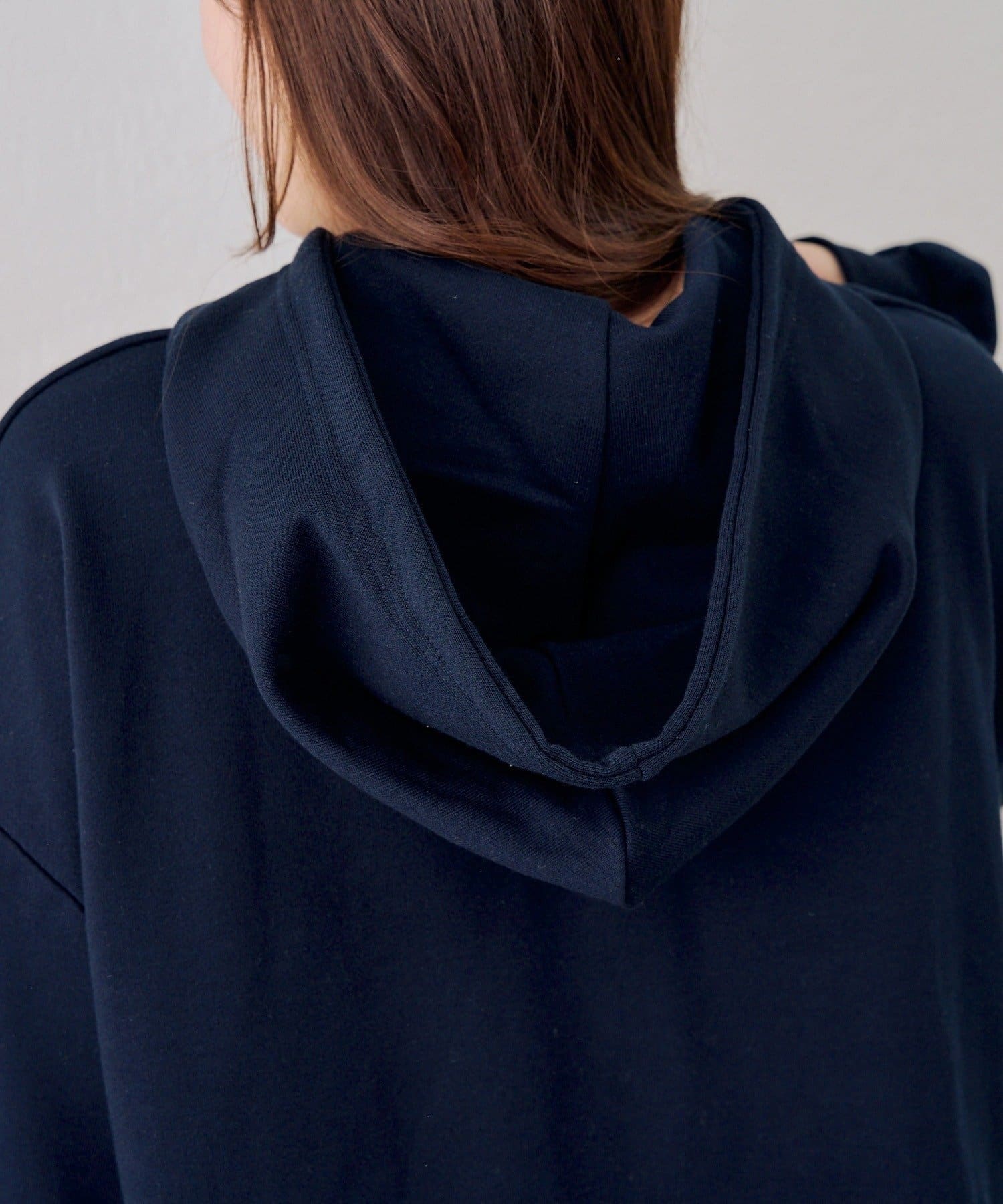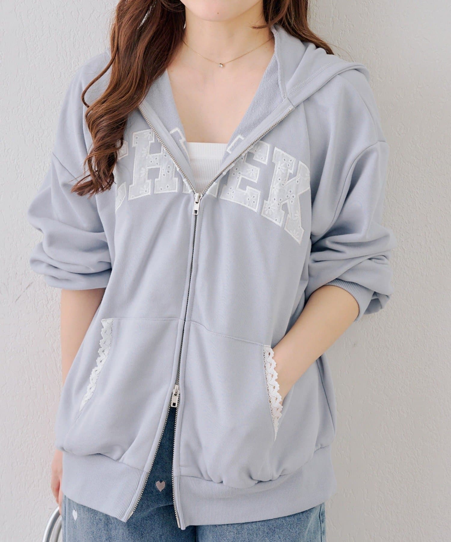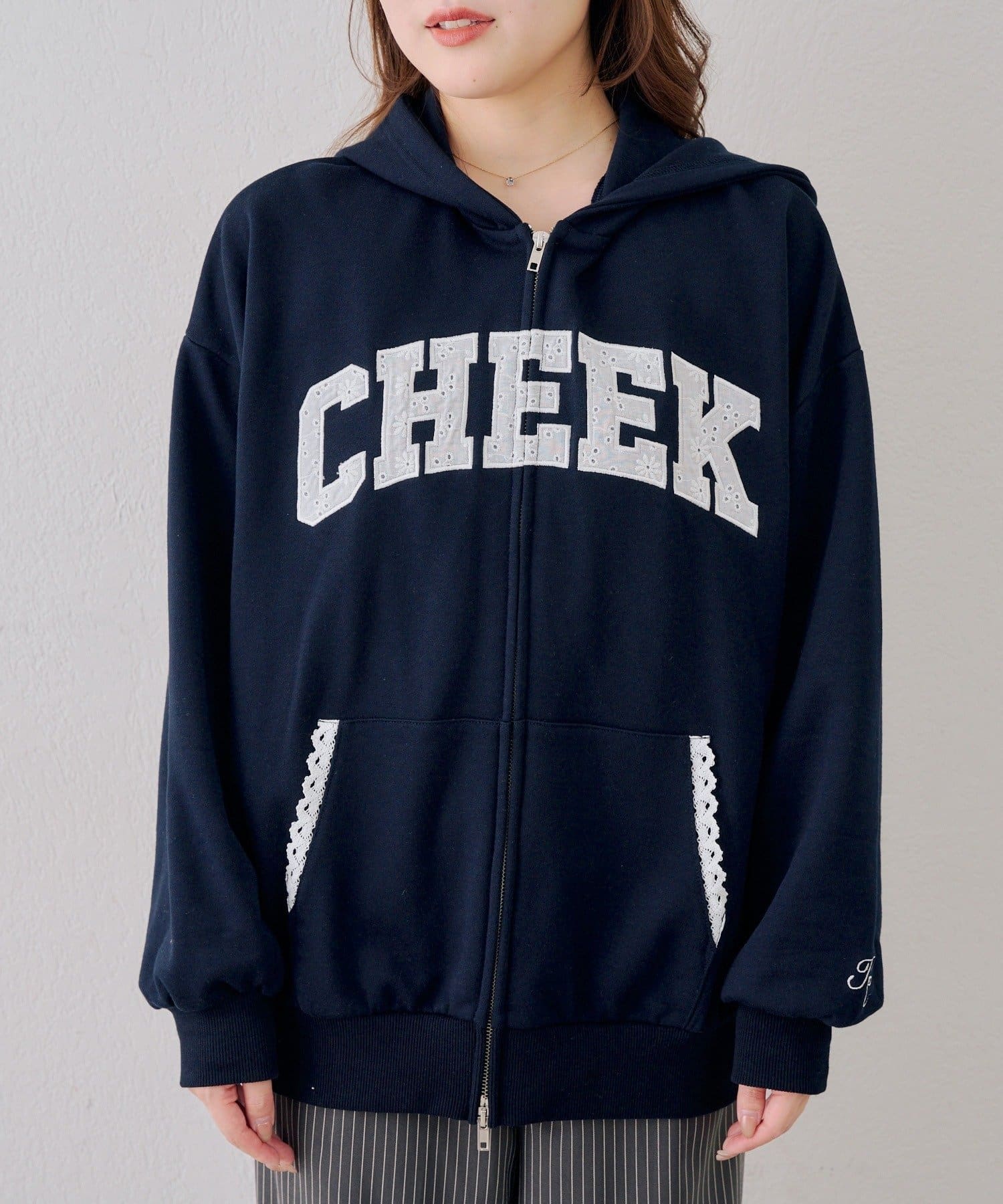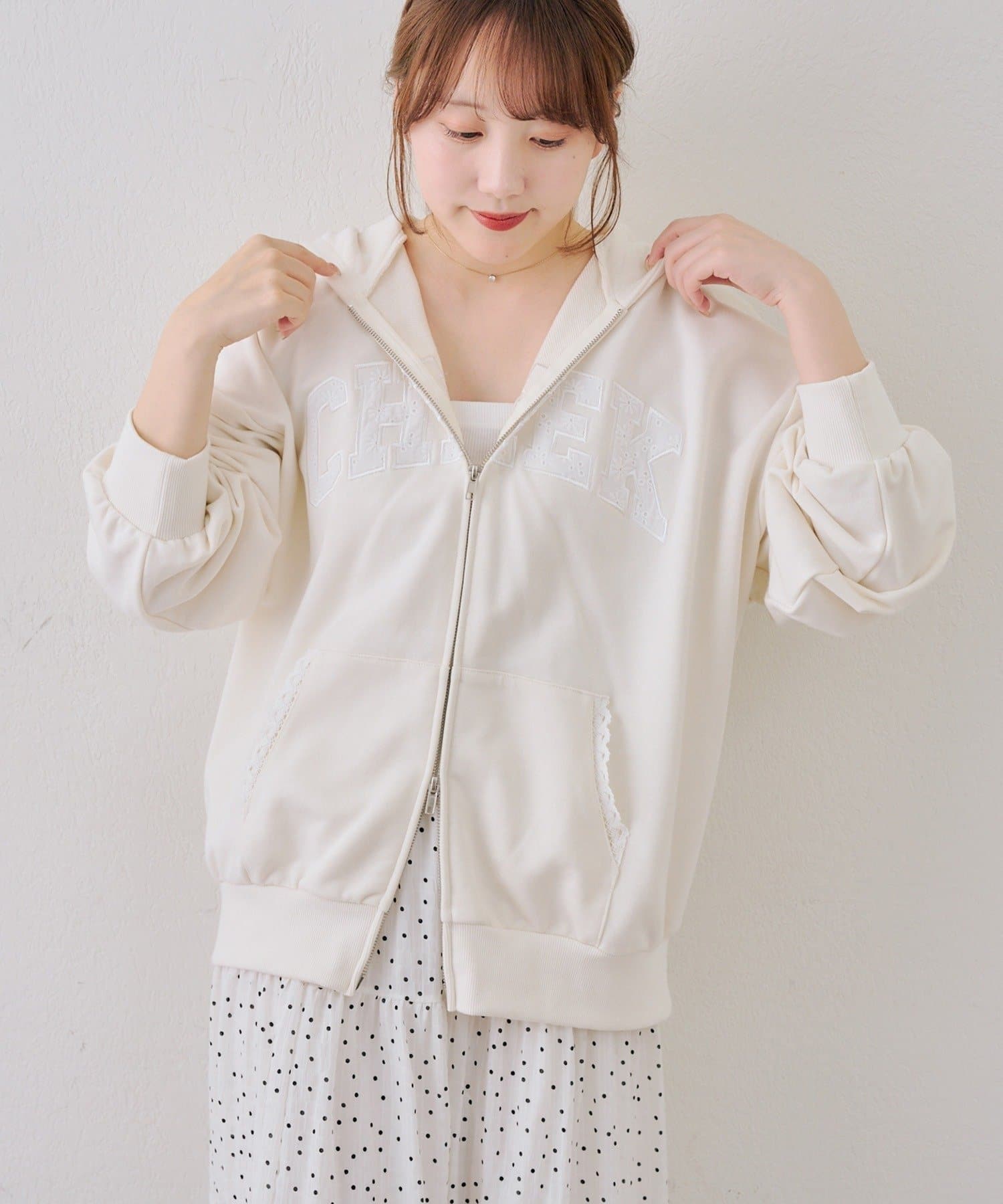 ・繊細な刺繍のロゴが映えるジップアップフーディ