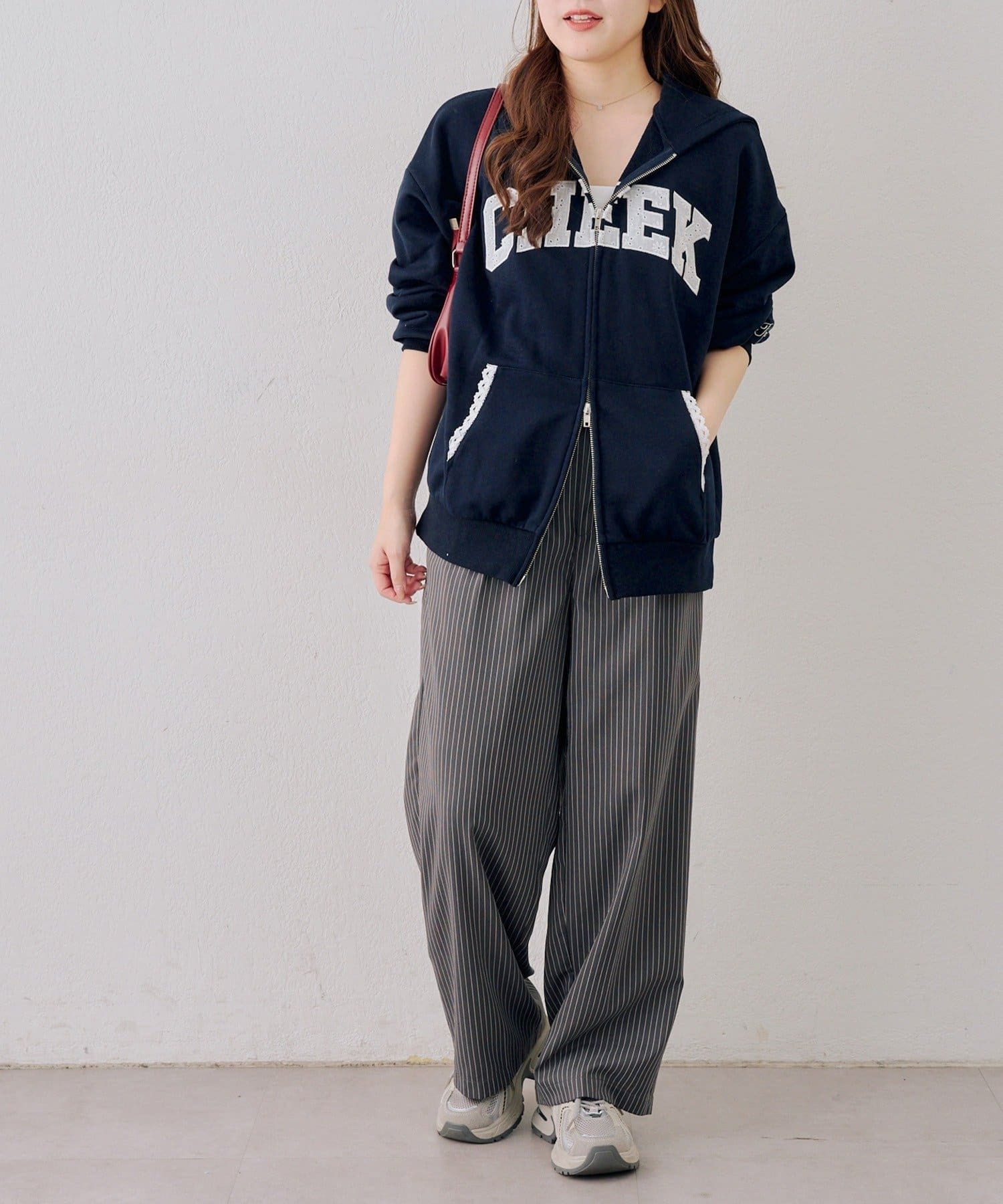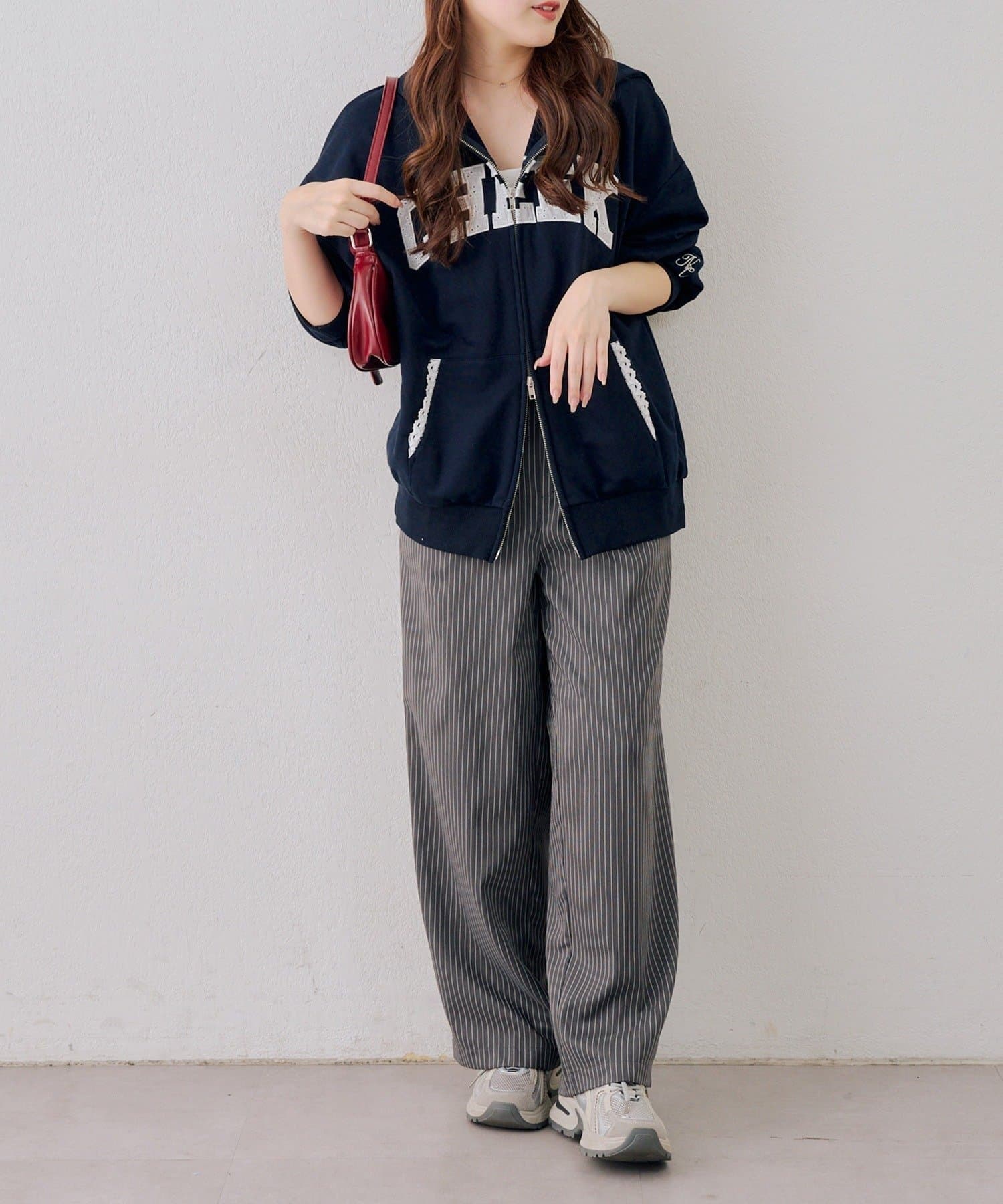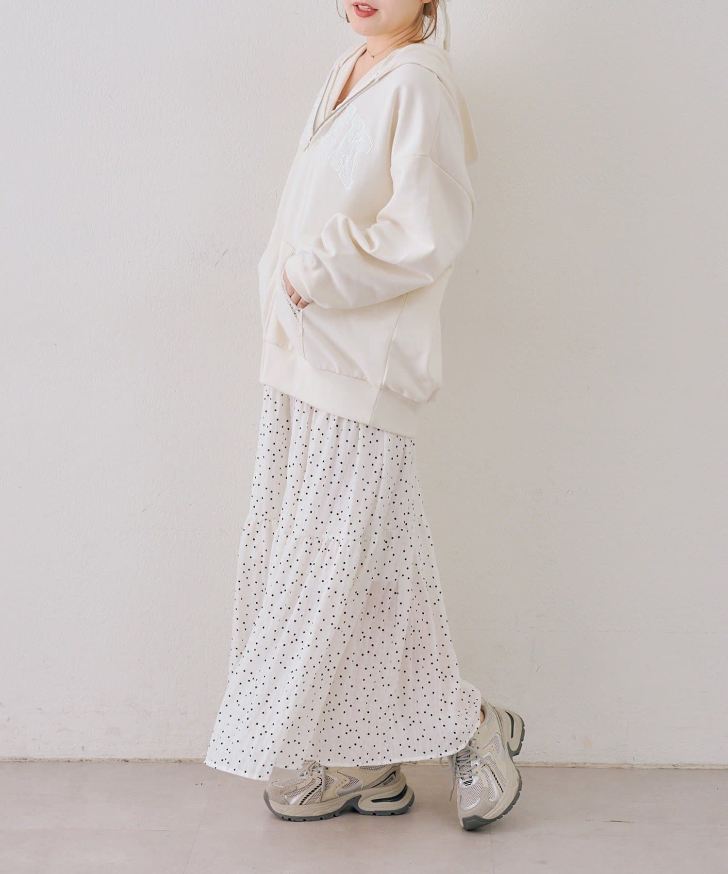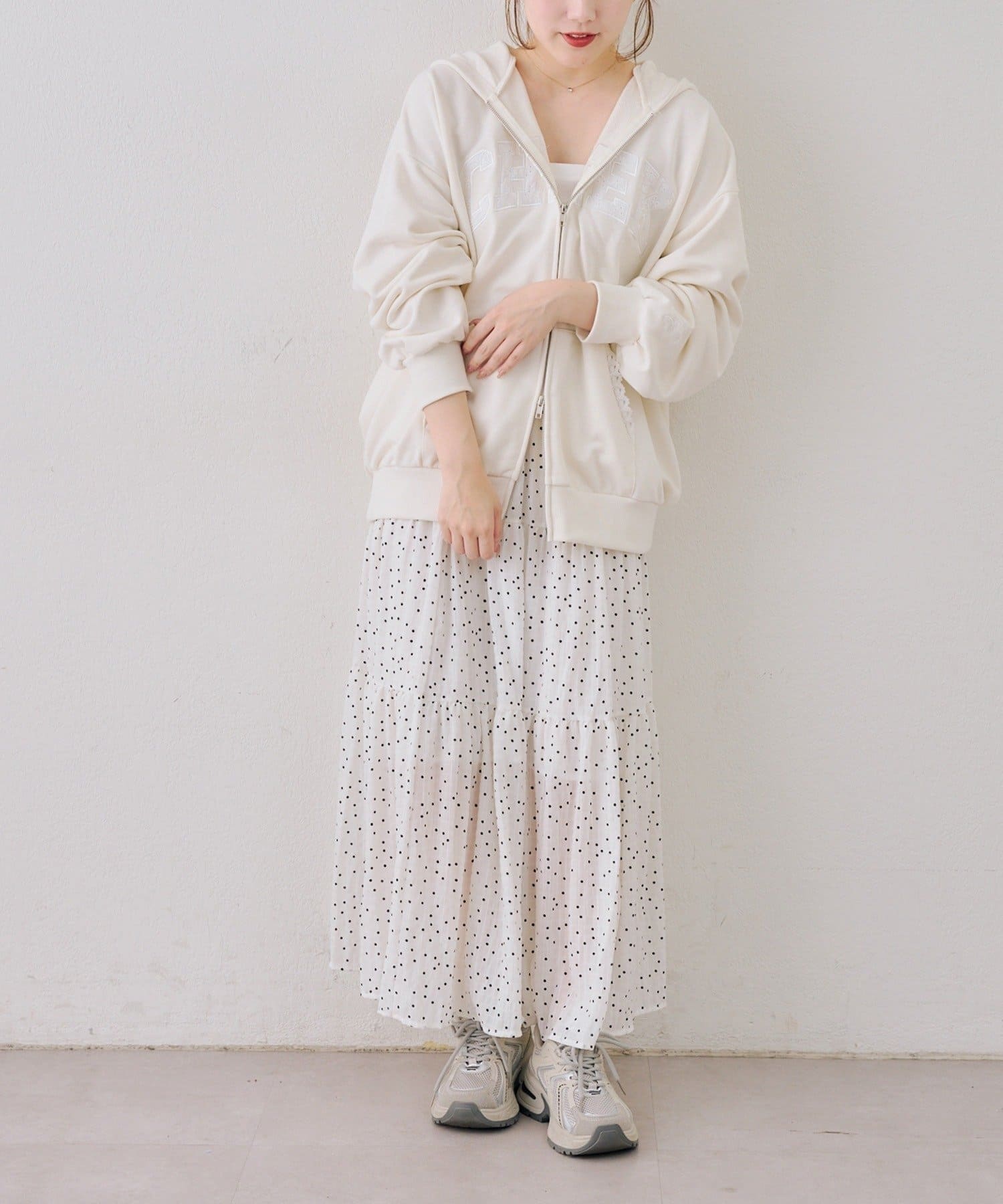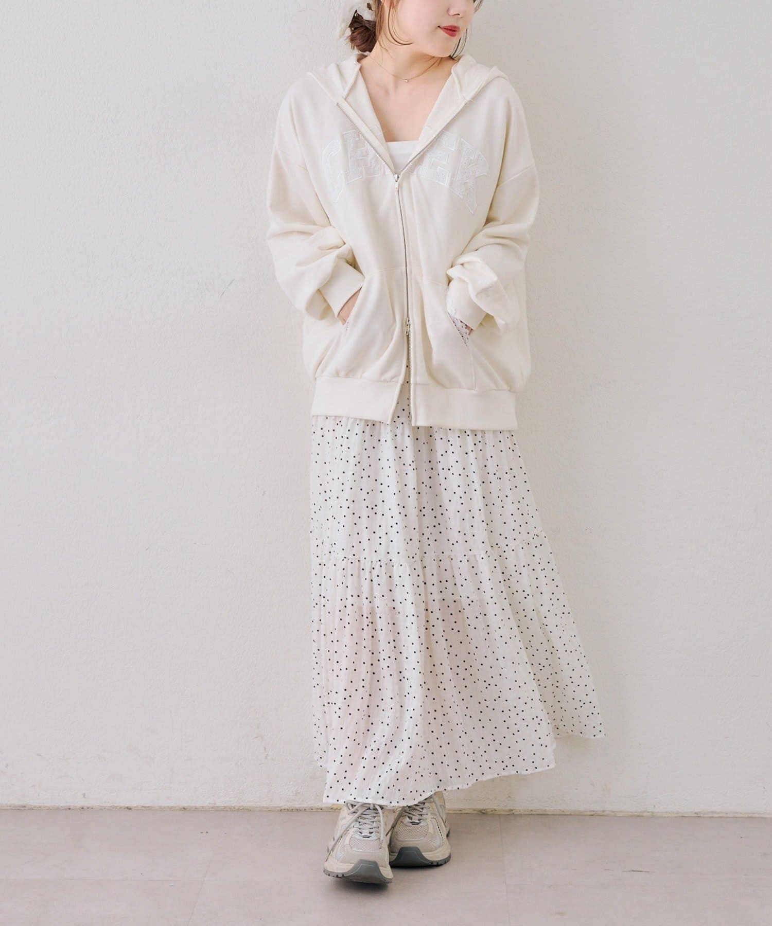 ・フーディにフレアスカートを合わせて、足元はスニーカーでカジュアルダウン。甘すぎない、大人のミックススタイルを楽しんで