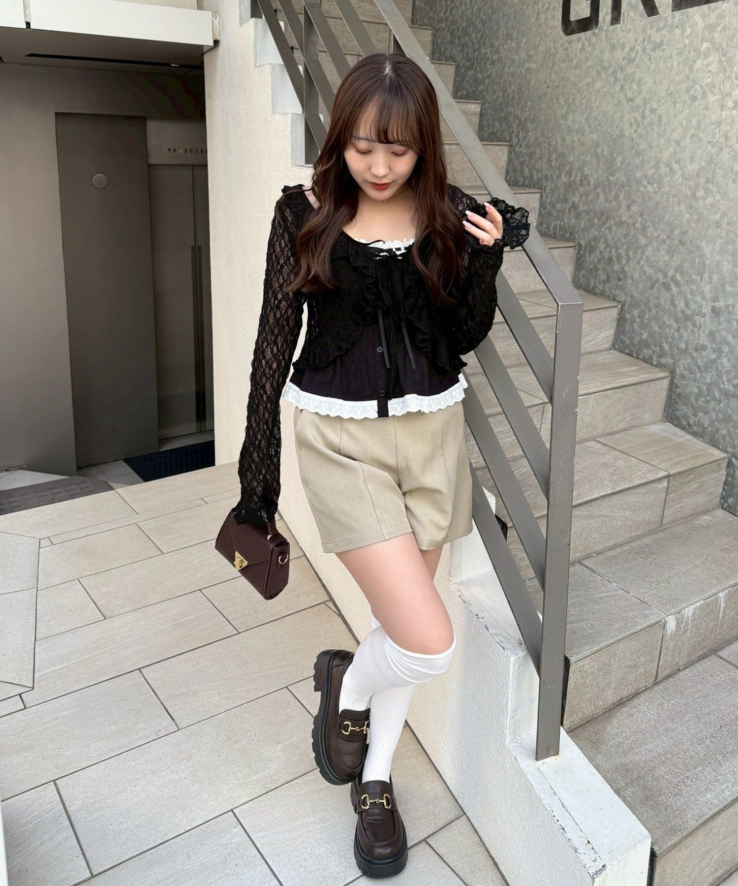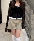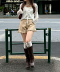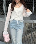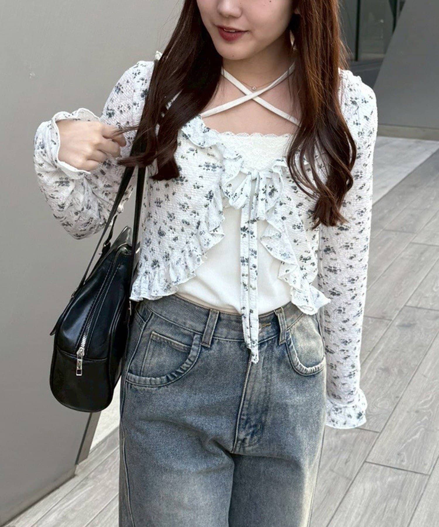・繊細なフリルが顔周りを華やかに演出し、フェミニンな印象を与えるカーディガン
