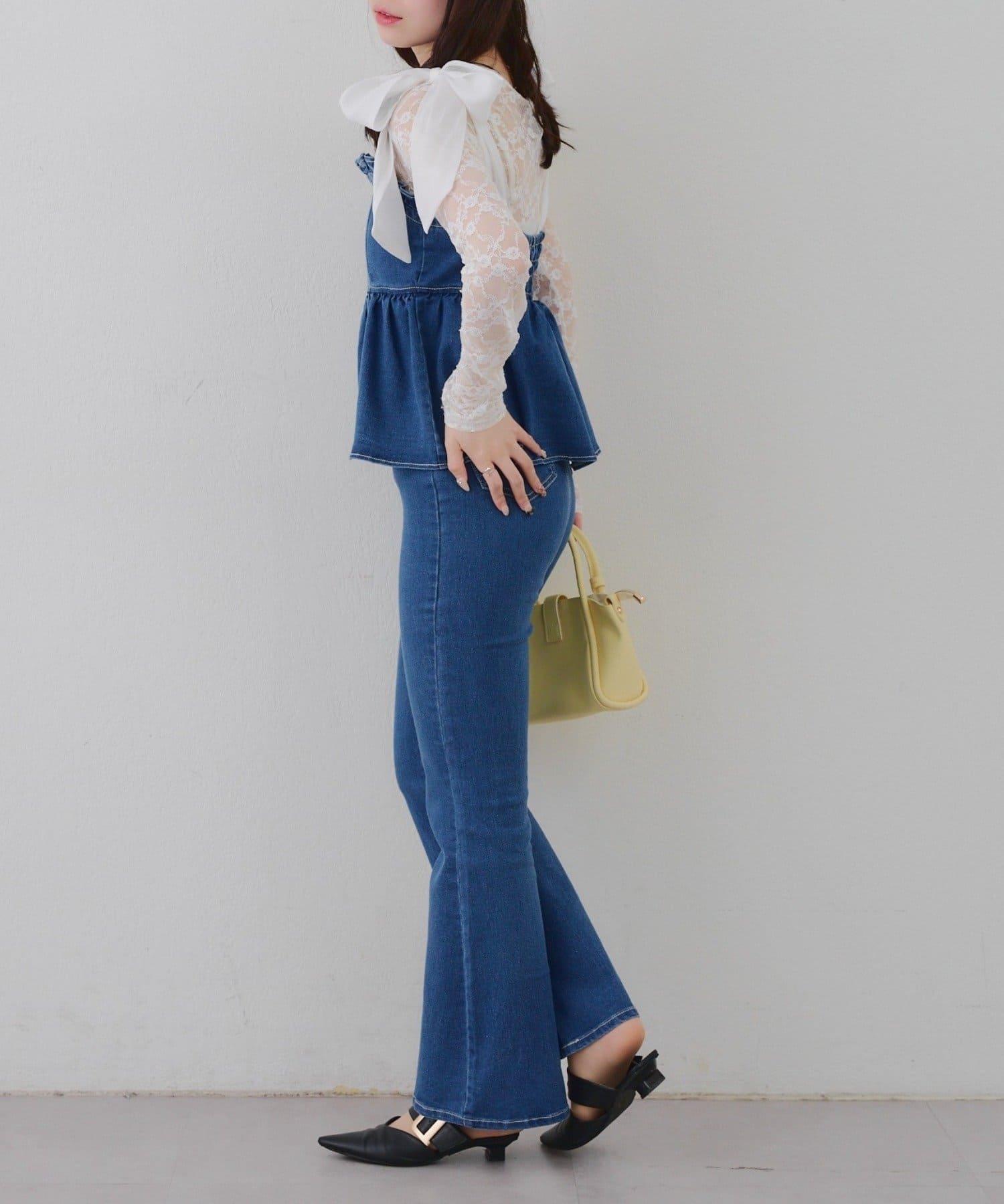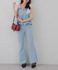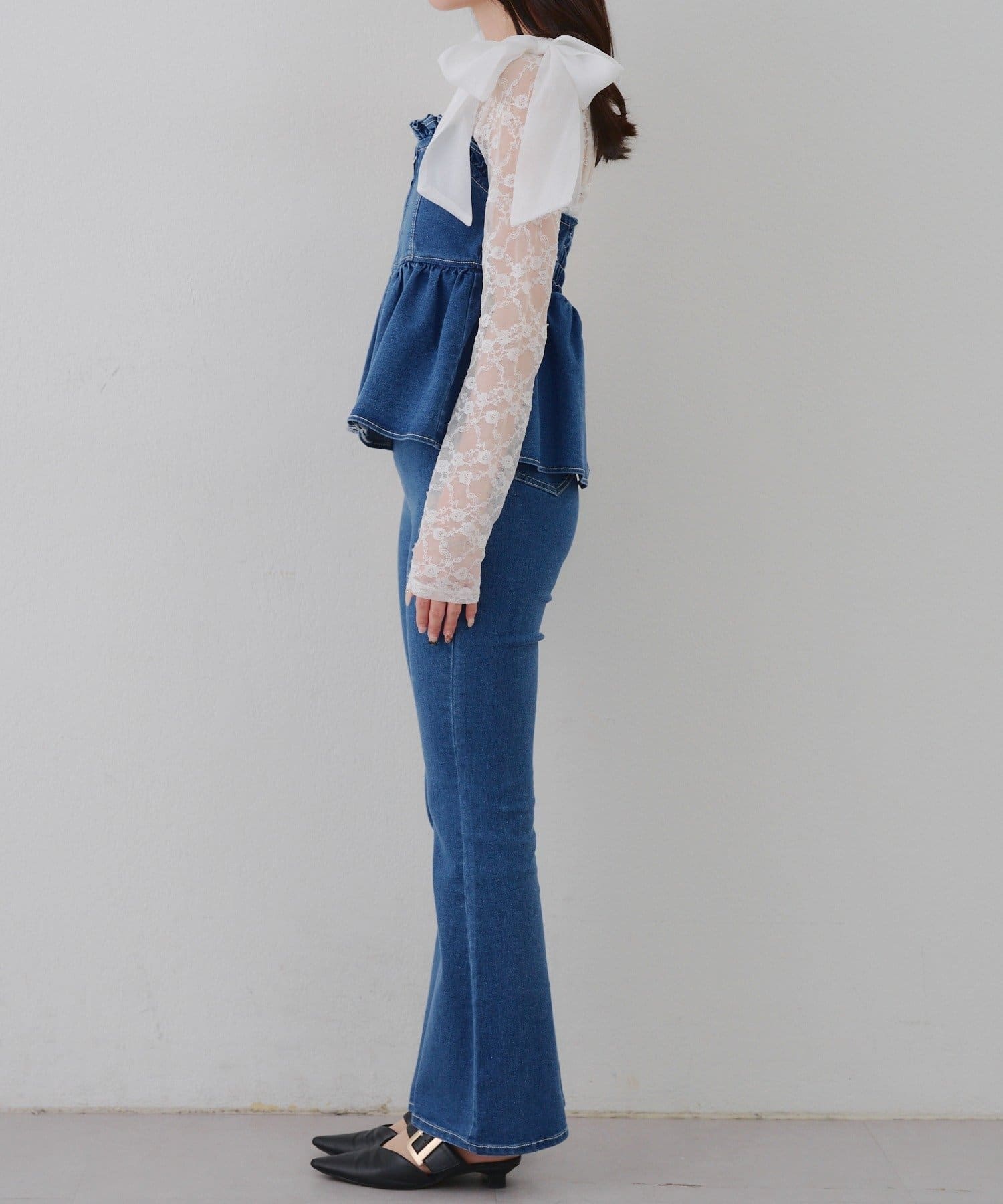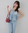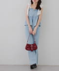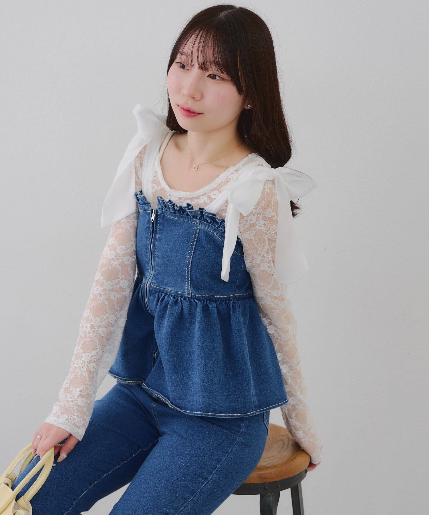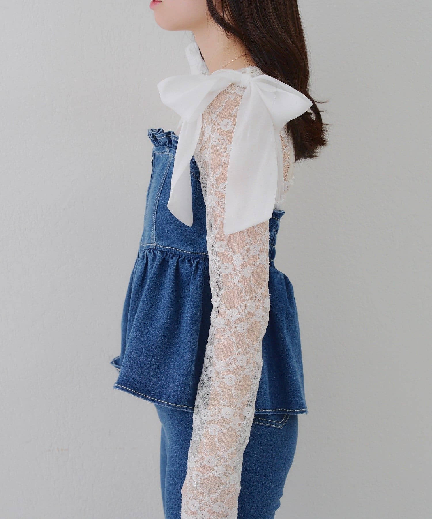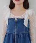 ・オーガン素材の肩リボンがガーリーな印象のデニムサロペ。。