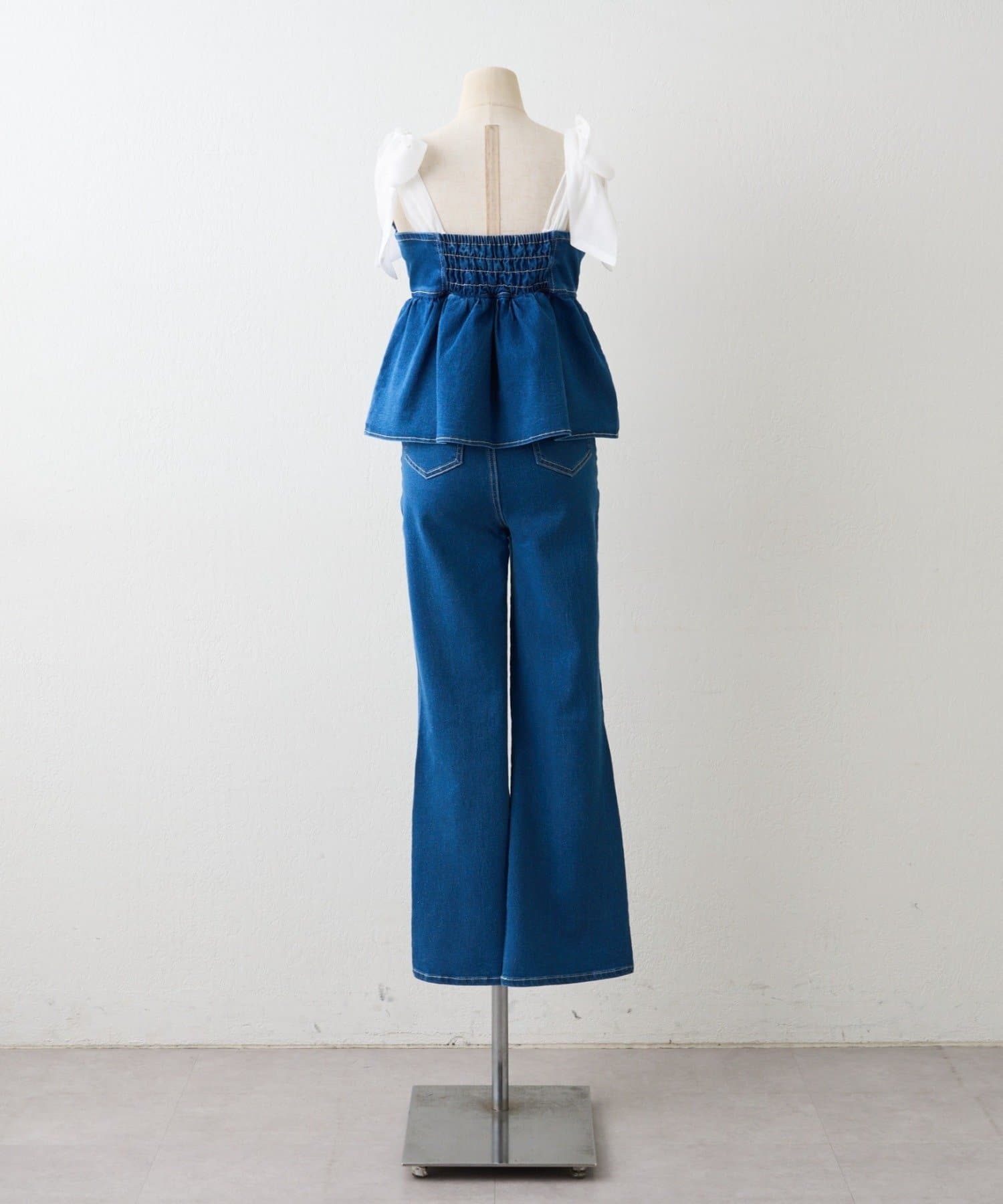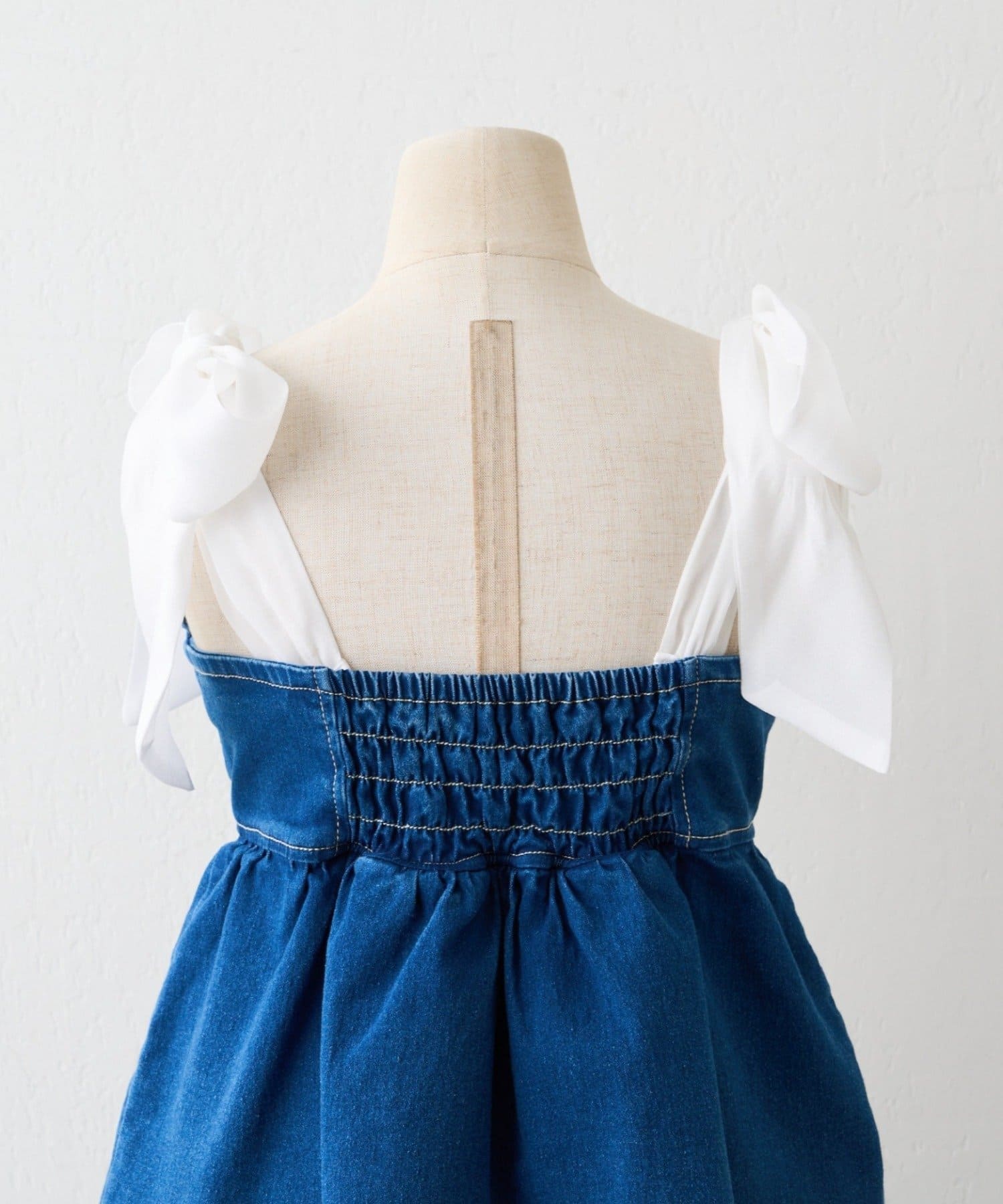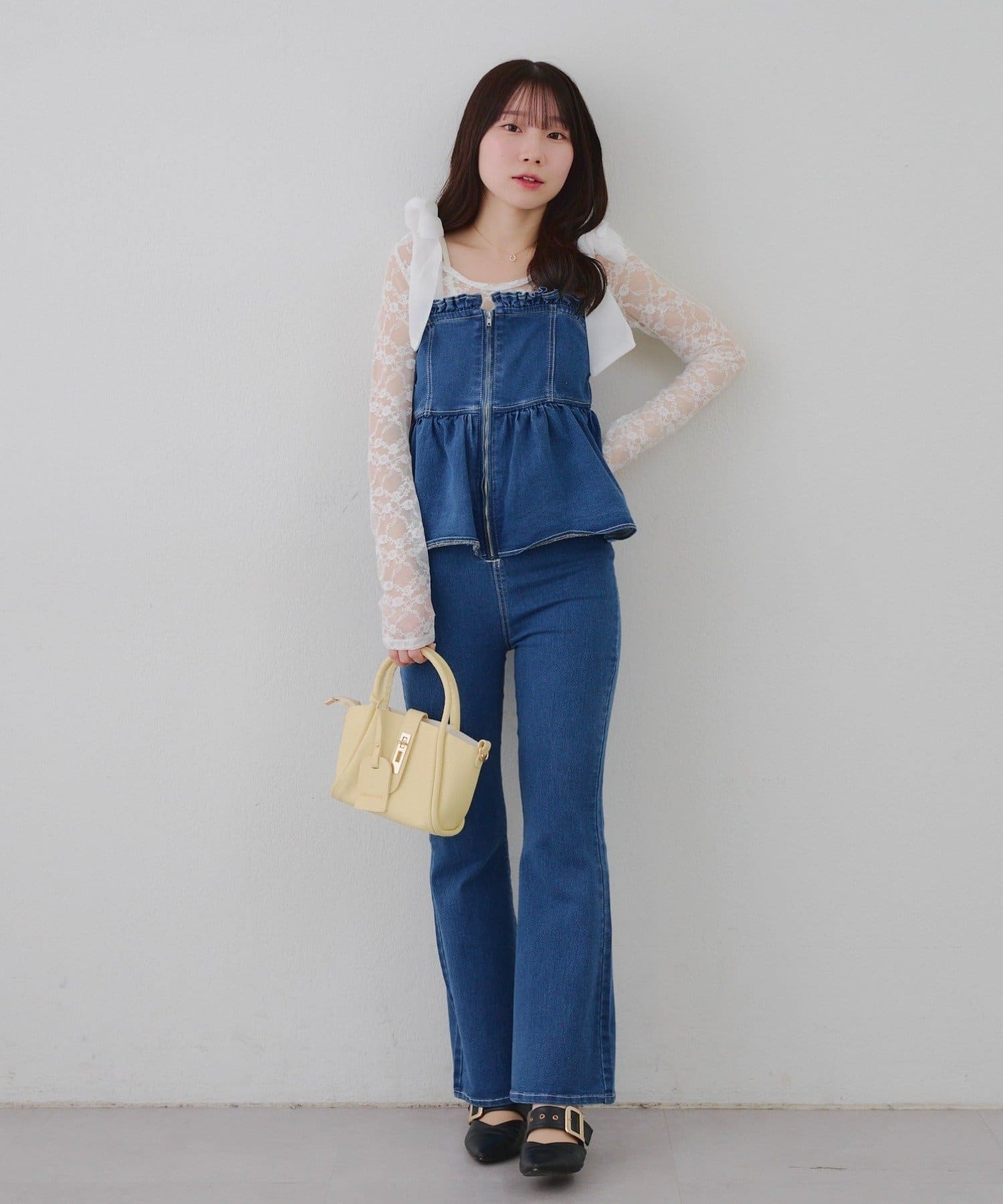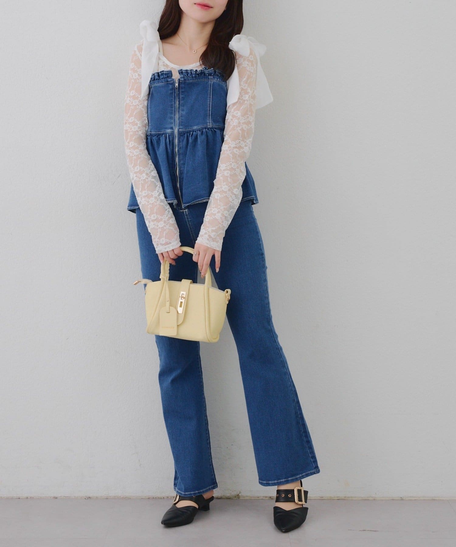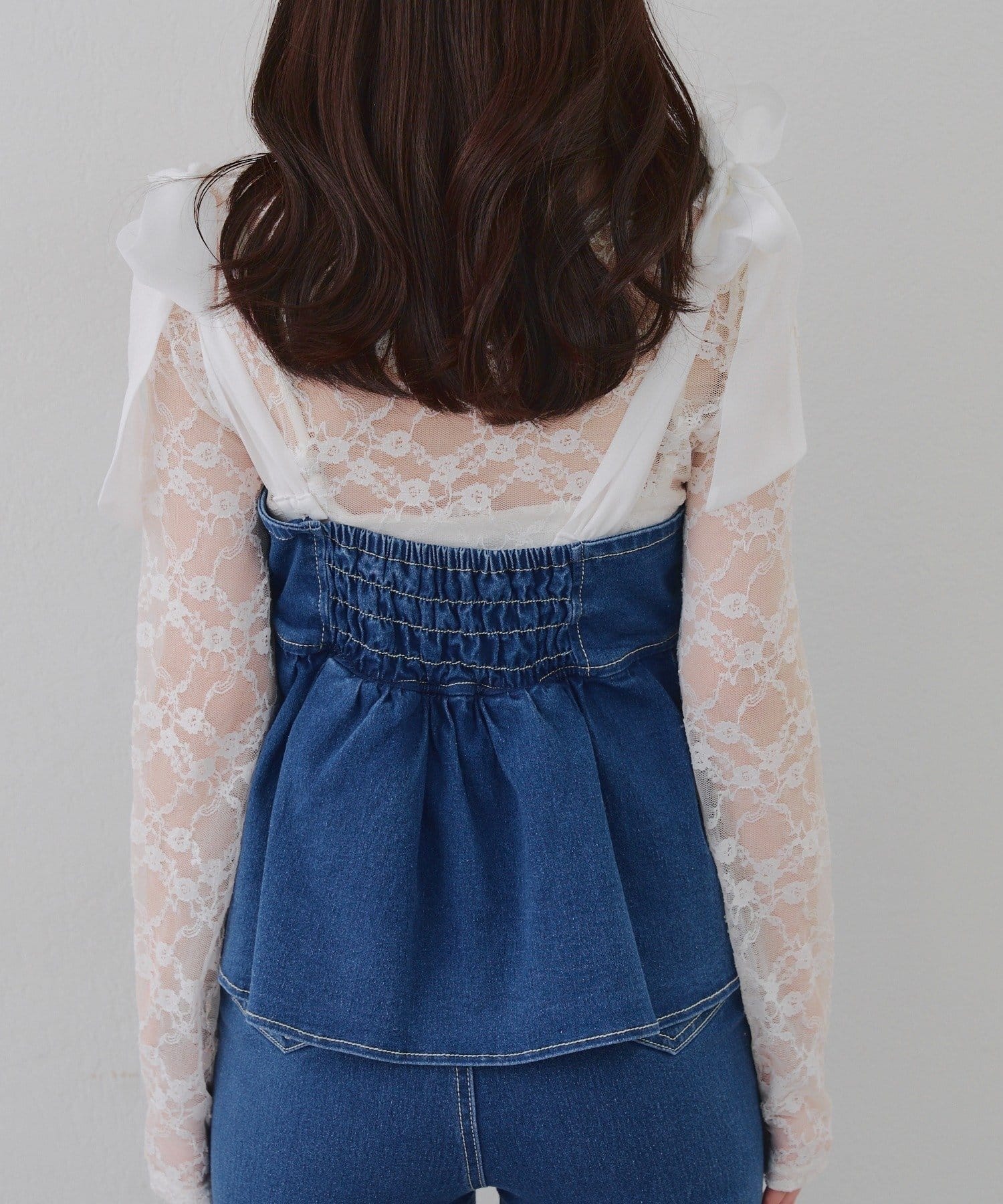 ・オーガン素材の肩リボンがガーリーな印象のデニムサロペ。。