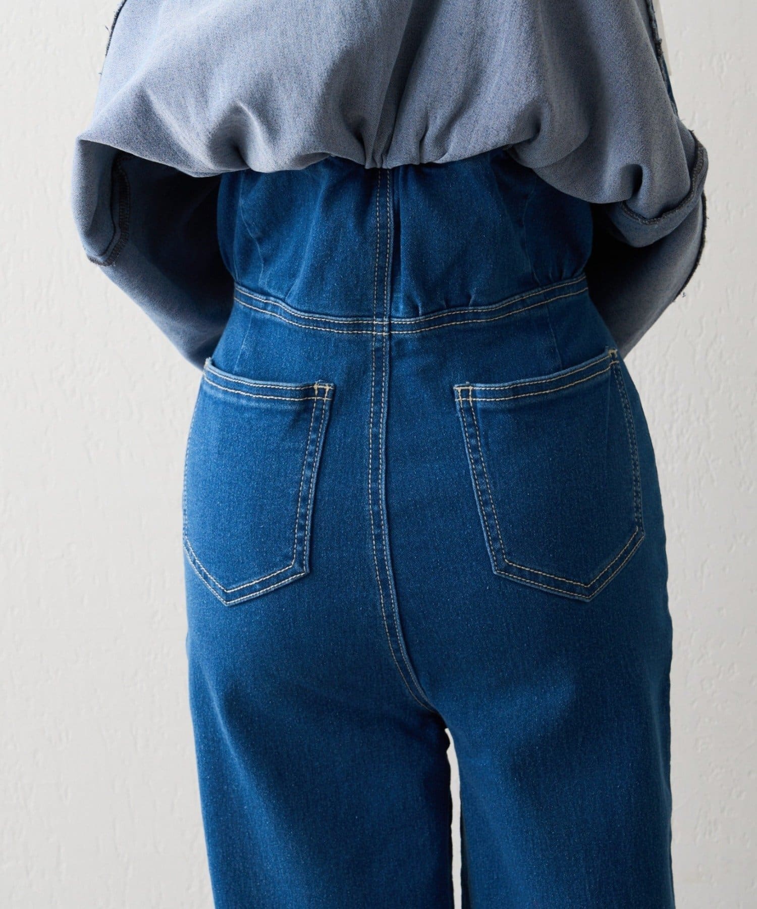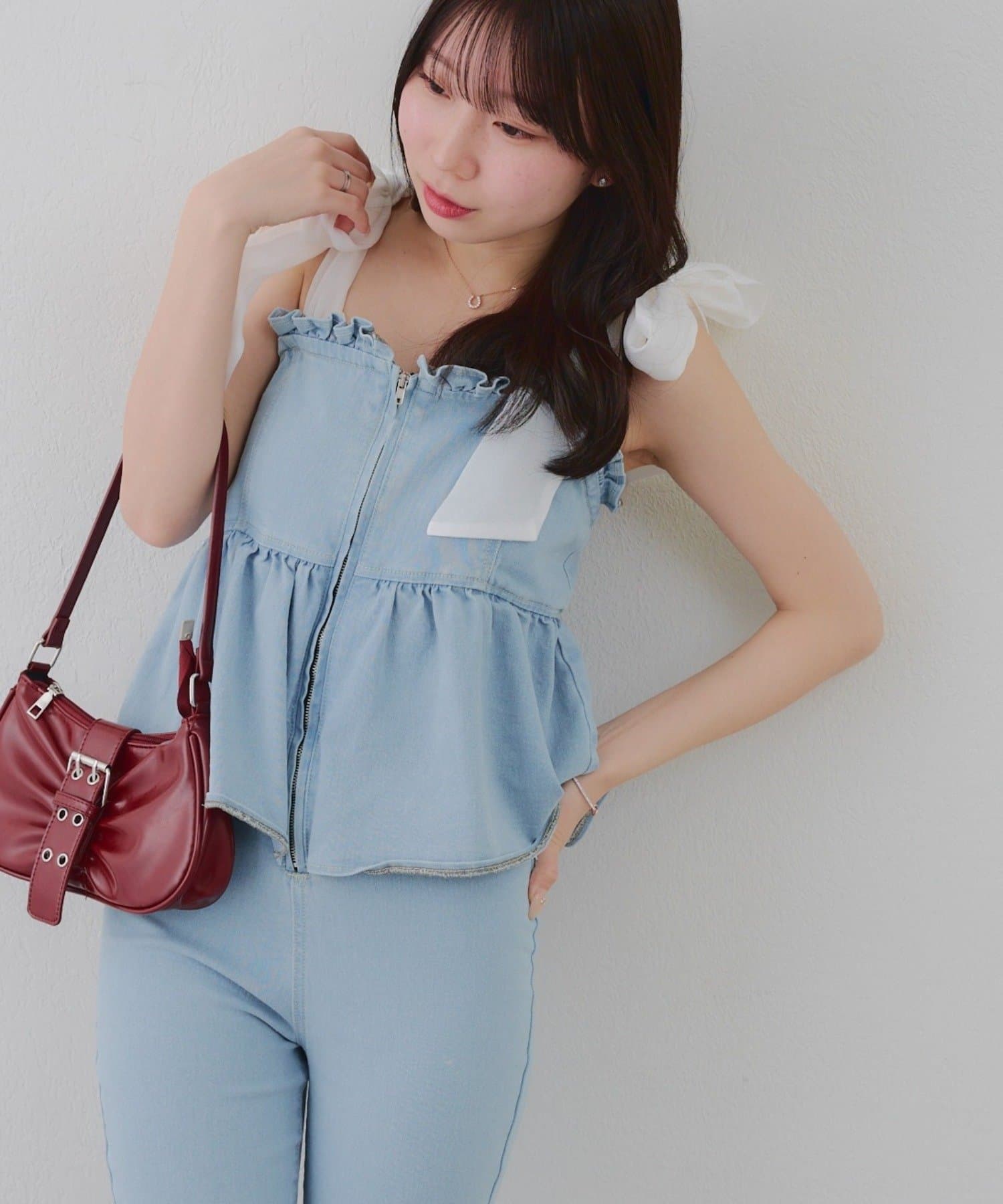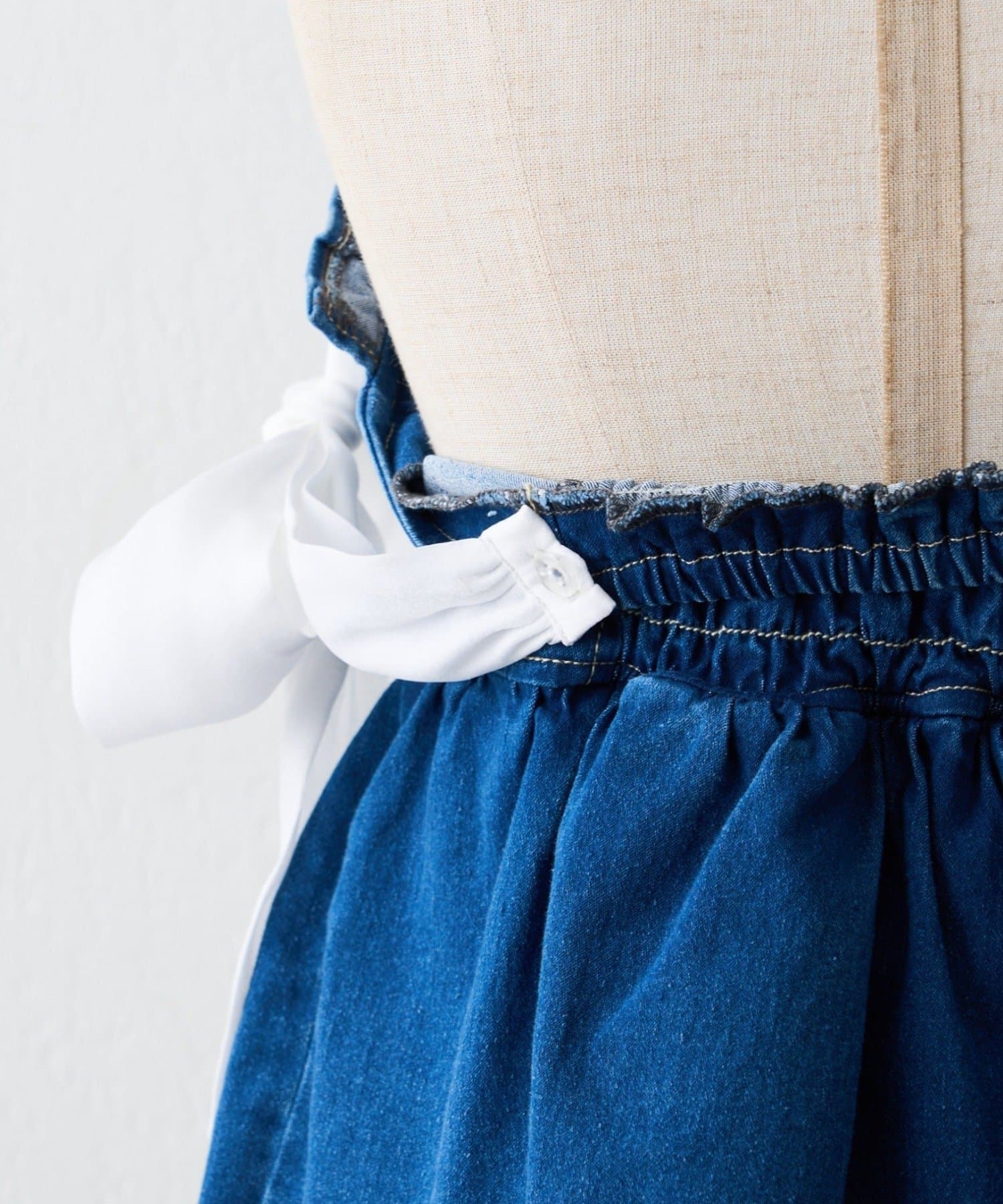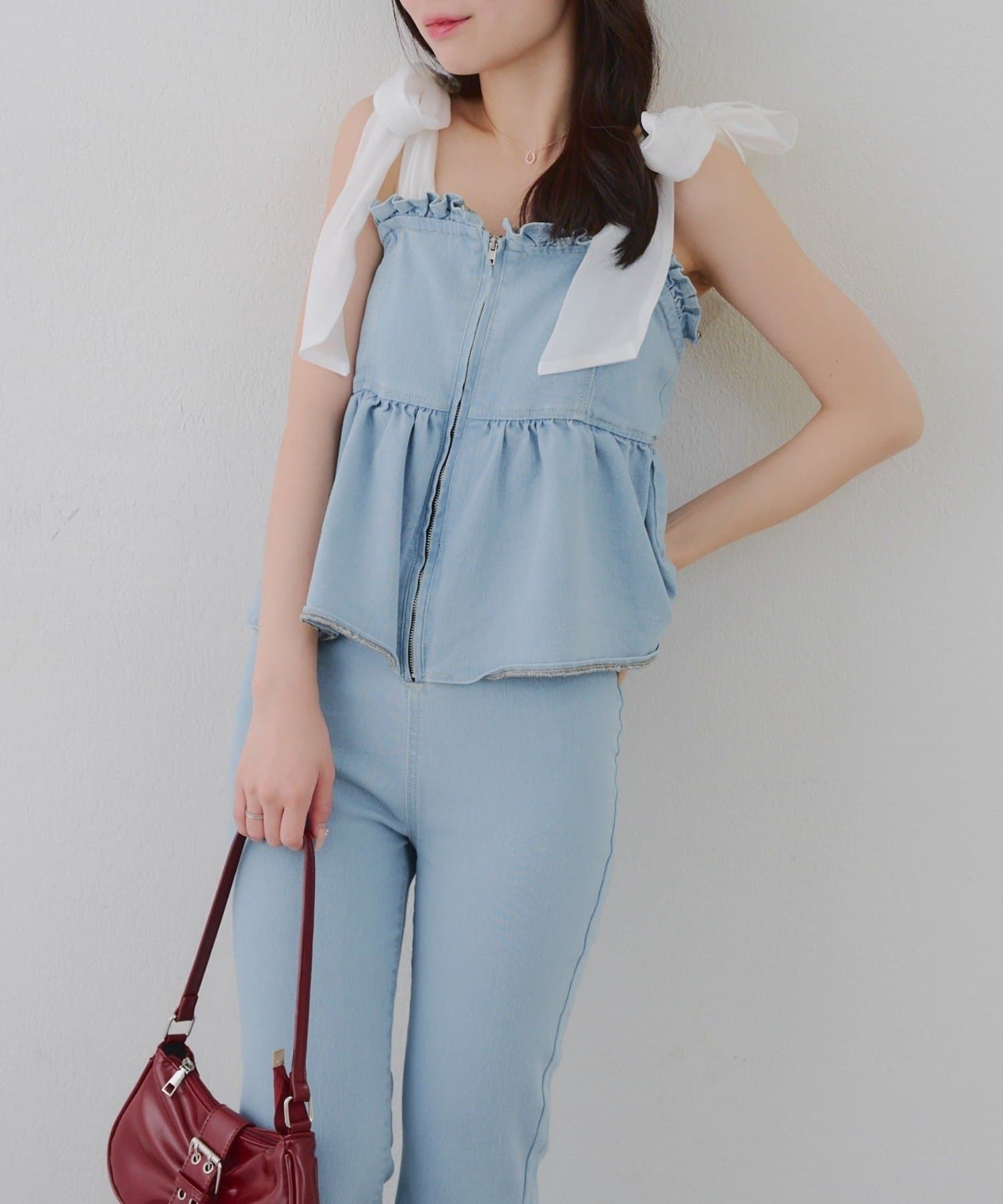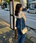 ・オーガン素材の肩リボンがガーリーな印象のデニムサロペ。。