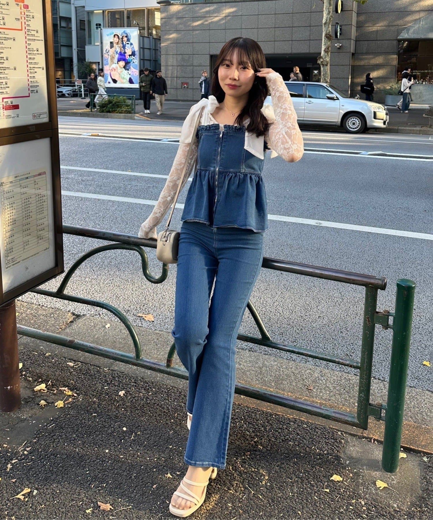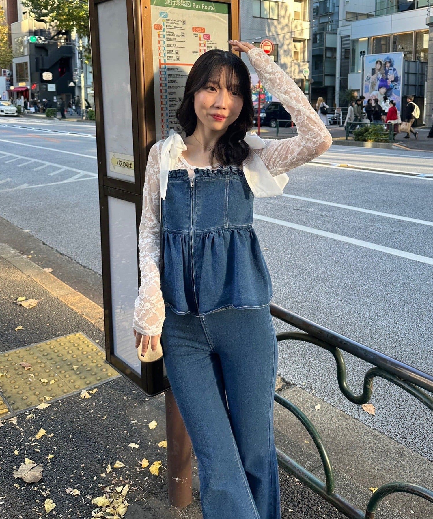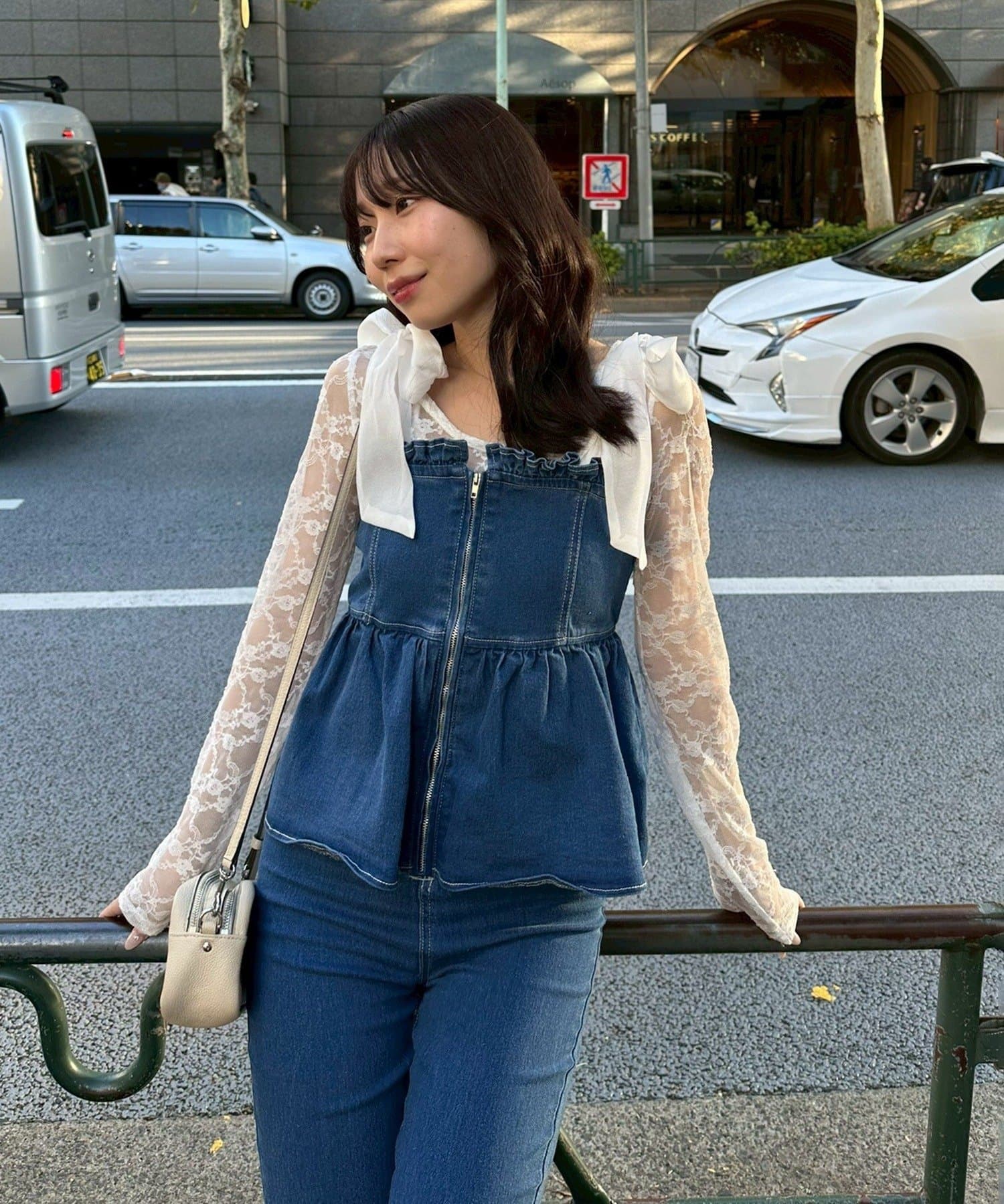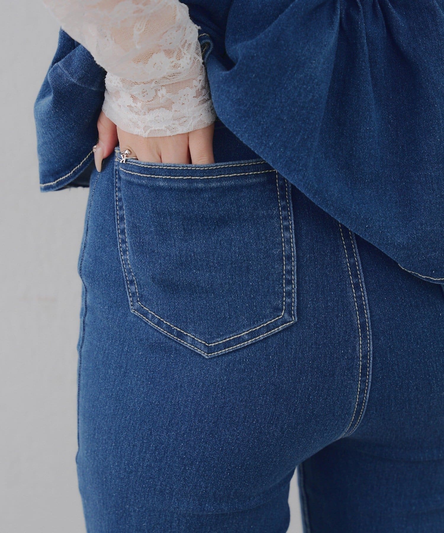 ・オーガン素材の肩リボンがガーリーな印象のデニムサロペ。。