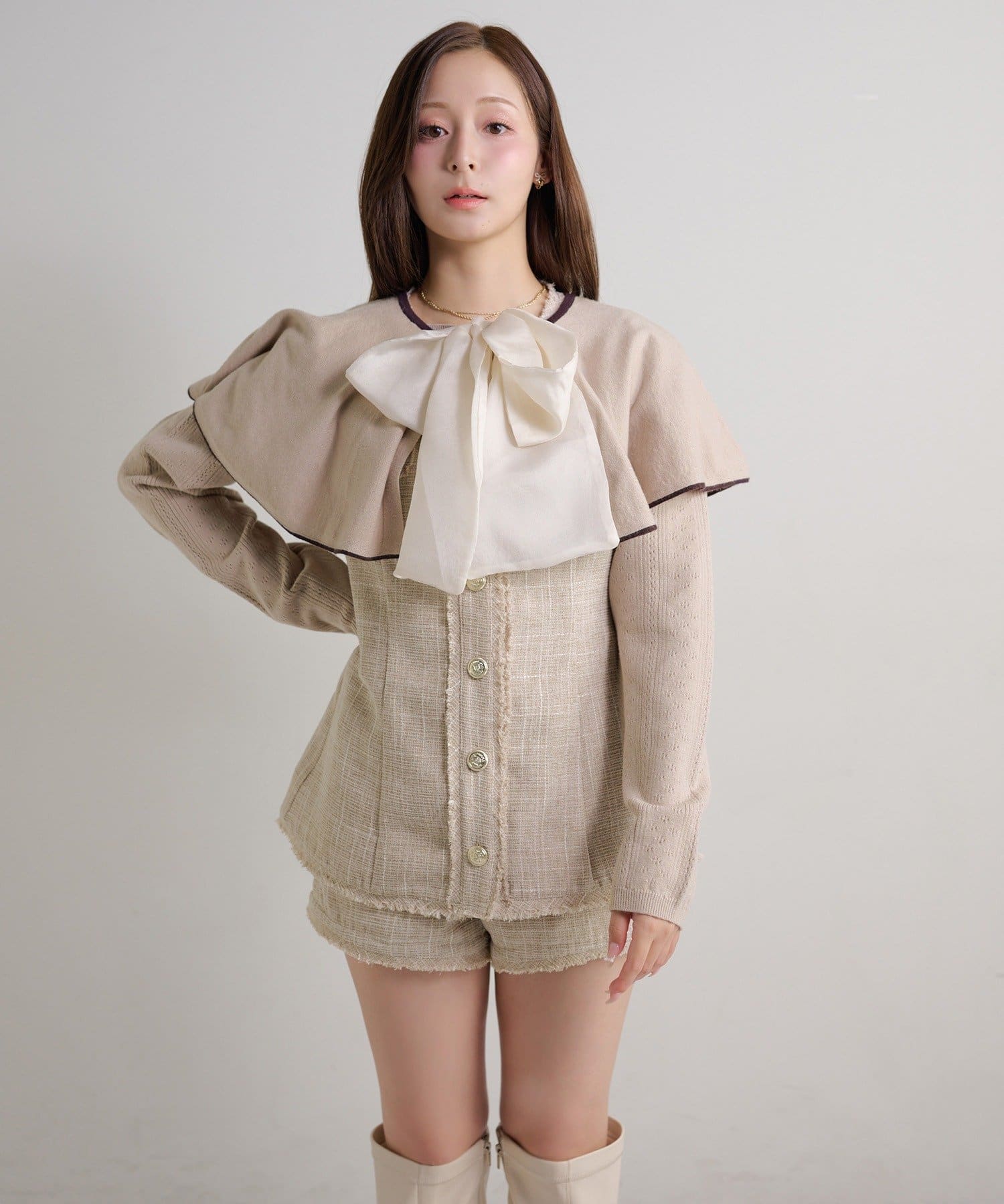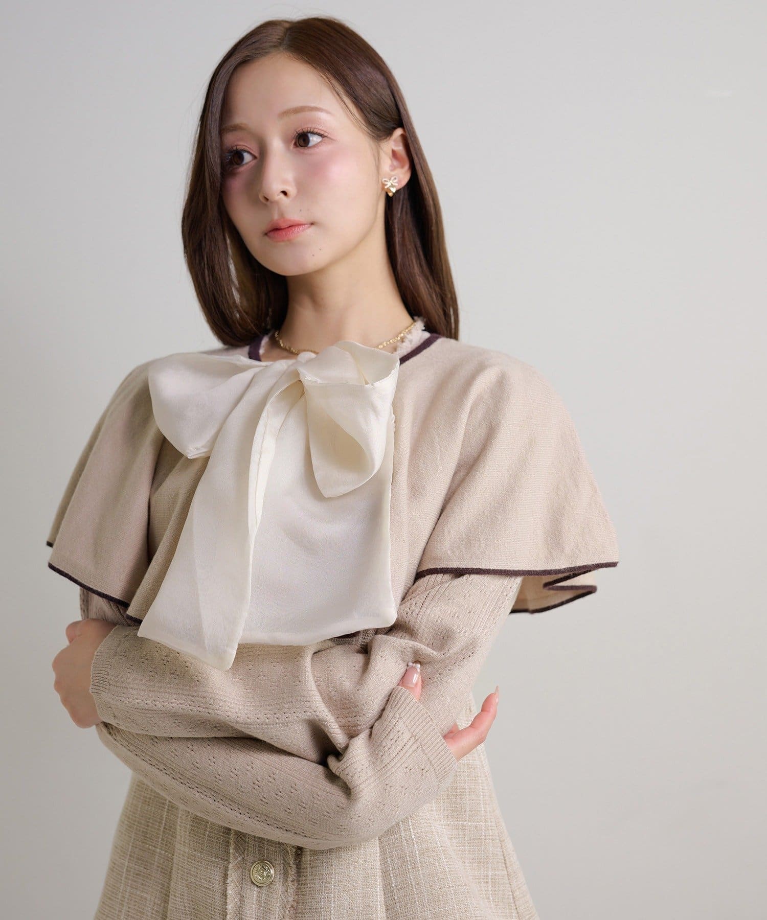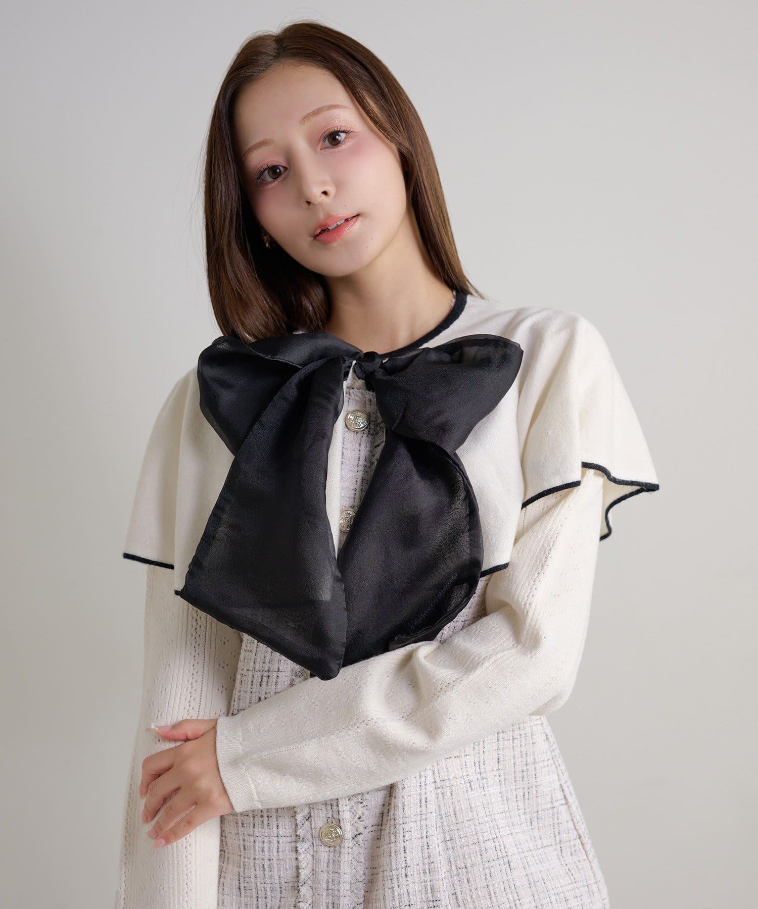 【ケープ取り外し可能】ボウタイアイレットカーディガン