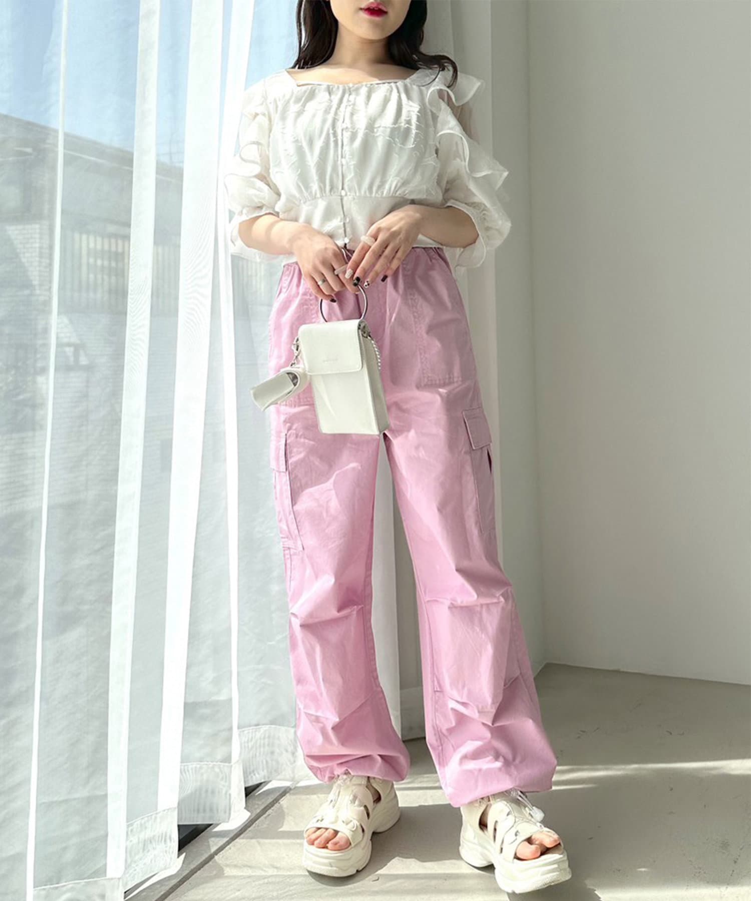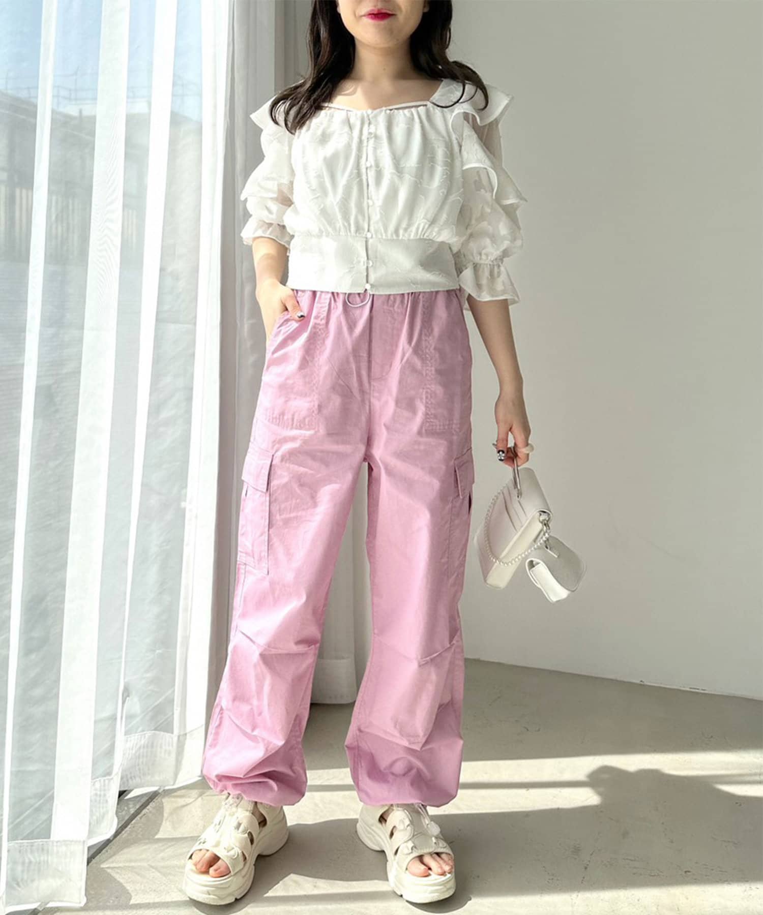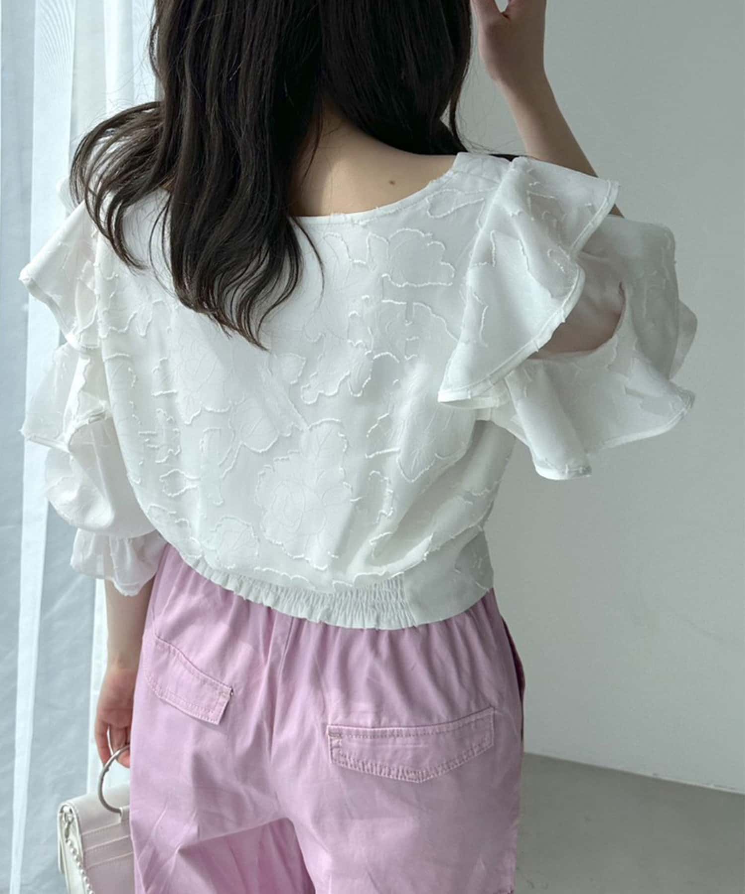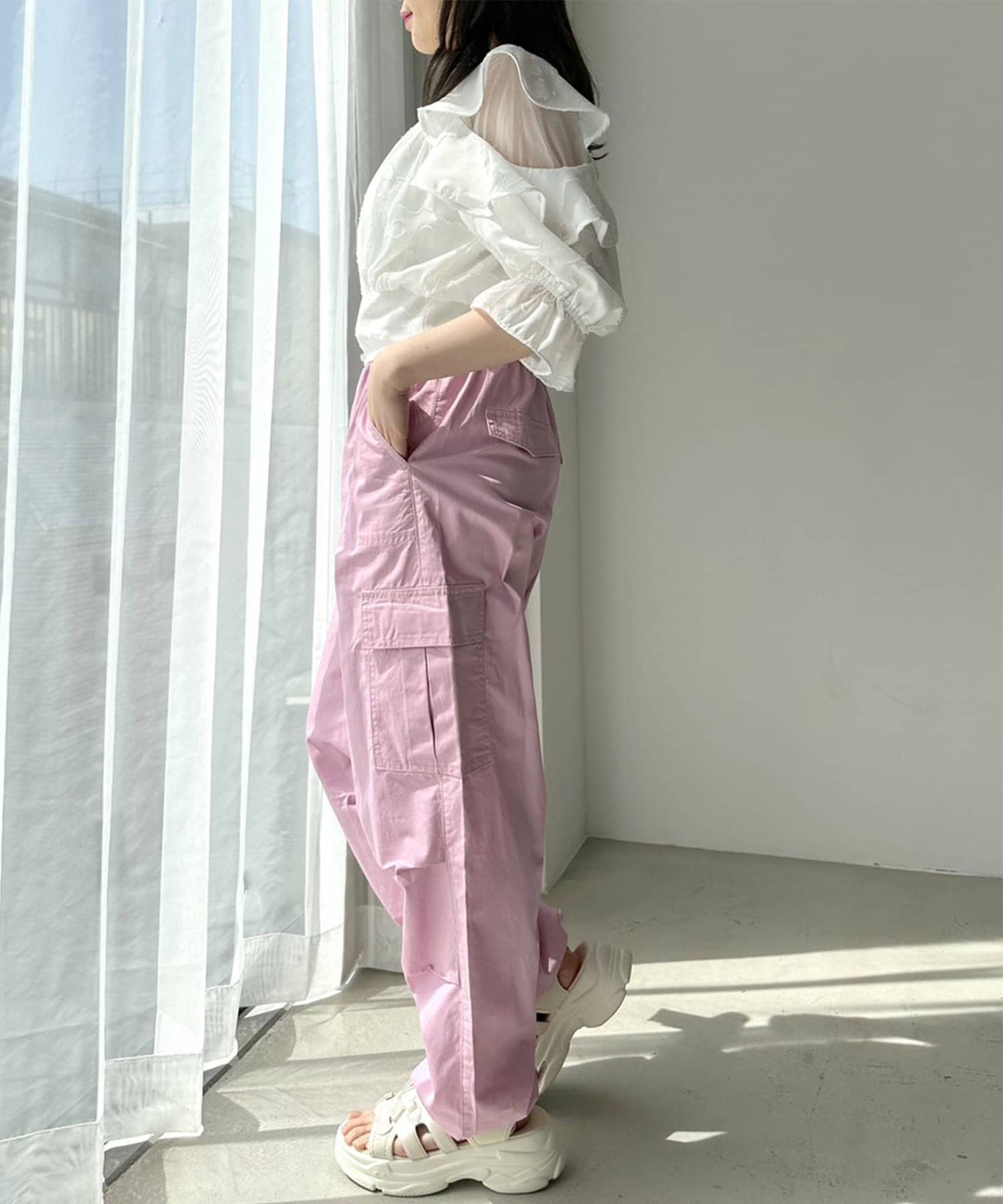 肩フリルは柔らかい素材で落ち感があるので骨格ストレートさんも広がって見えすぎずにチャレンジしやすい◎