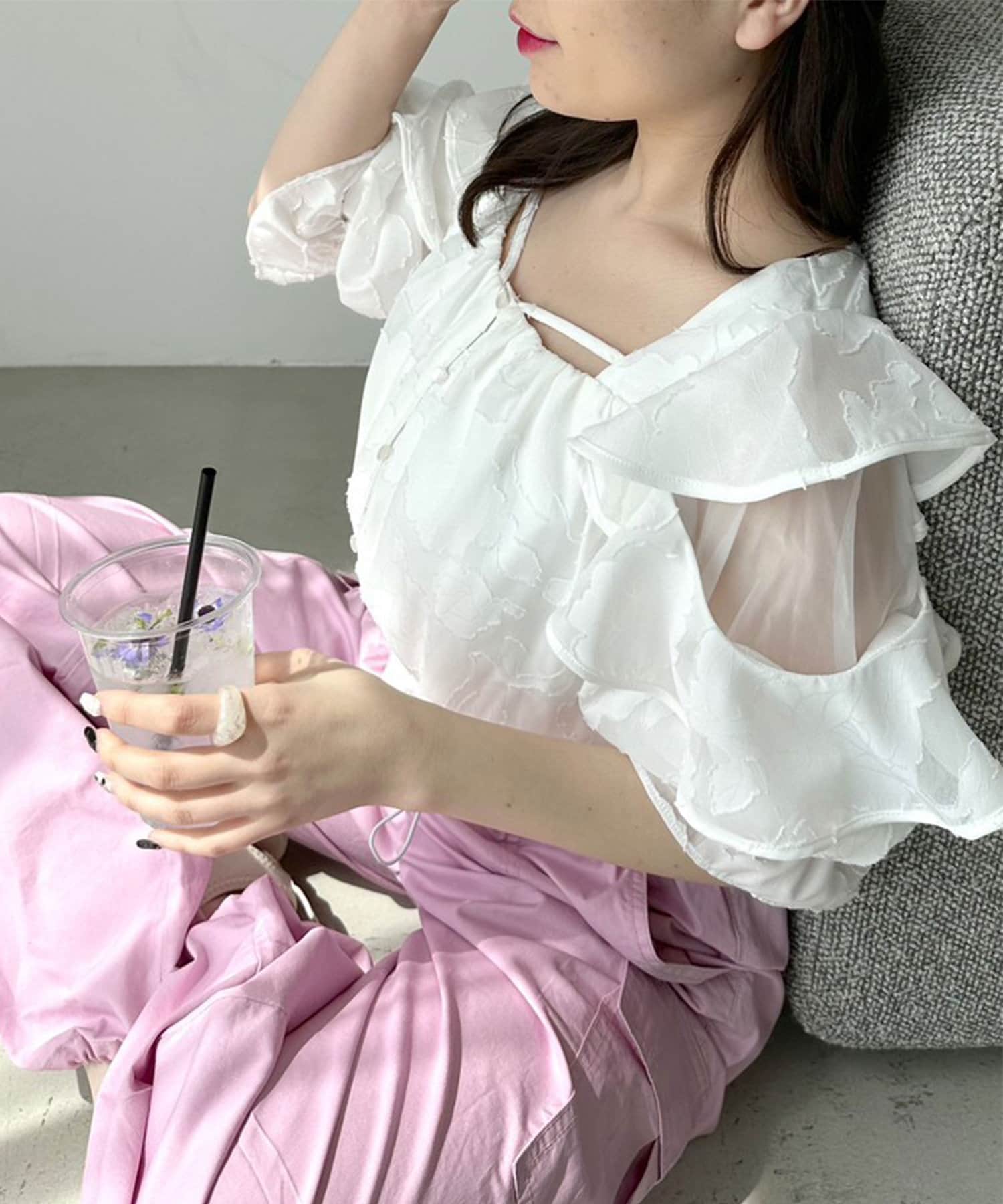 ・フリル袖の透け感がフェミニンで今っぽいデザイン。