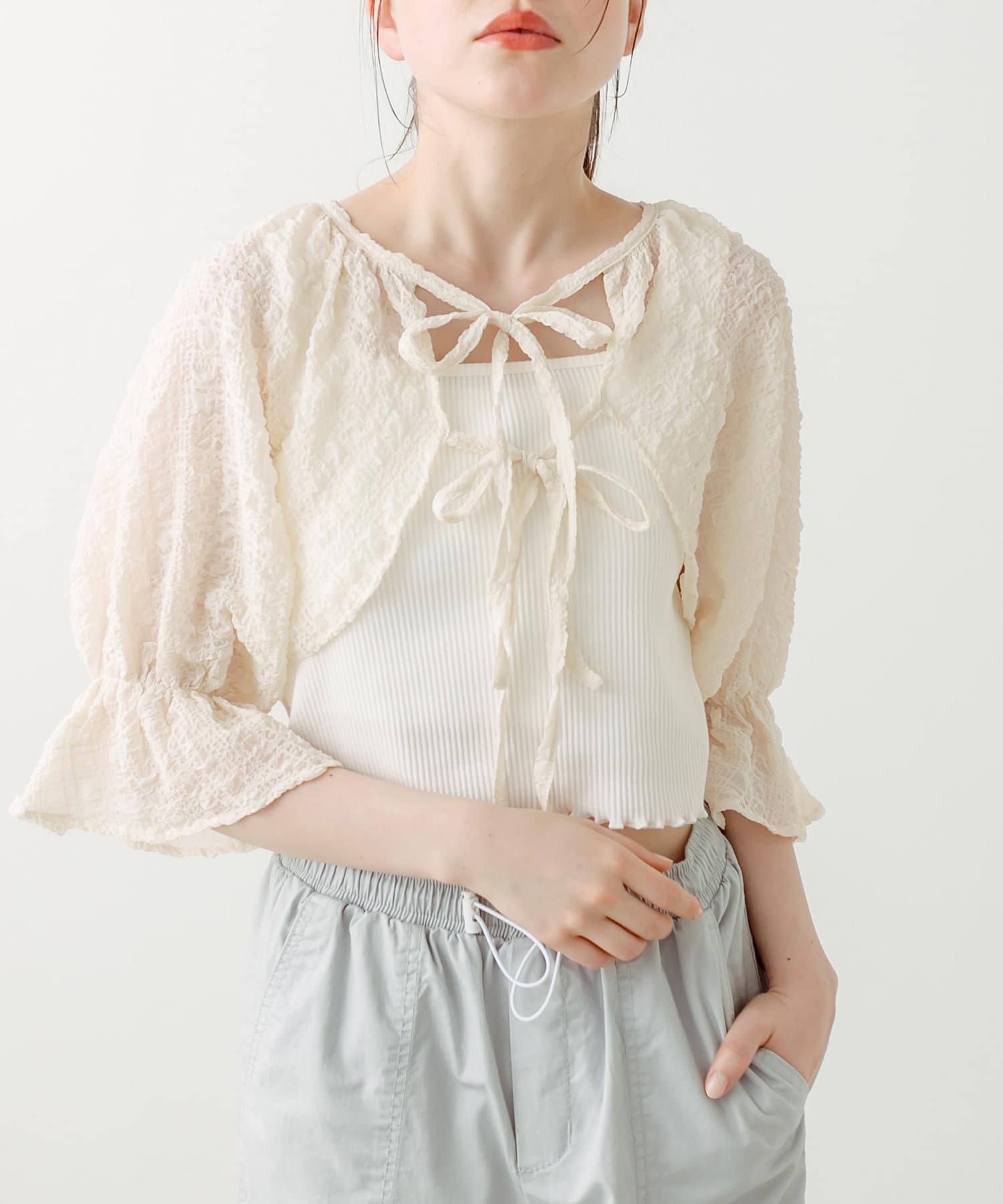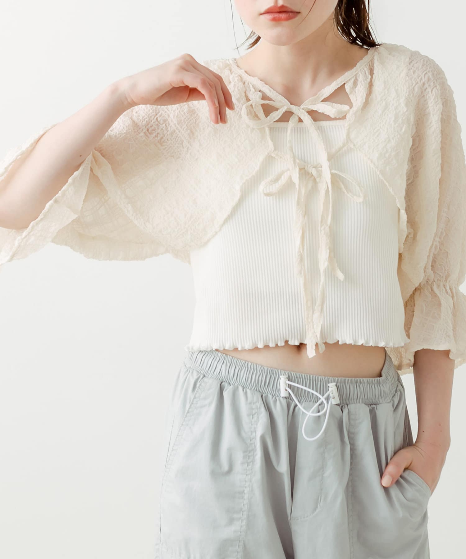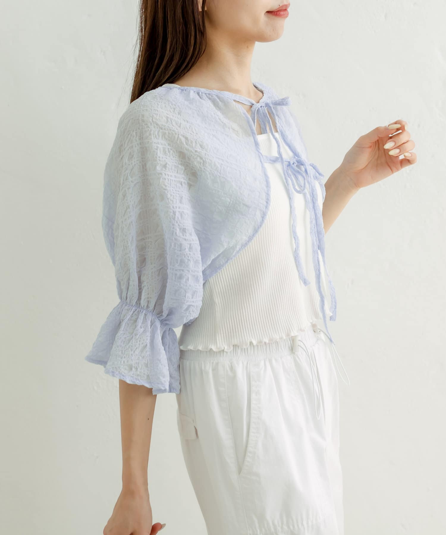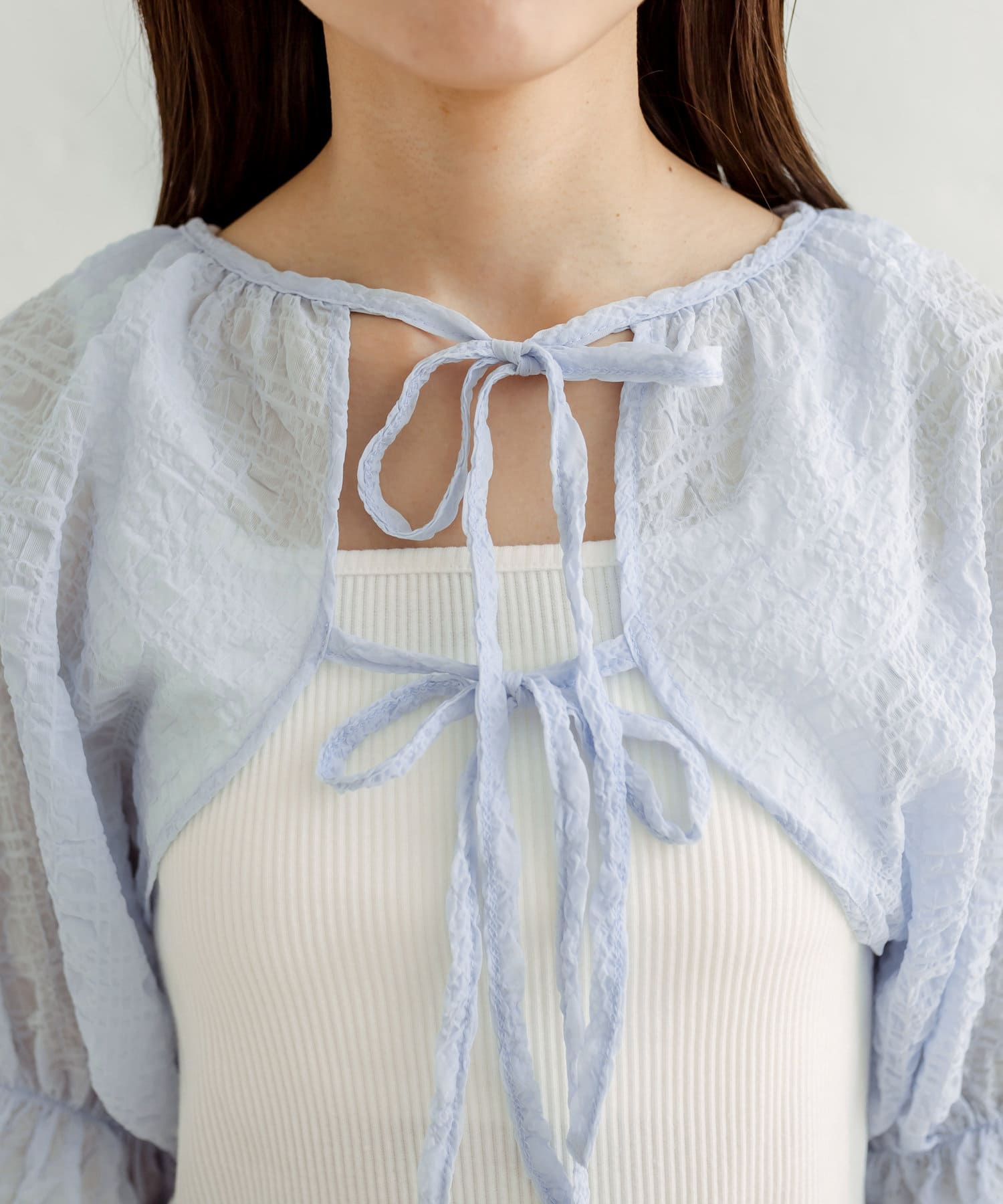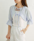 ・ボレロはフロントのダブルリボンがポイント。表面変化が特徴の、透け感のある素材です。
