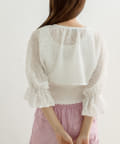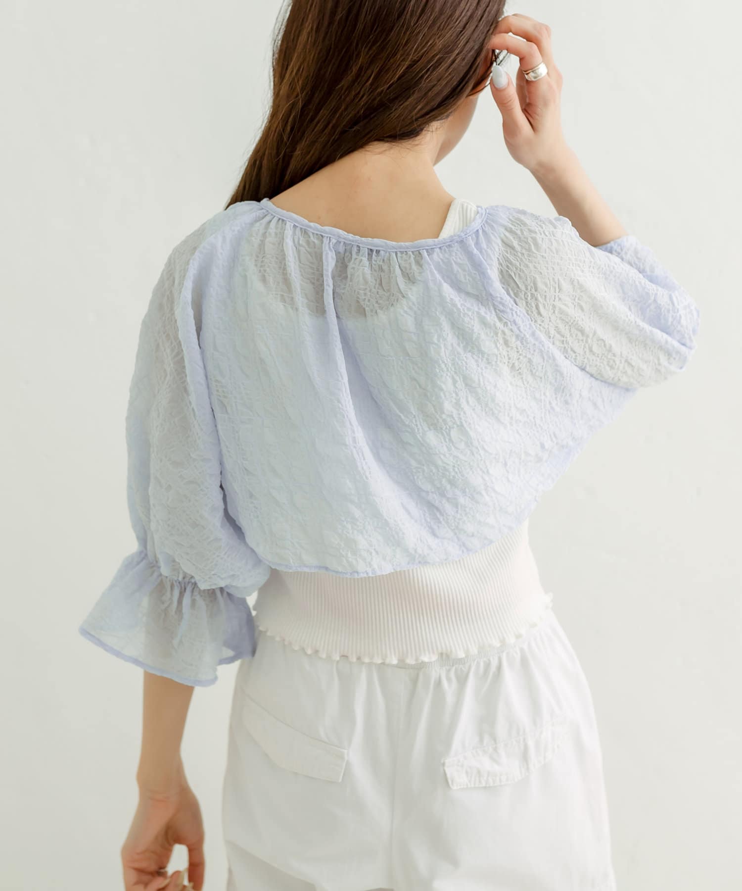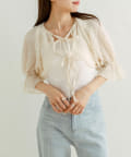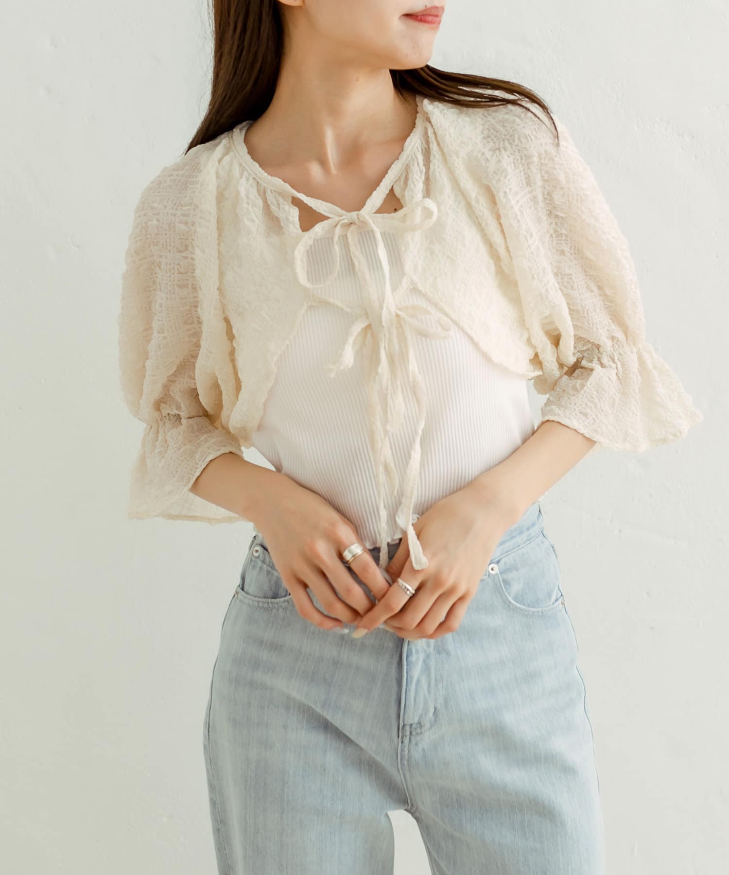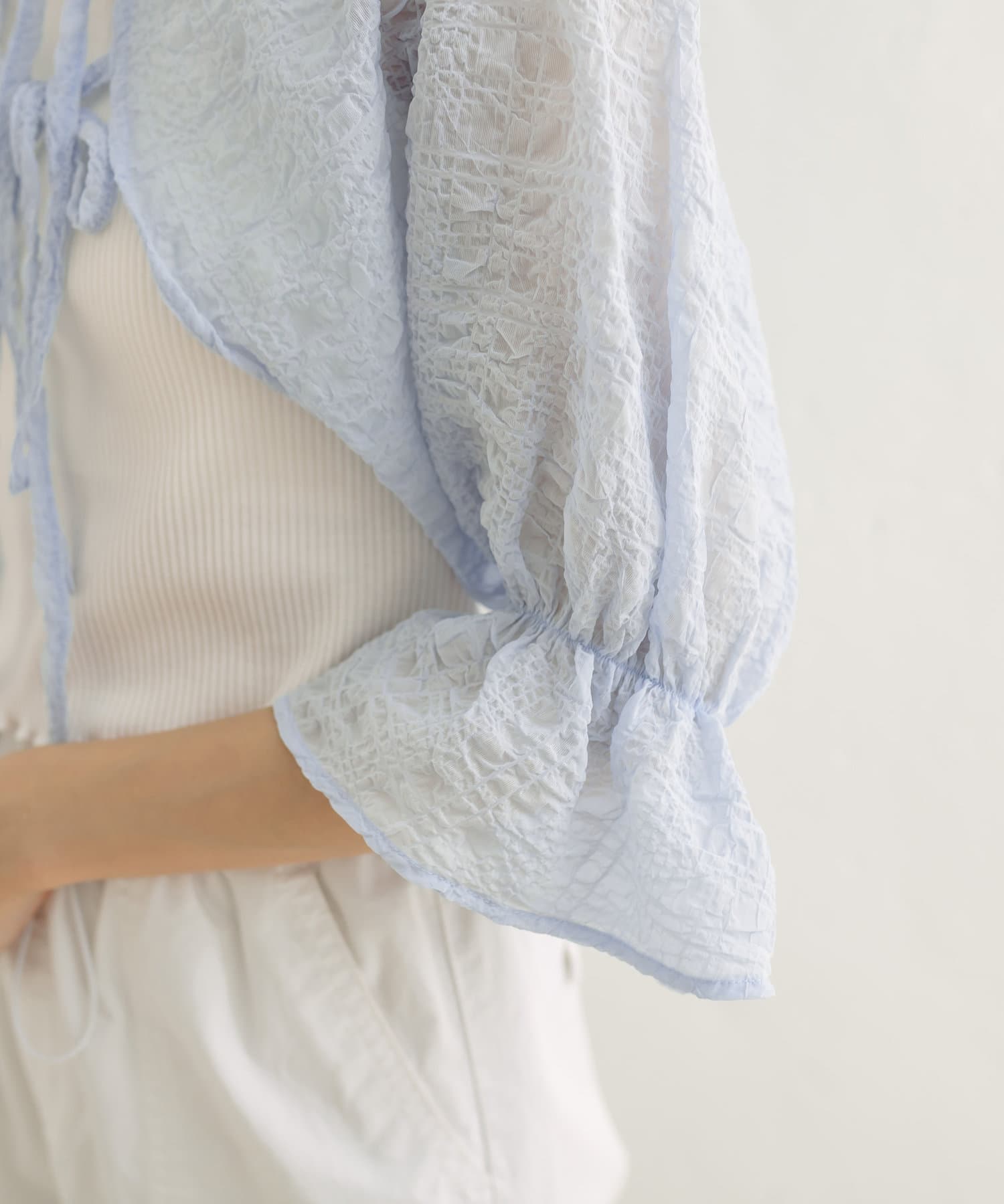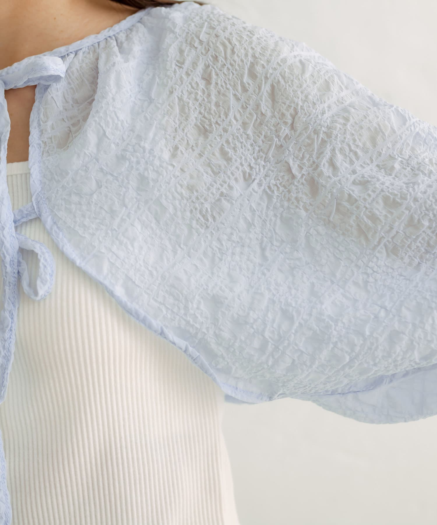 ・ボレロはフロントのダブルリボンがポイント。表面変化が特徴の、透け感のある素材です。