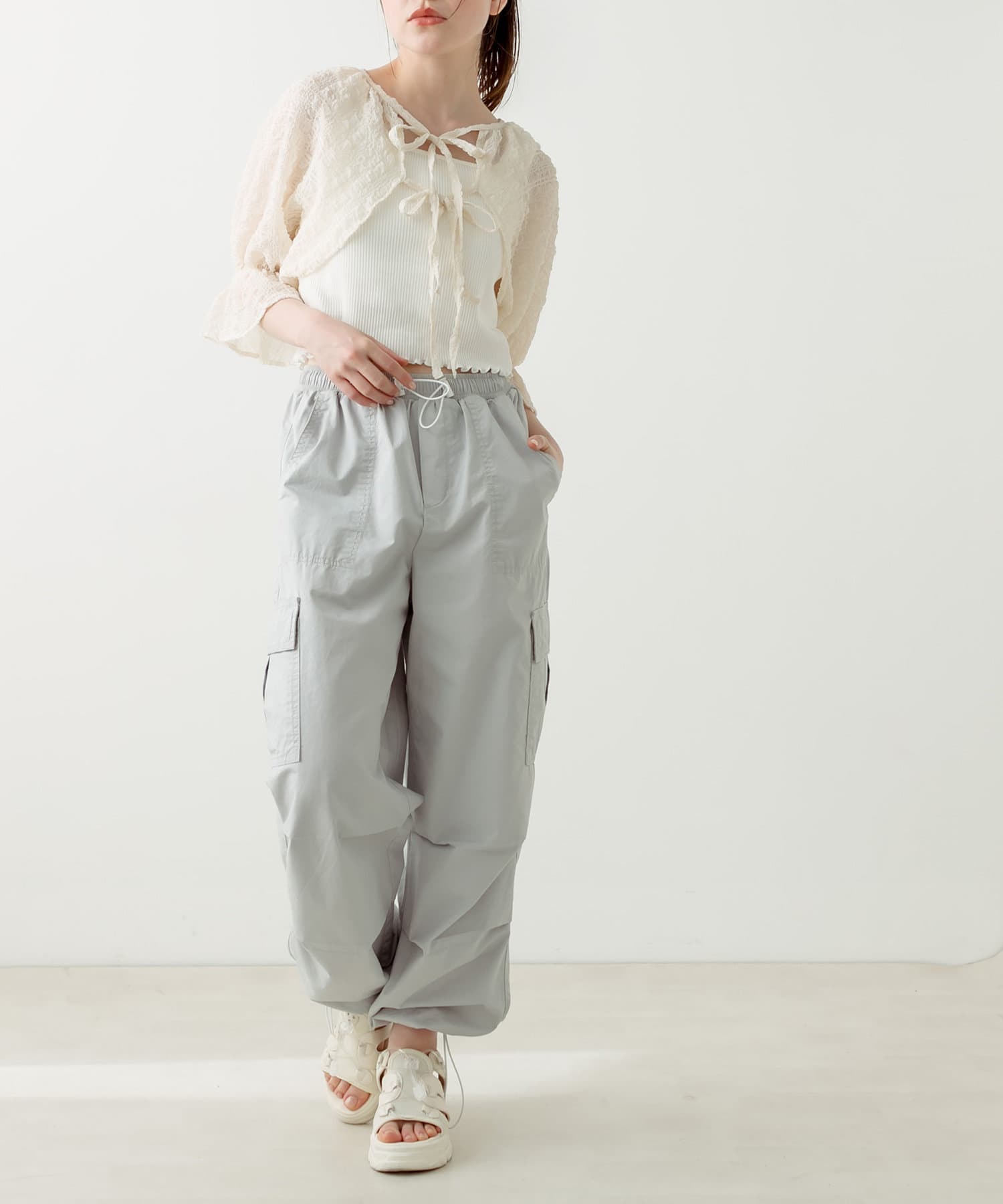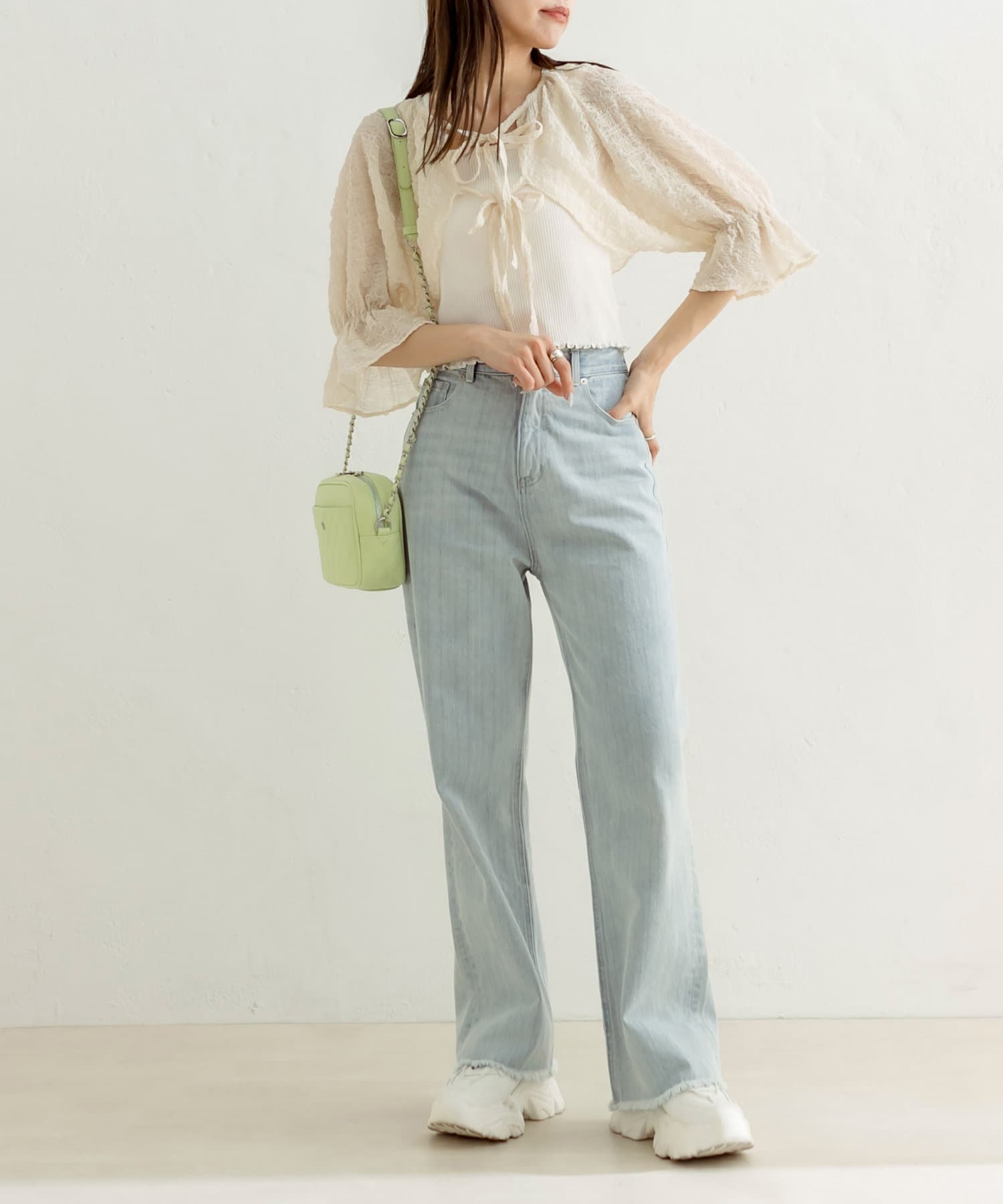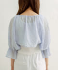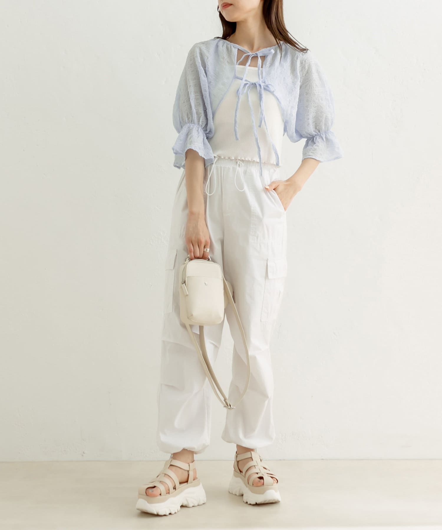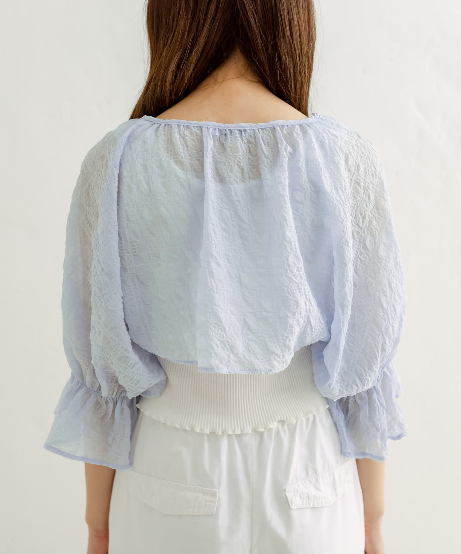 ・ボレロはフロントのダブルリボンがポイント。表面変化が特徴の、透け感のある素材です。