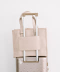 ・背面部分がキャリーのハンドルに通せる仕様になっており、一緒に持ち運べる便利なデザインです。