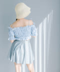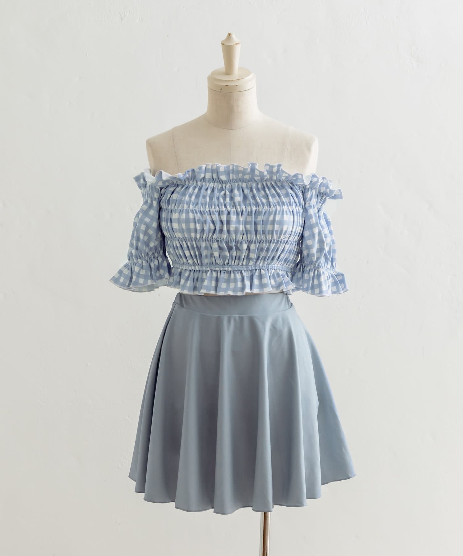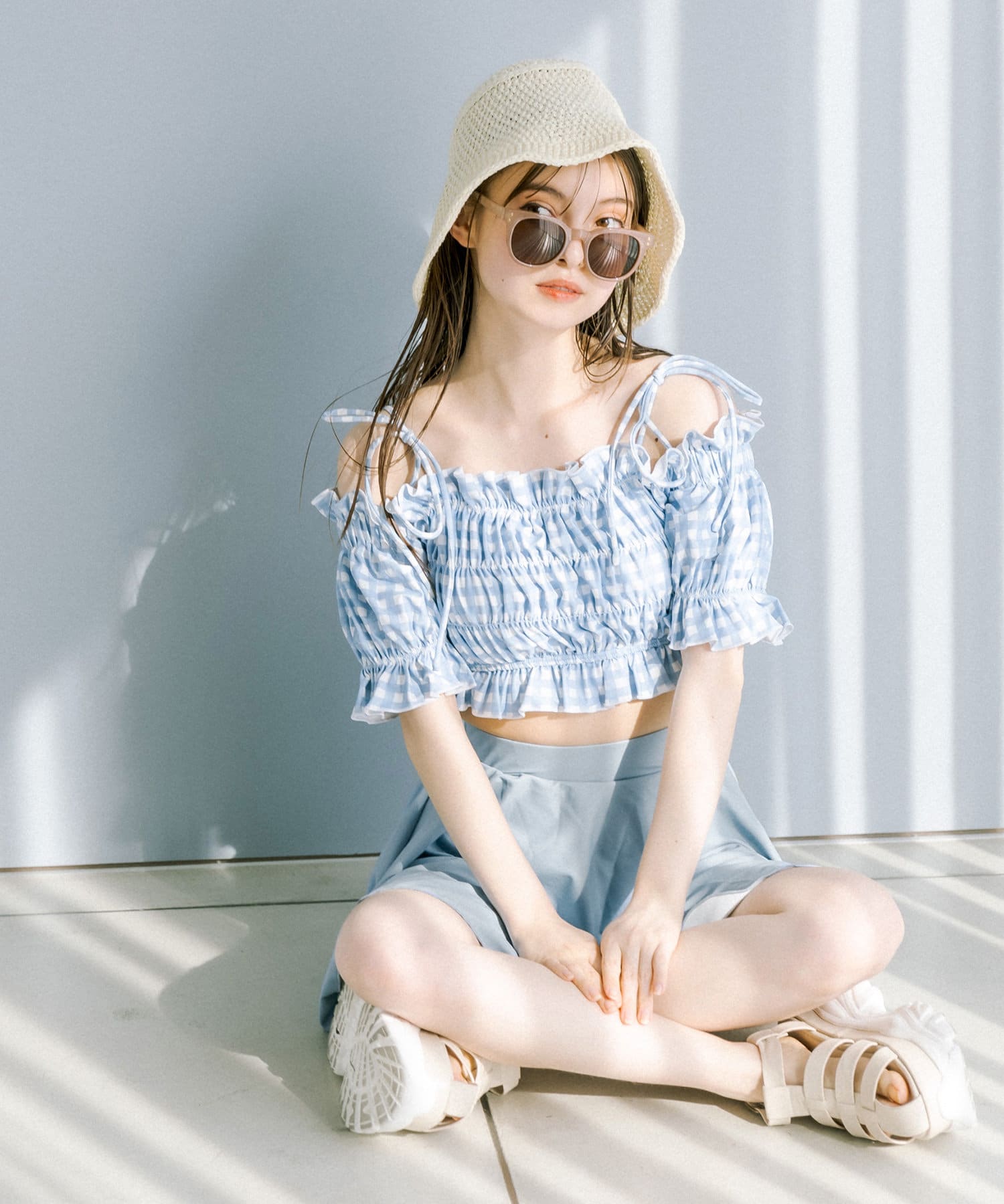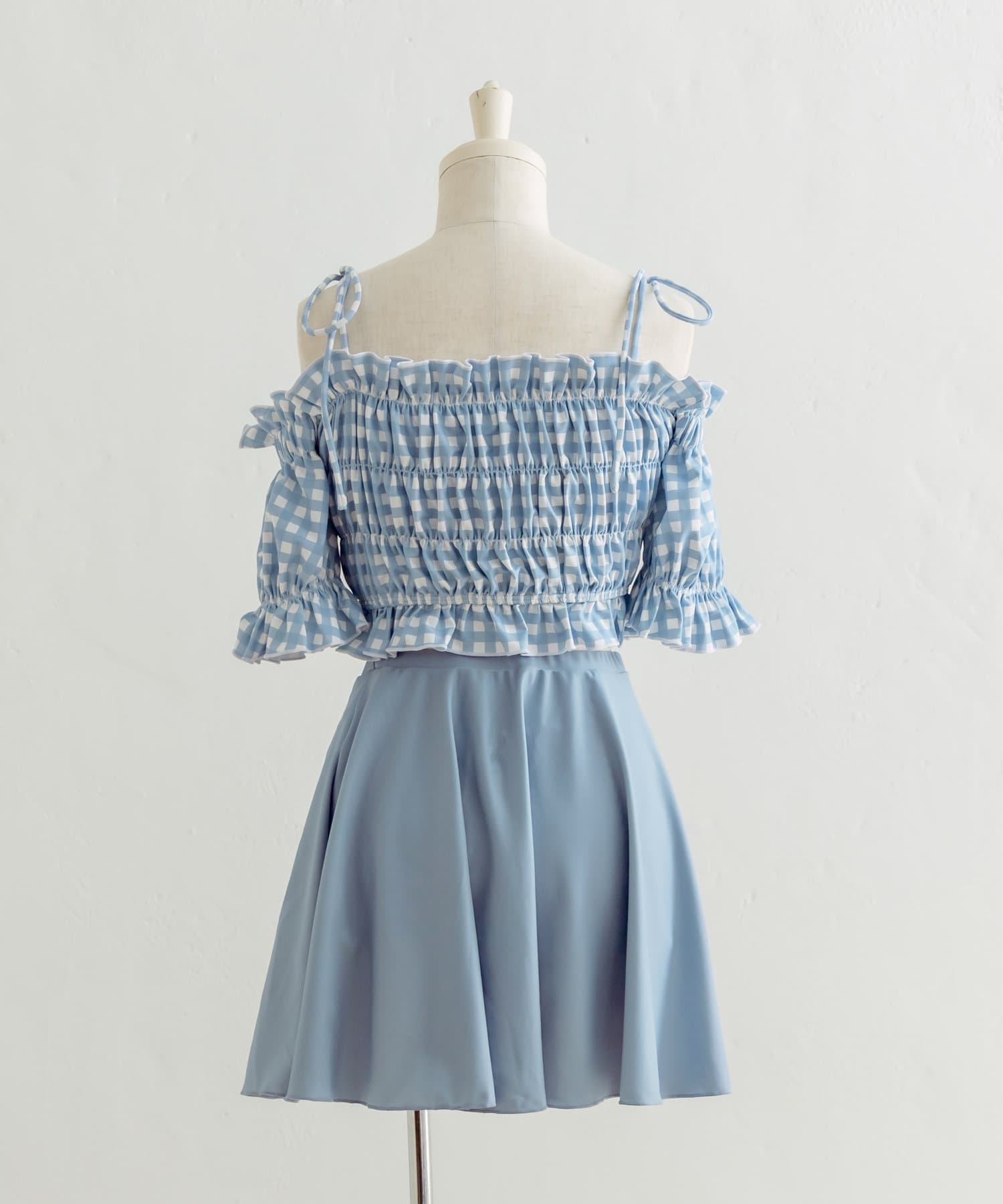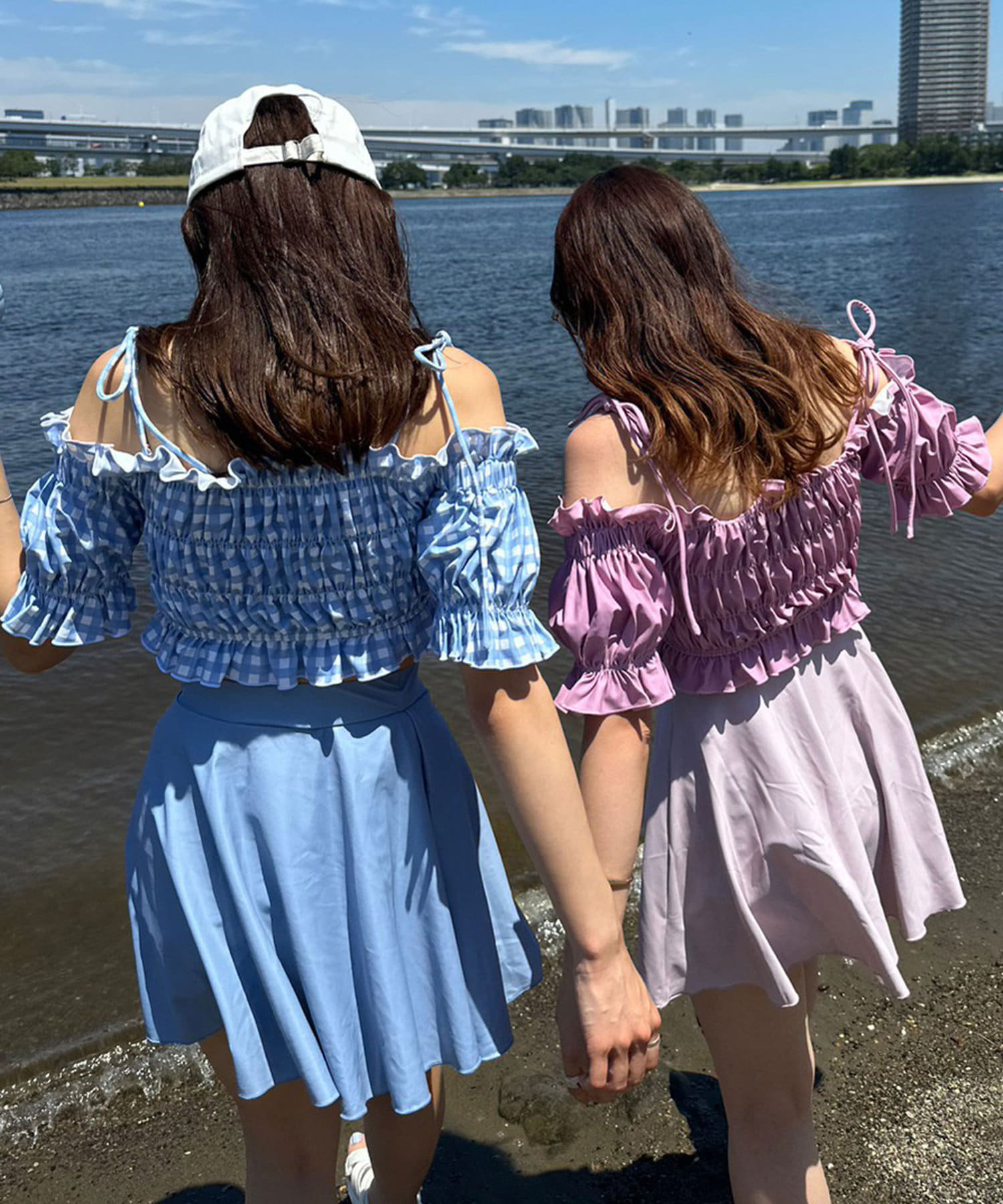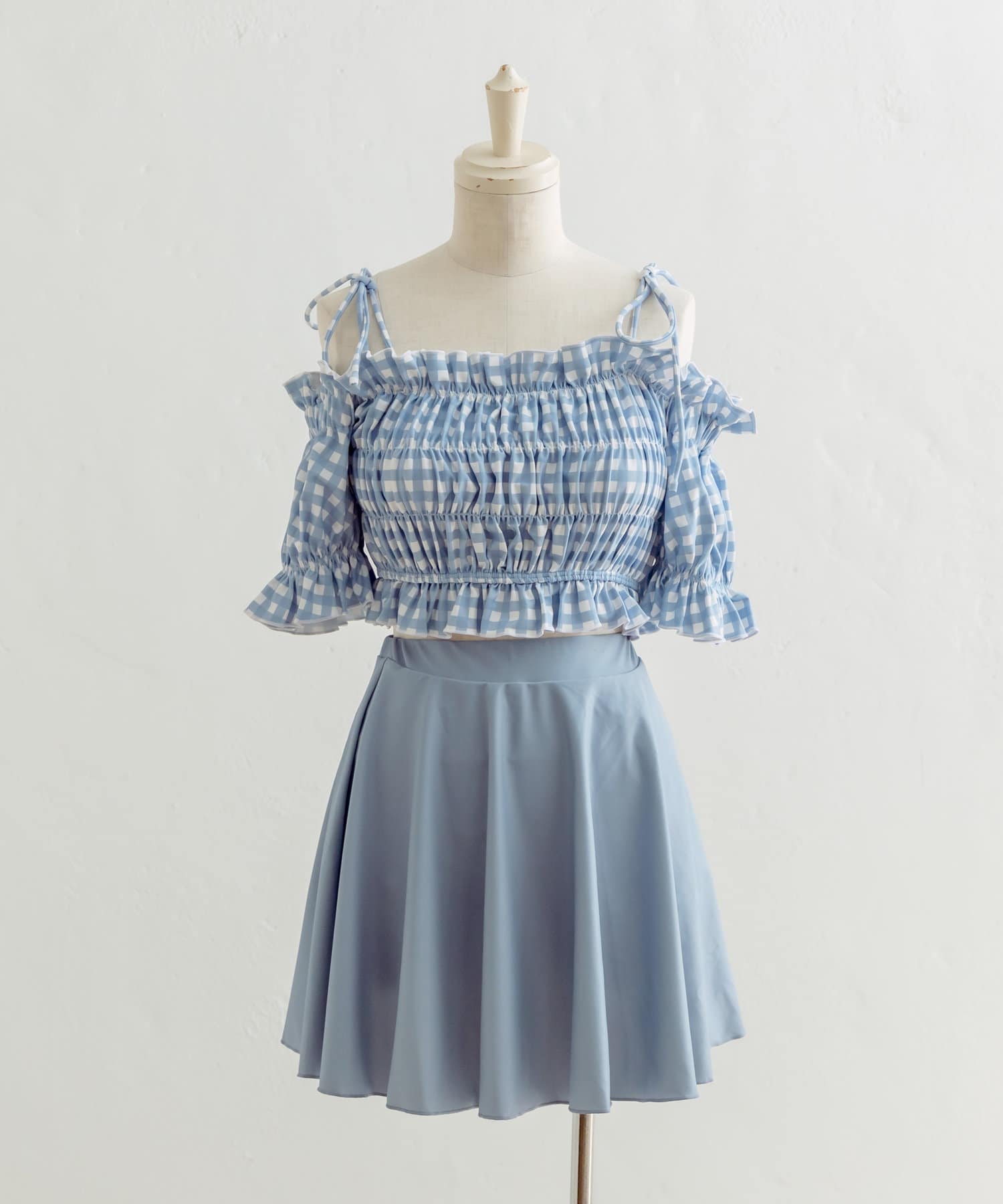 ・オフホワイト(トップス: ドット)/サックス(トップス: ギンガムチェック)/ピンク(無地)/ブラック(スカート: ギンガムチェック)/ミント(無地)の5色展開。