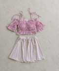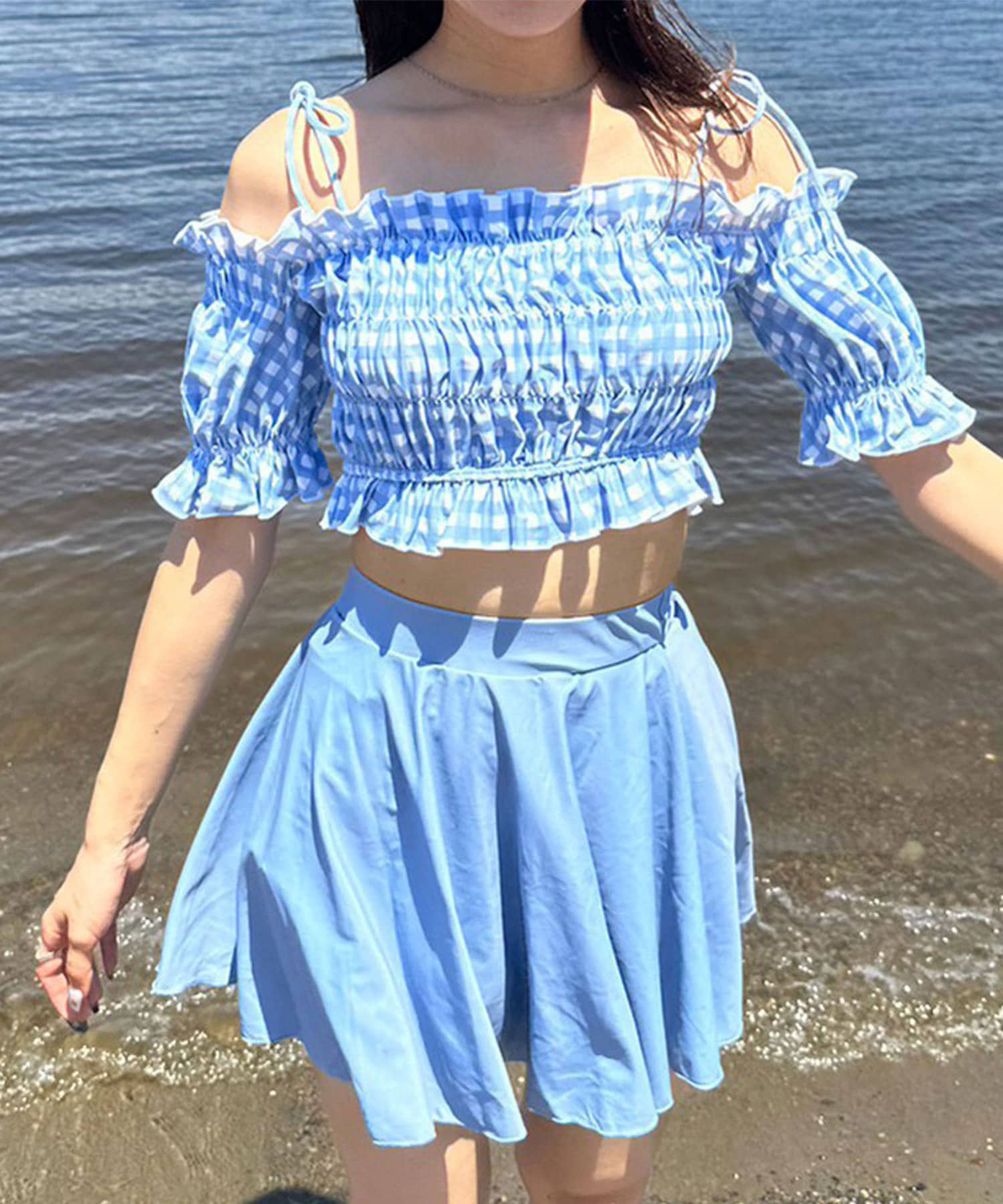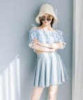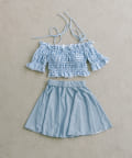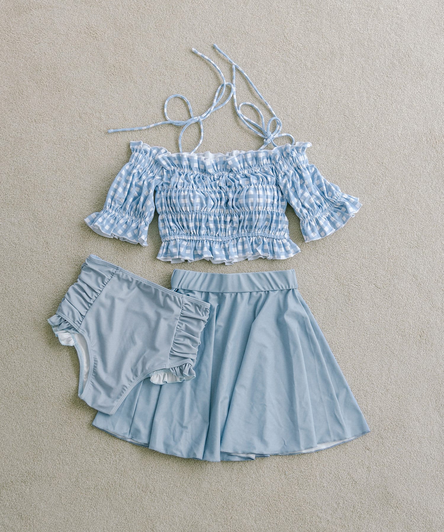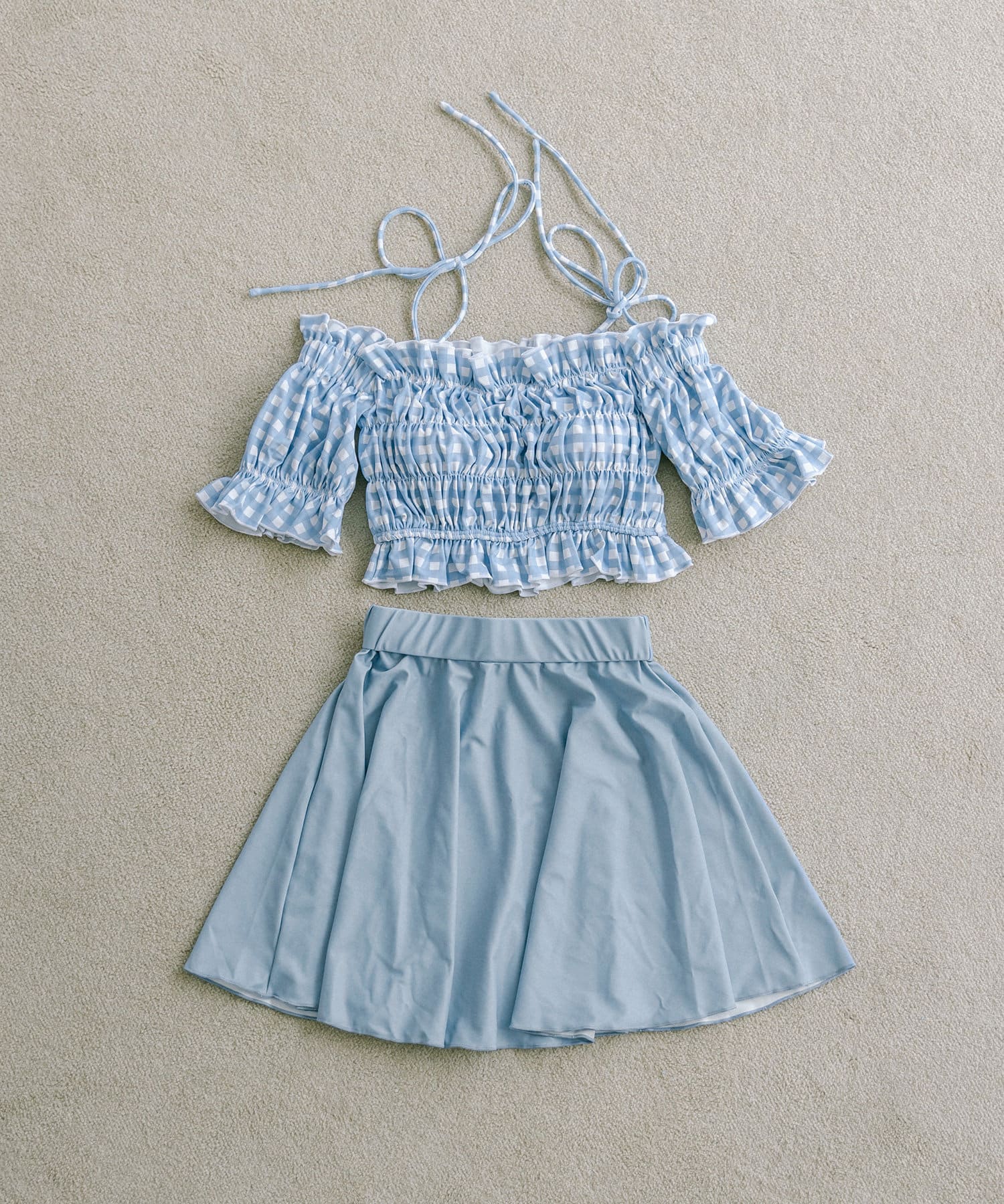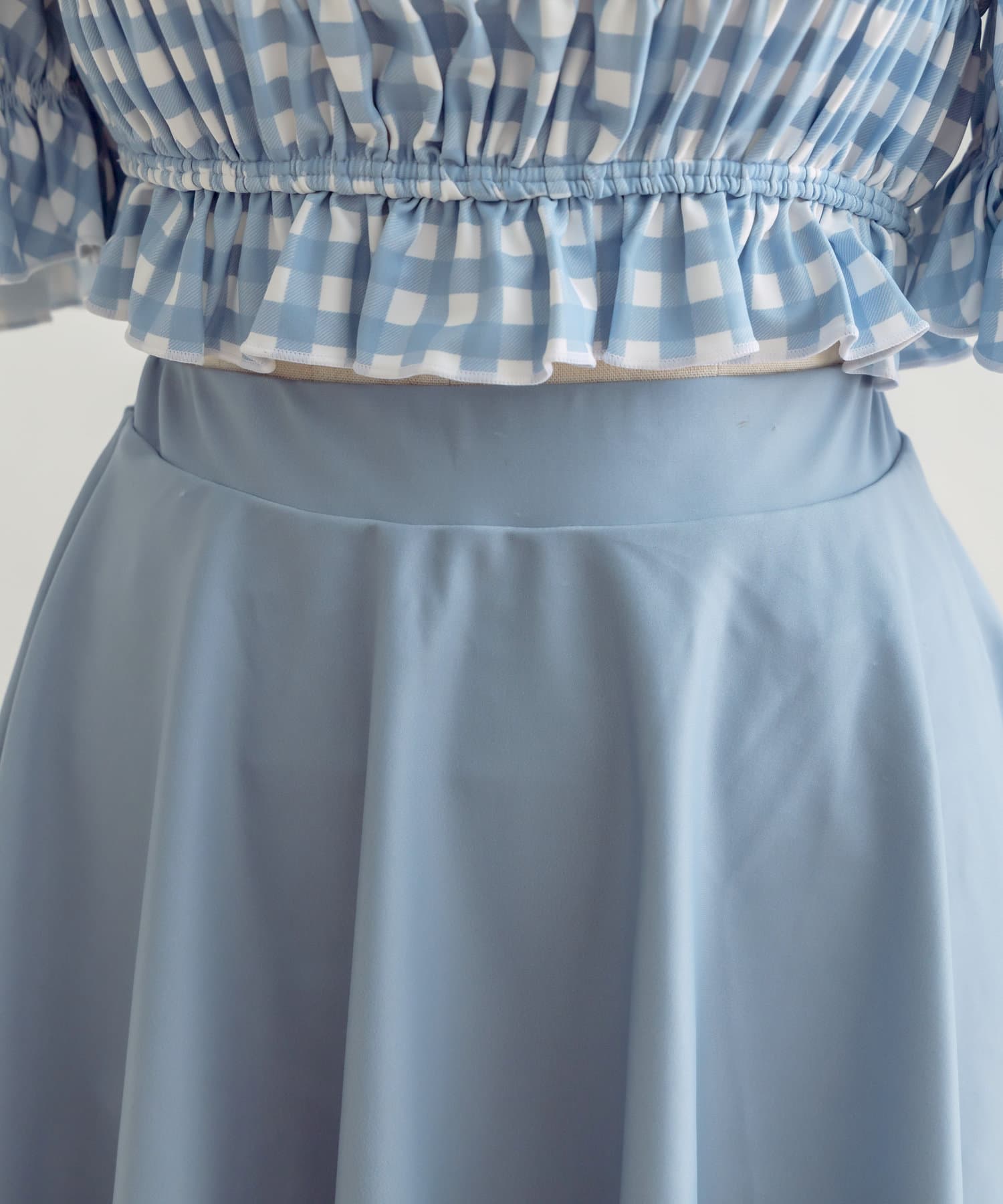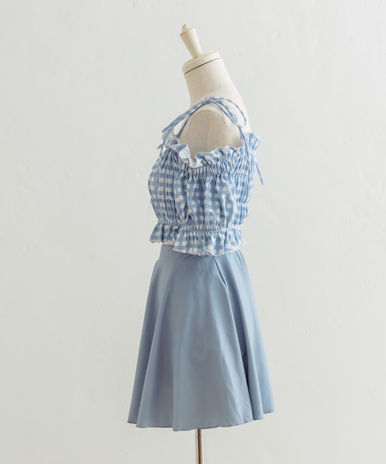 ・オフホワイト(トップス: ドット)/サックス(トップス: ギンガムチェック)/ピンク(無地)/ブラック(スカート: ギンガムチェック)/ミント(無地)の5色展開。