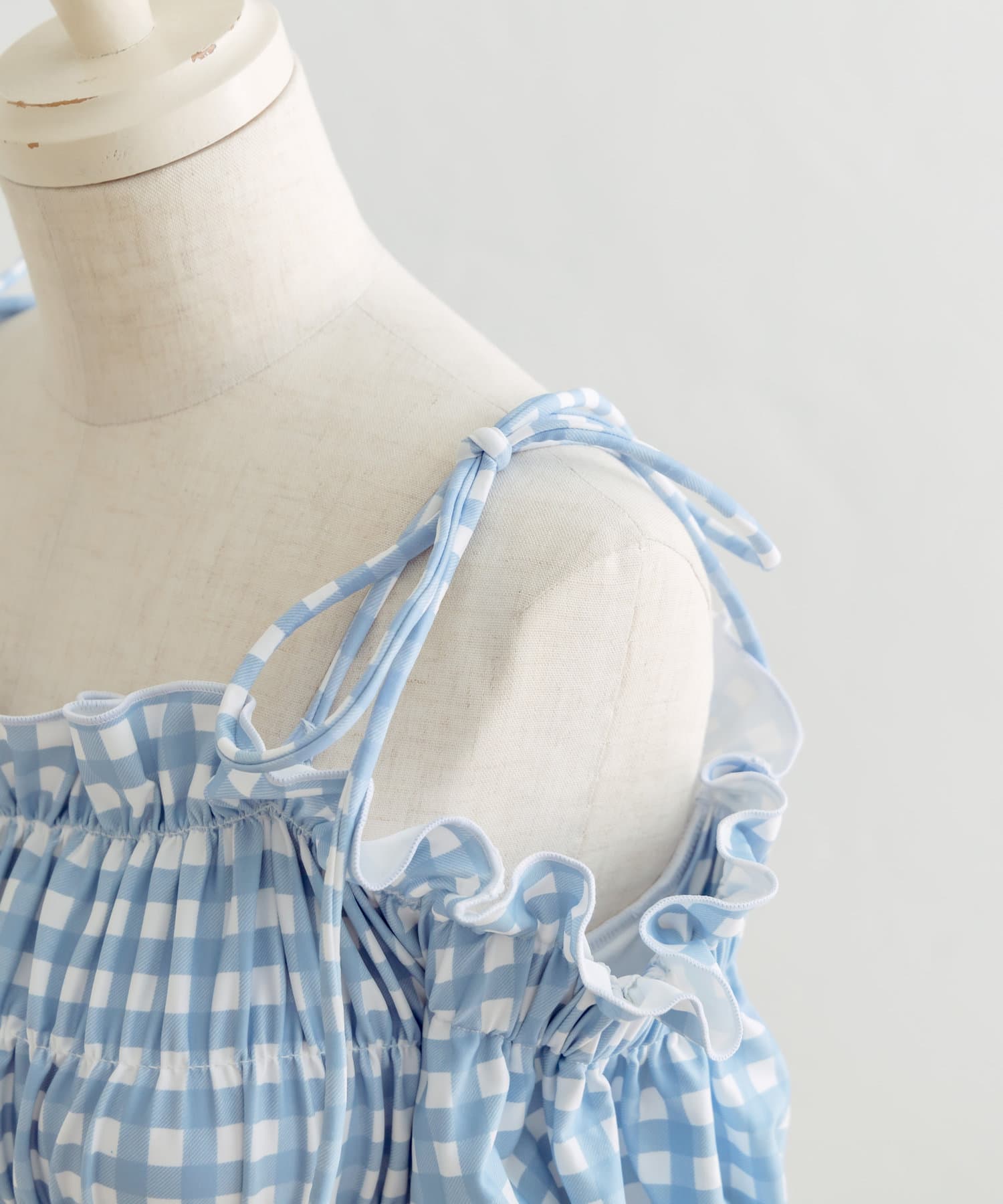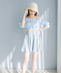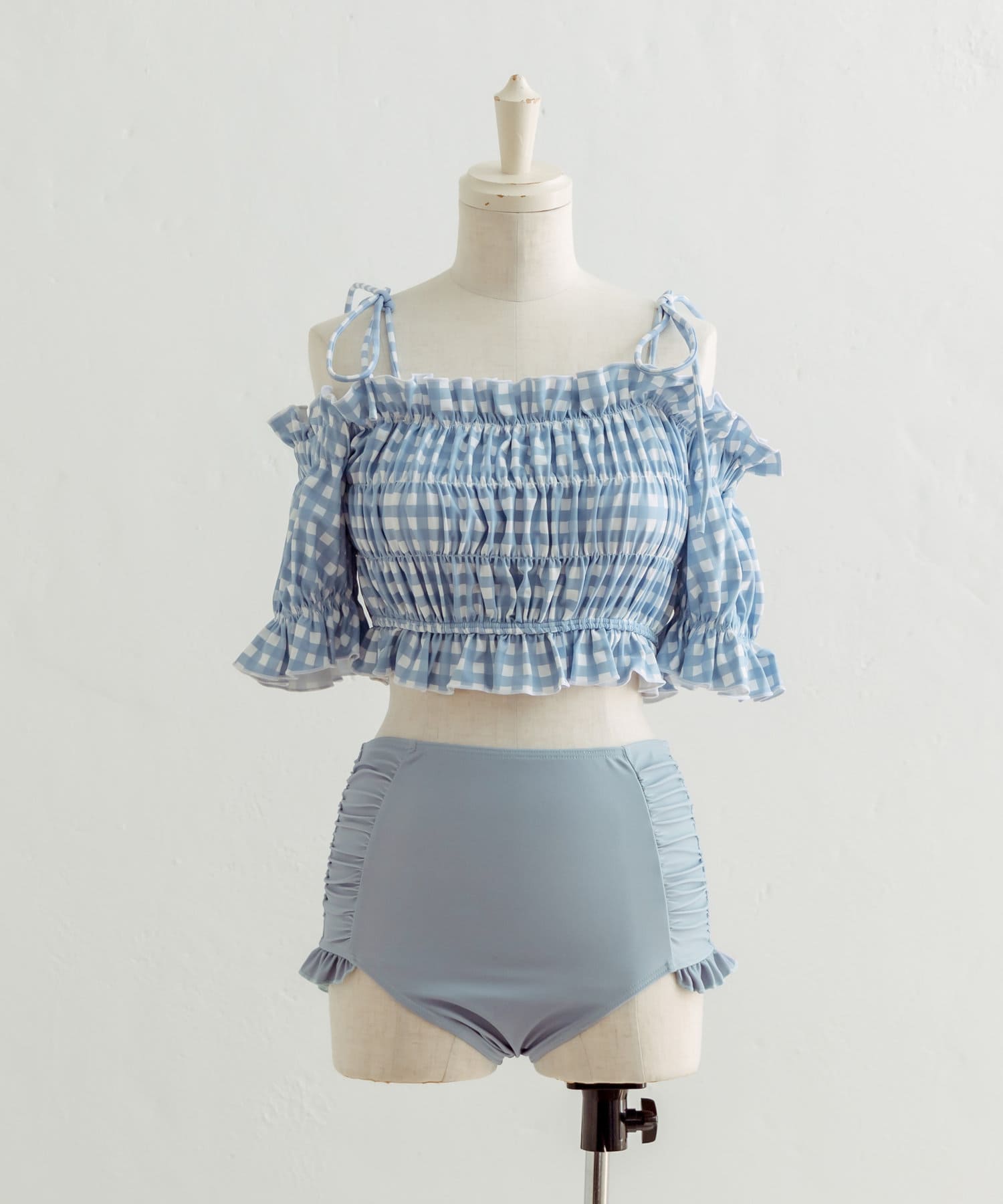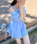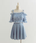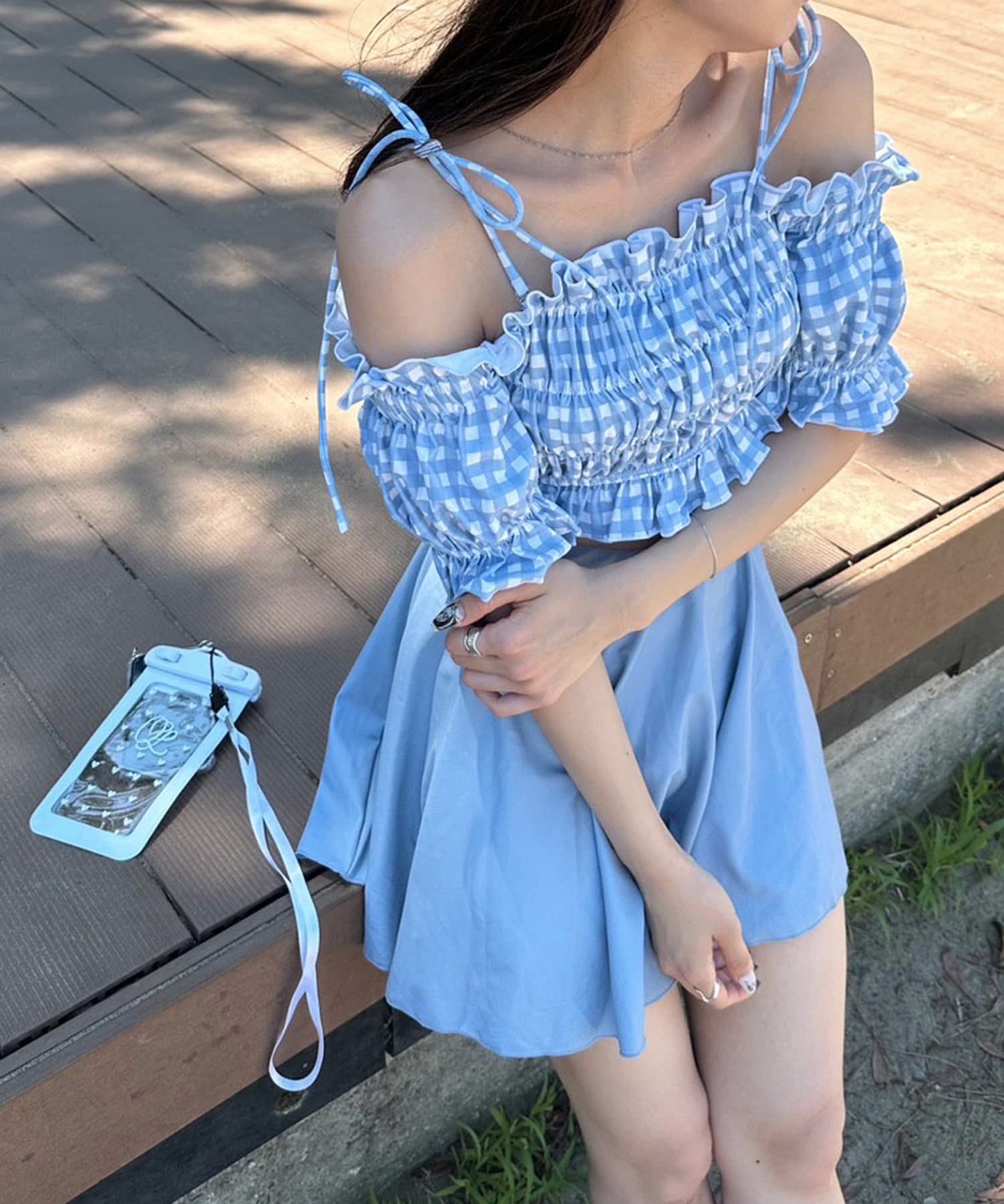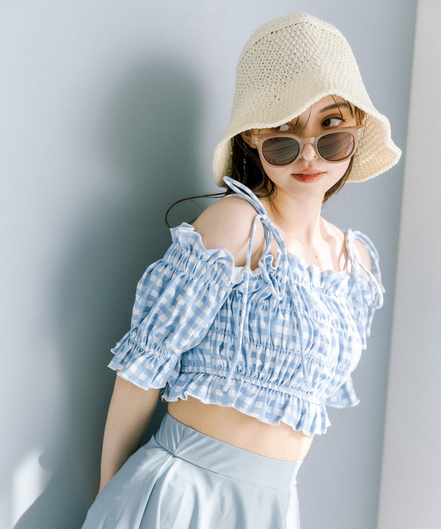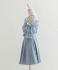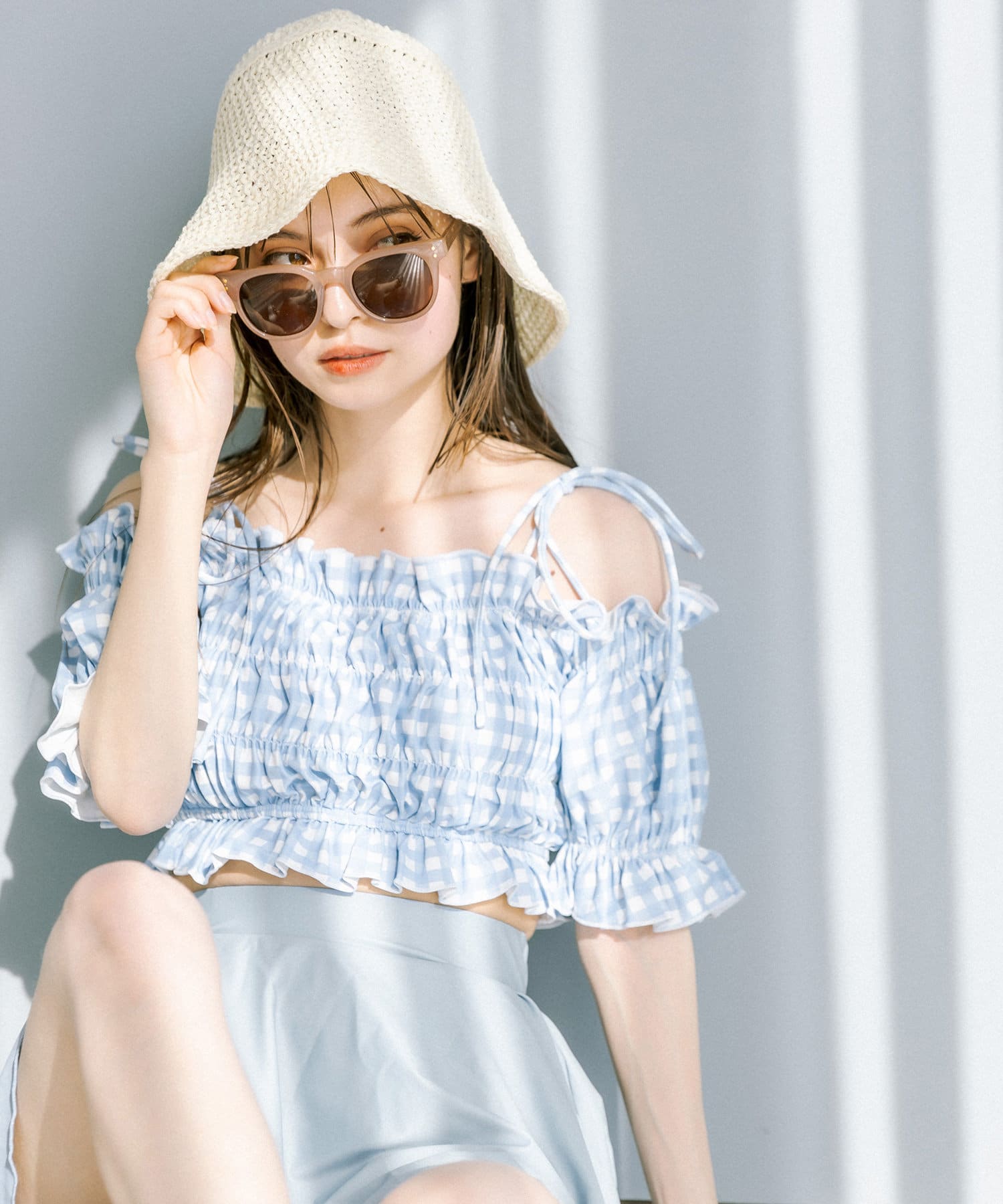 ・オフホワイト(トップス: ドット)/サックス(トップス: ギンガムチェック)/ピンク(無地)/ブラック(スカート: ギンガムチェック)/ミント(無地)の5色展開。