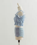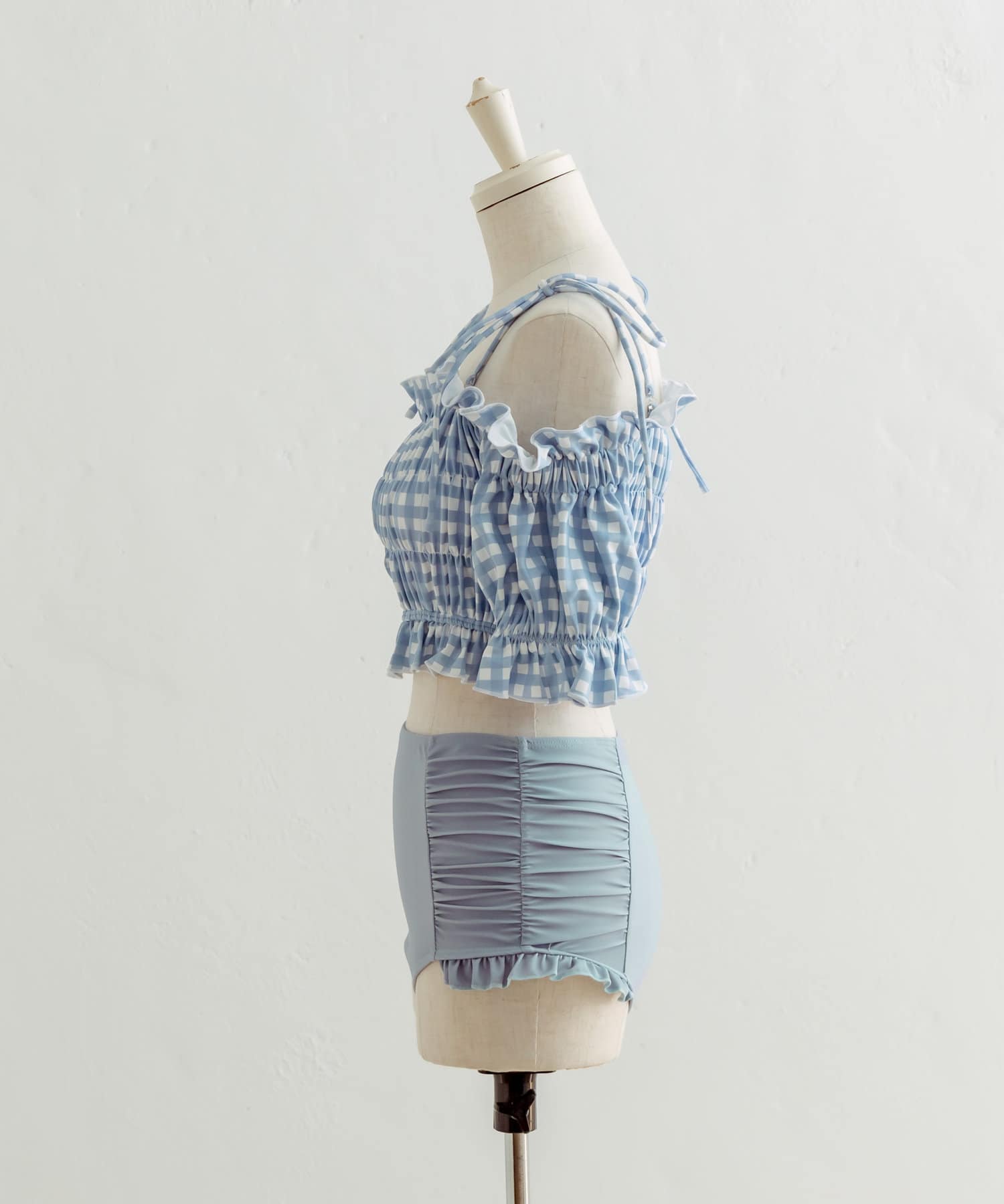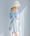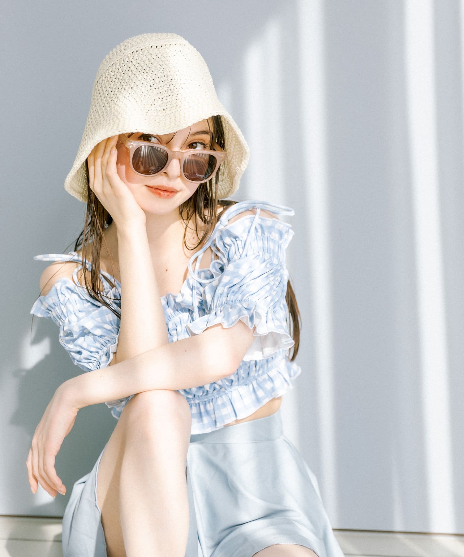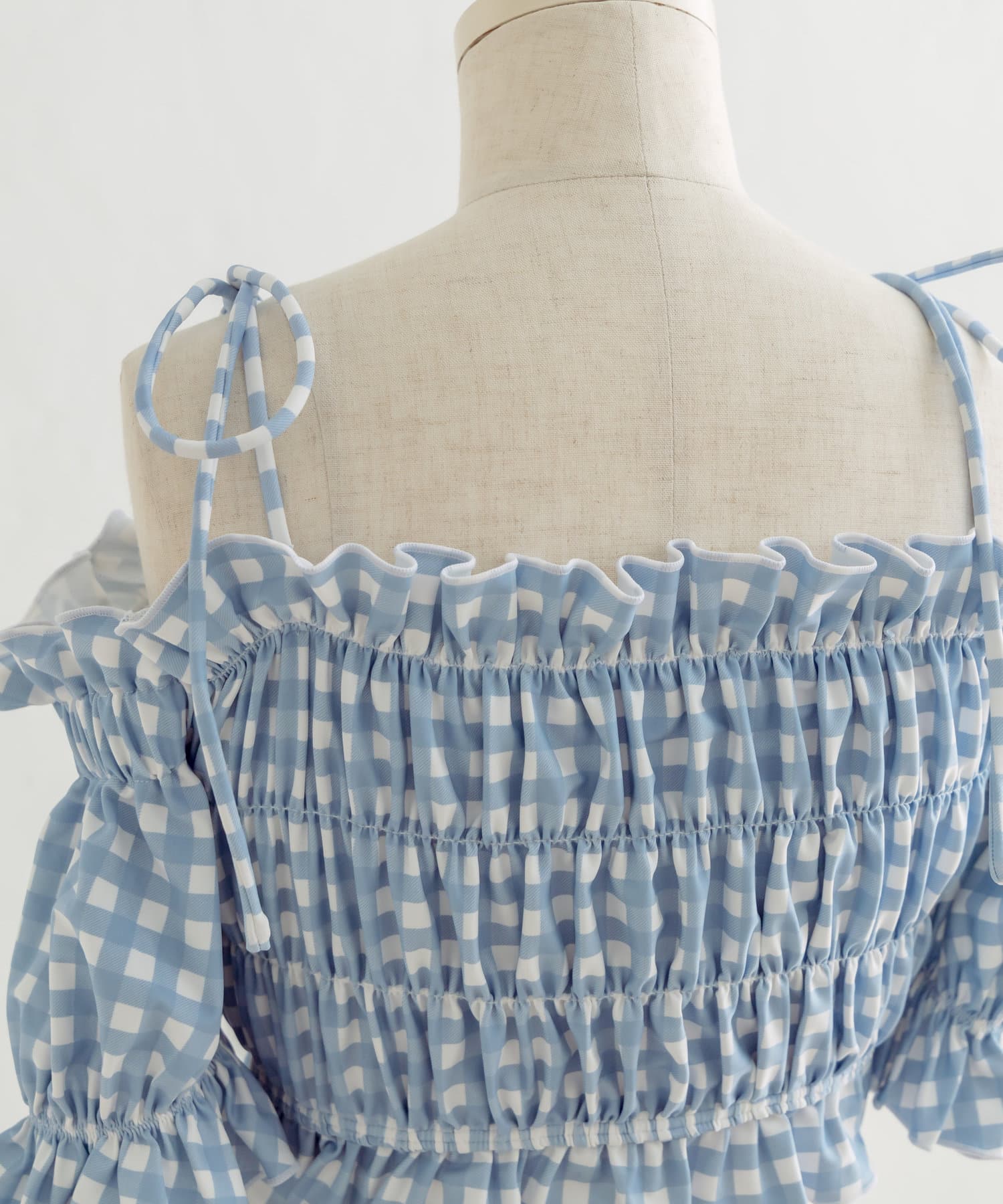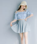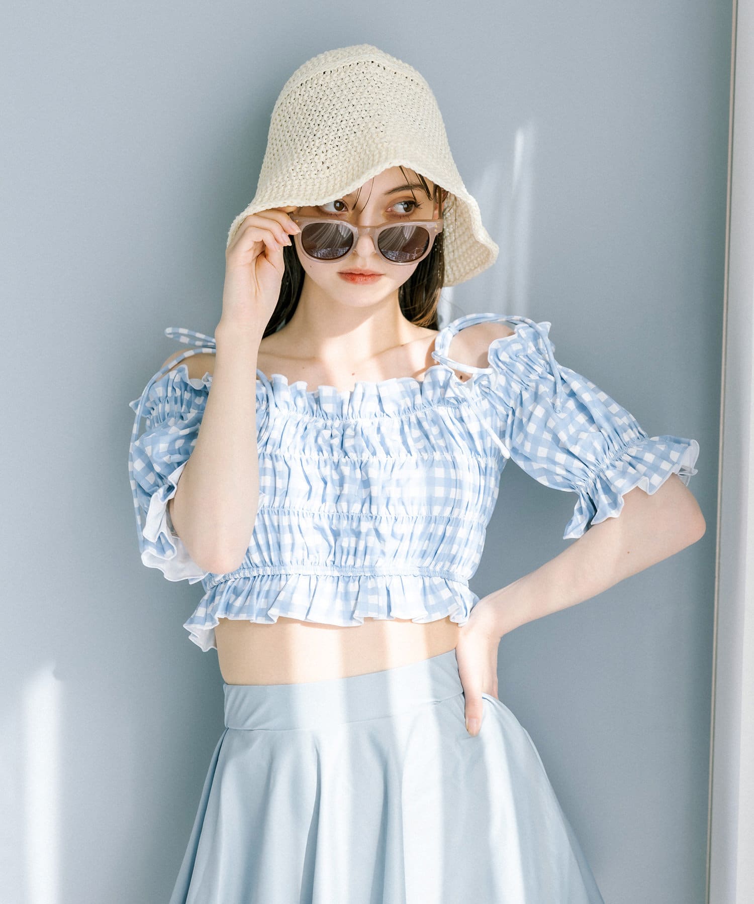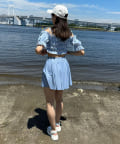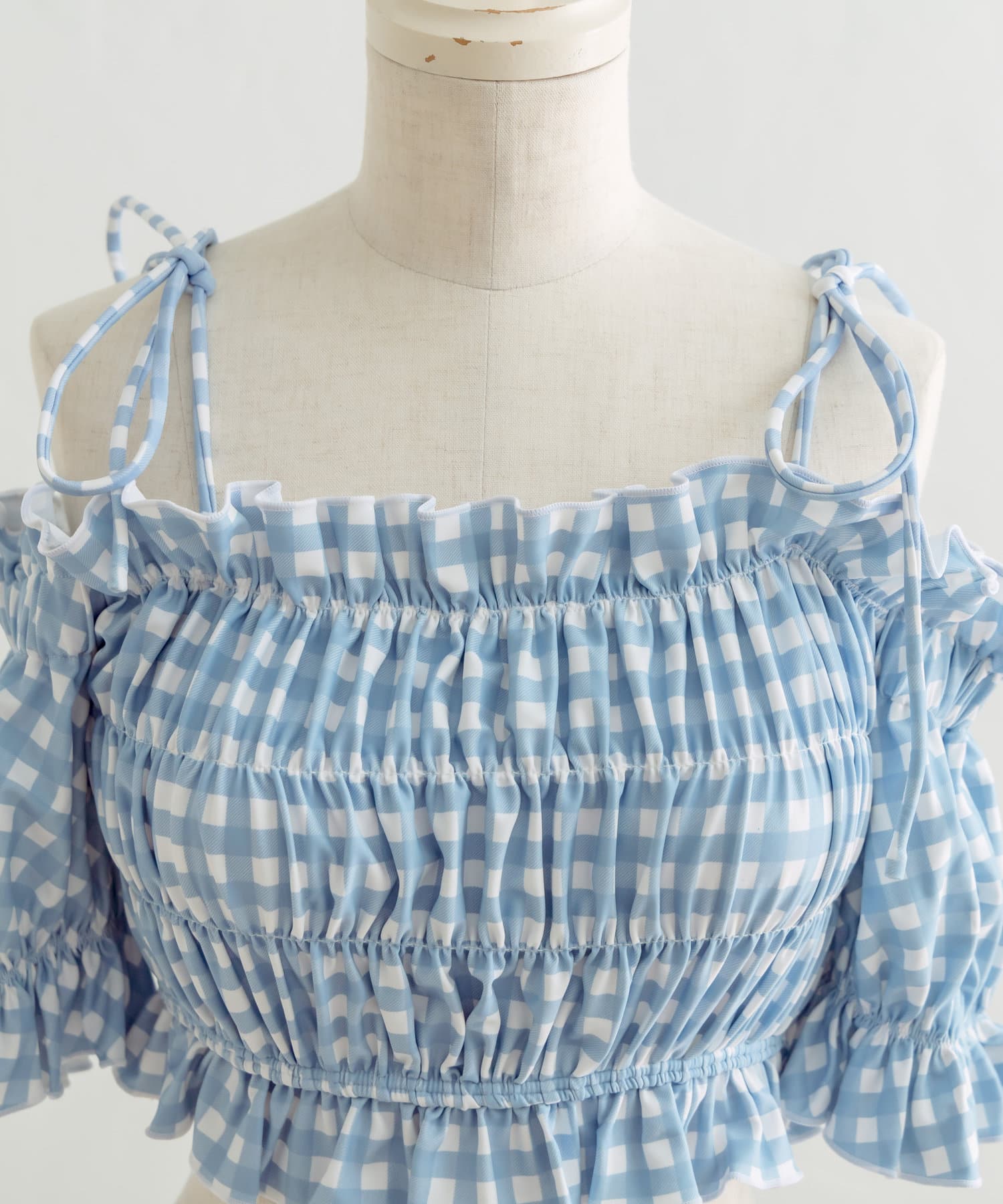 ・オフホワイト(トップス: ドット)/サックス(トップス: ギンガムチェック)/ピンク(無地)/ブラック(スカート: ギンガムチェック)/ミント(無地)の5色展開。