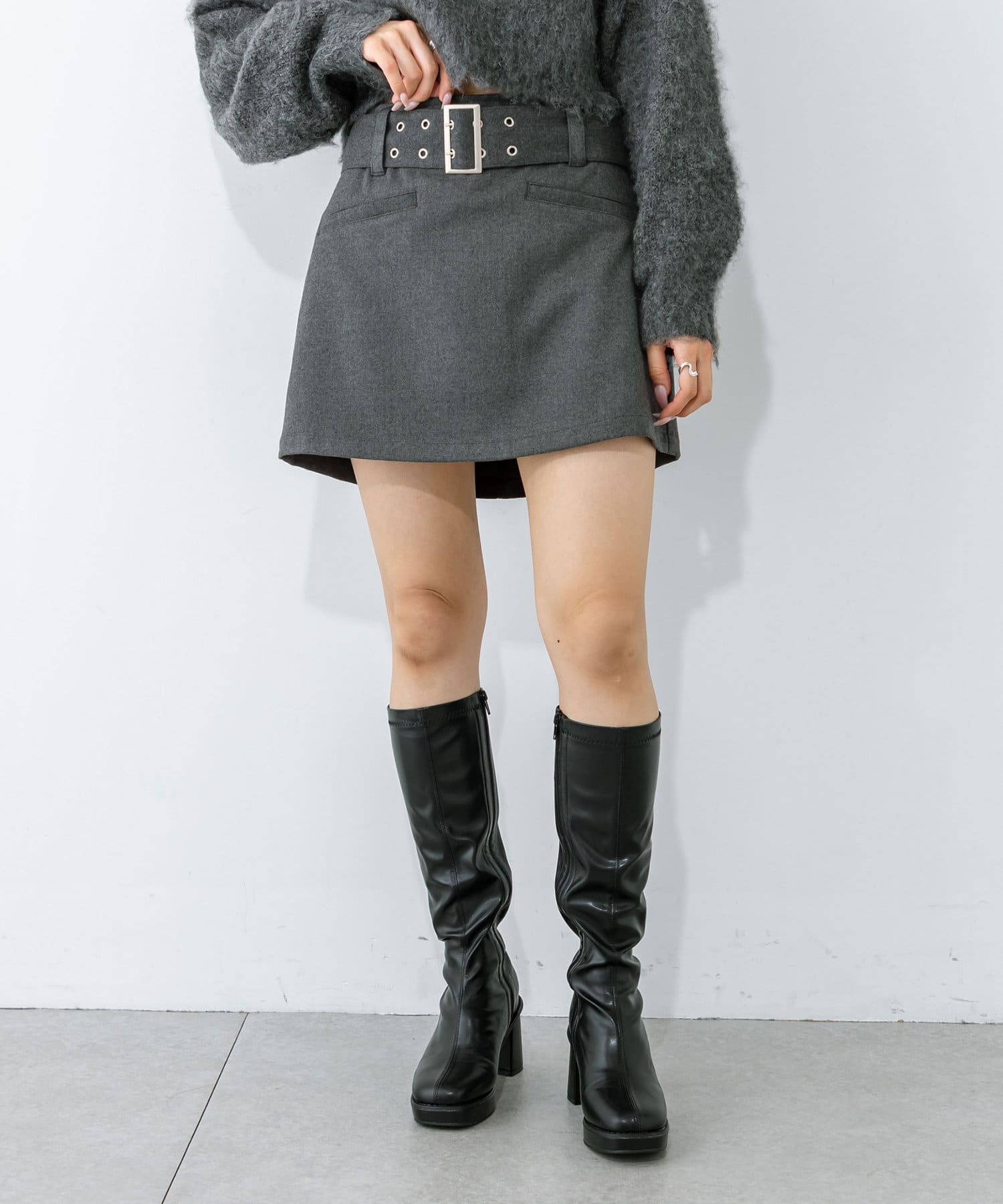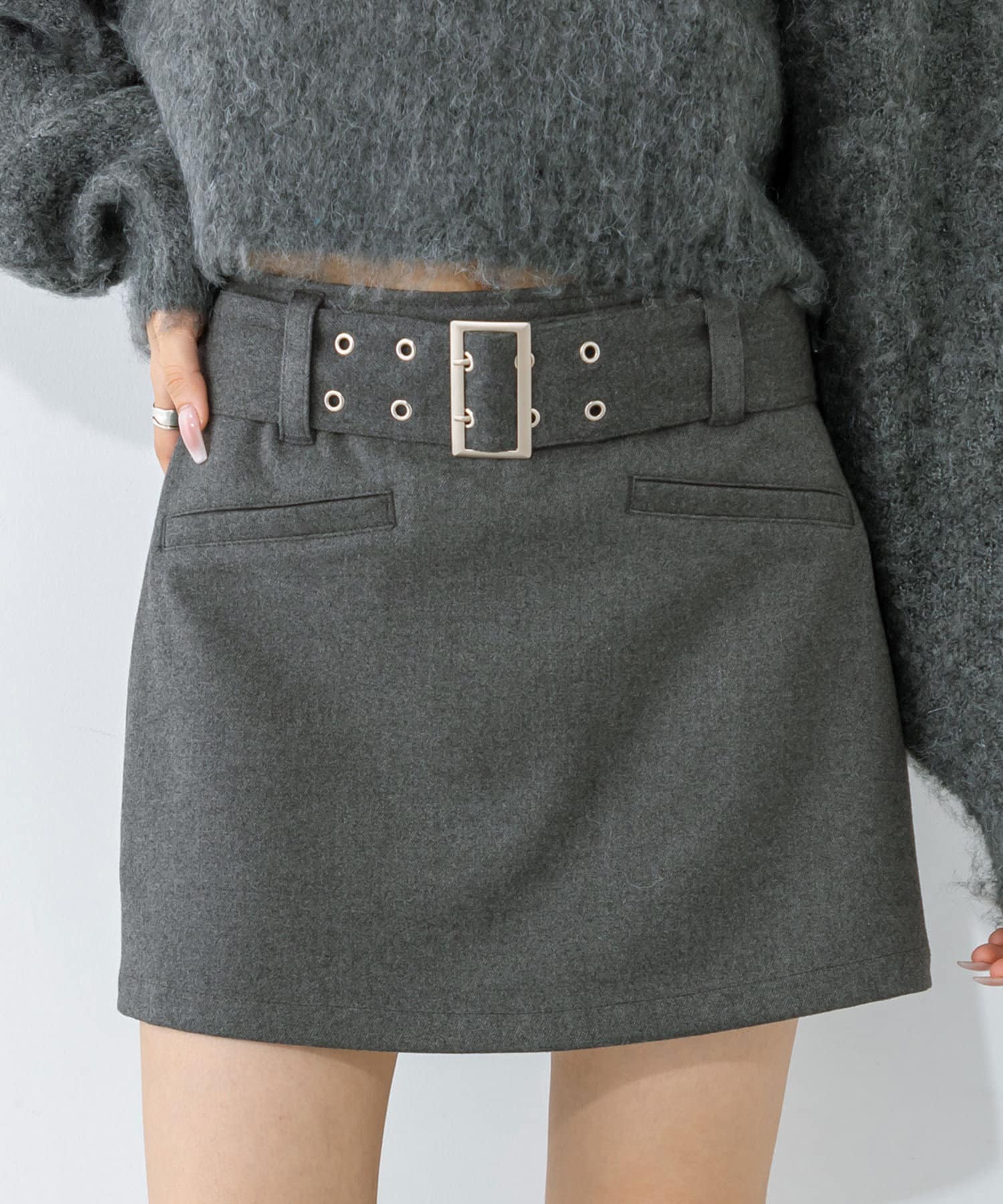 ・同素材のハトメベルトがポイントのミニスカート