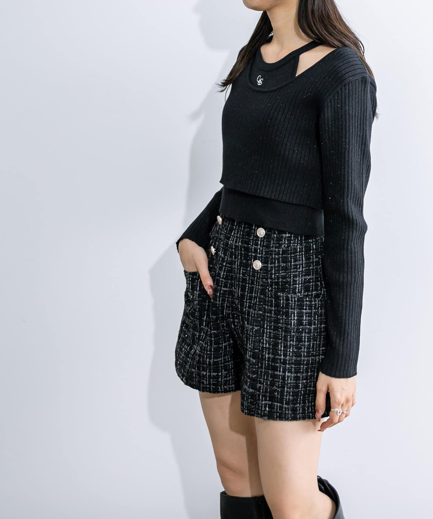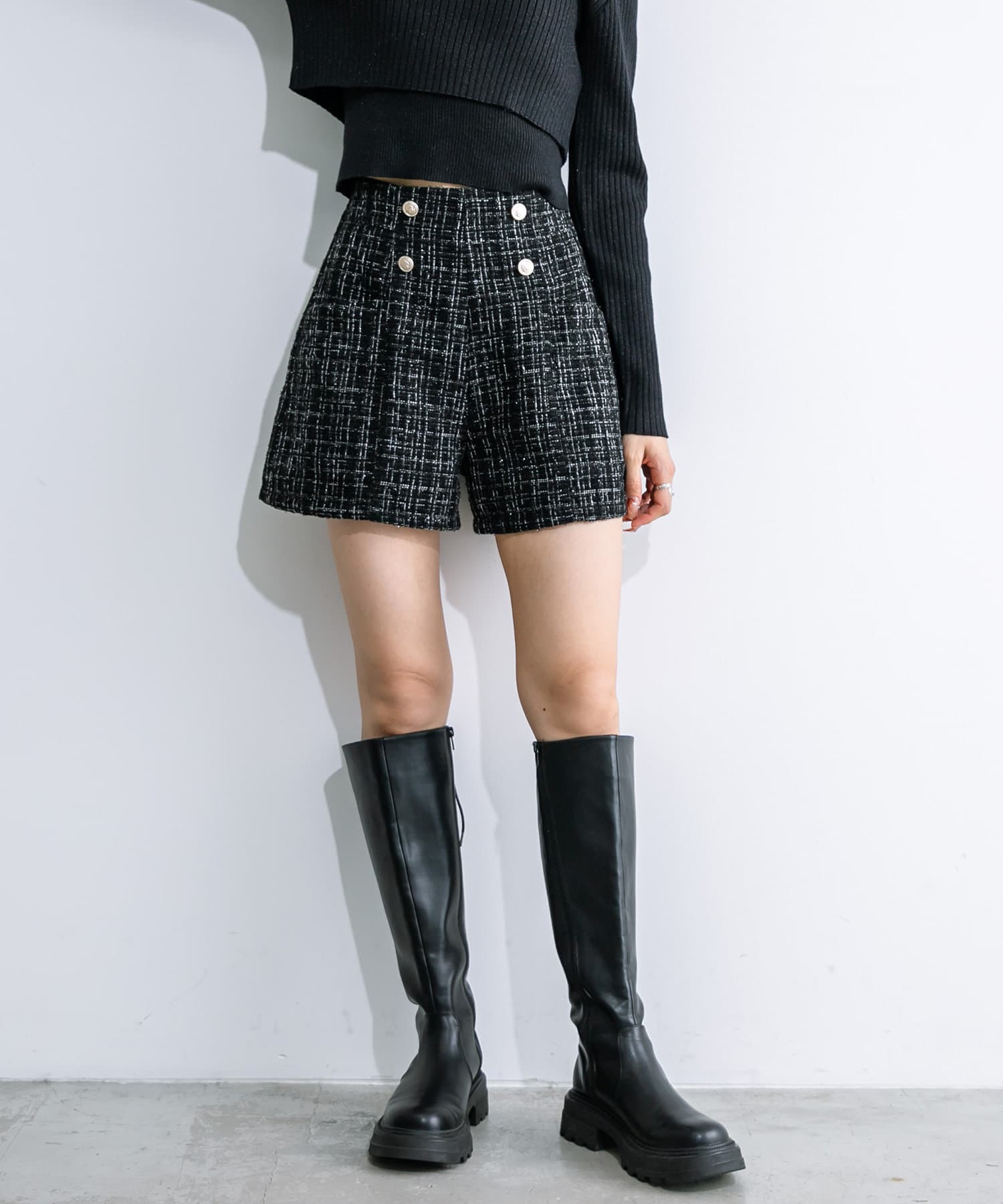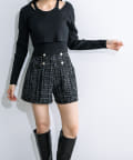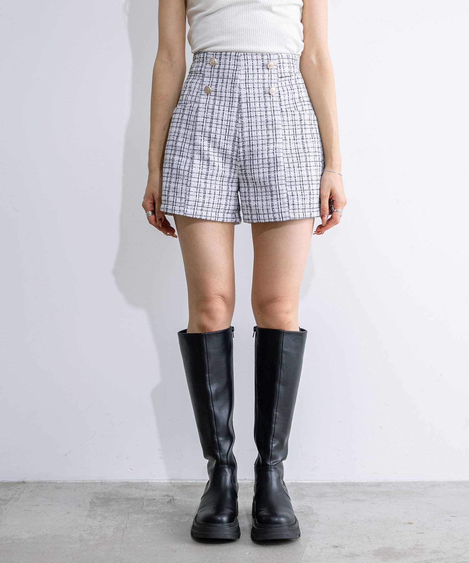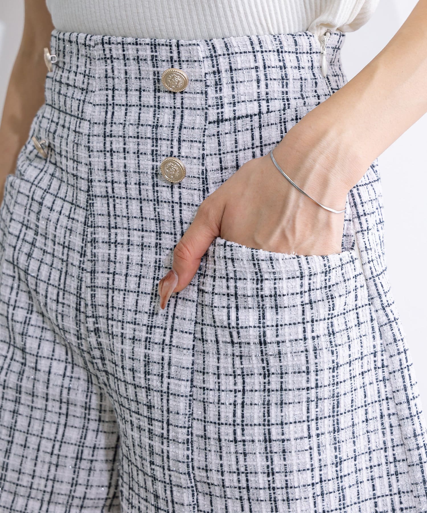 ・ハイウエストで、ゴールドのボタンがワンポイントに。インコーデもおすすめです。