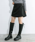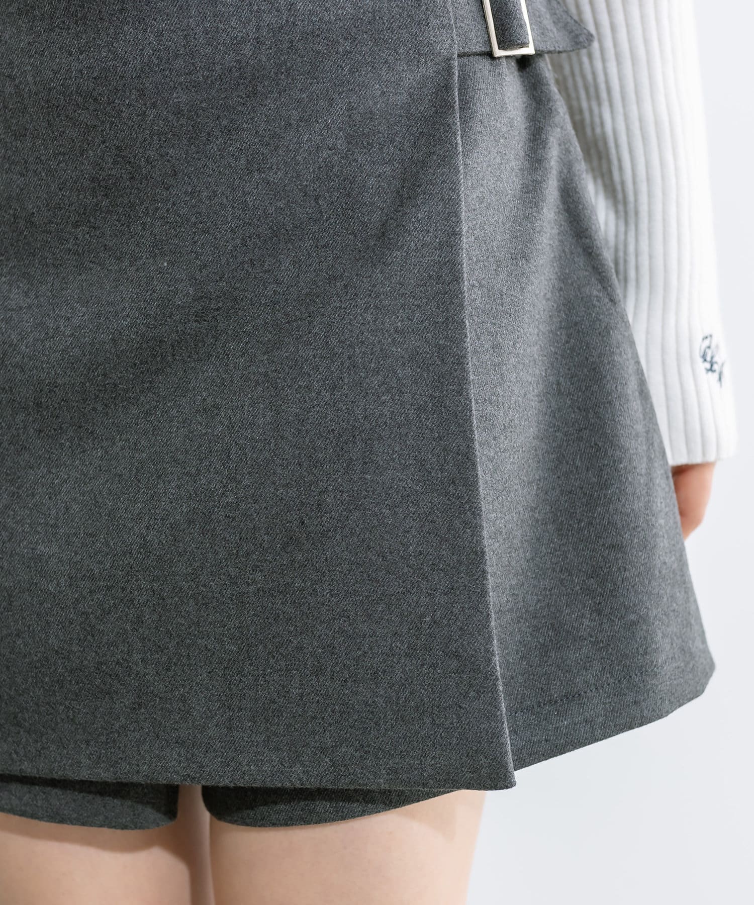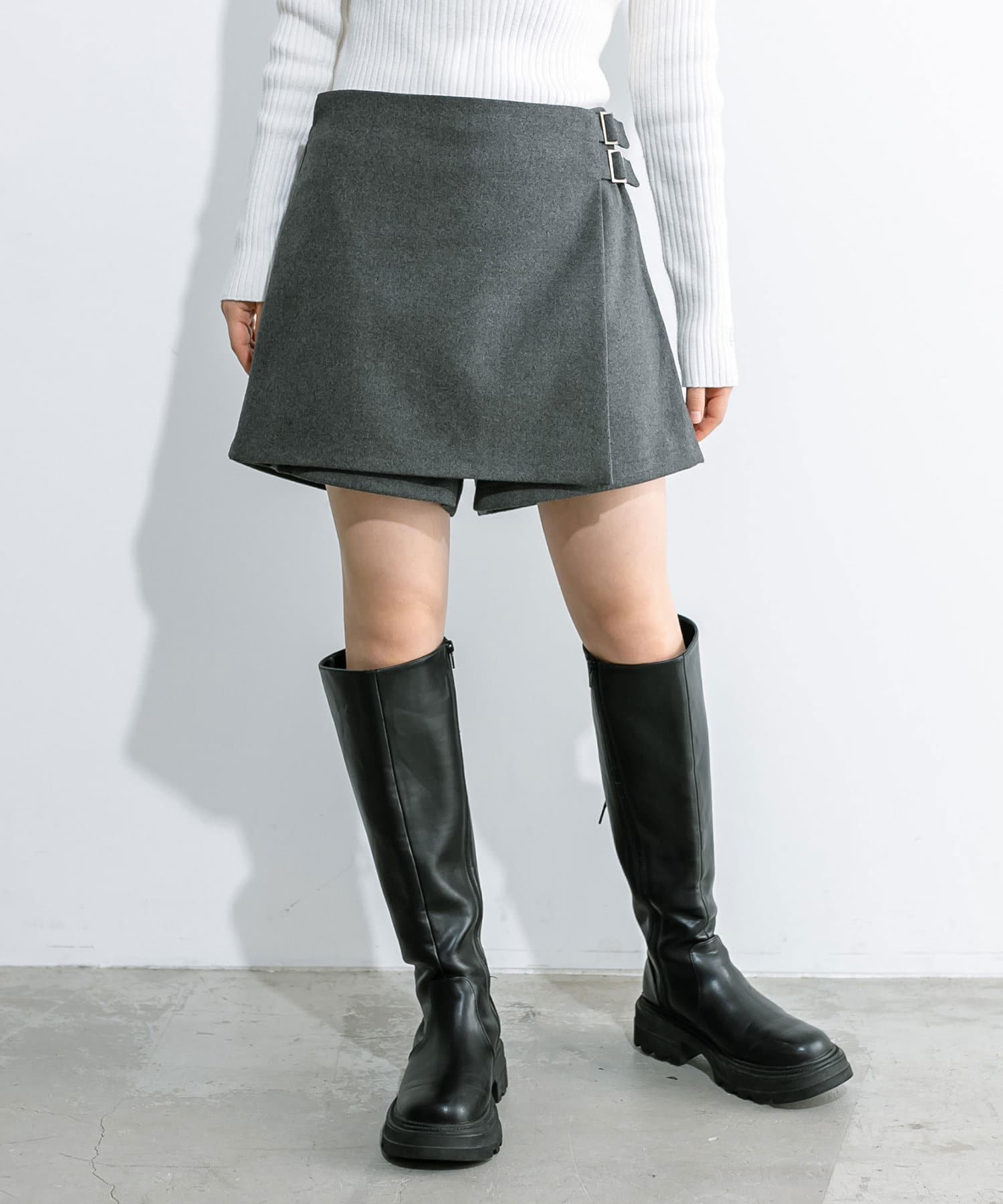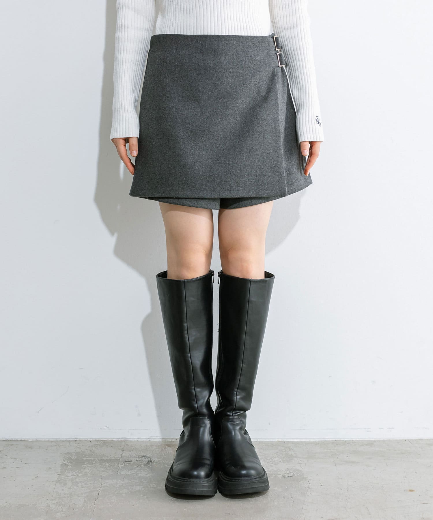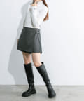 ・前のラップデザインとウエストベルトがポイントのスカパン。