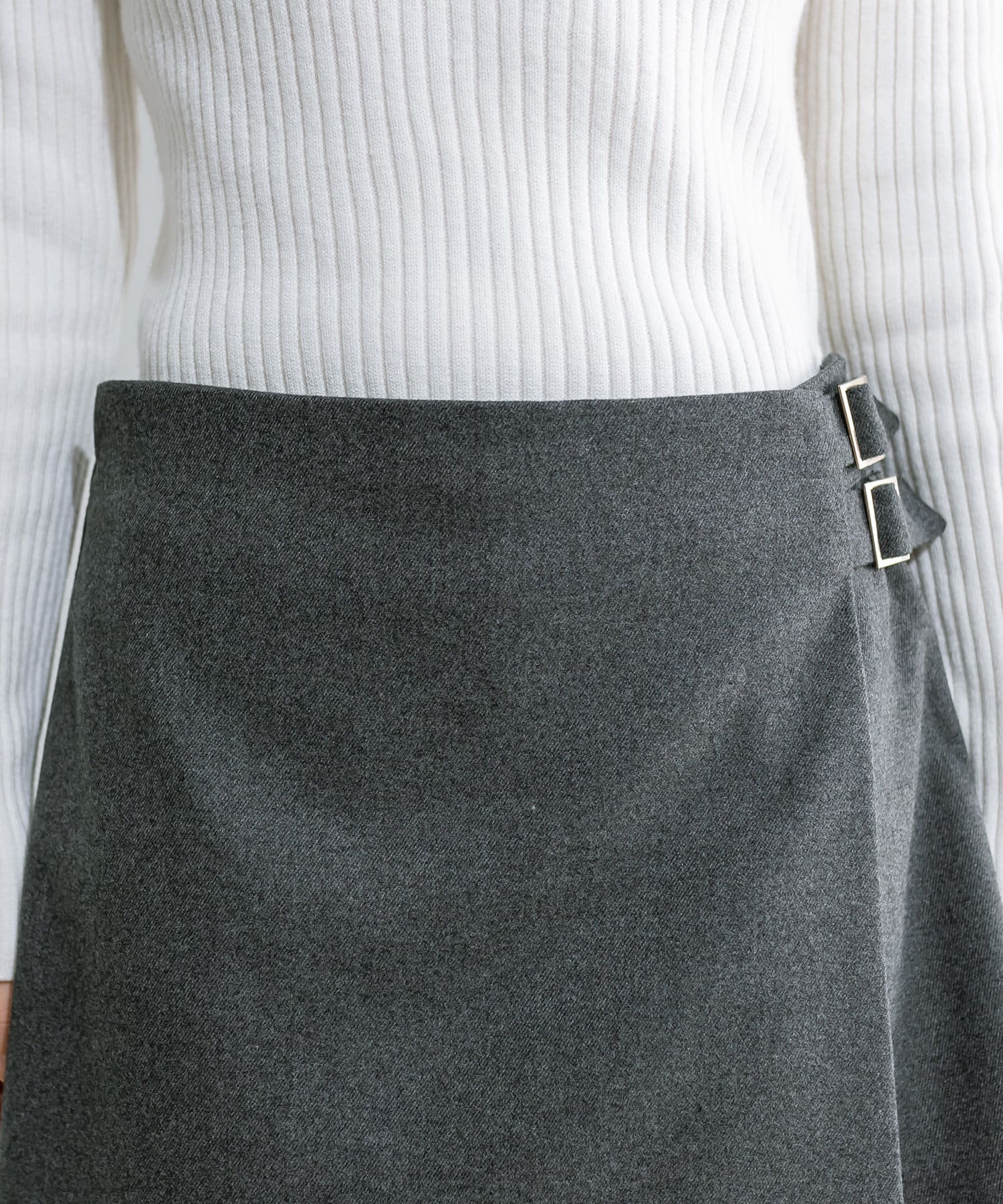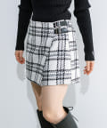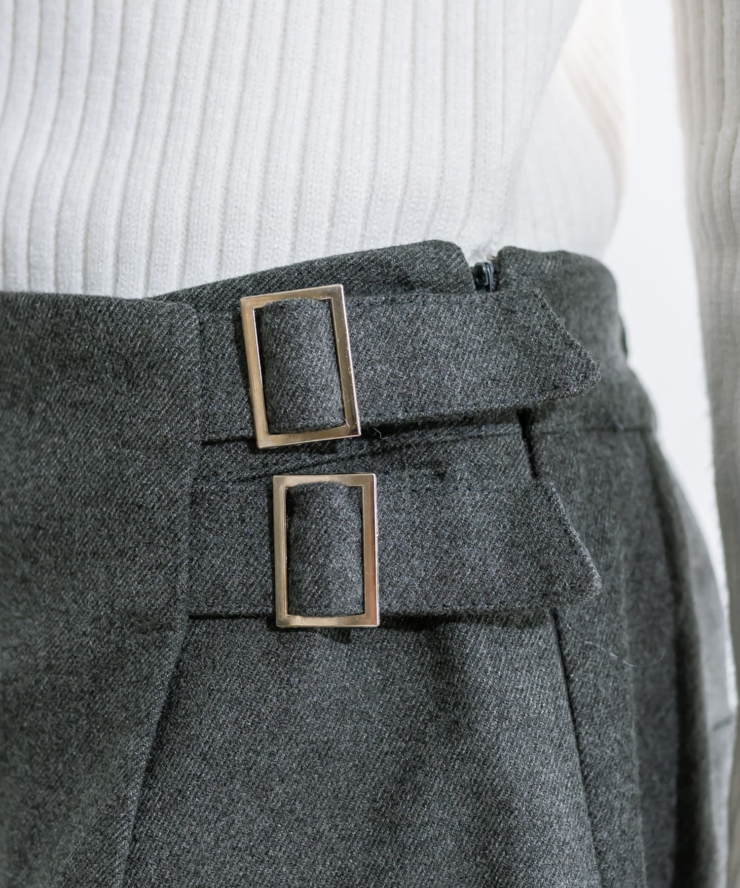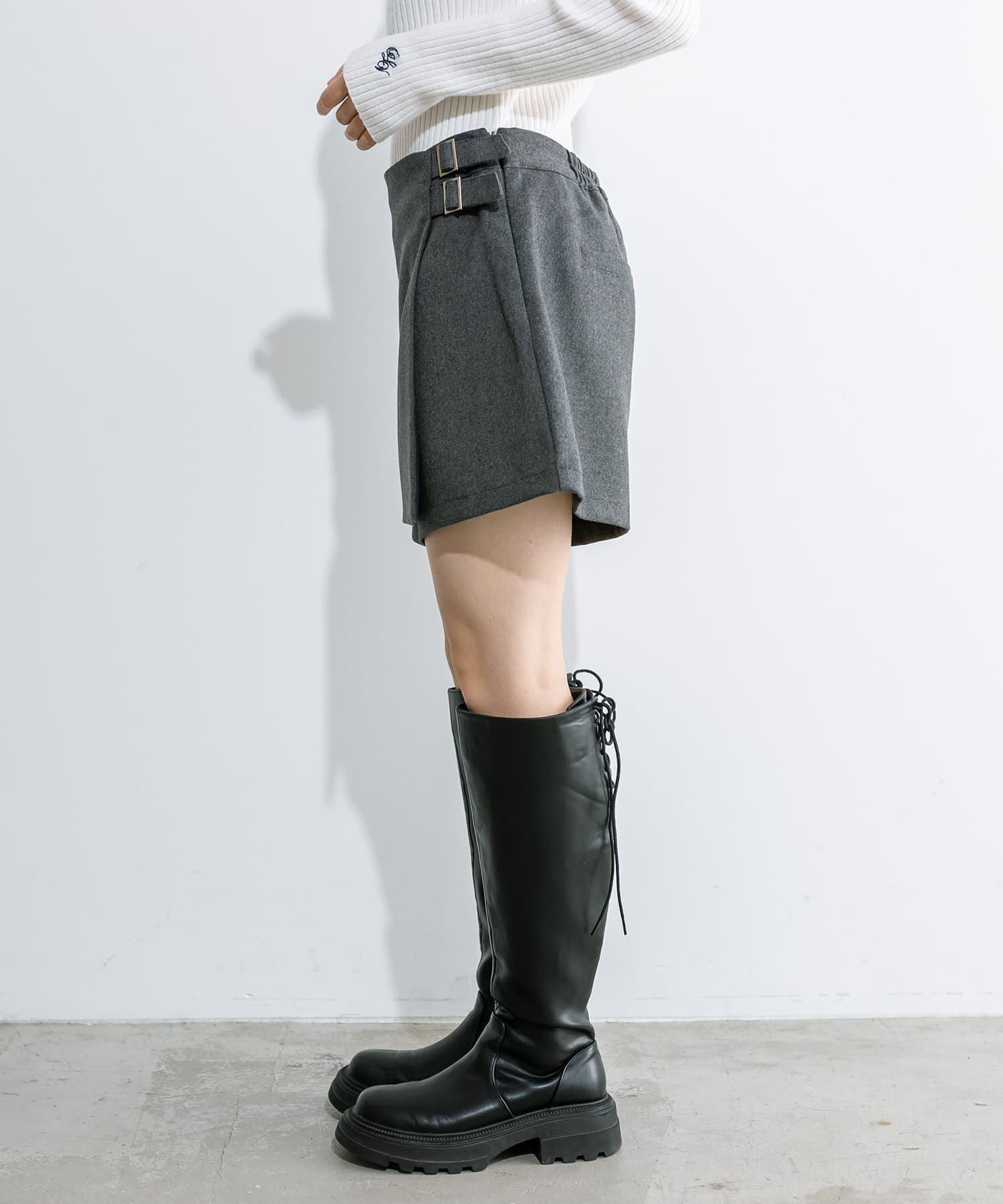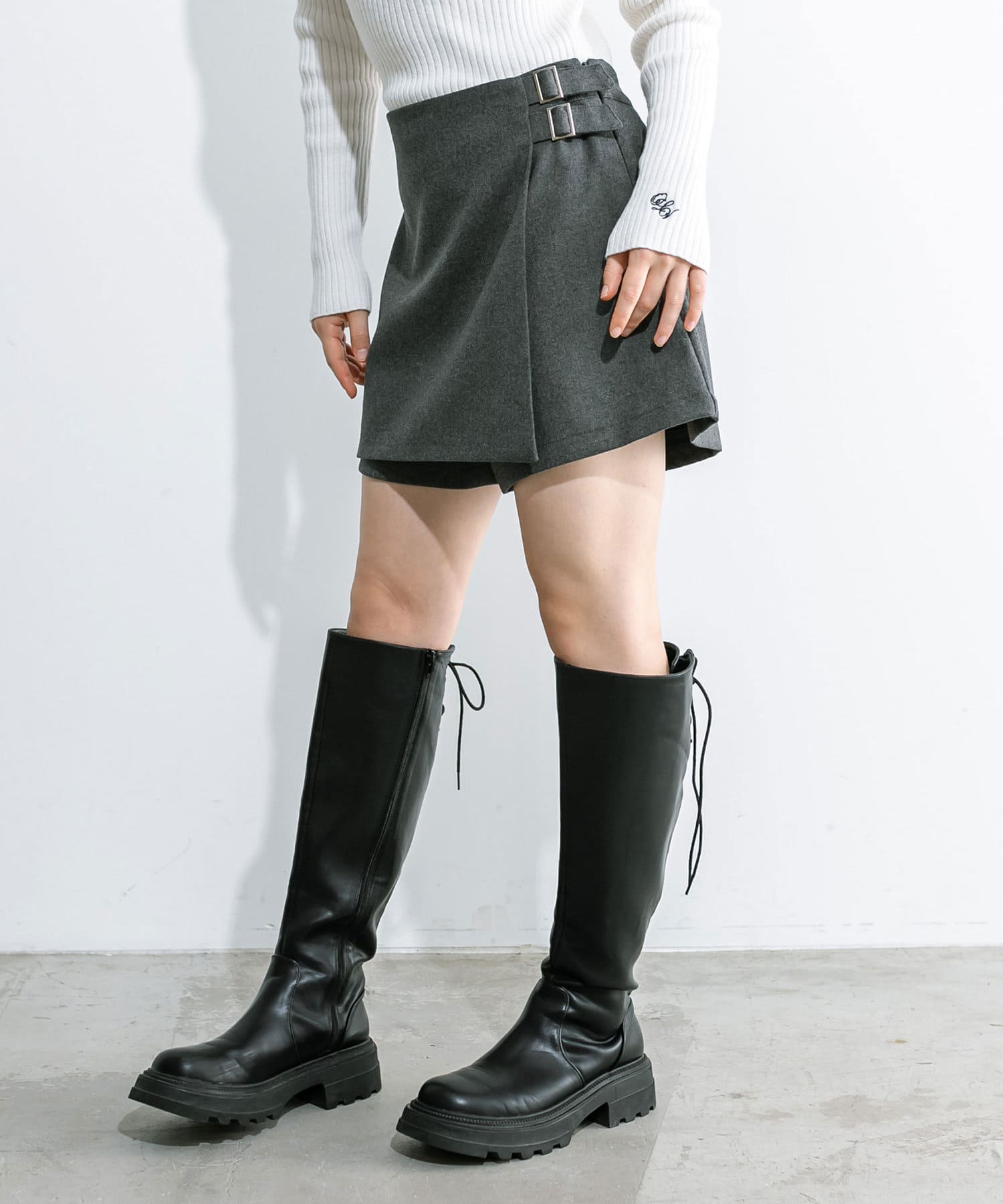 ・前のラップデザインとウエストベルトがポイントのスカパン。