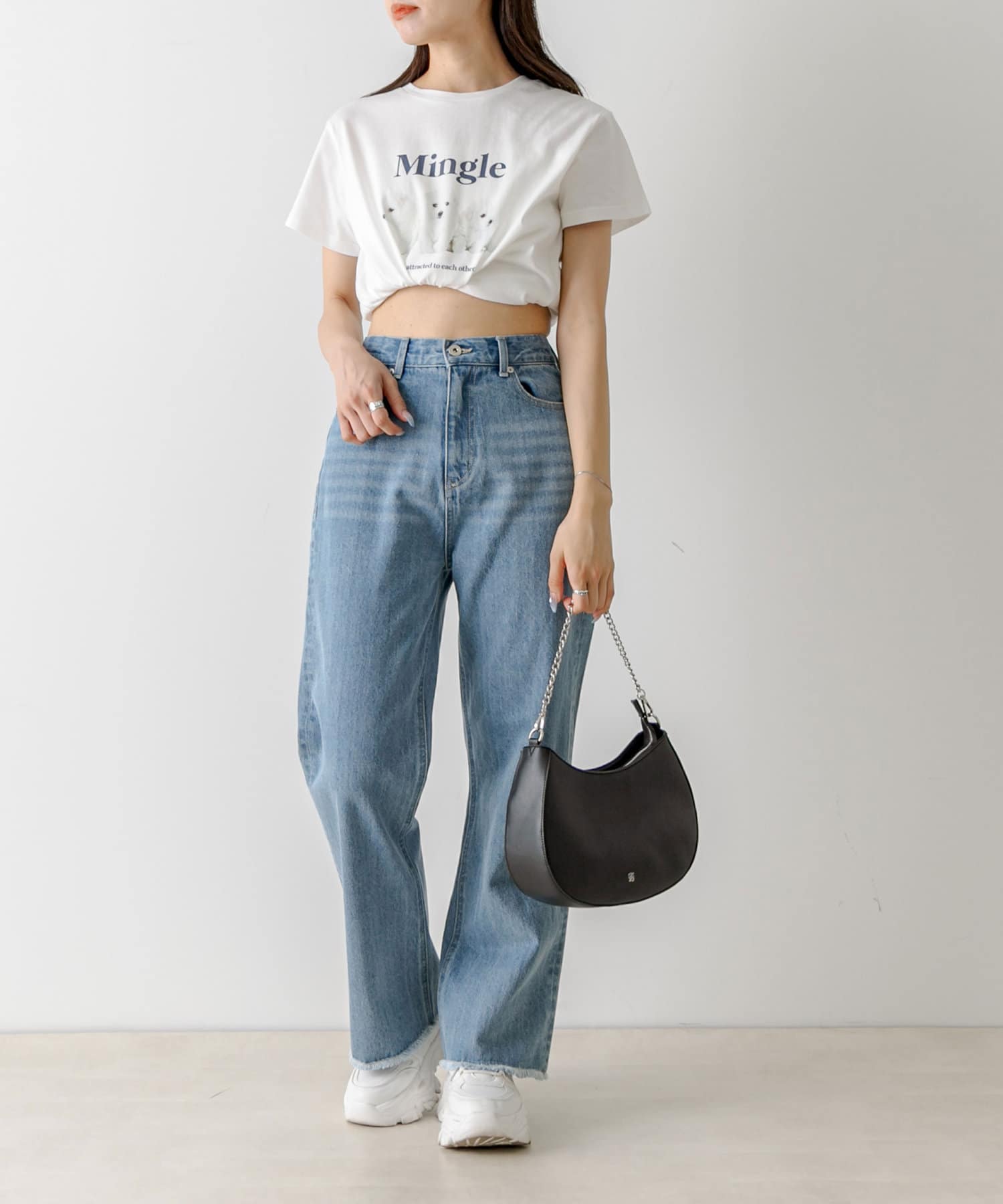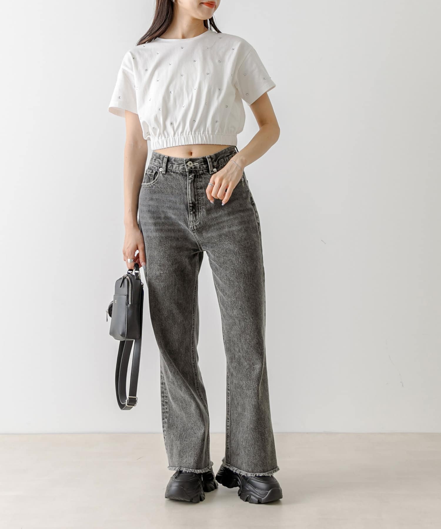 ・クロップド丈のトップスで合わせると今っぽいバランスに。