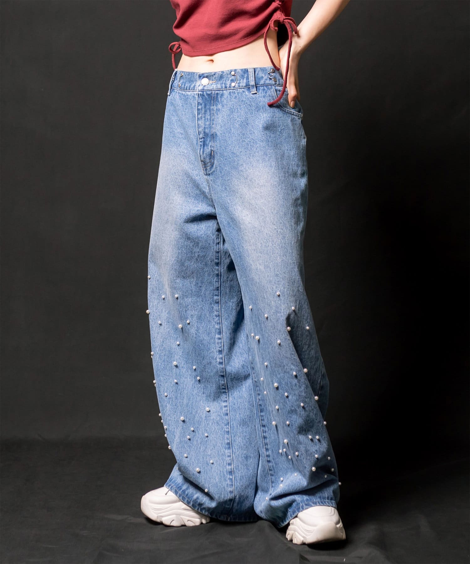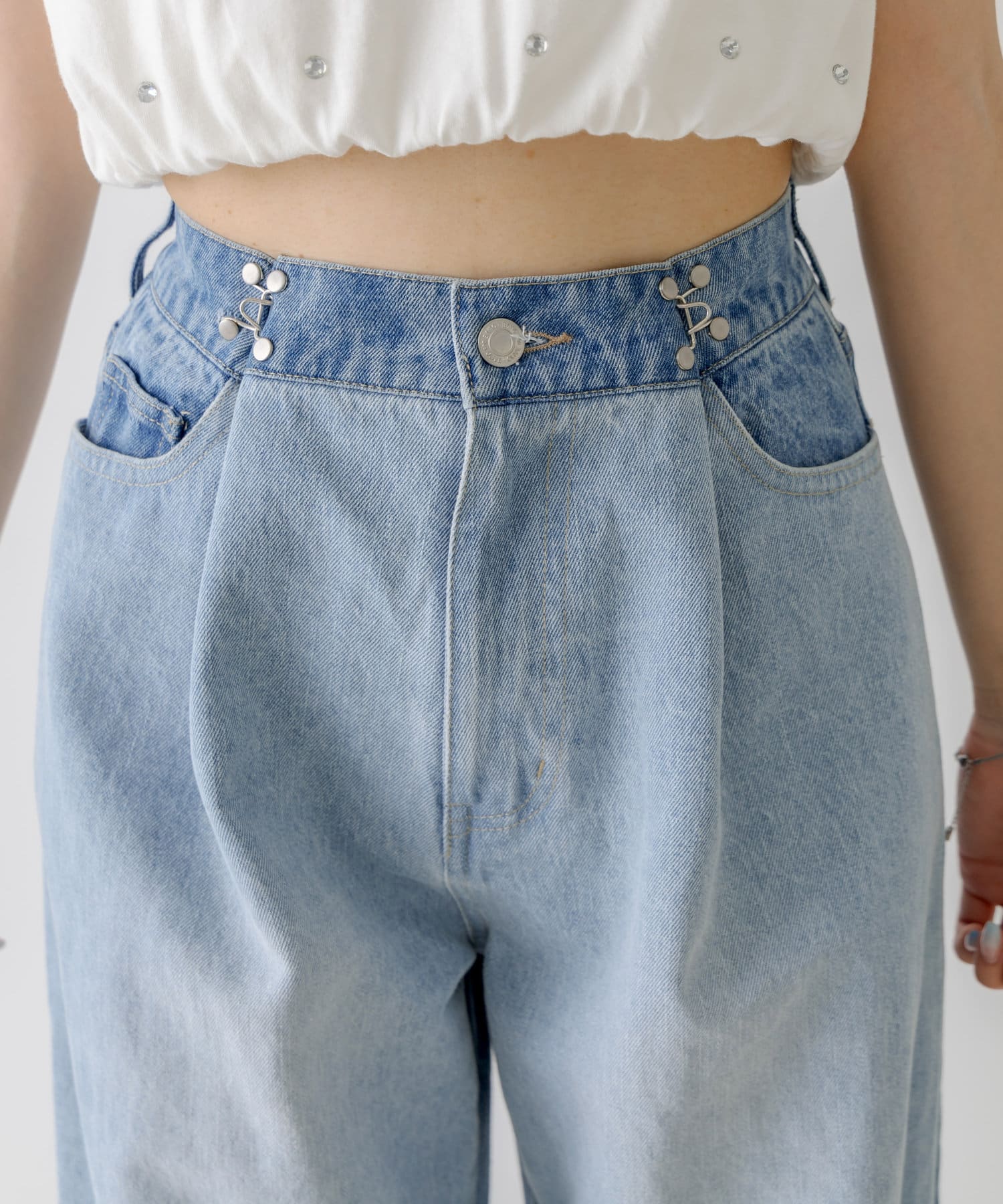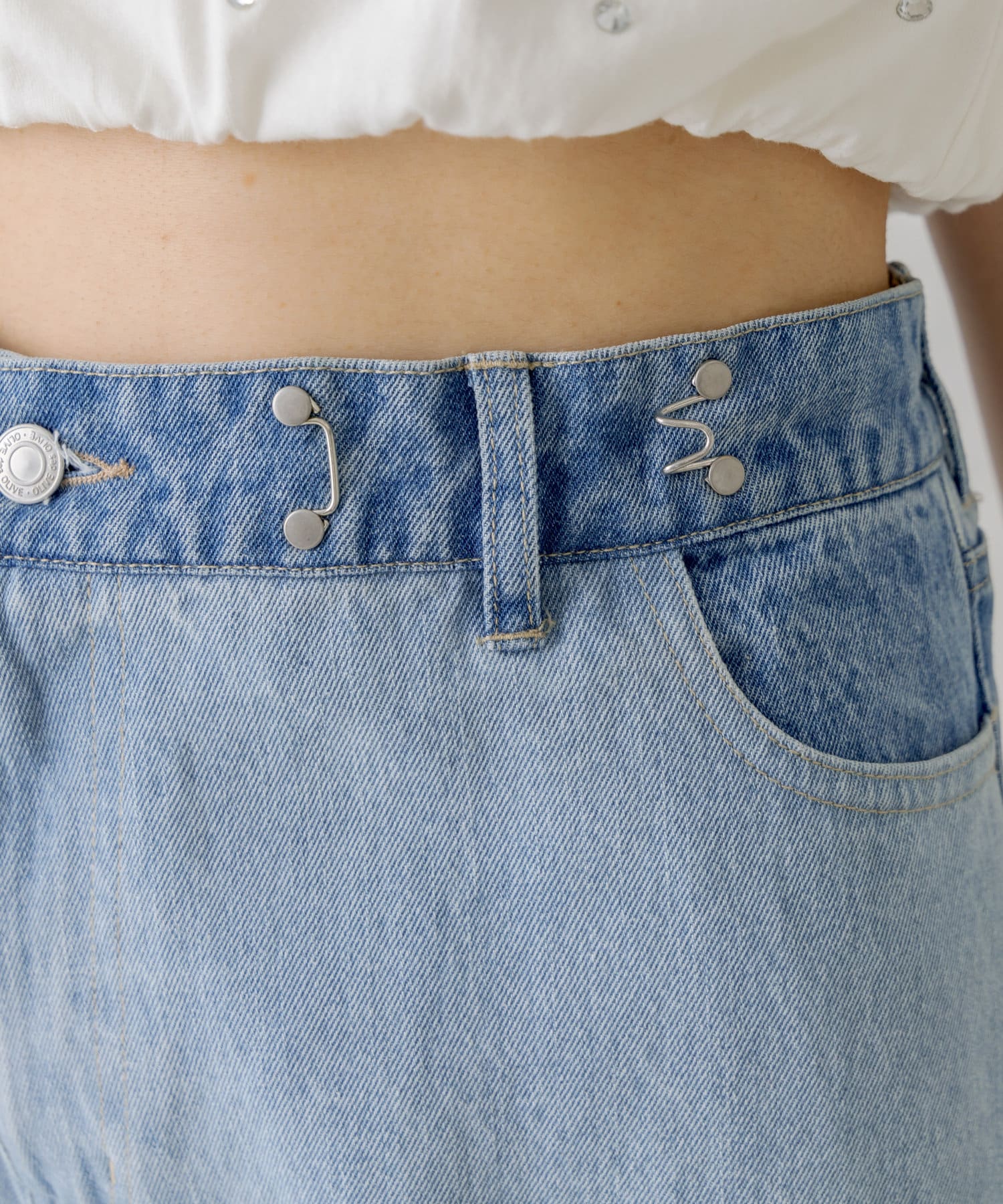 ・ウエストのホックを外すとローライズに。ホックを付けるとハイライズに。