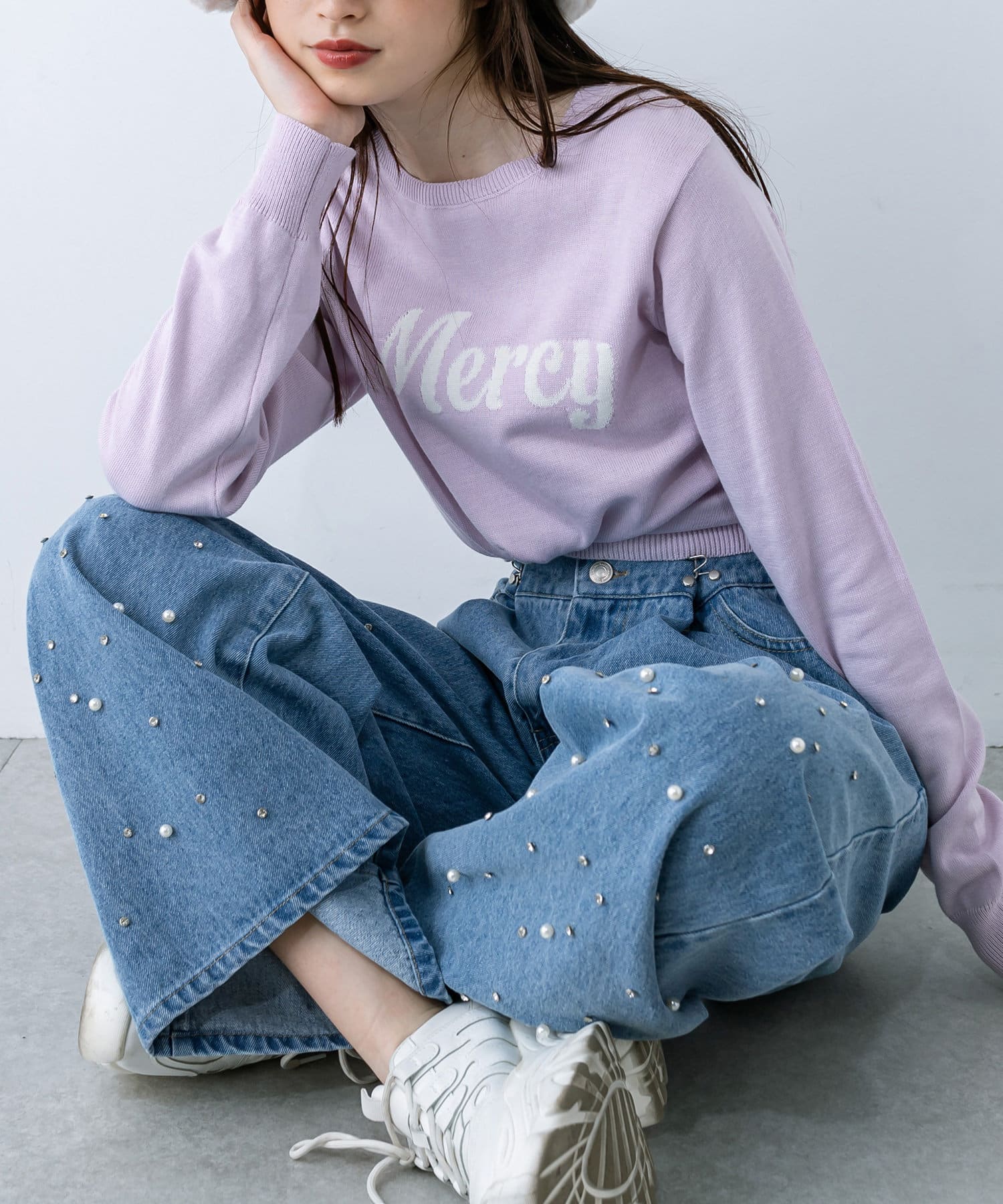 ・新色のブルー系はビジューとパールを混ぜたミックスタイプ。秋らしいインディゴブルーはきれいめに着てただけます。