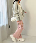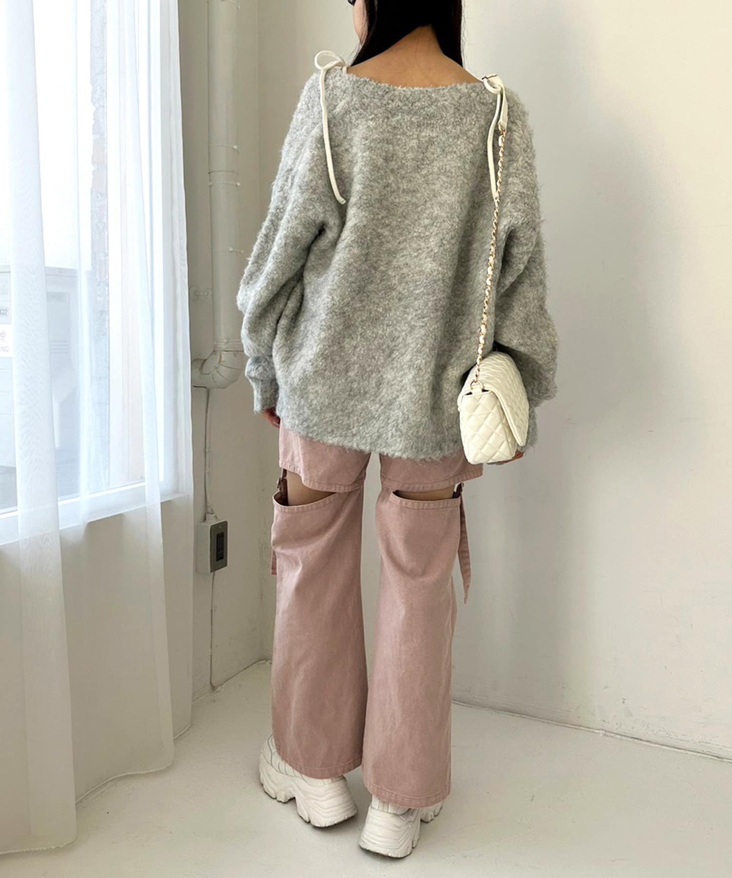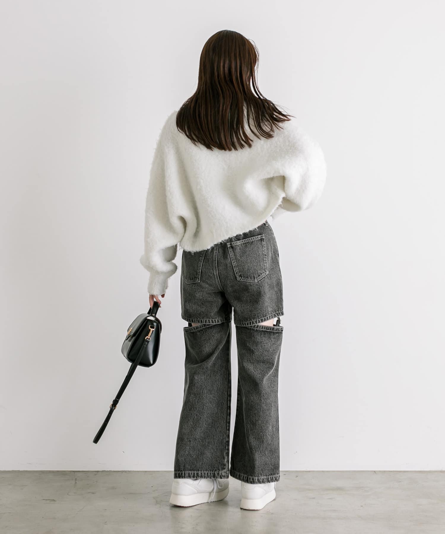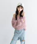 ・サックスのデニムパンツにピンクのフェザーニットを合わせても◎