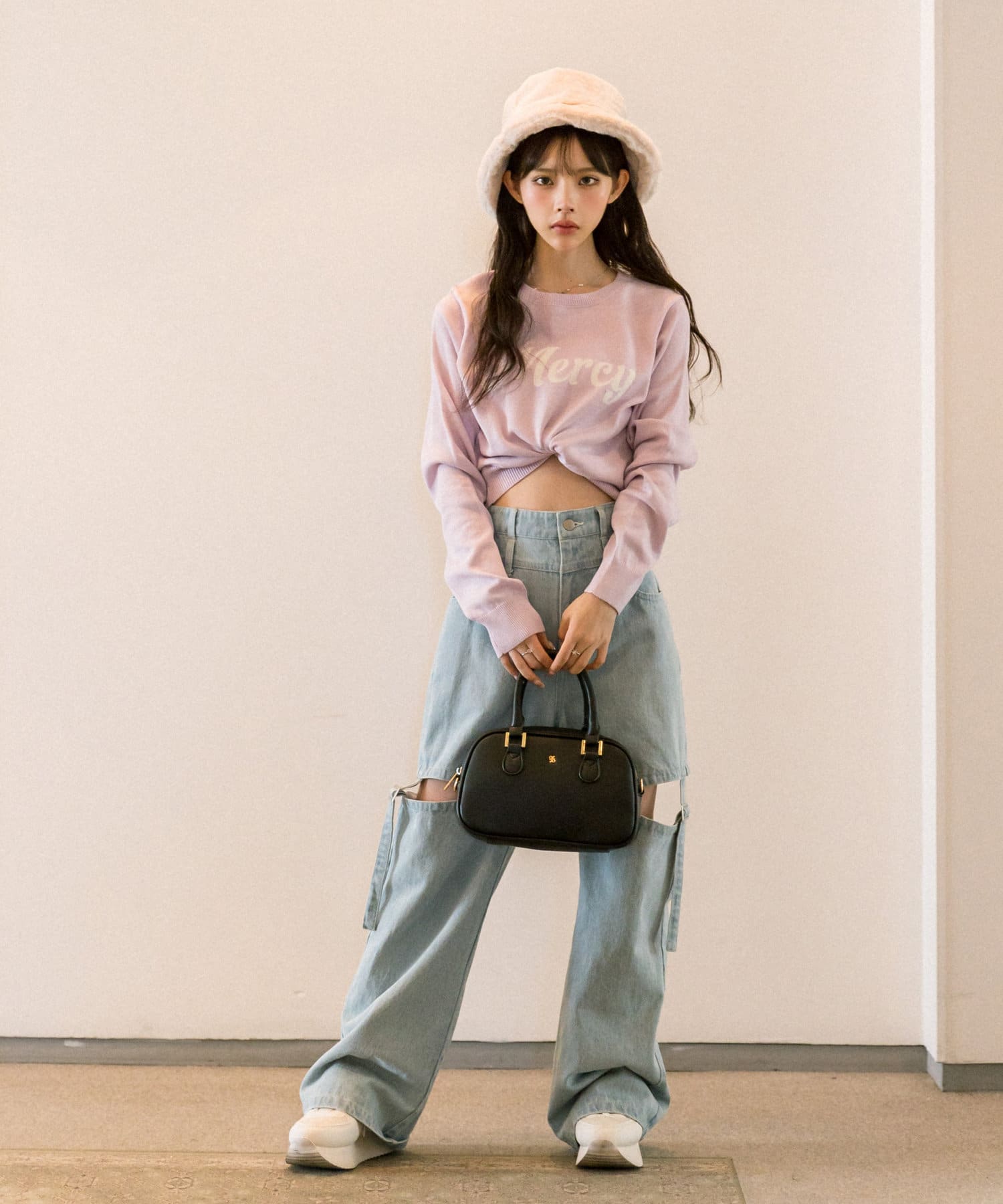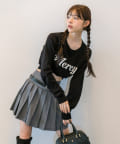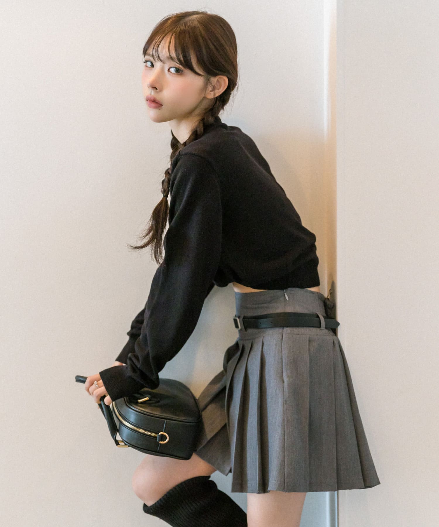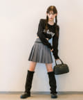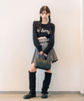 ・ミニプリーツスカートにロングブーツを合わせたスタイリングもおすすめ。