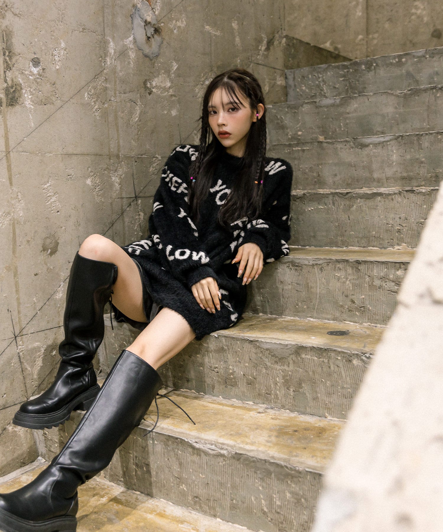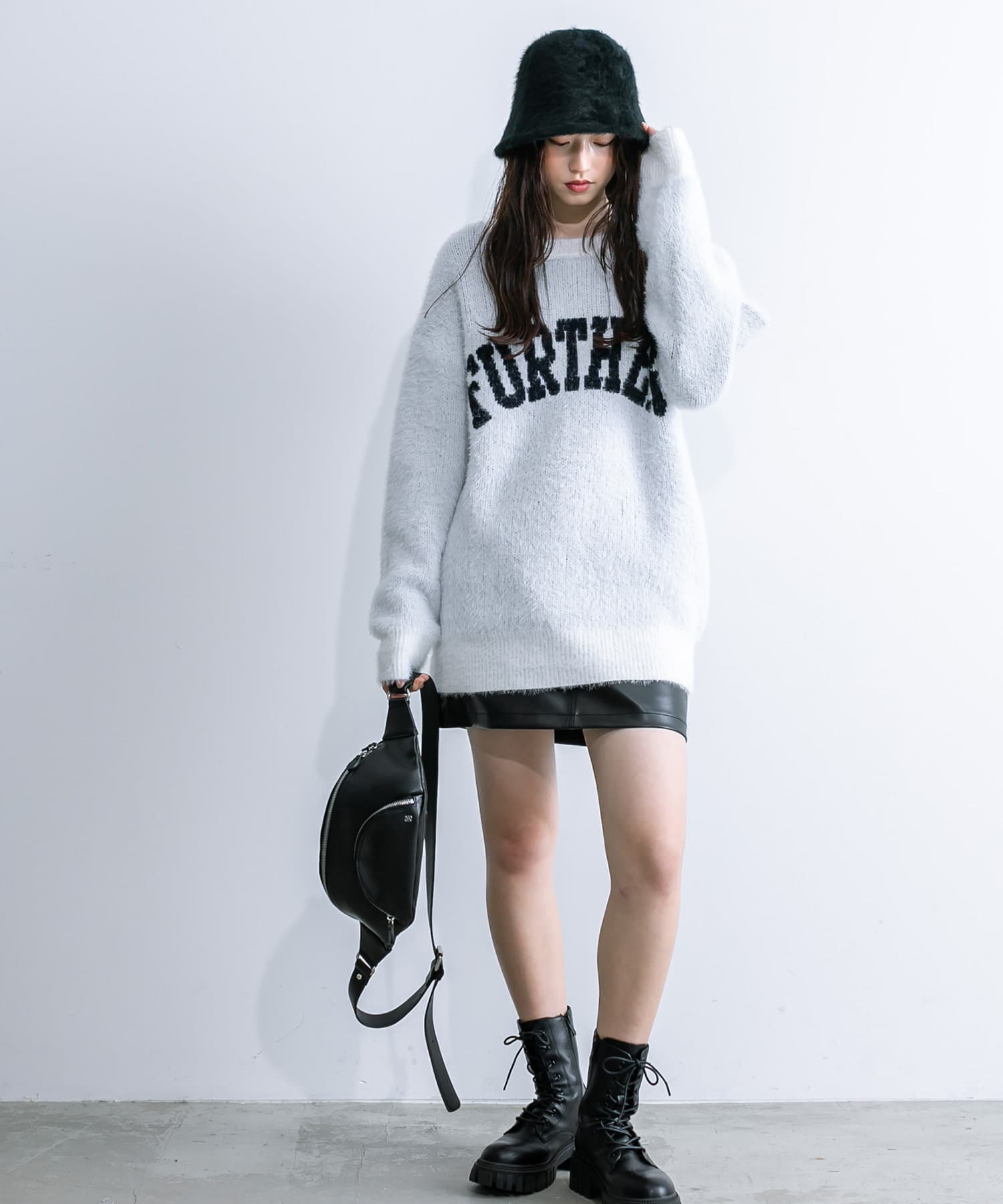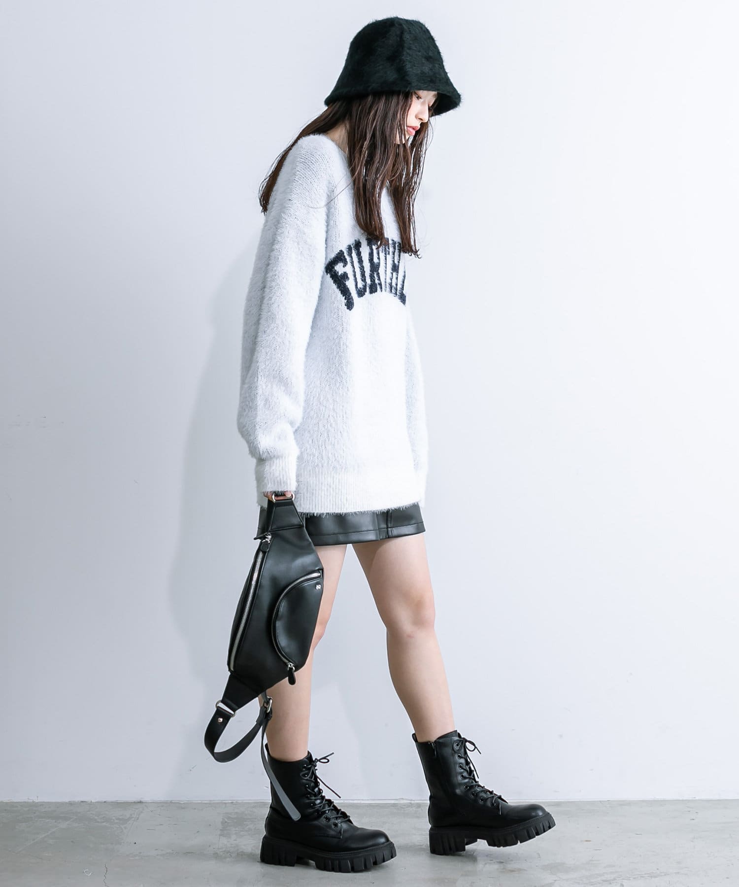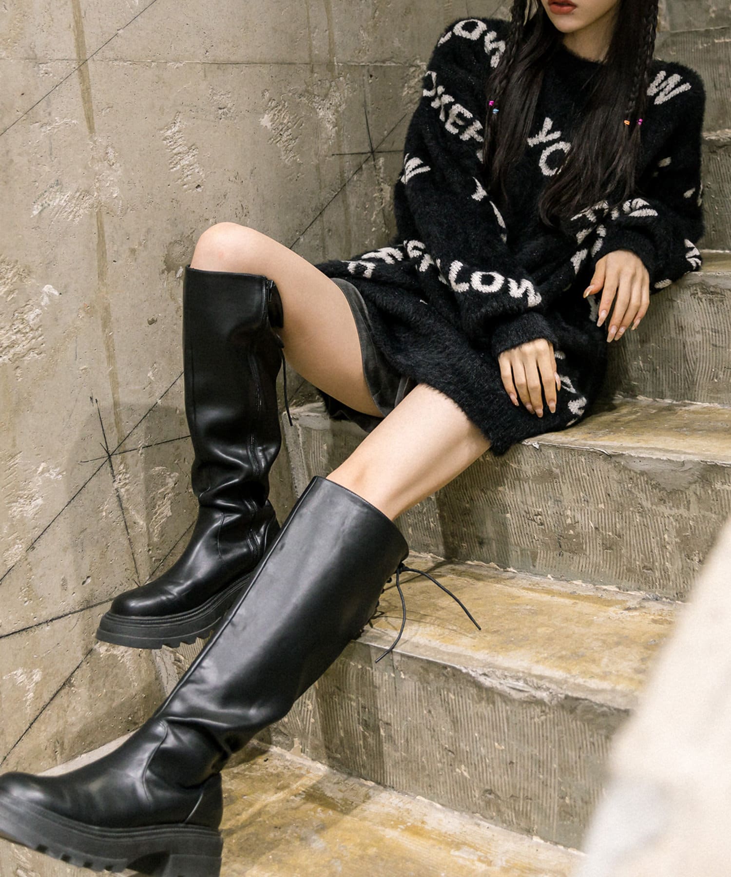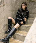 ・足元はロングブーツや、厚底スニーカーにレッグウォーマー合わせがおすすめ。