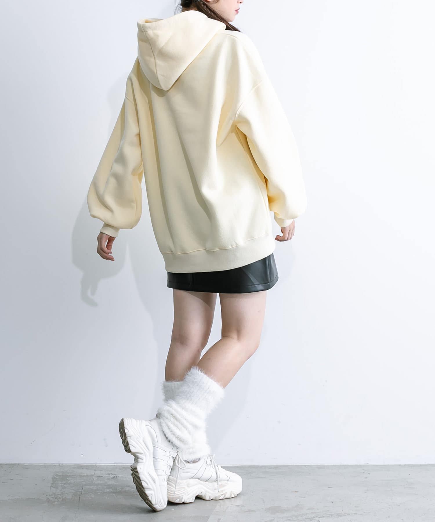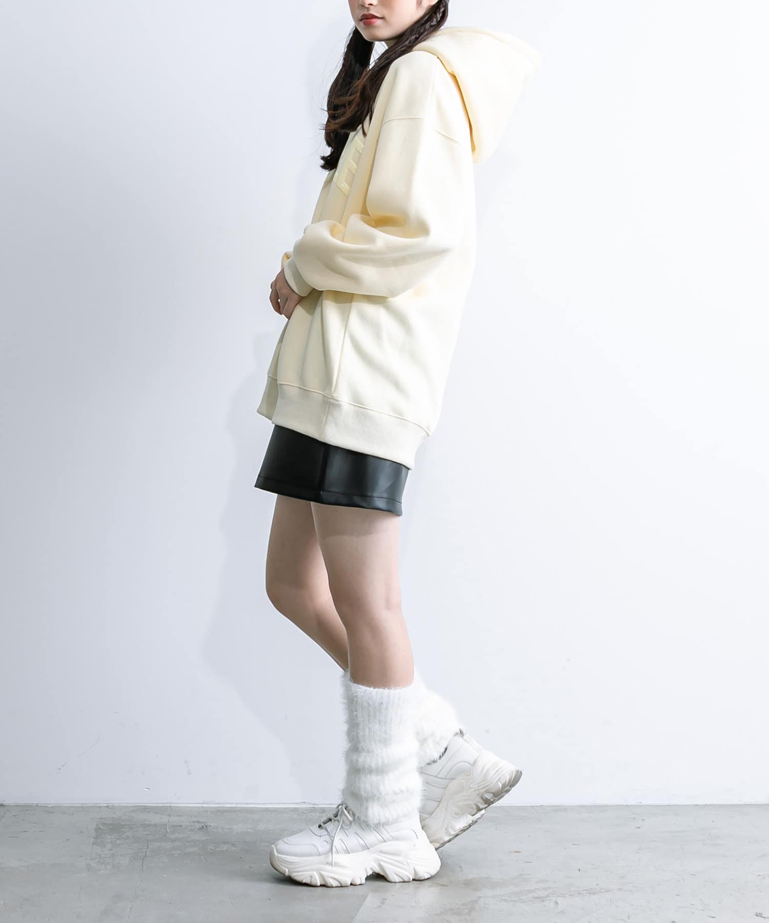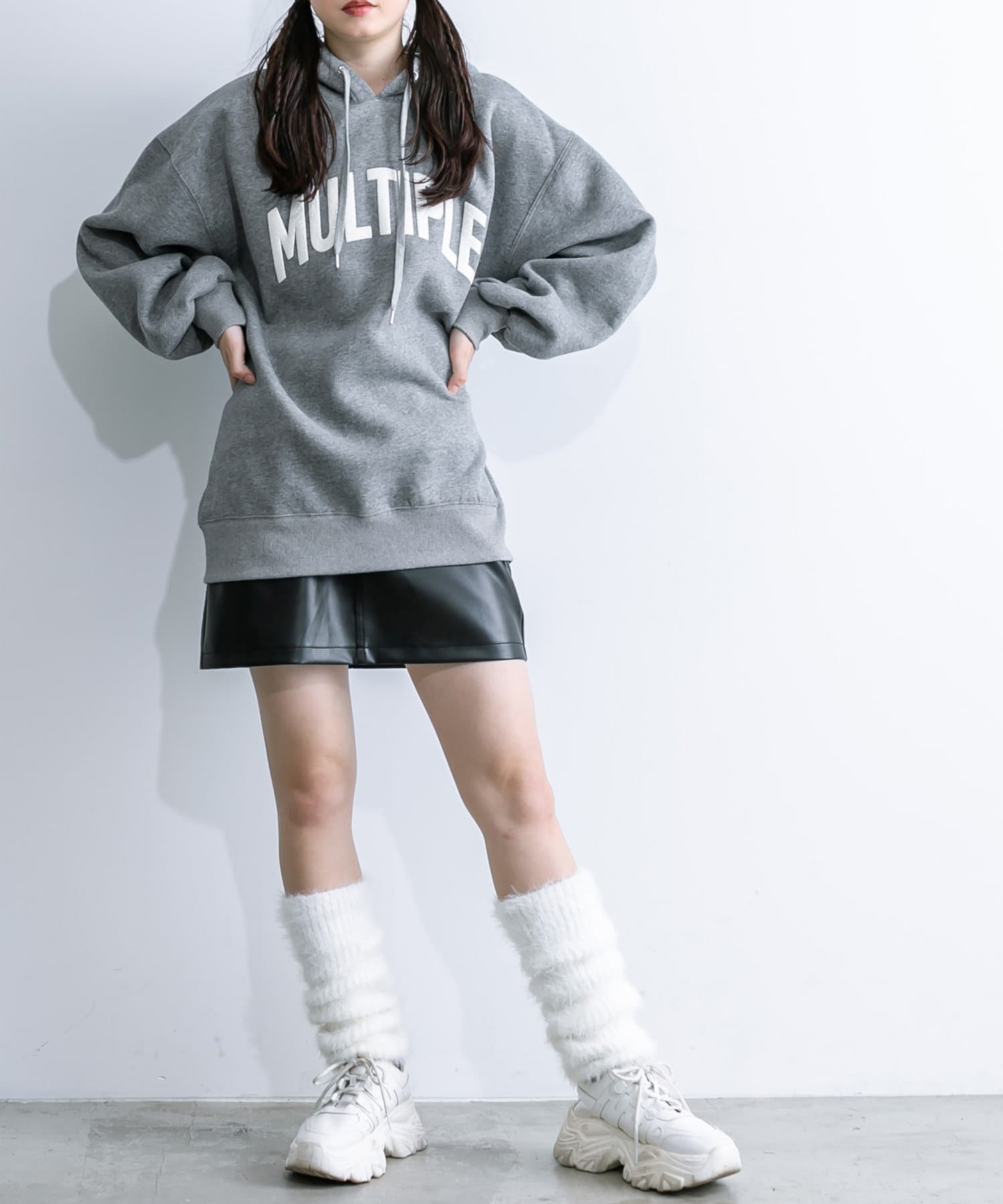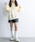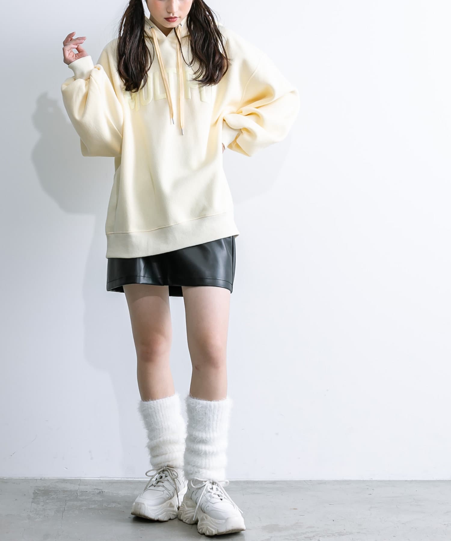 ・足元はロングブーツや、厚底スニーカーにレッグウォーマー合わせがおすすめ。