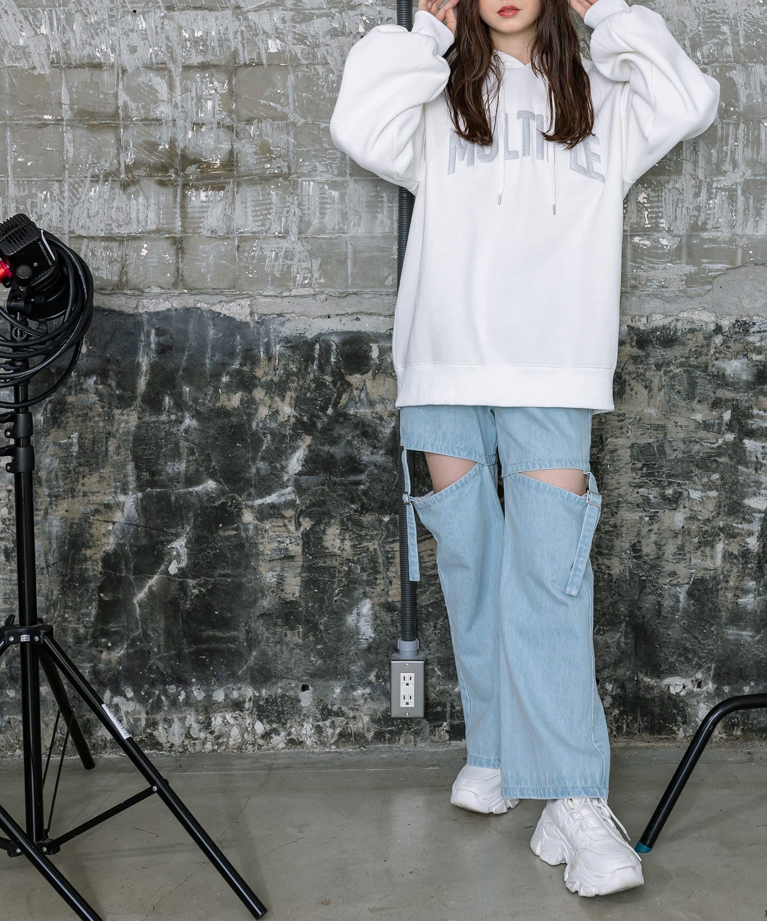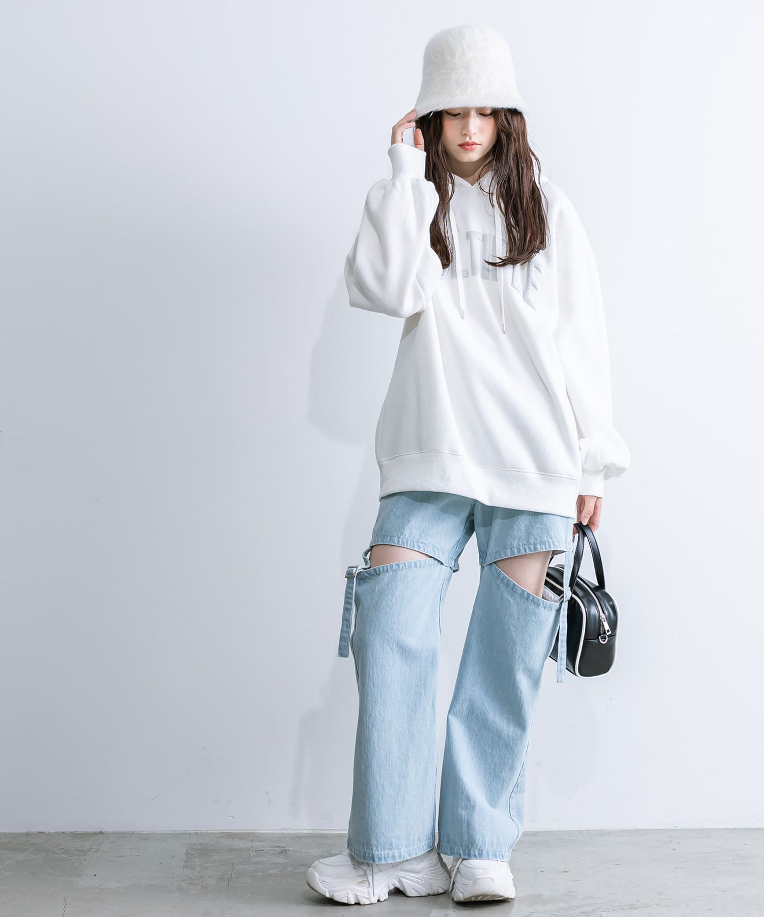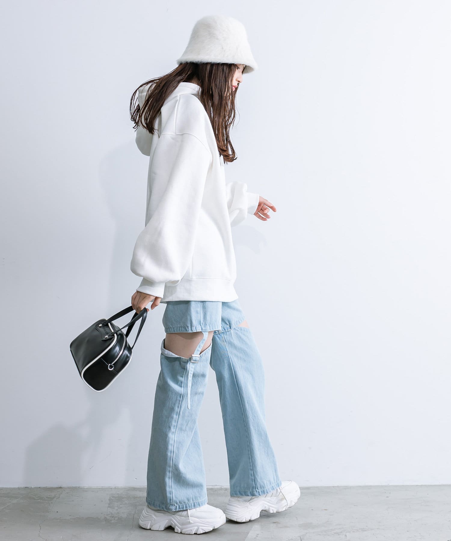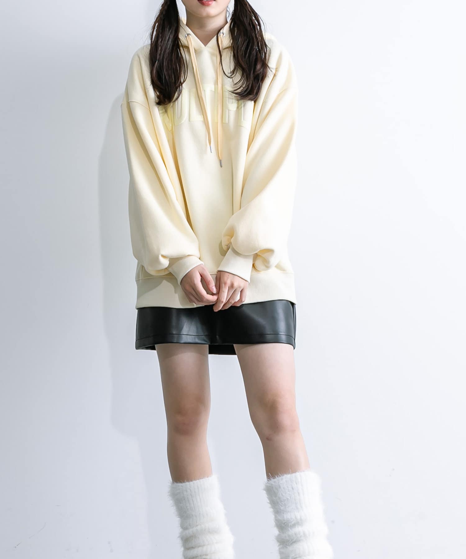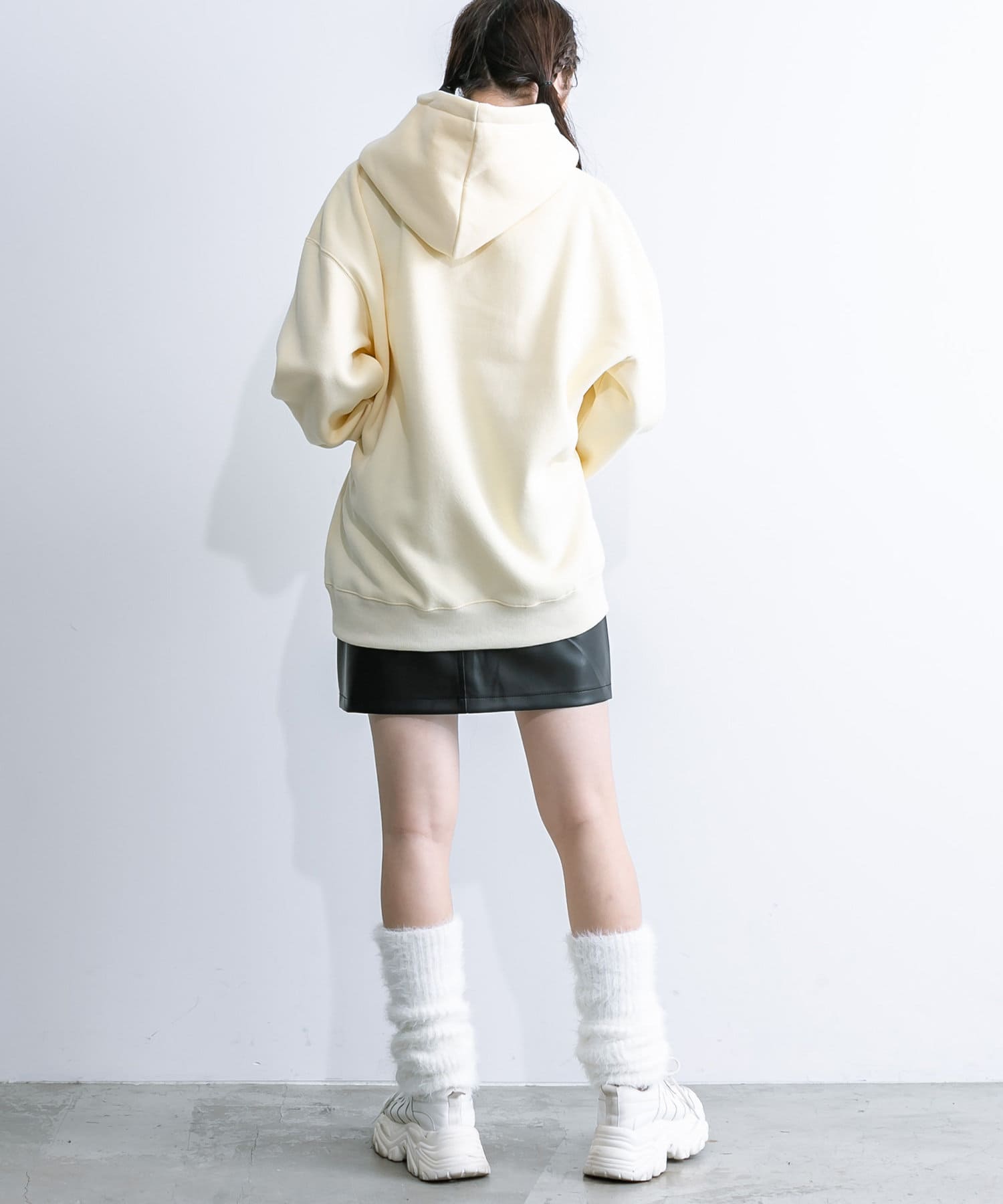 ・足元はロングブーツや、厚底スニーカーにレッグウォーマー合わせがおすすめ。