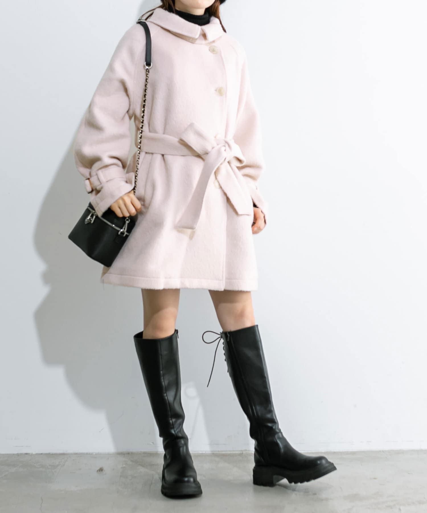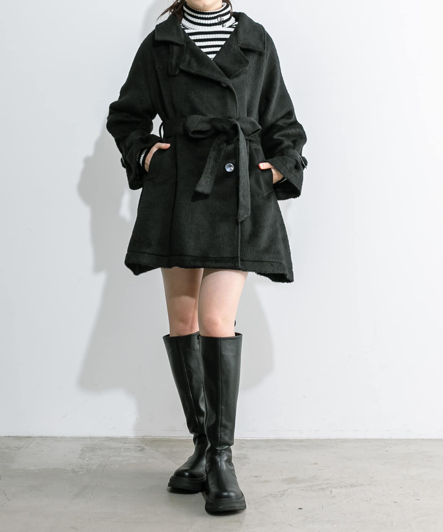 ・ベルトを閉めてウエストマークしていただくと、メリハリのあるミニワンピのようなシルエットに。