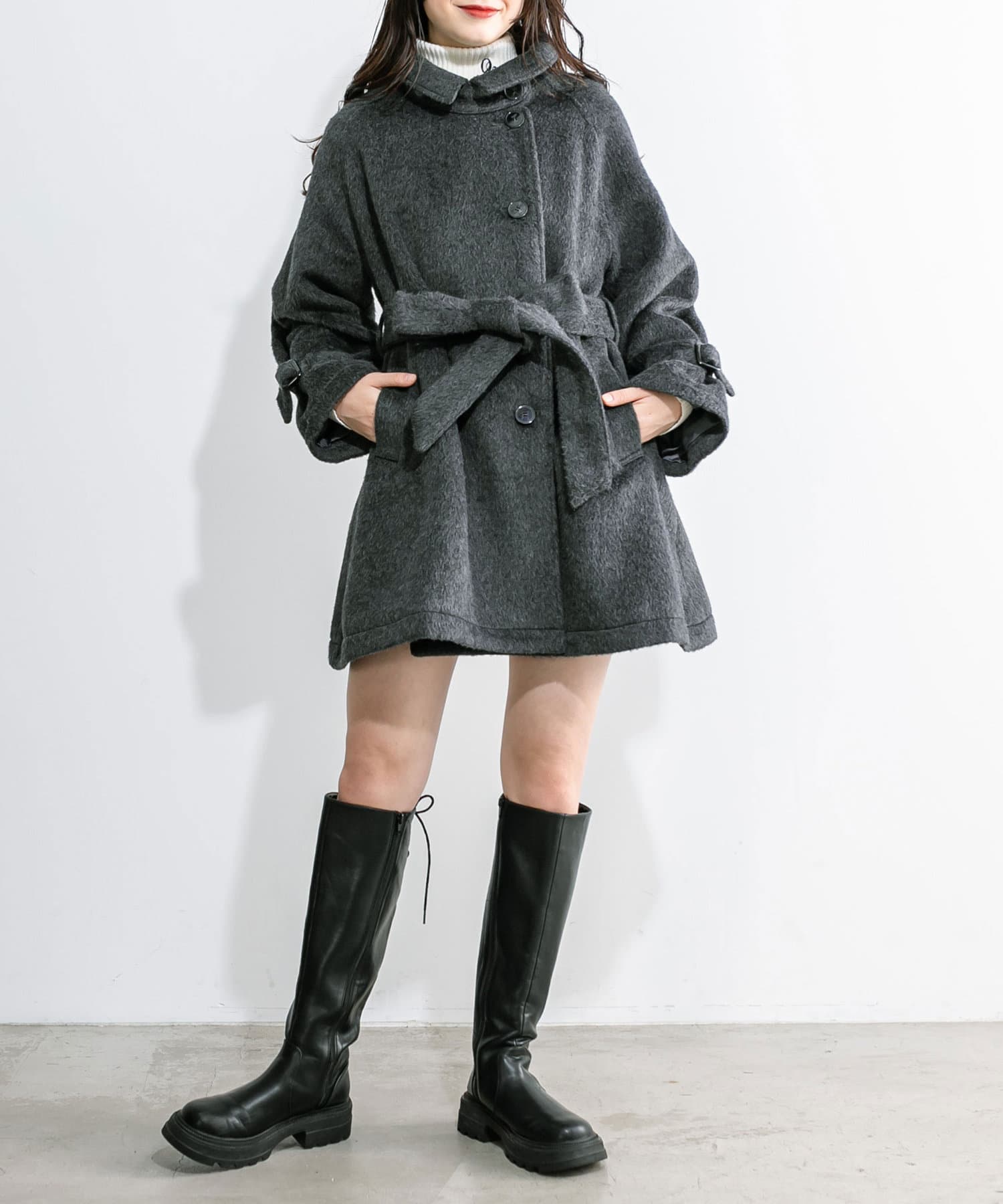 ・3wayで衿の見え方を変えて楽しめるミドル丈コート。