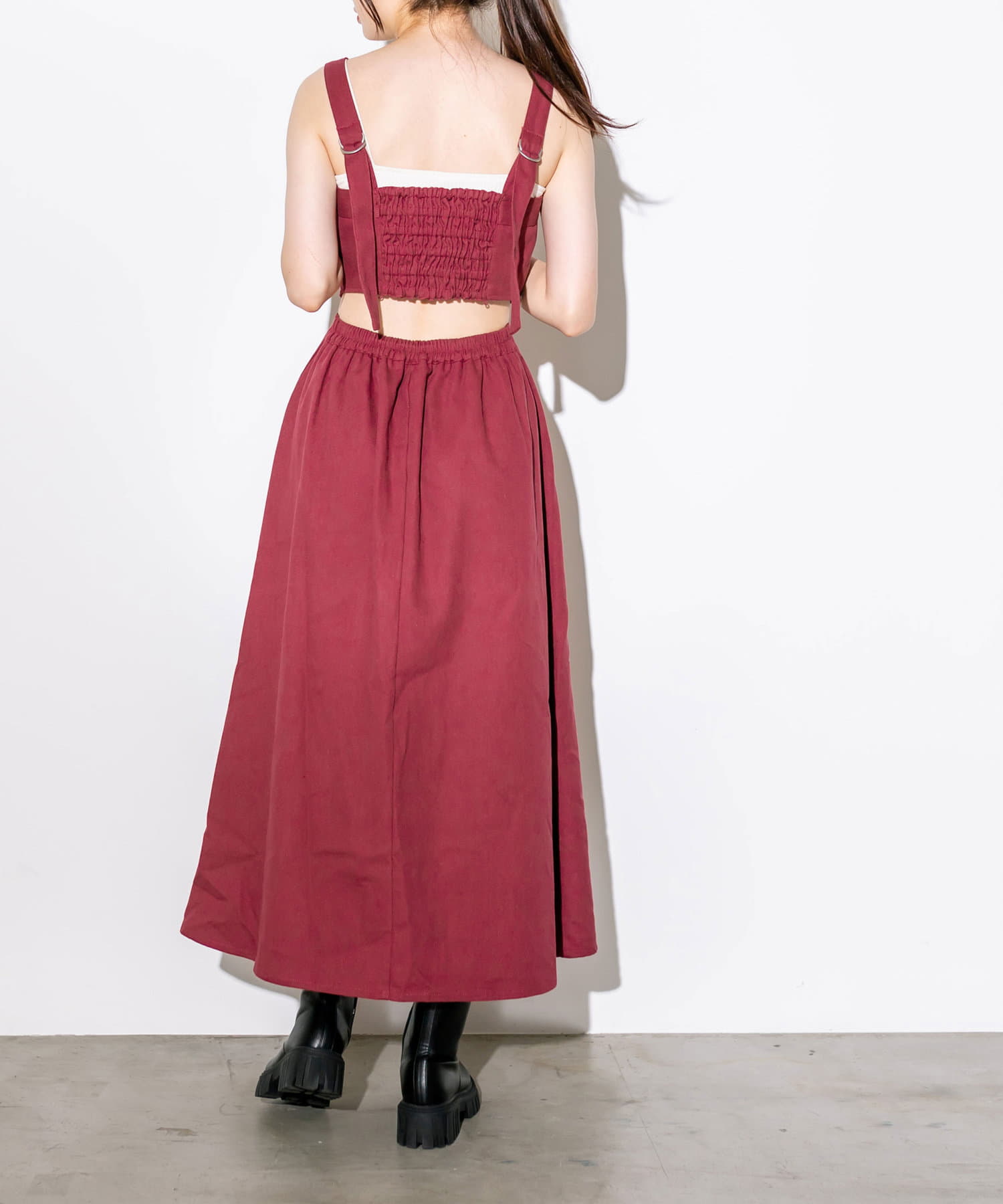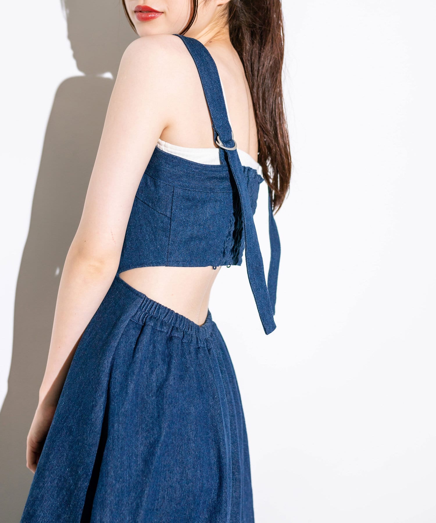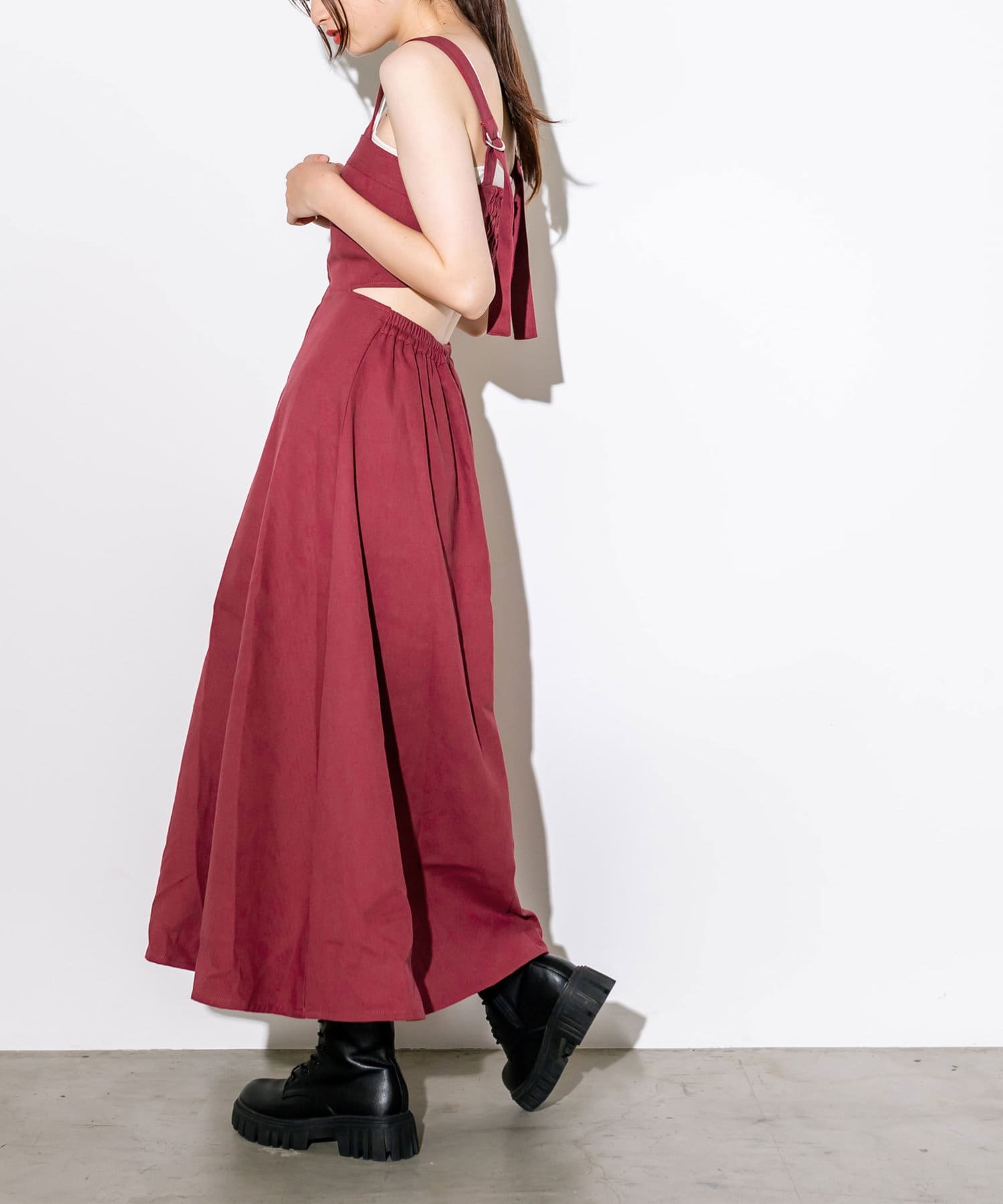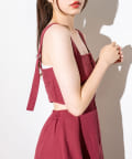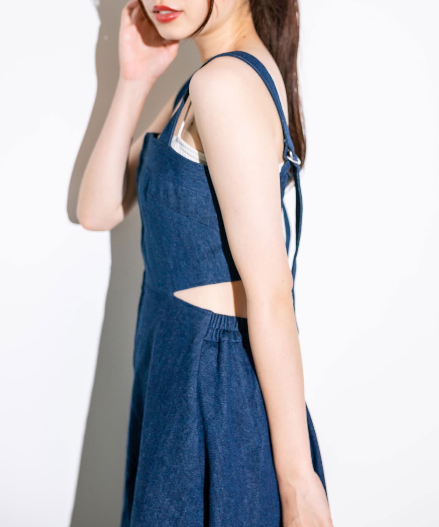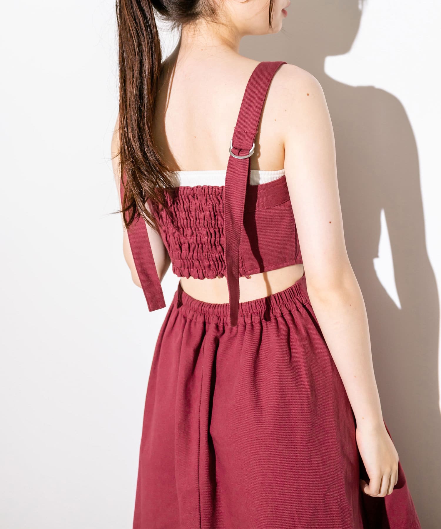・後ろは背中開きデザイン。背中の肌見せを控えたい方は、ボタンで閉めて着ていただけます。
