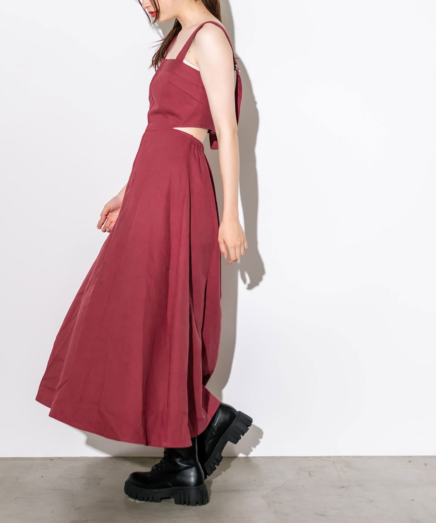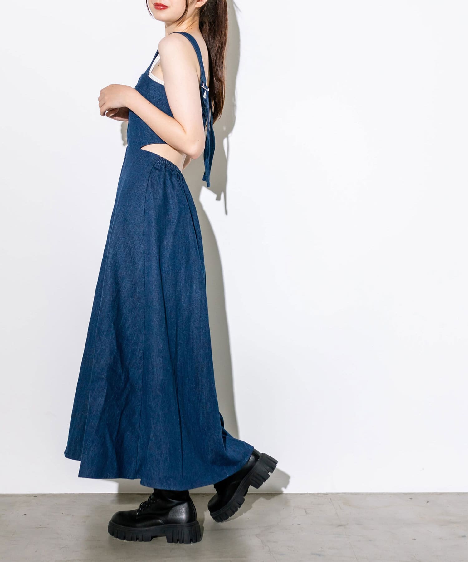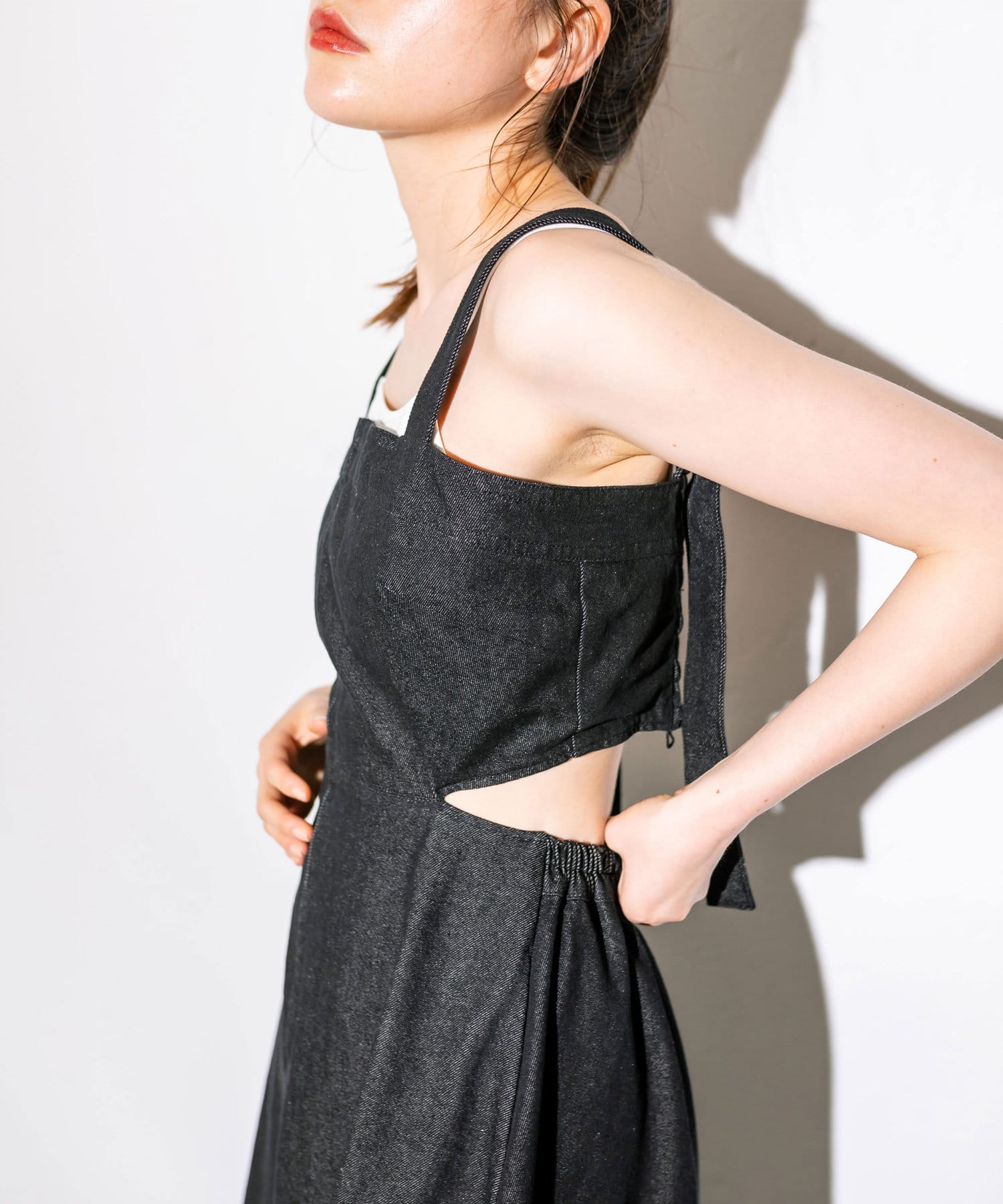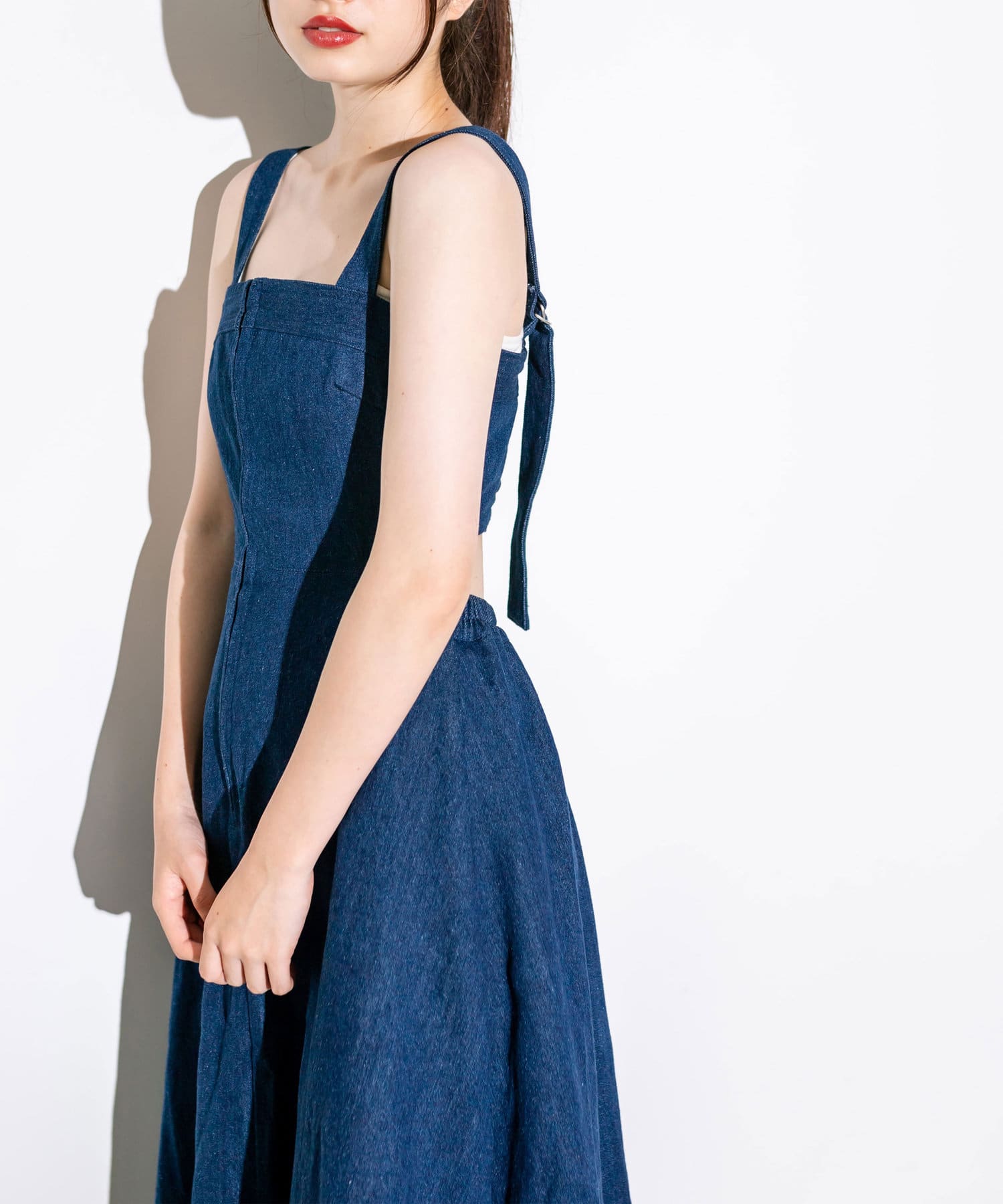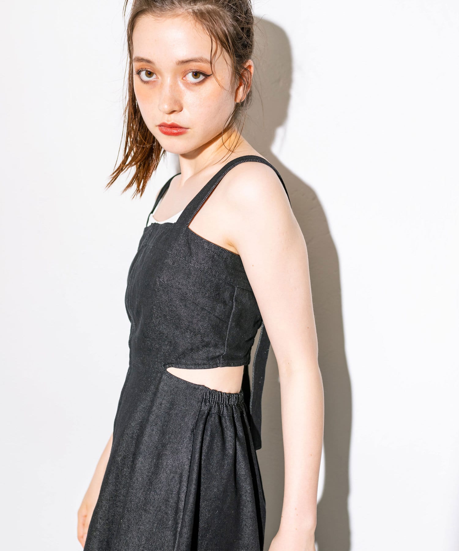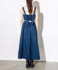 ・後ろは背中開きデザイン。背中の肌見せを控えたい方は、ボタンで閉めて着ていただけます。