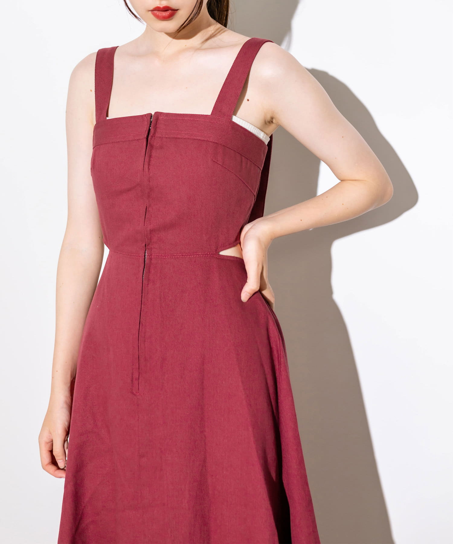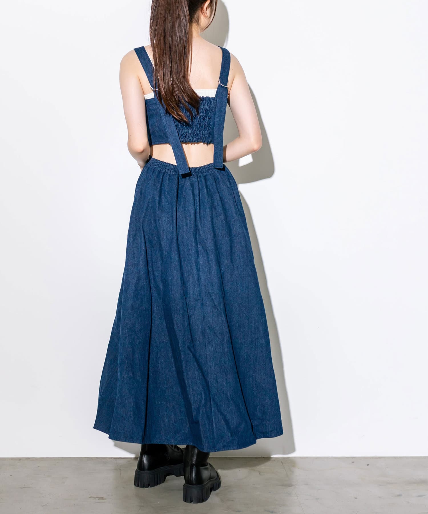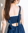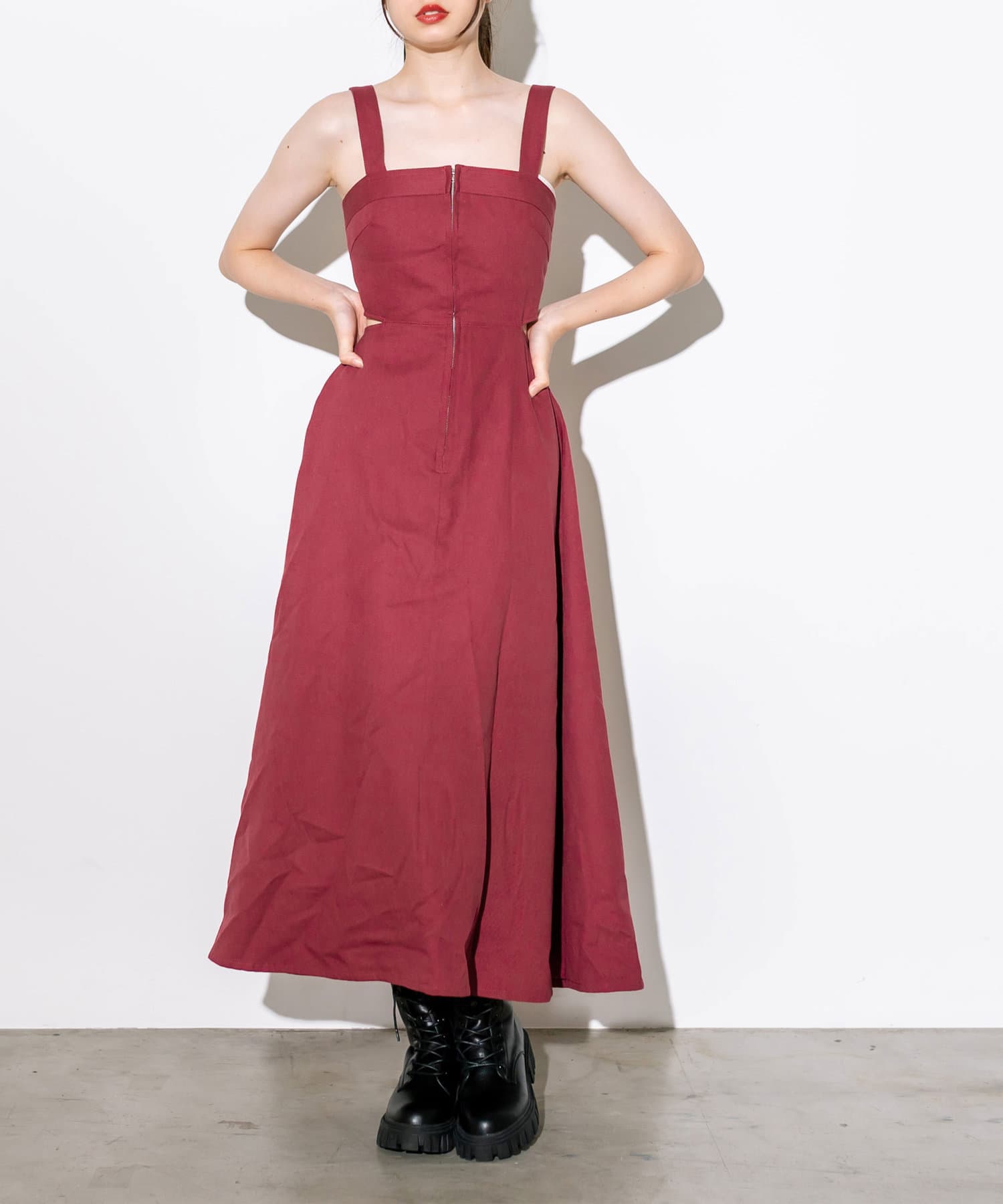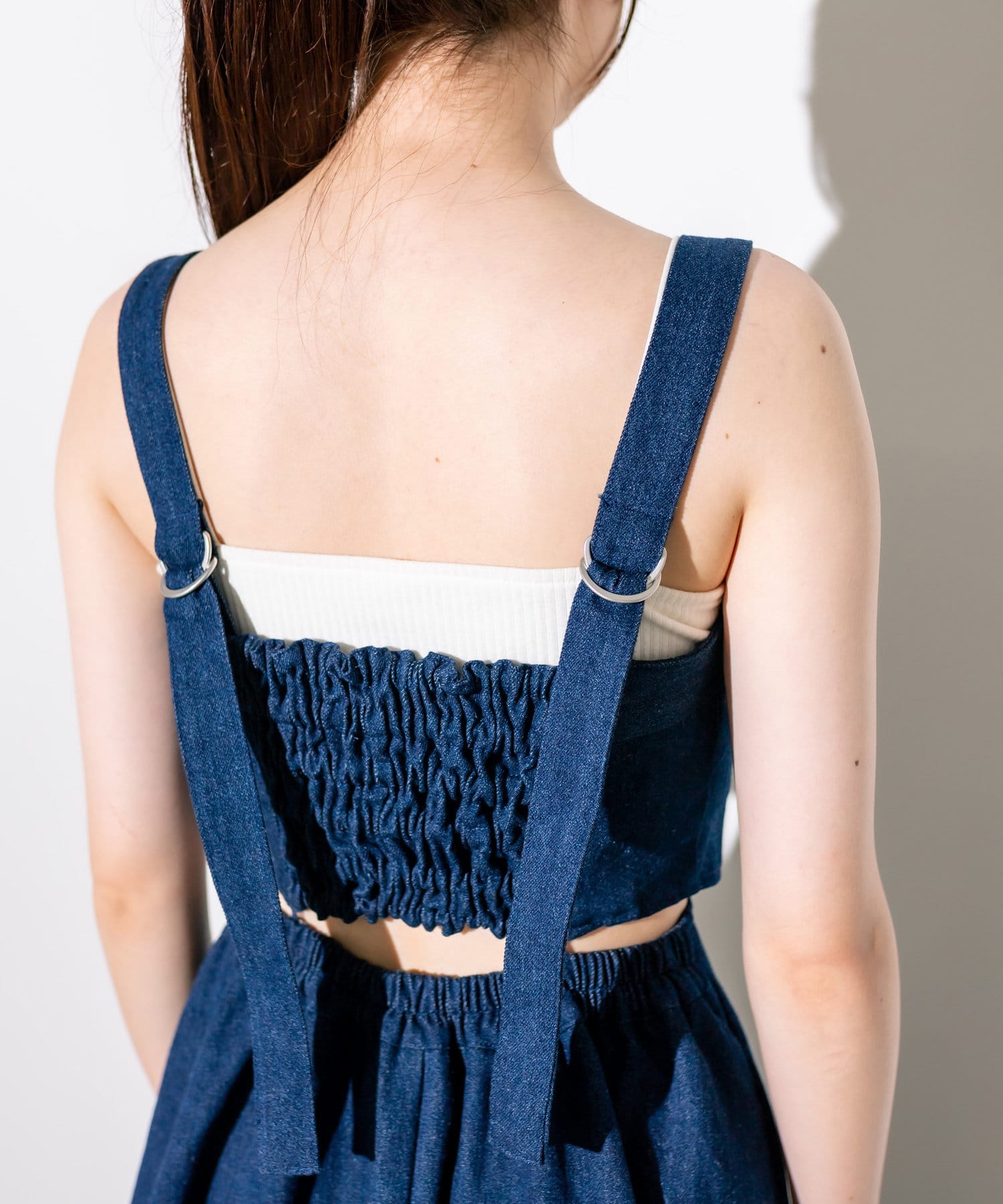 ・後ろは背中開きデザイン。背中の肌見せを控えたい方は、ボタンで閉めて着ていただけます。