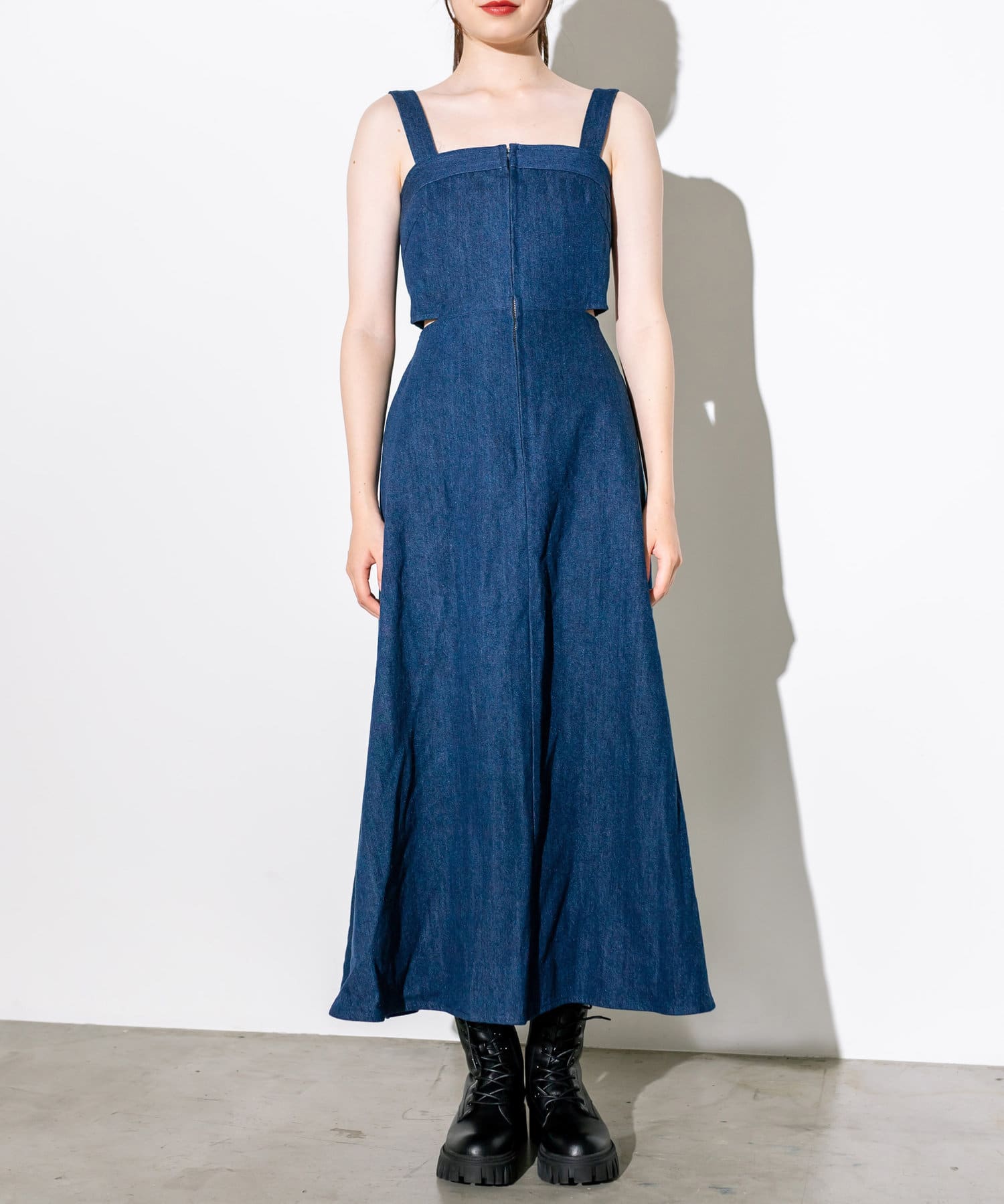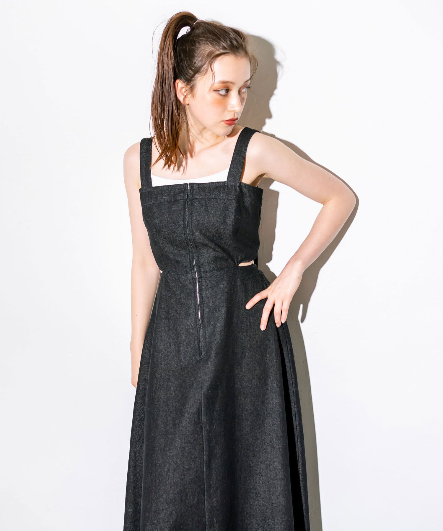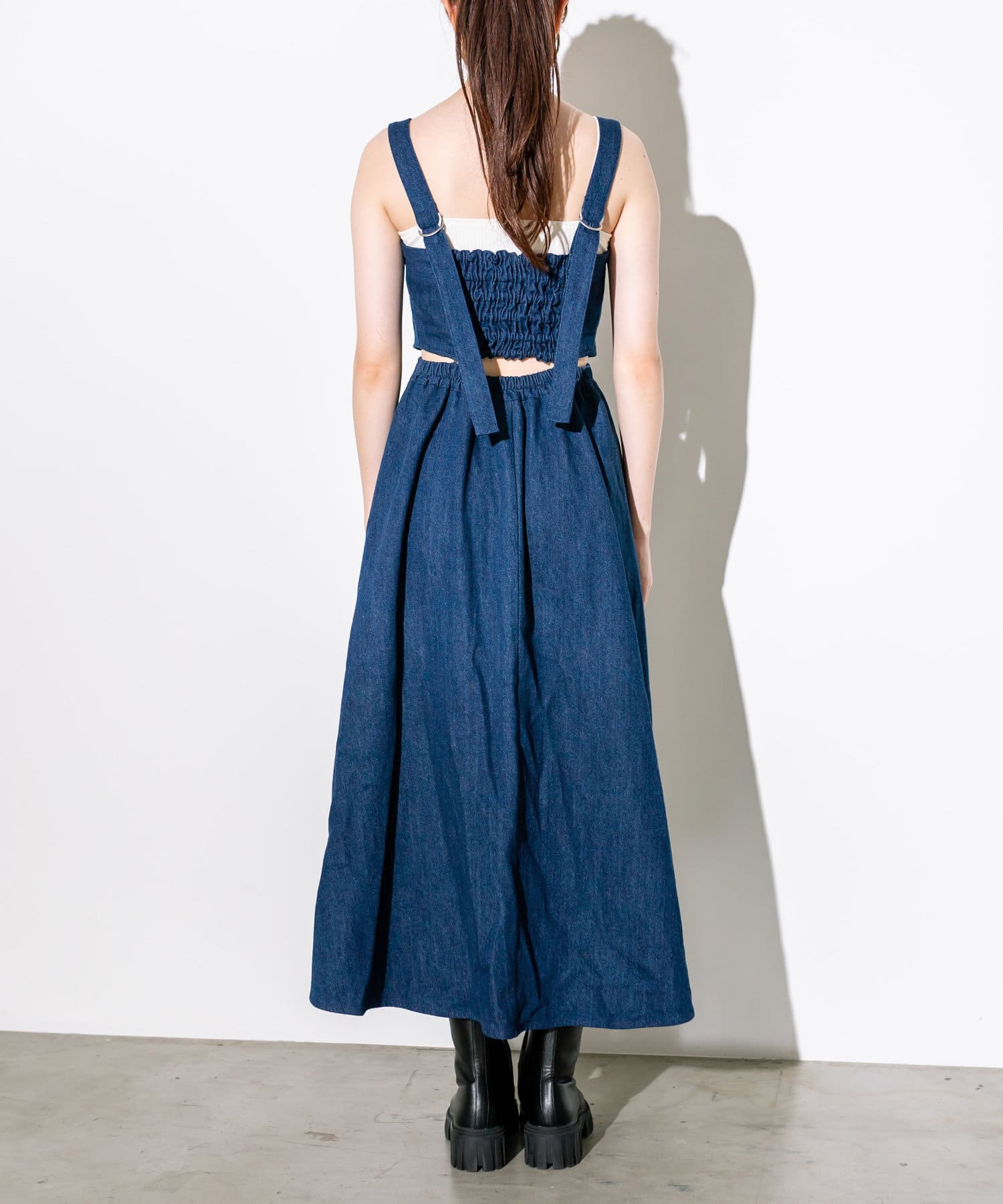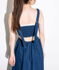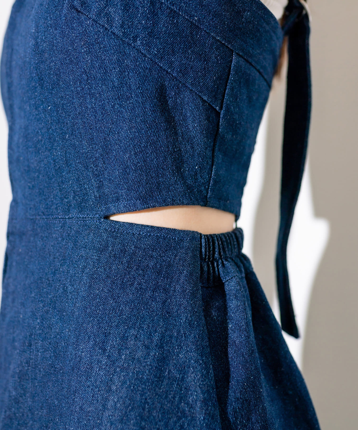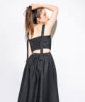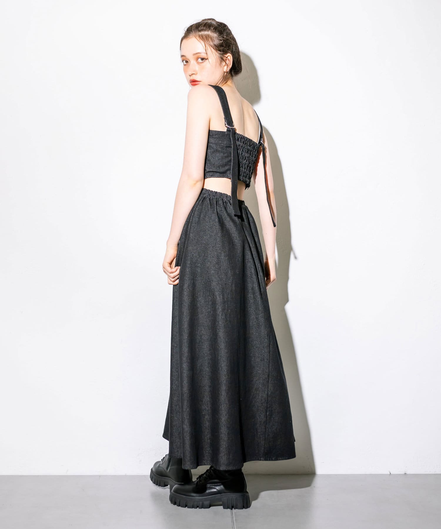 ・後ろは背中開きデザイン。背中の肌見せを控えたい方は、ボタンで閉めて着ていただけます。