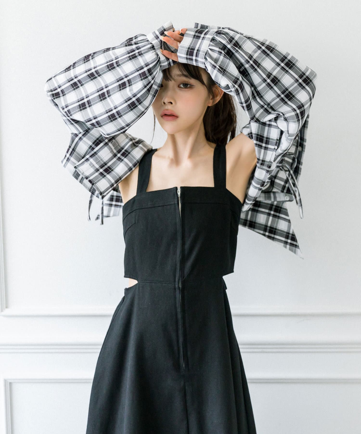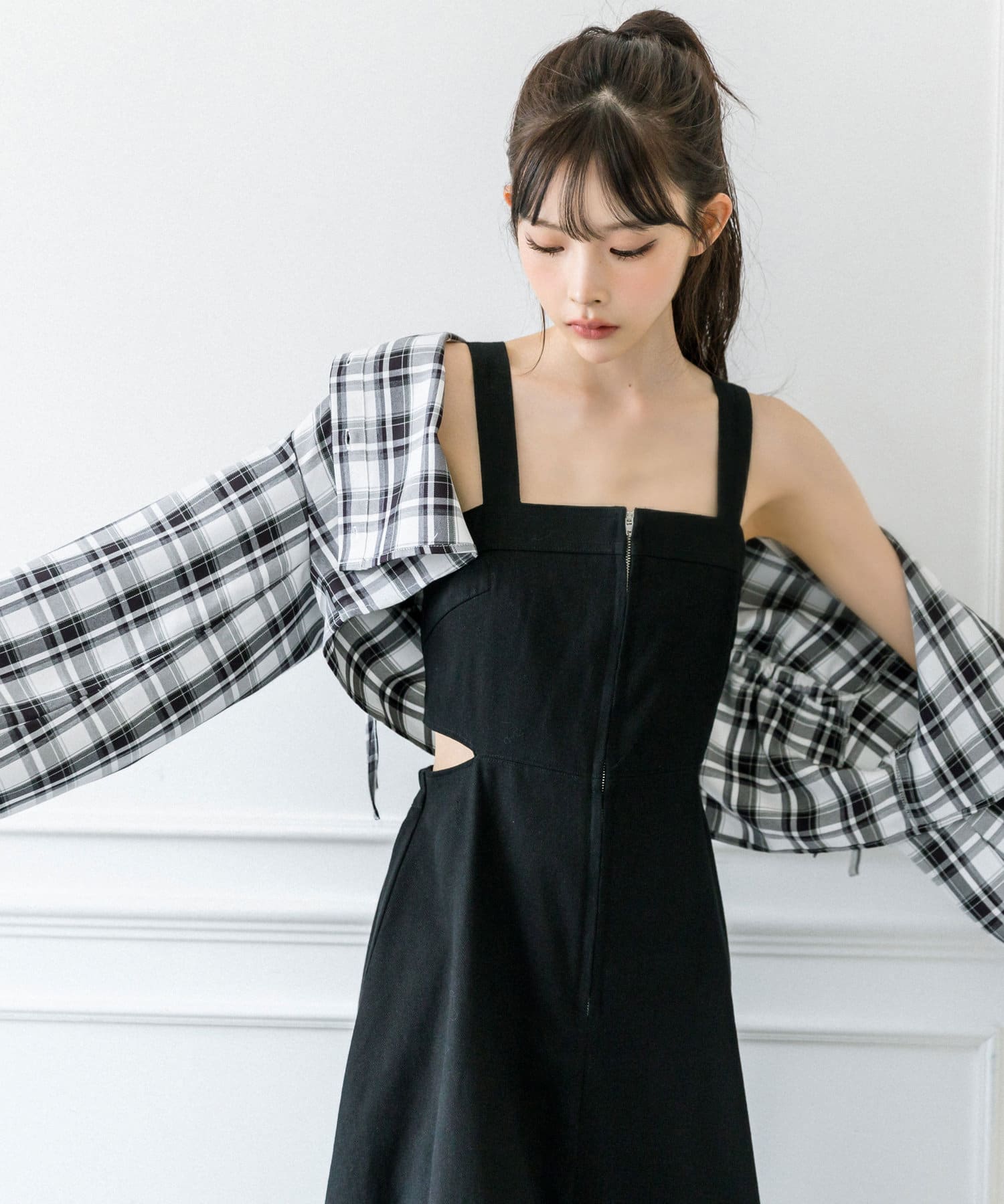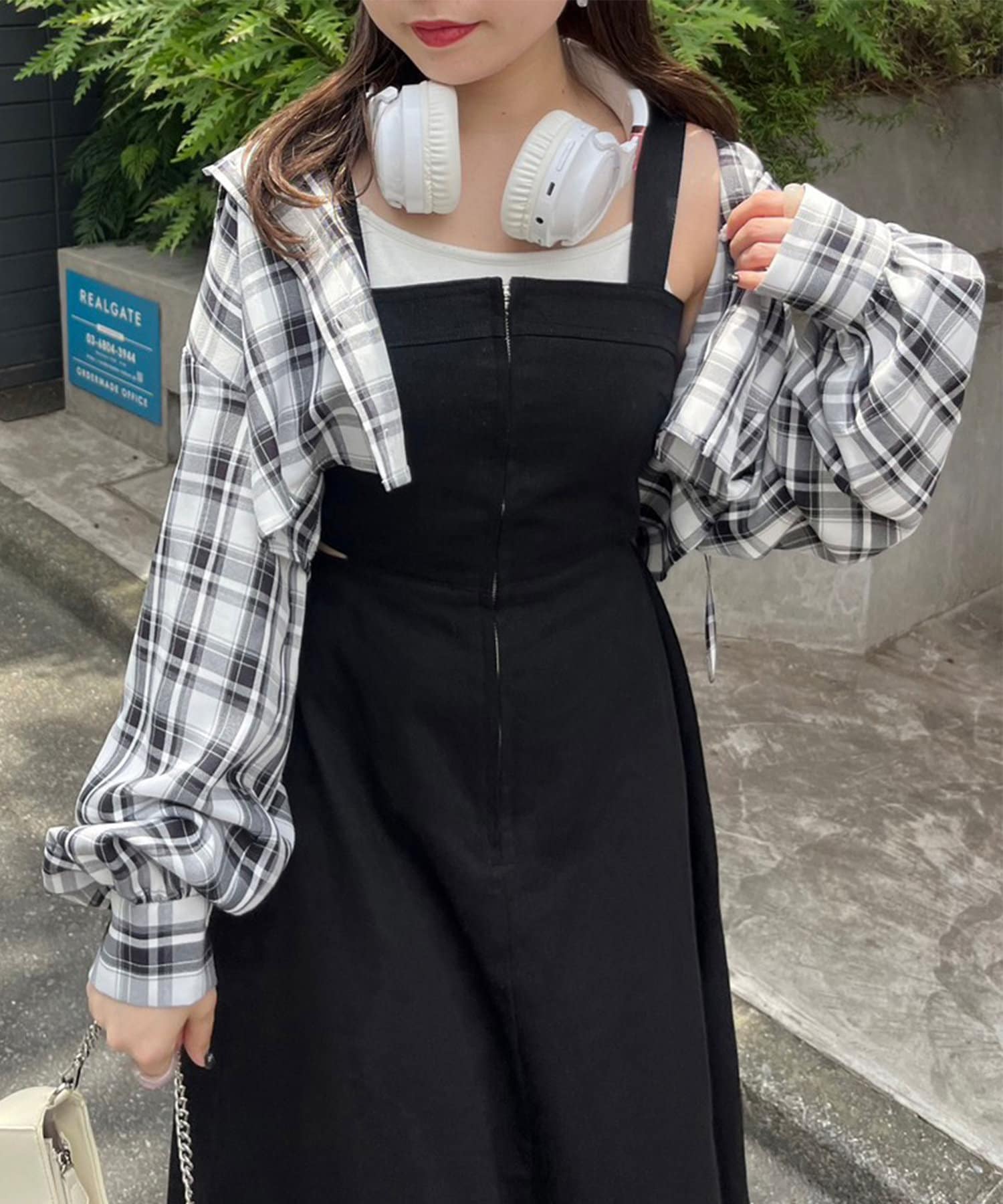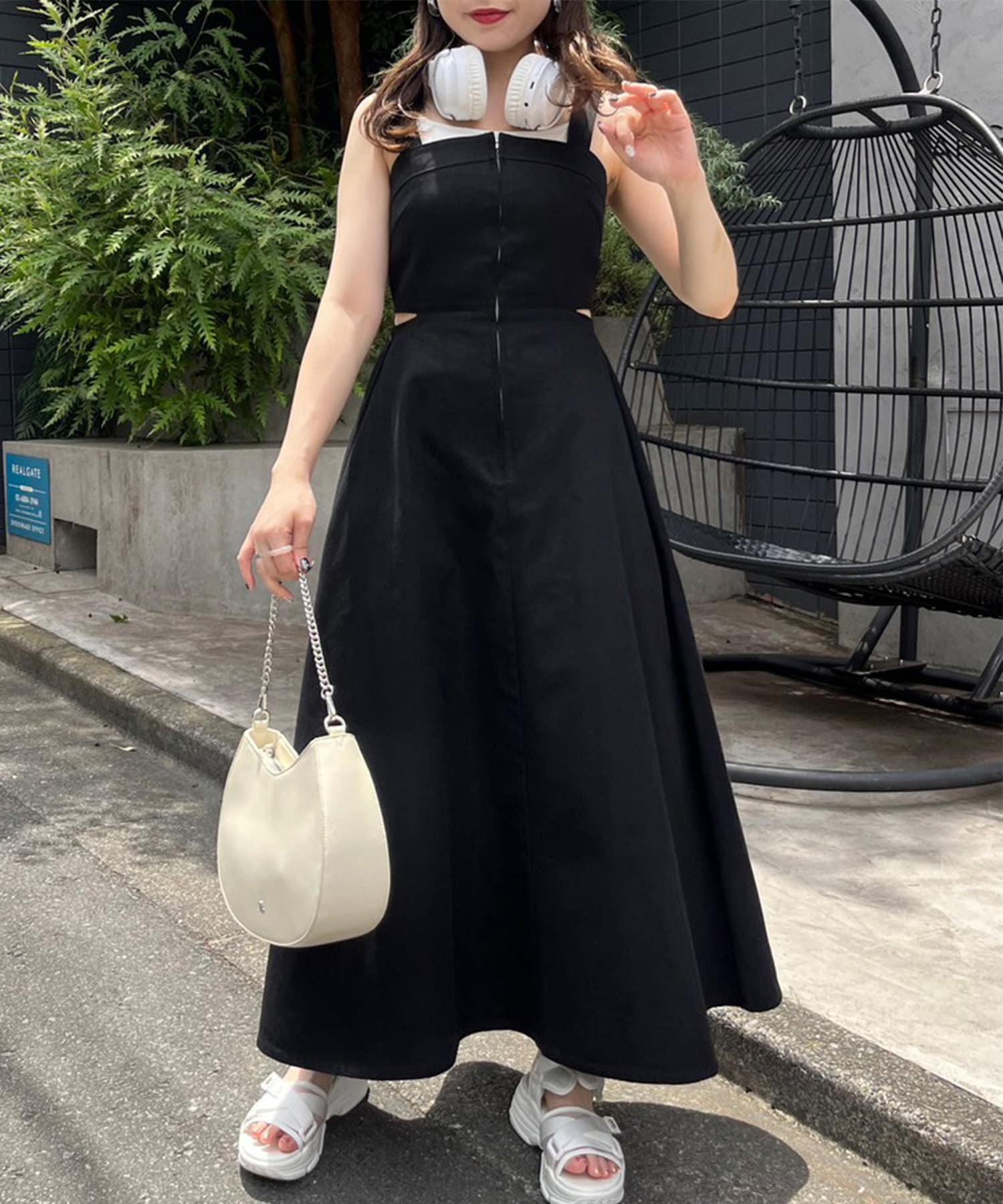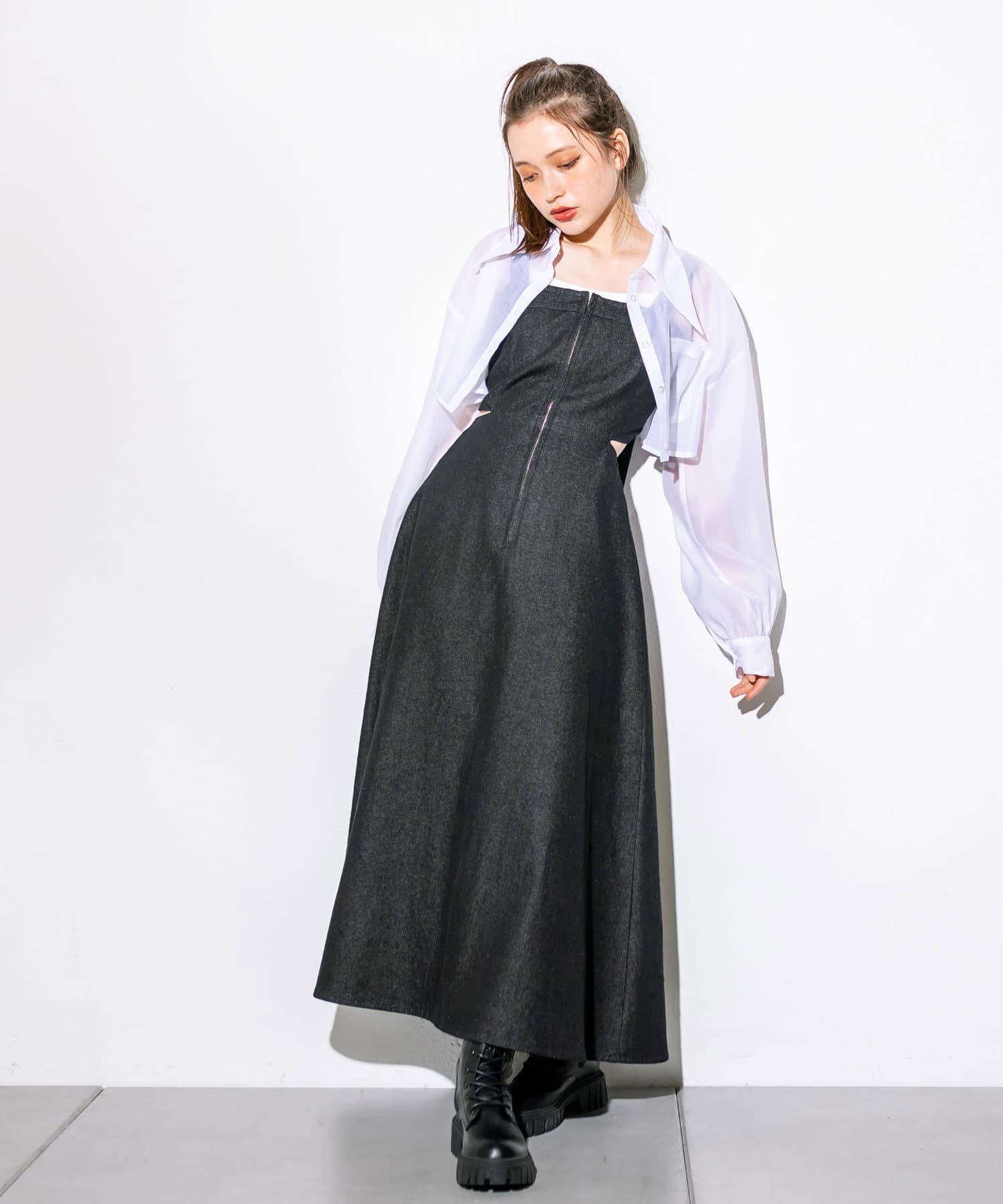 ・中にカップ付きインナーやベアトップを着れば1枚で主役に。
